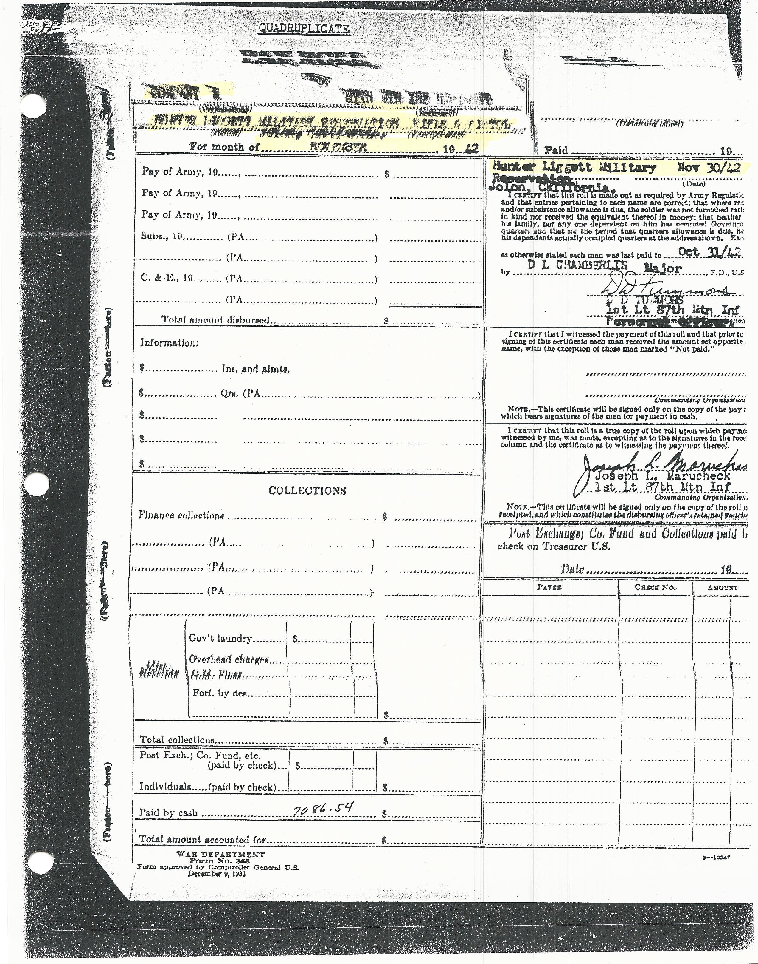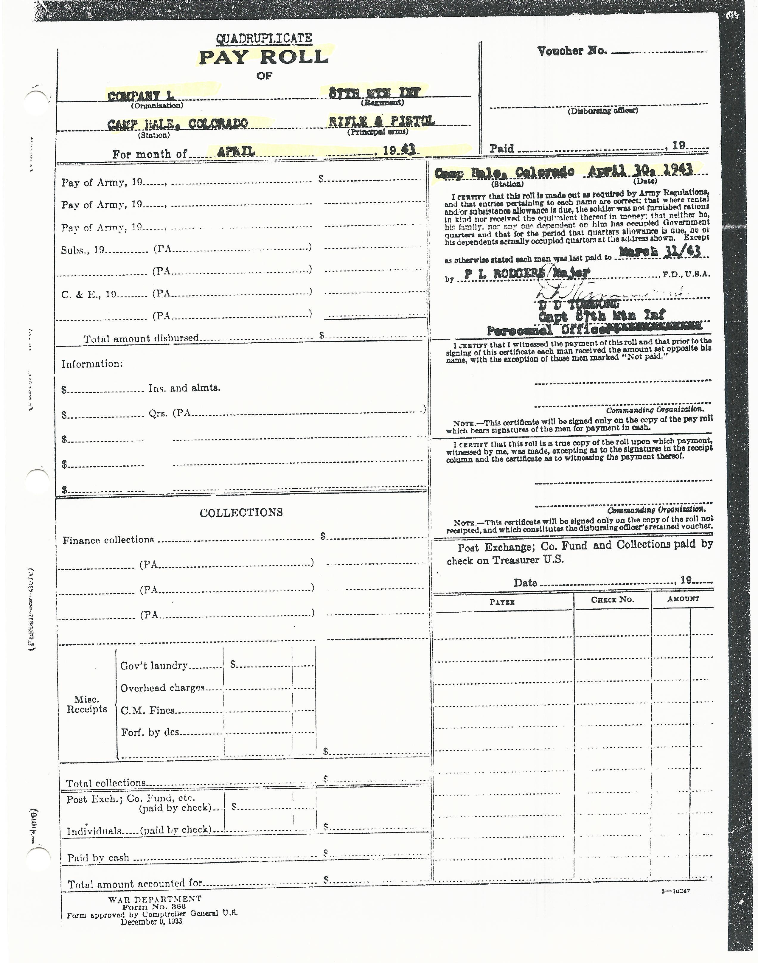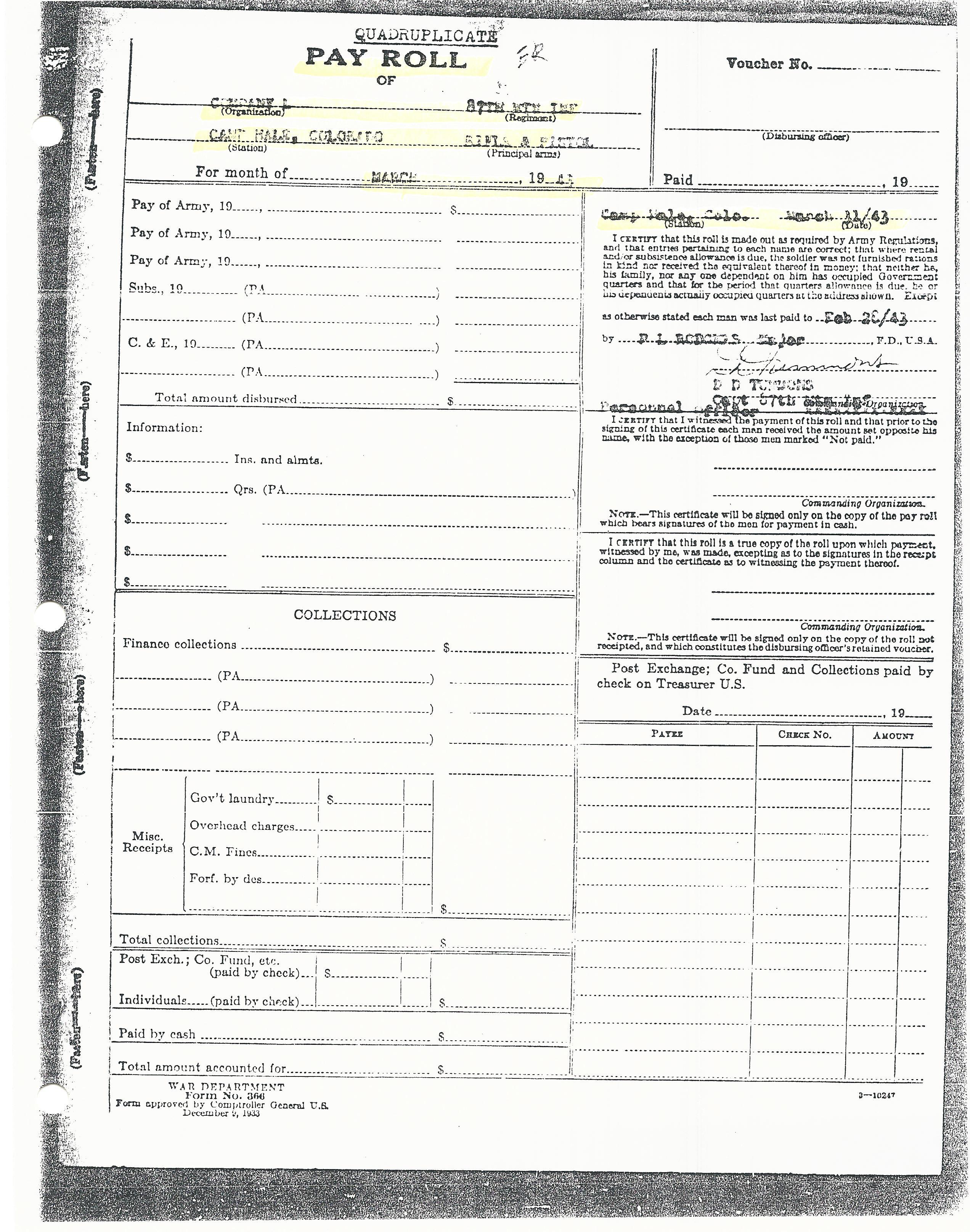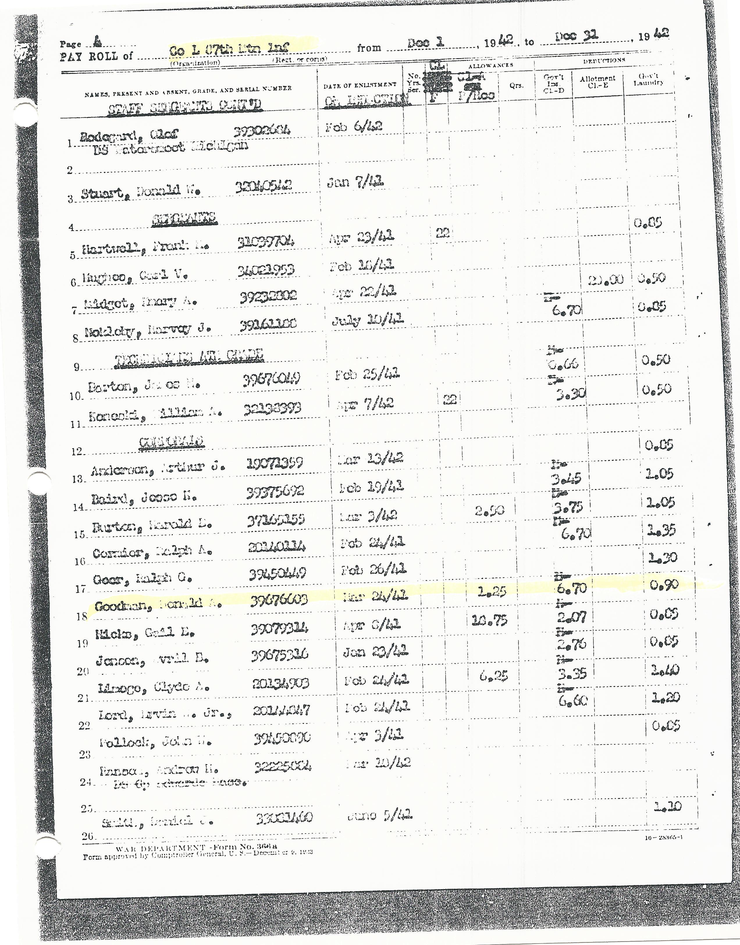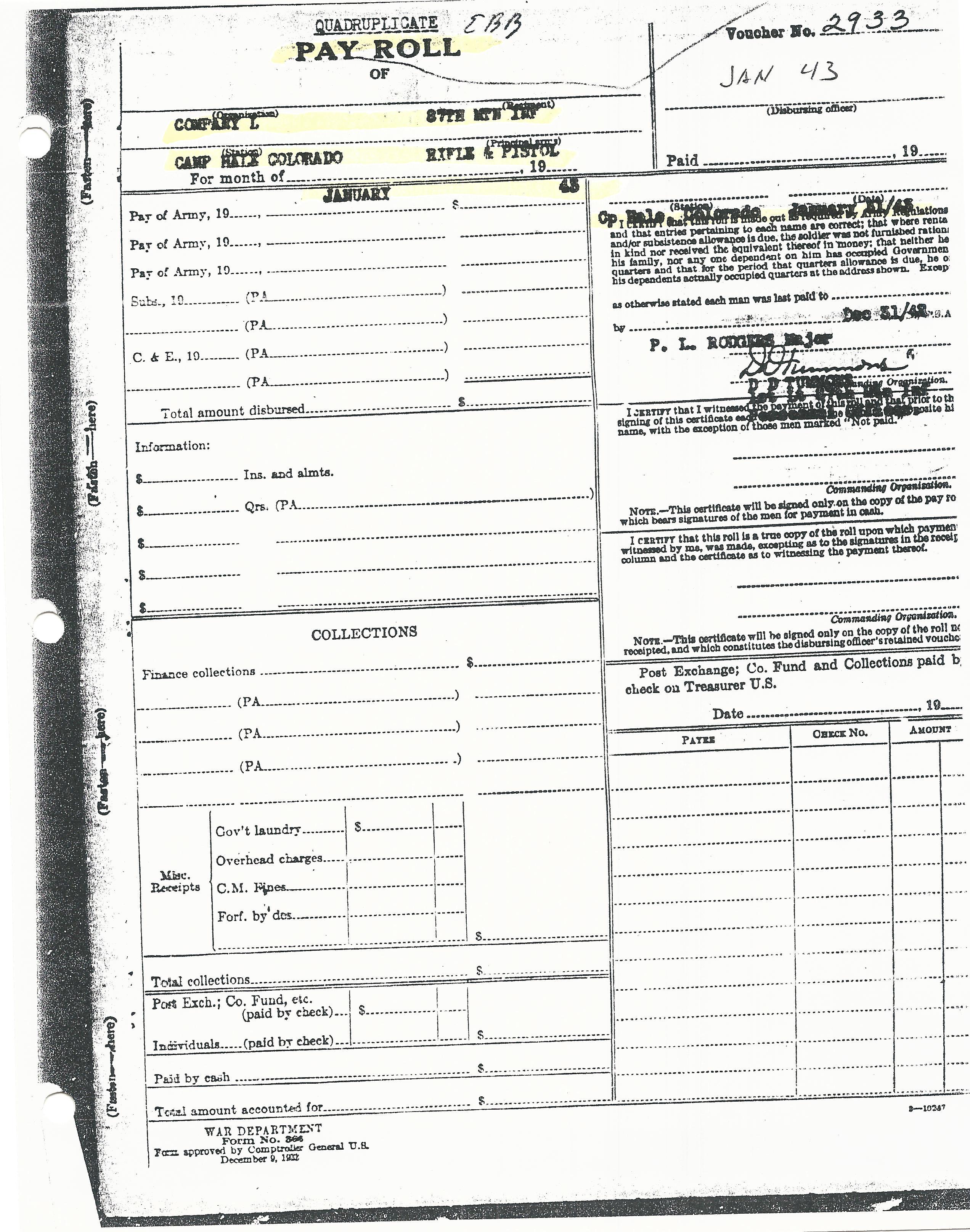 The September 1943 payroll report notes Donald having been demoted to Private and transferred to Company E in August, but we do not have documentation specifically concerning his demotion. This report also shows he was eligible for a 20% increase in pay for foreign service for the time he was at Kiska. Donald remained as part of the occupation force until the end of December, when the 87th returned to the States and all of the men were granted leave.