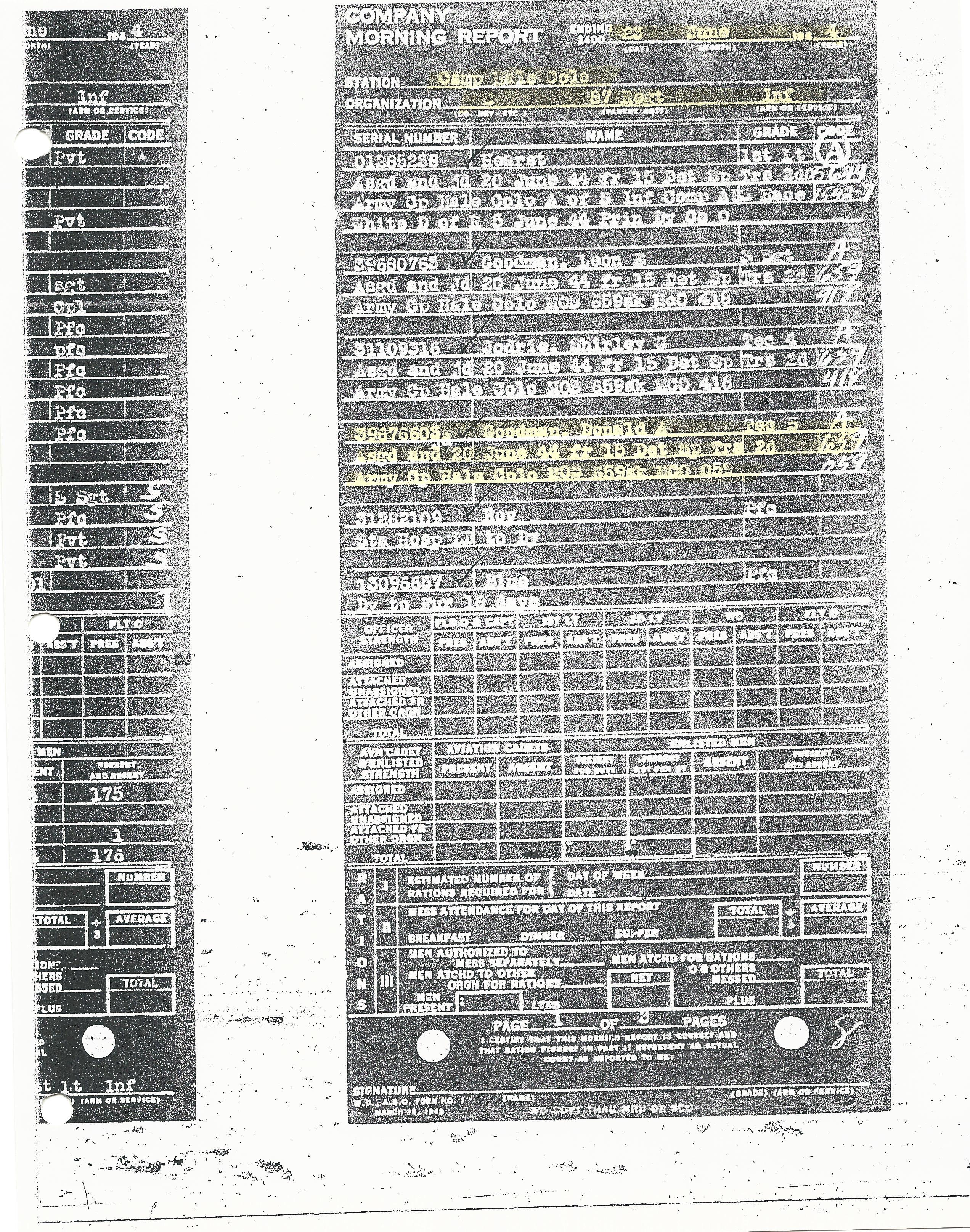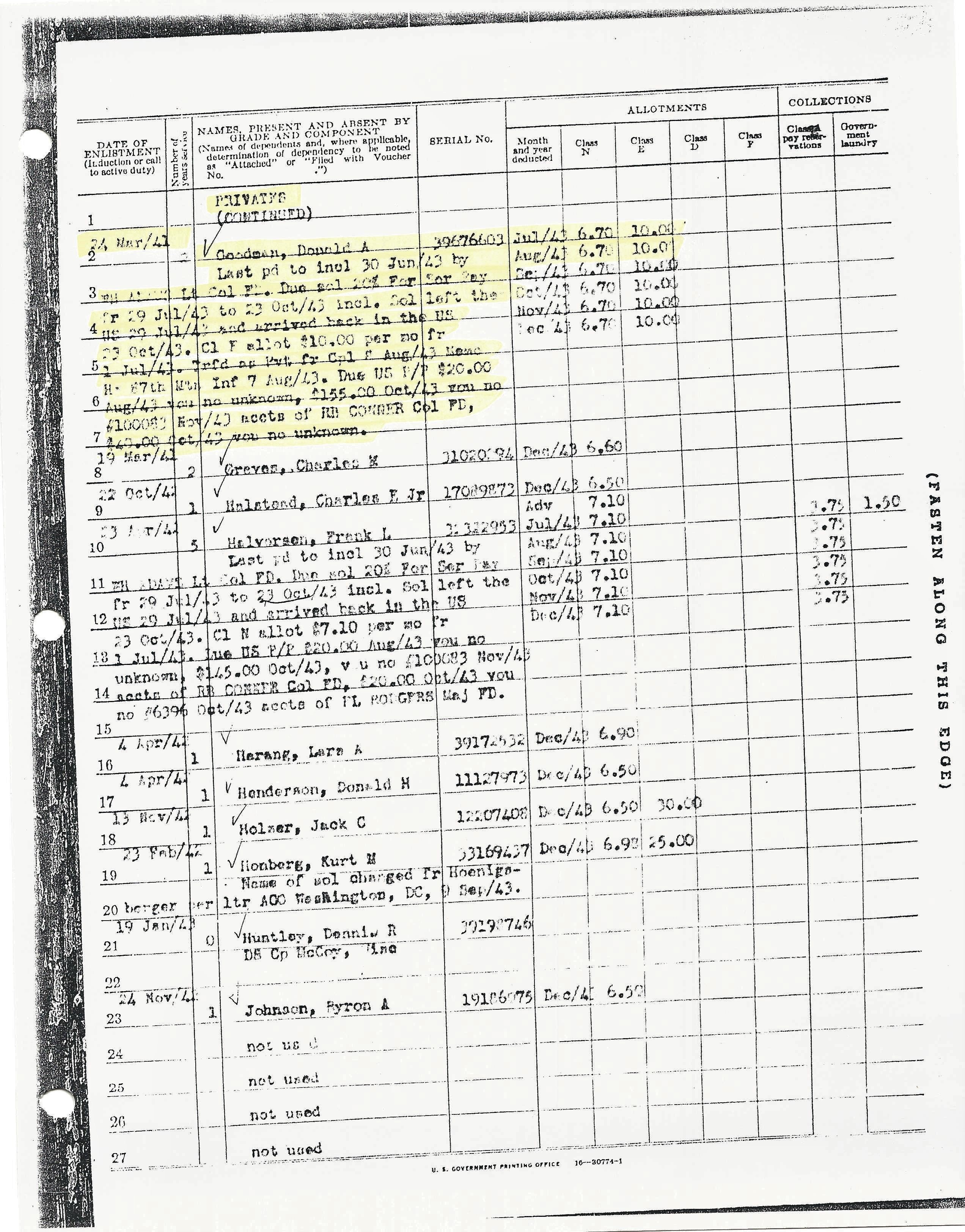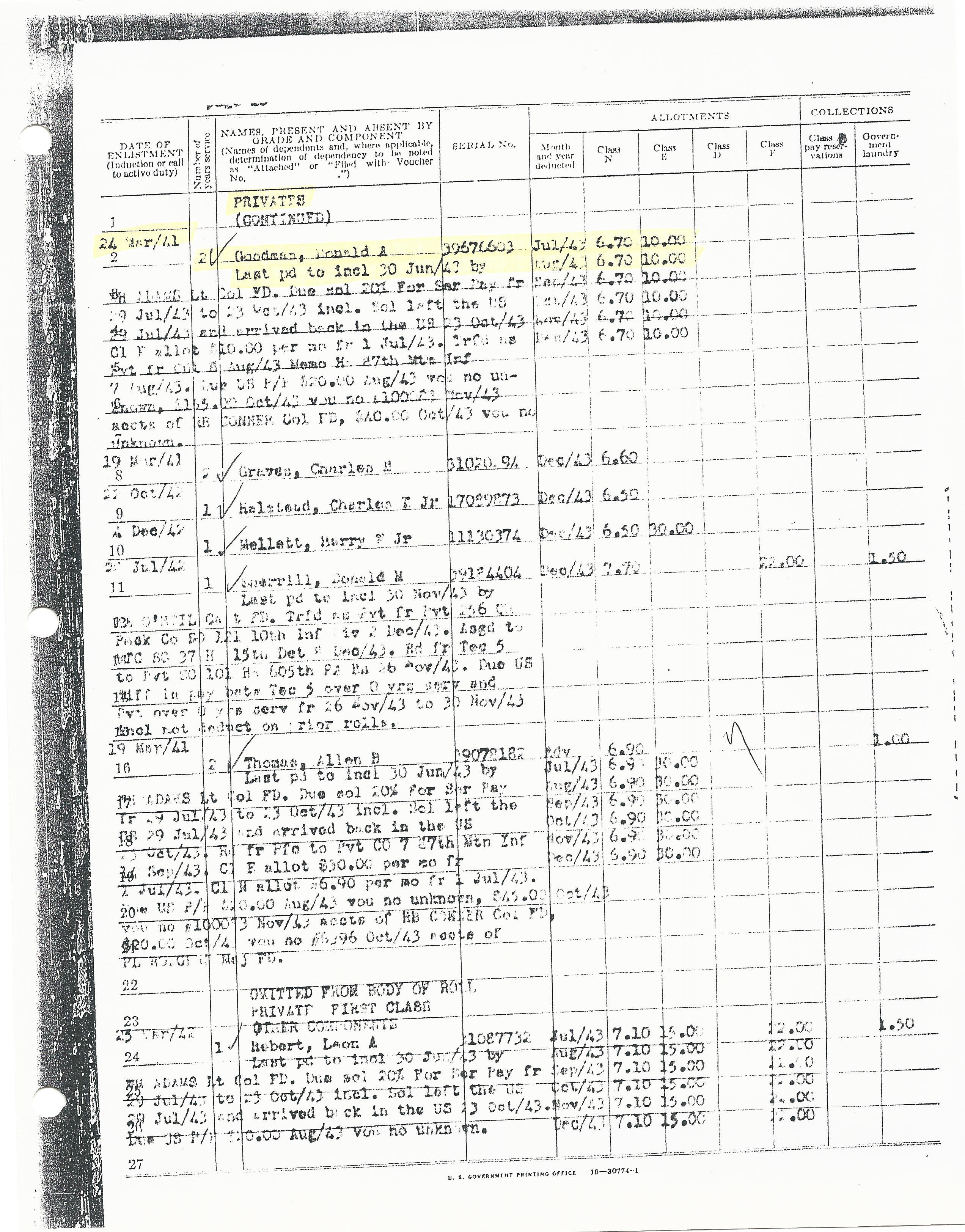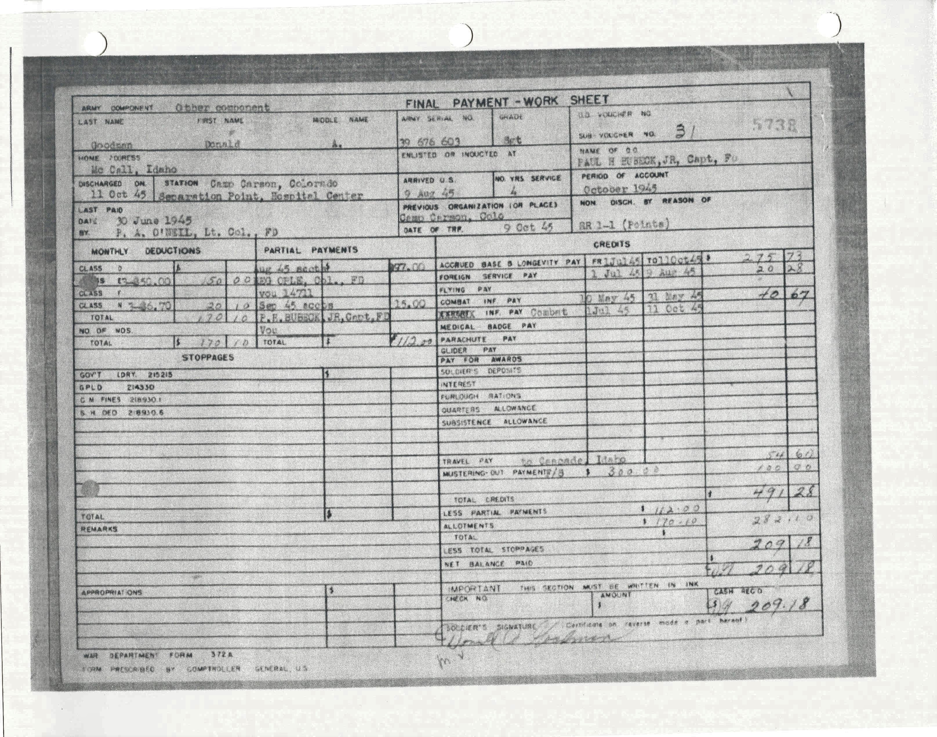 The September 1943 payroll report notes Donald having been demoted to Private and transferred to Company E in August, but we do not have documentation specifically concerning his demotion. This report also shows he was eligible for a 20% increase in pay for foreign service for the time he was at Kiska. Donald remained as part of the occupation force until the end of December, when the 87th returned to the States and all of the men were granted leave.