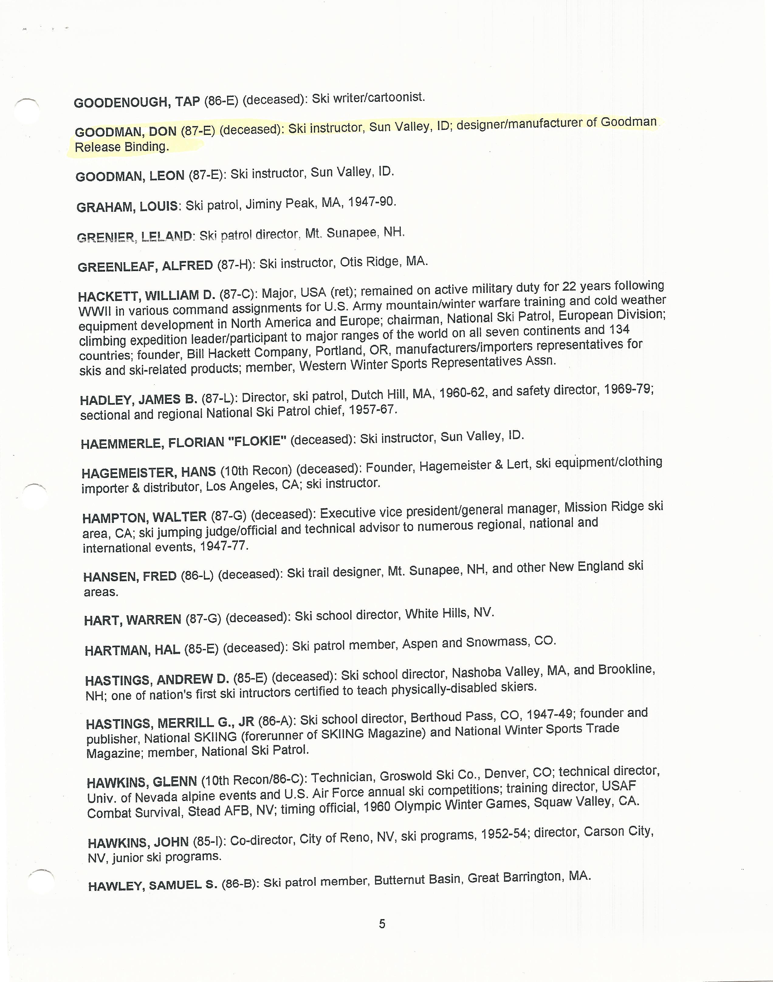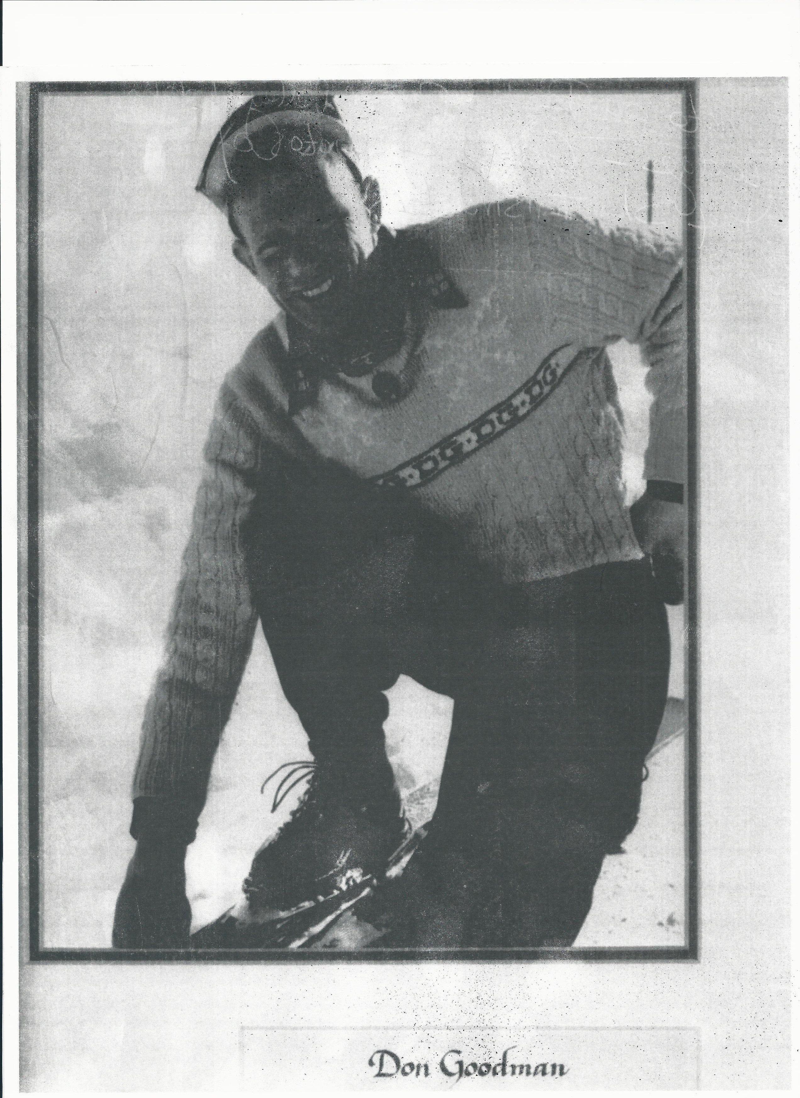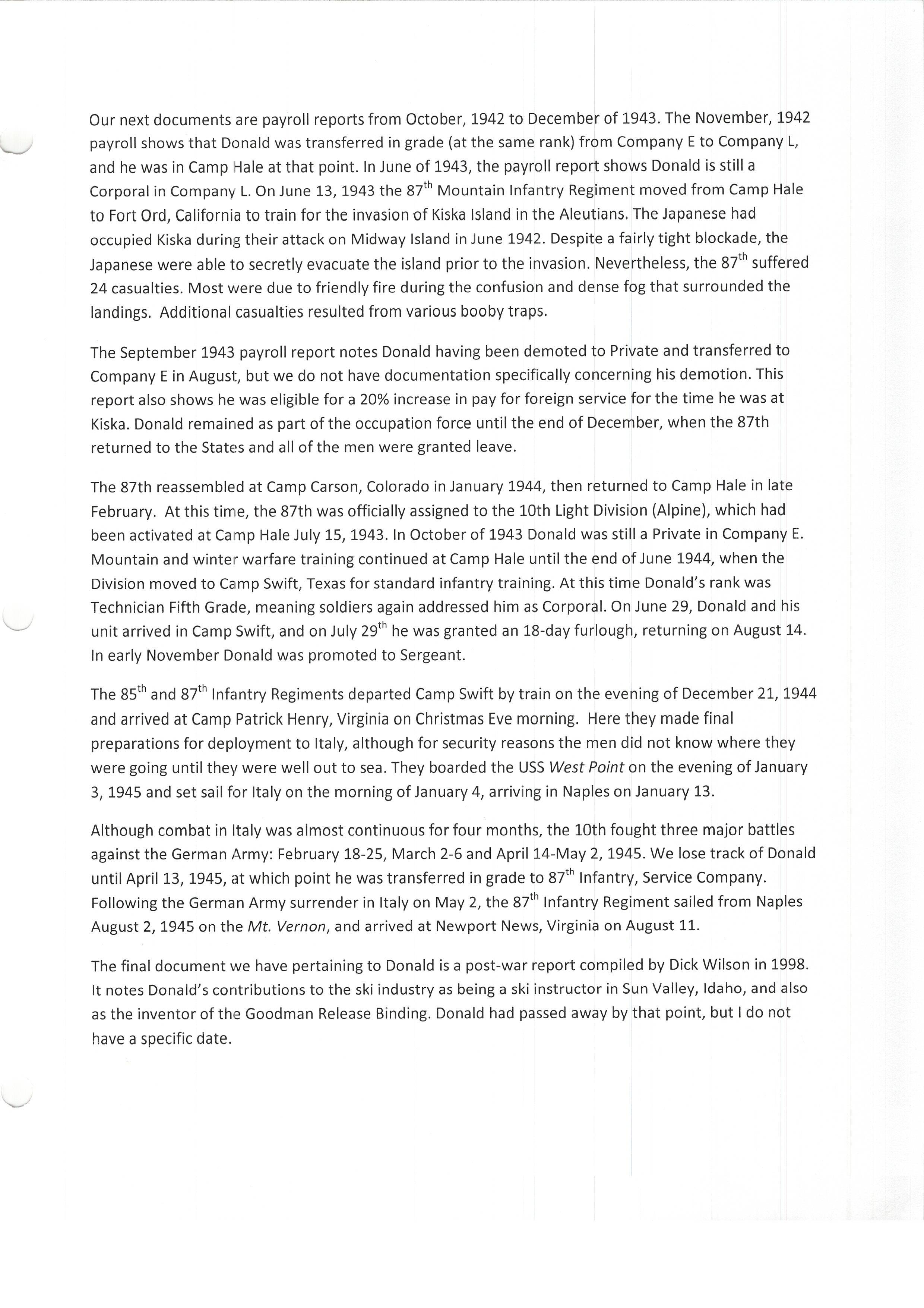 The final document we have pertaining to Donald is a post-war report compiled by Dick Wilson in 1998. It notes Donald's contributions to the ski industry as being a ski instructor in Sun Valley, Idaho, and also as the inventor of the Goodman Release Binding. Donald had passed away by that point, but I do not have a specific date.