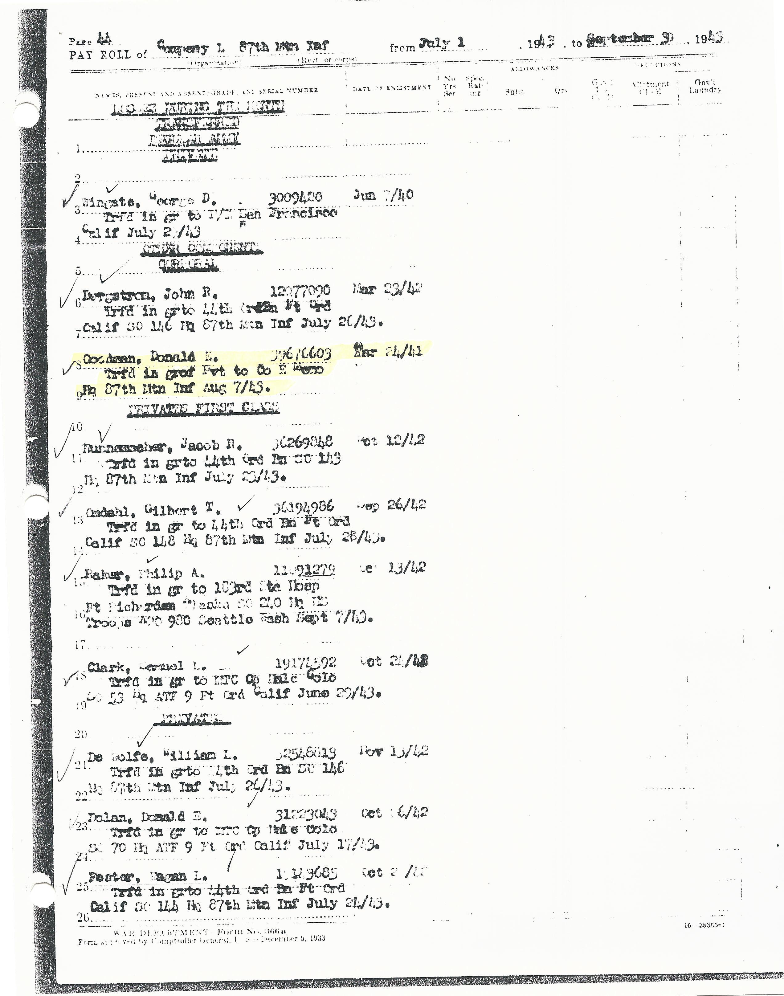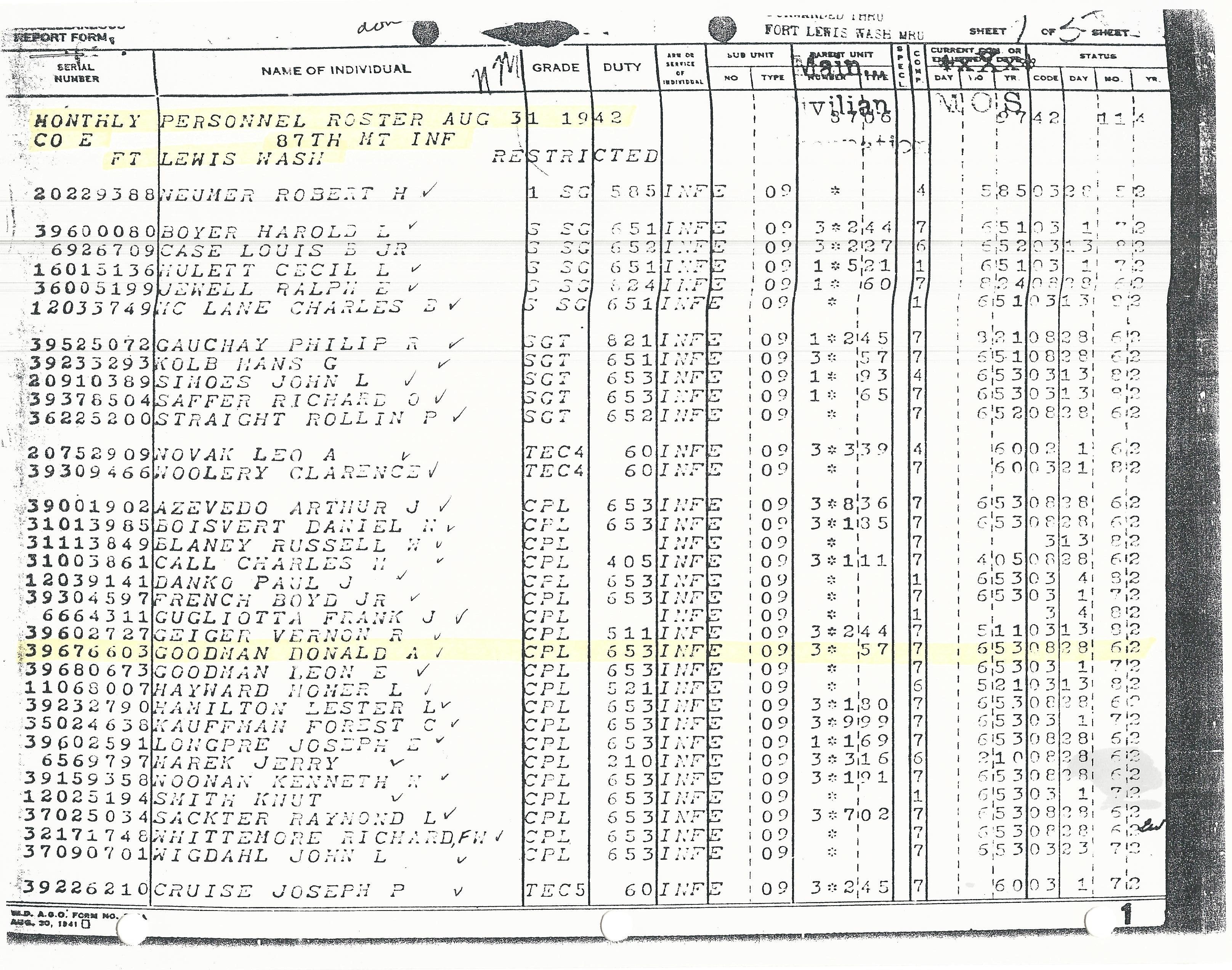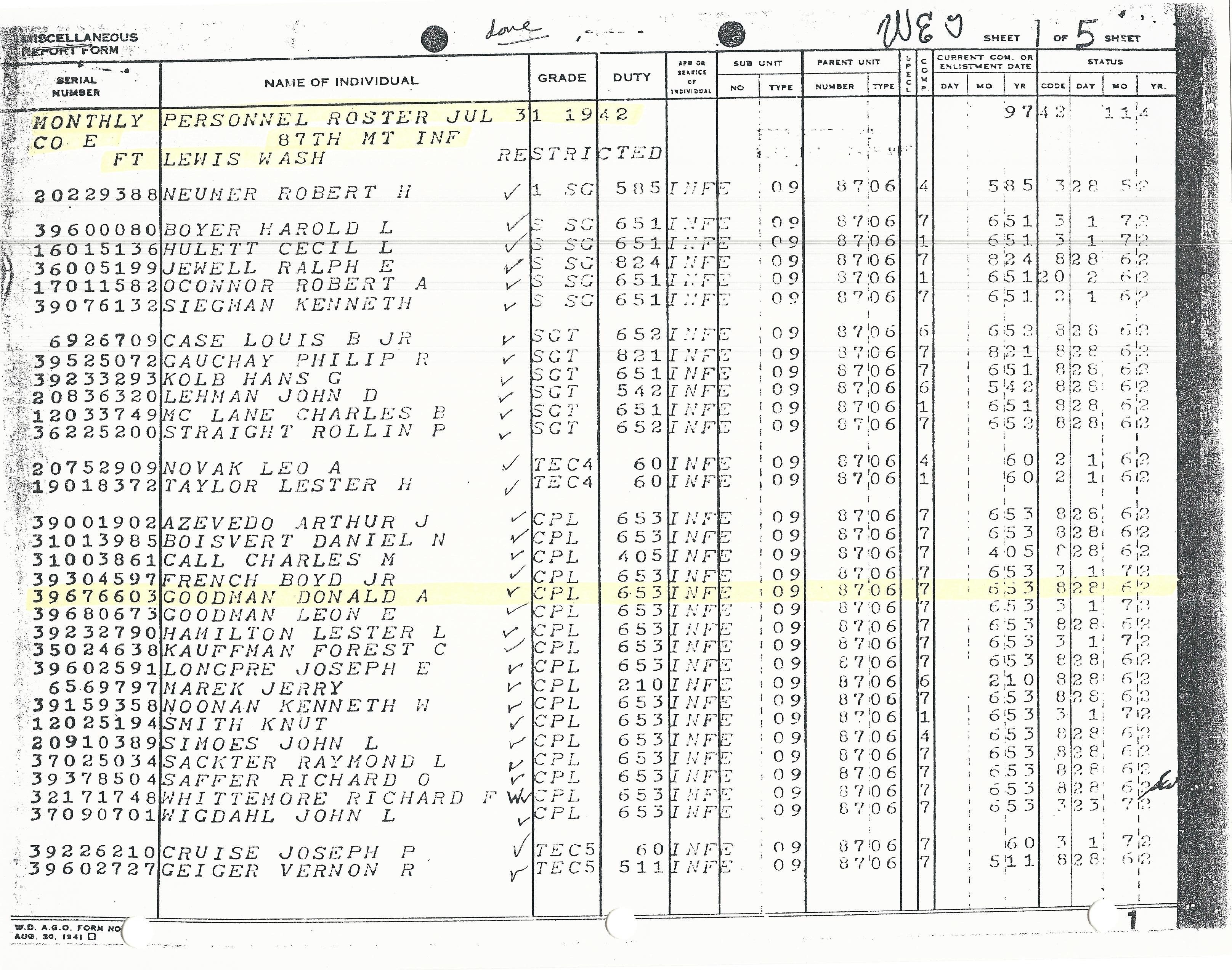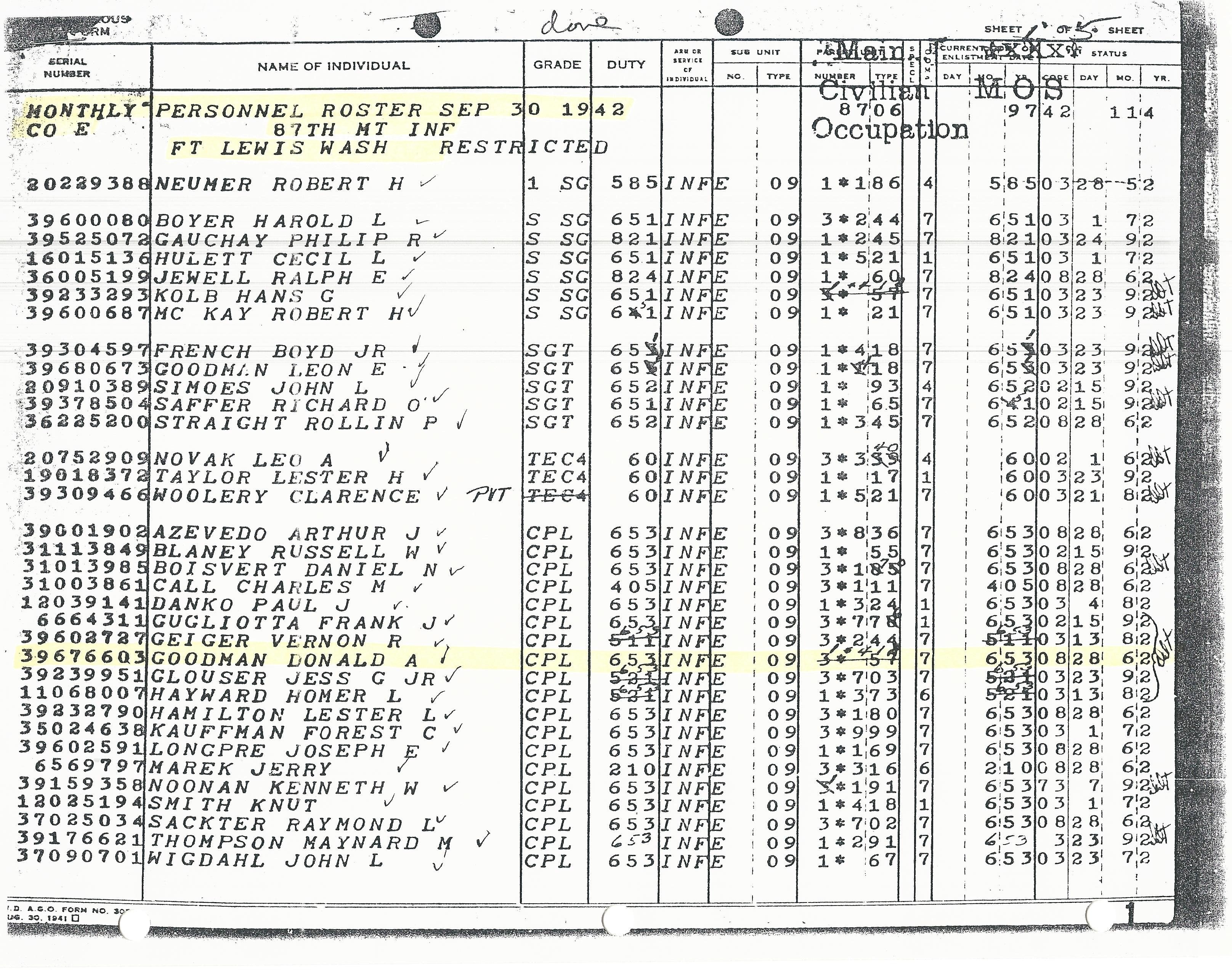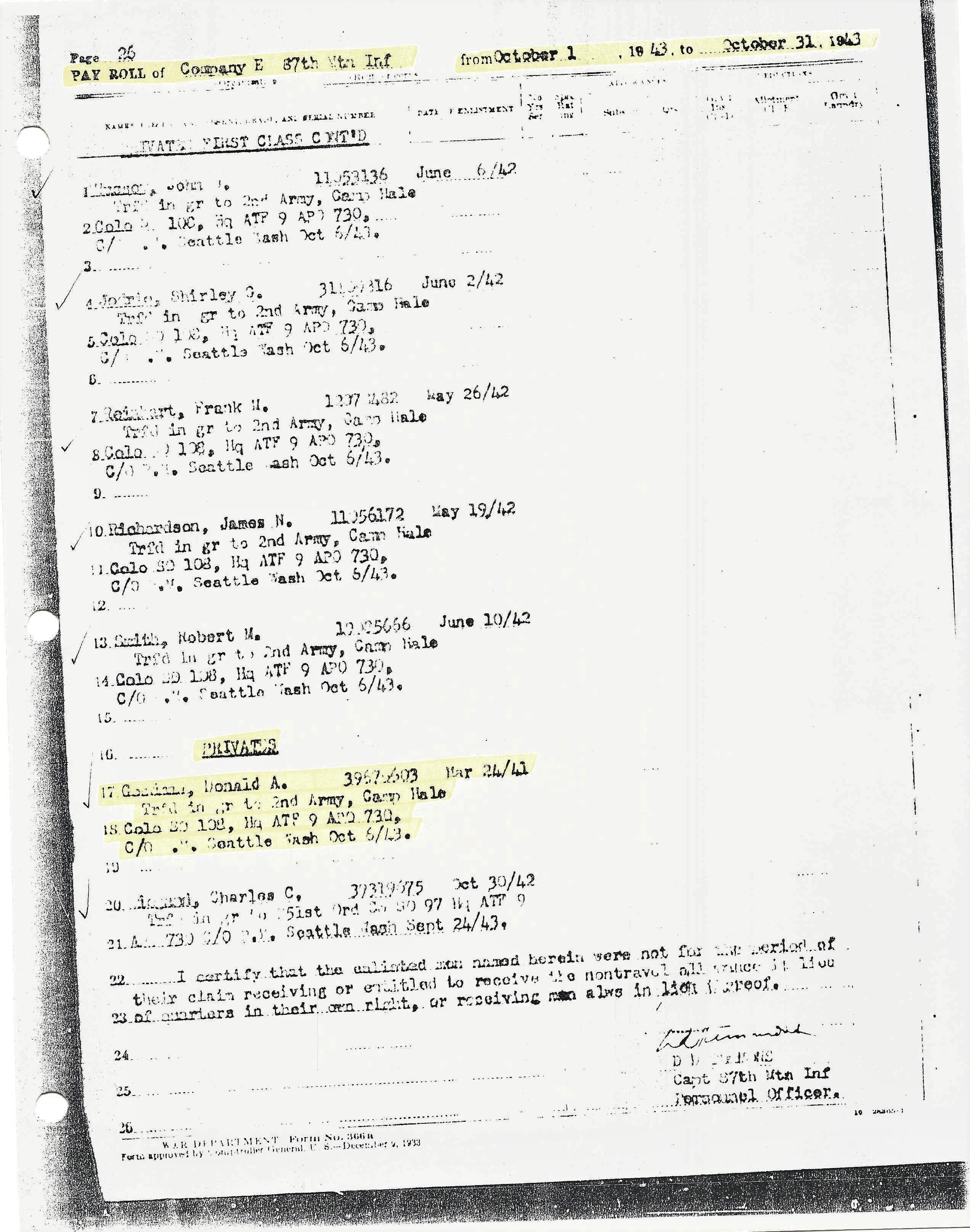 Donald enlisted on March 3, 1941, around the age of 24, in Salt Lake City, Utah. He had completed one year of college, and was not married. His civilian occupation was listed as "Athletes, sports instructors, and sports officials". The first documents we have regarding Donald are personnel rosters from January to September of 1942, when he joined what would later be designated the 10th Mountain Division. These rosters are from Fort Lewis, Washington and record that Donald was an Ammunition Handler (Duty code 504) in the 87th Infantry, Company A. The rosters also allow us to put together the timeline of his promotions. In February of 1942 he was promoted to Private First Class. The March roster lists him again as Private, but I believe this to be an error, as subsequent rosters list him as Private First Class. In June of 1942 Donald was promoted to Corporal, and his duty was changed to Squad Leader of 87th Infantry, Company E.