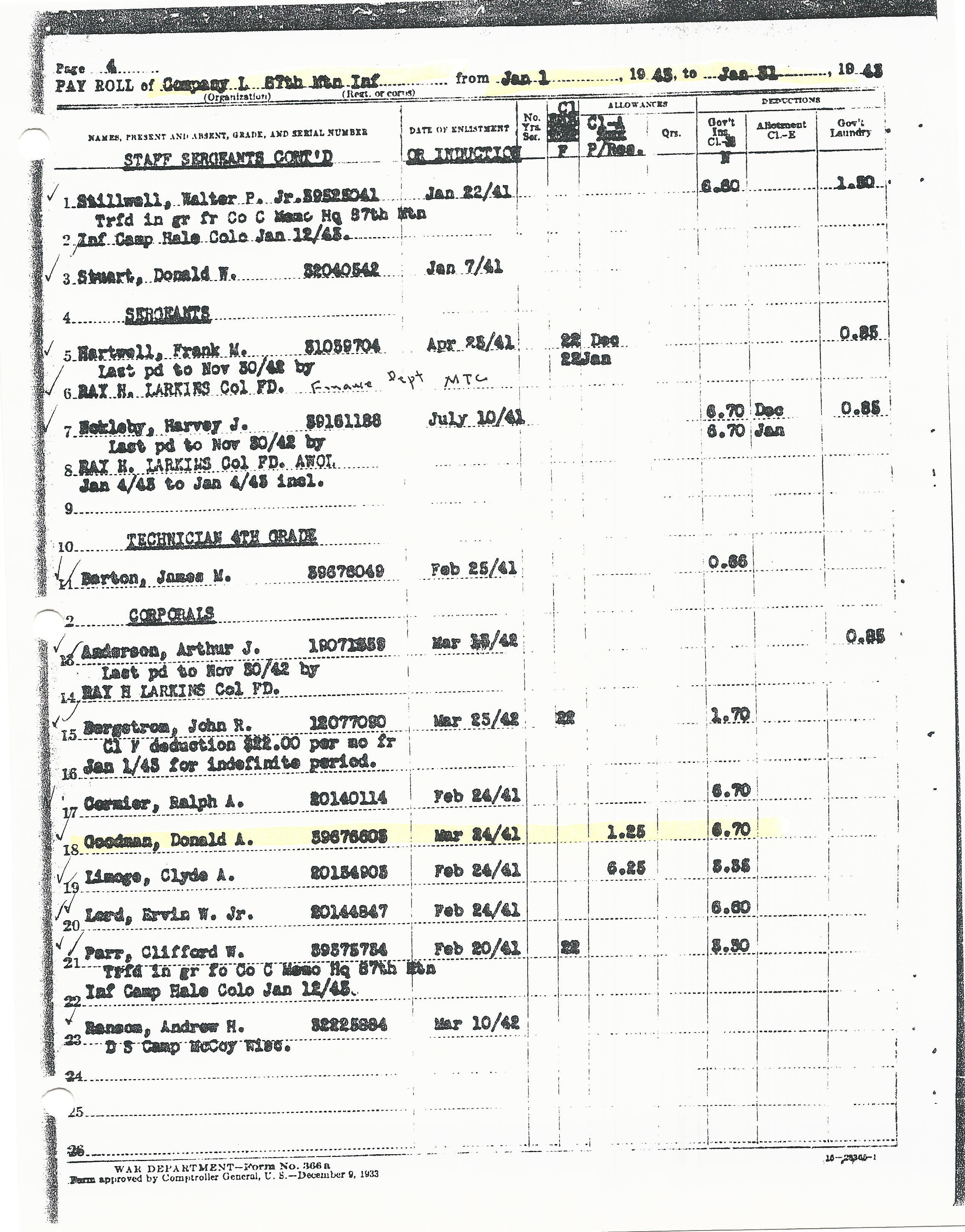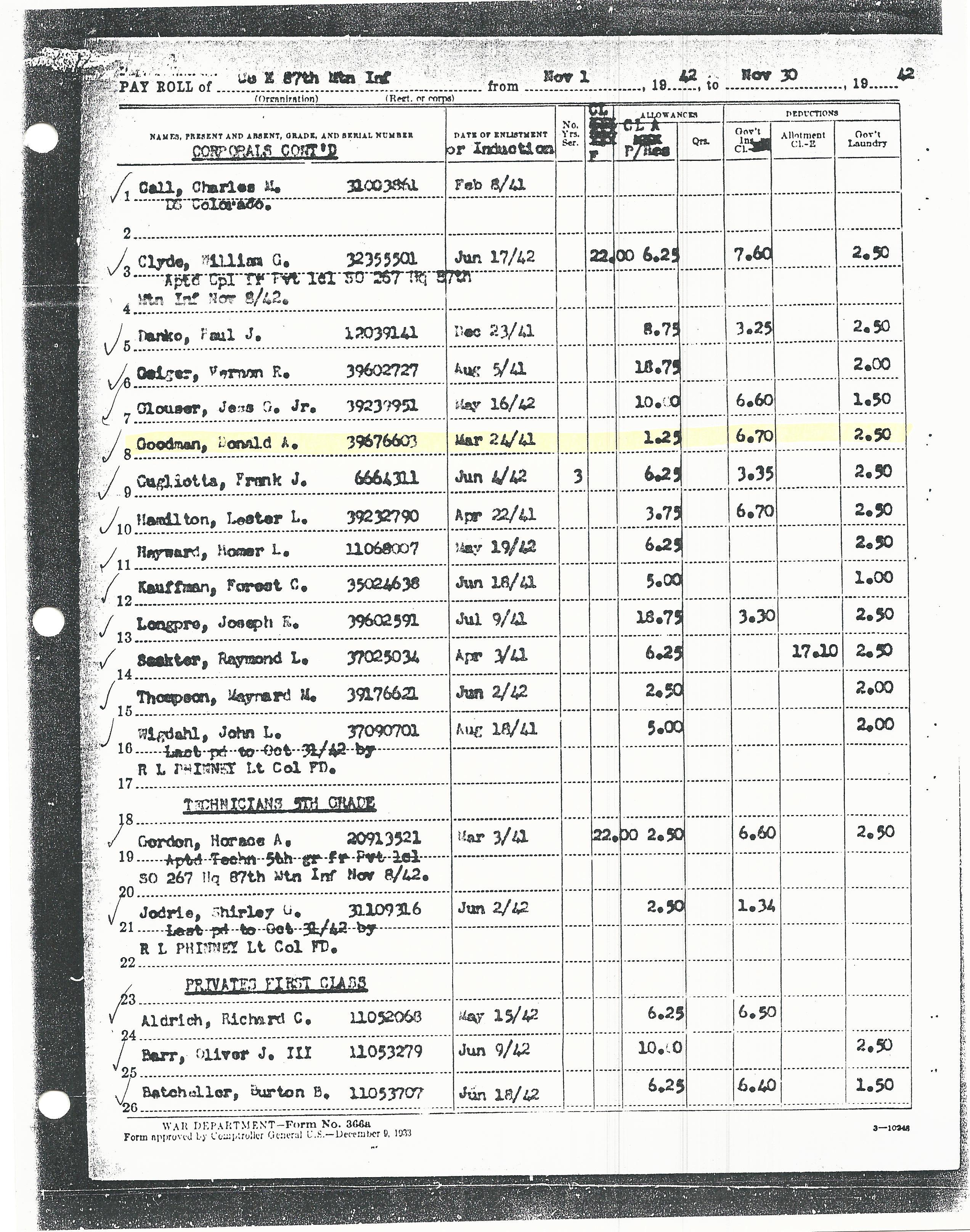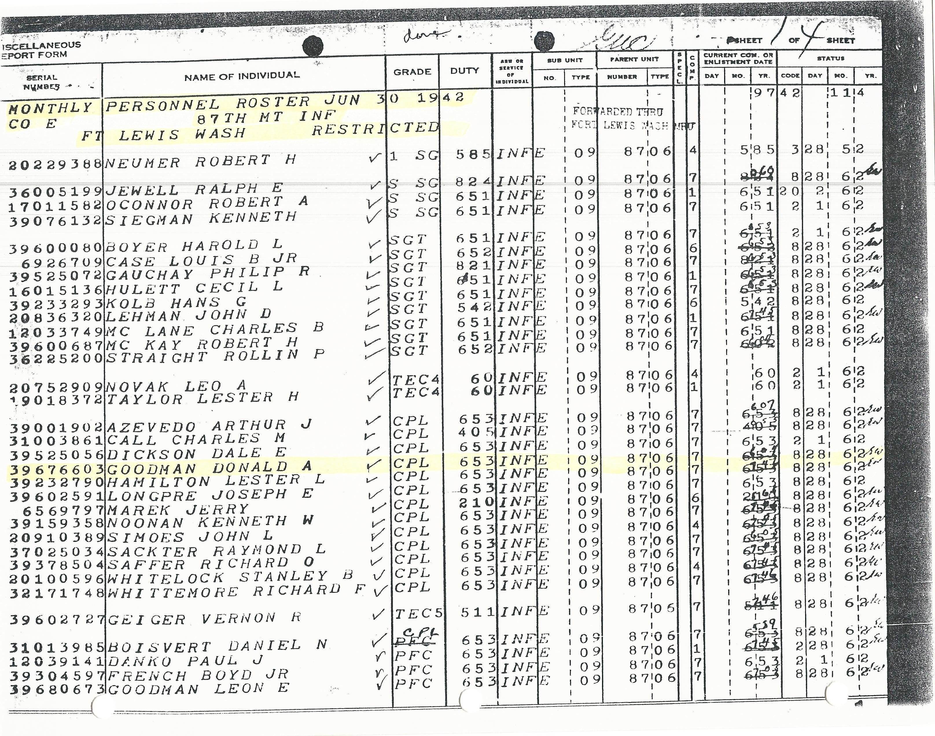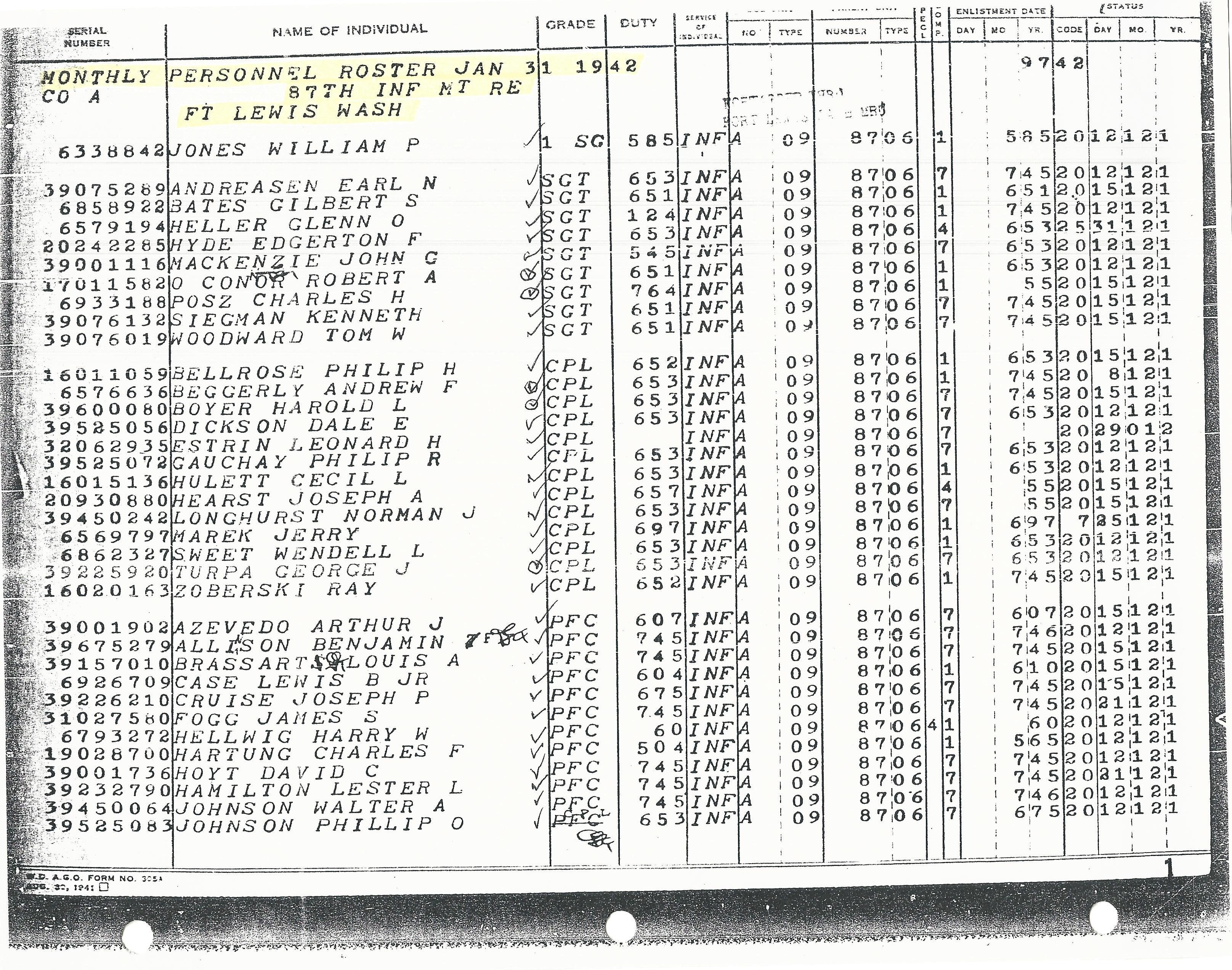Donald enlisted on March 3, 1941, around the age of 24, in Salt Lake City, Utah. He had completed one year of college, and was not married. His civilian occupation was listed as "Athletes, sports instructors, and sports officials". The first documents we have regarding Donald are personnel rosters from January to September of 1942, when he joined what would later be designated the 10th Mountain Division. These rosters are from Fort Lewis, Washington and record that Donald was an Ammunition Handler (Duty code 504) in the 87th Infantry, Company A. The rosters also allow us to put together the timeline of his promotions. In February of 1942 he was promoted to Private First Class. The March roster lists him again as Private, but I believe this to be an error, as subsequent rosters list him as Private First Class. In June of 1942 Donald was promoted to Corporal, and his duty was changed to Squad Leader of 87th Infantry, Company E.