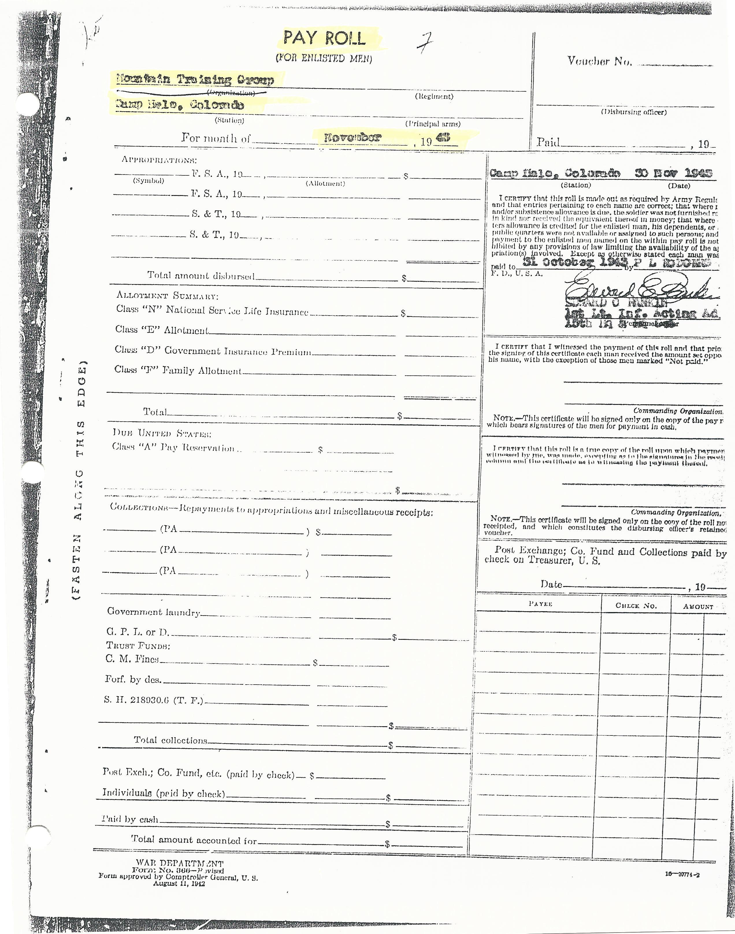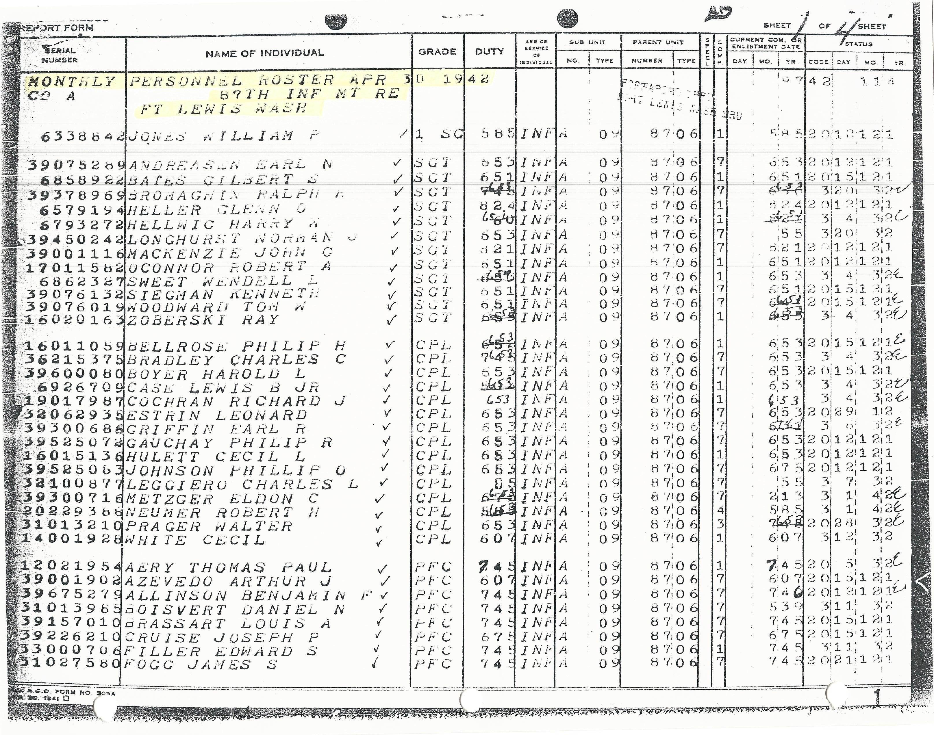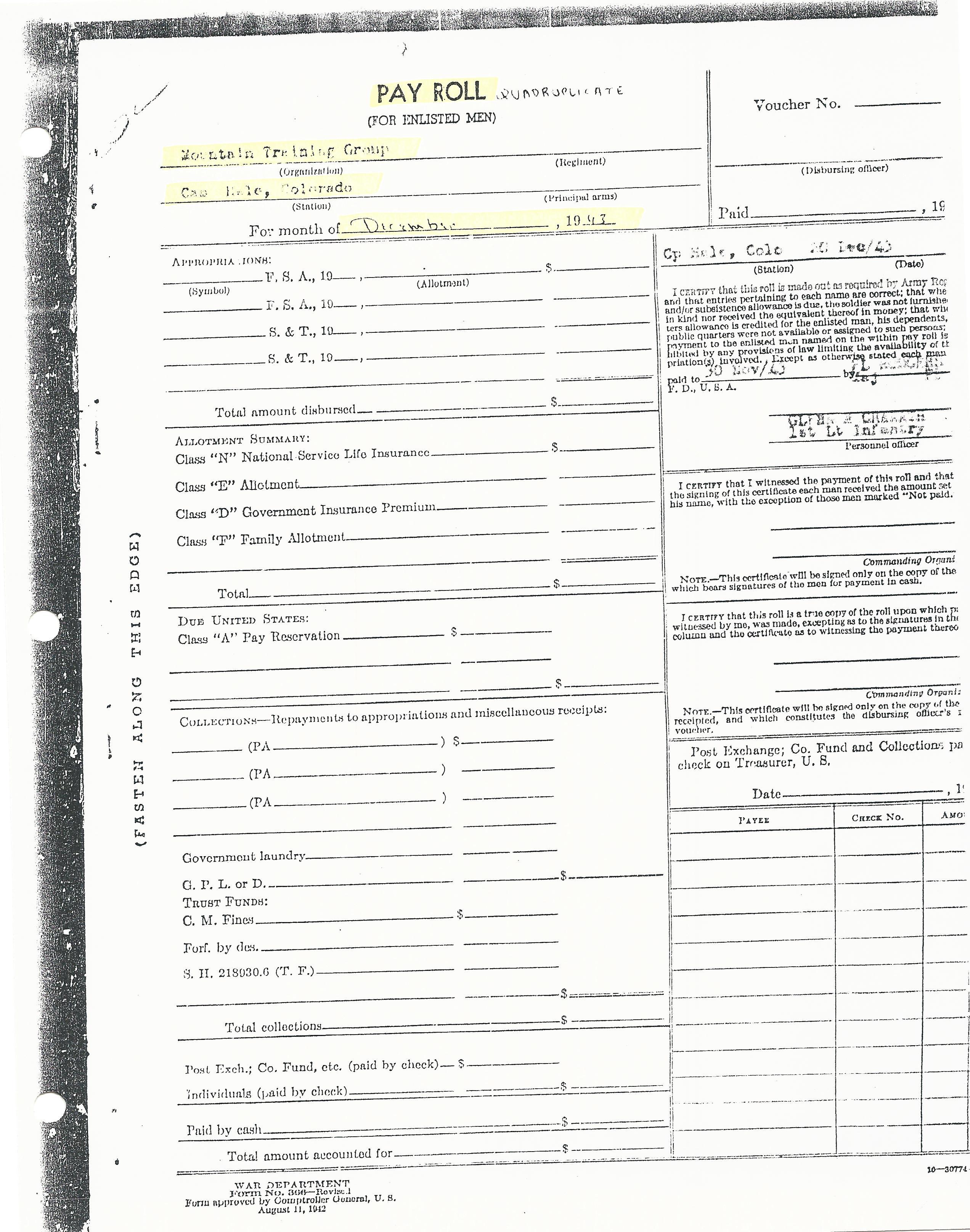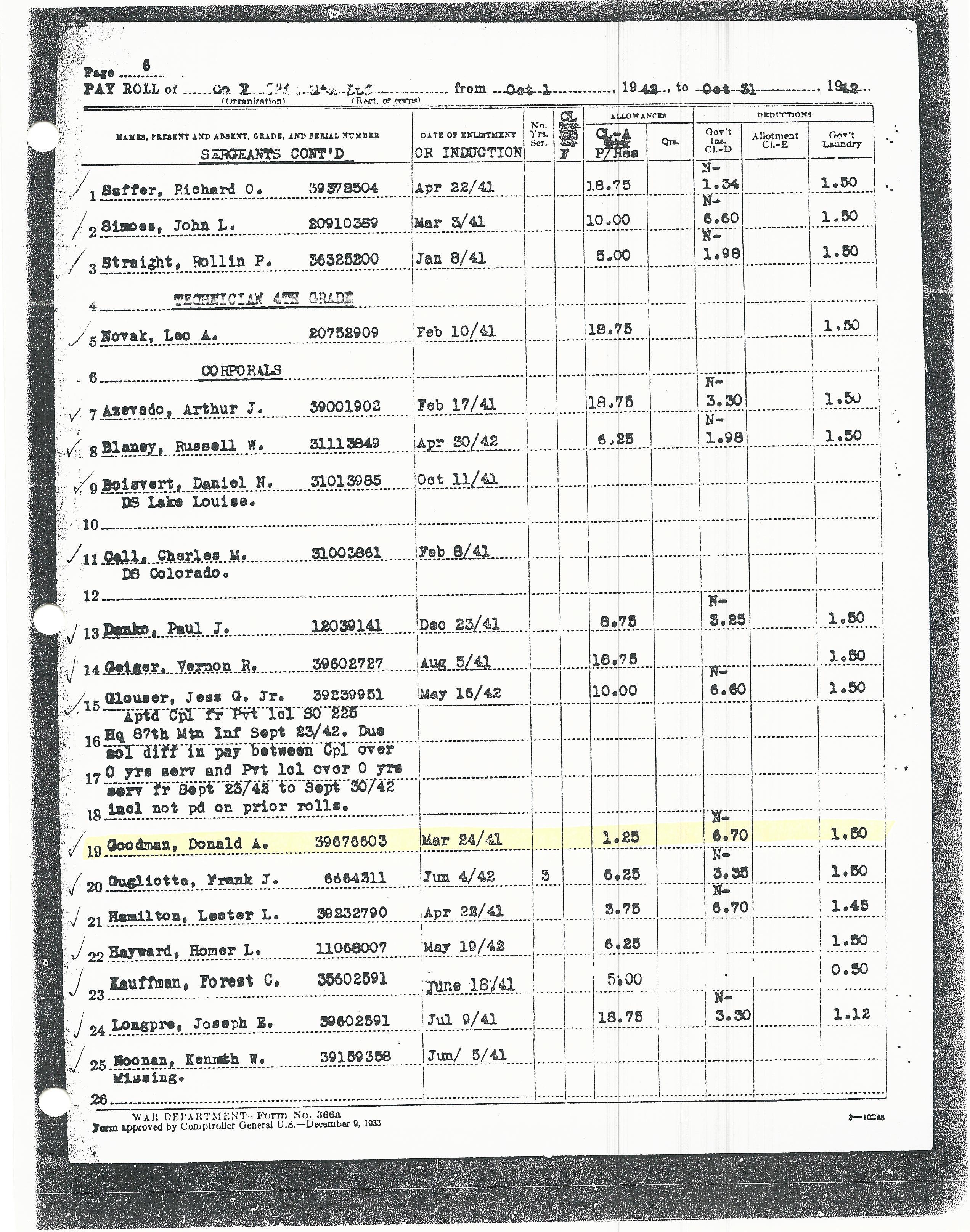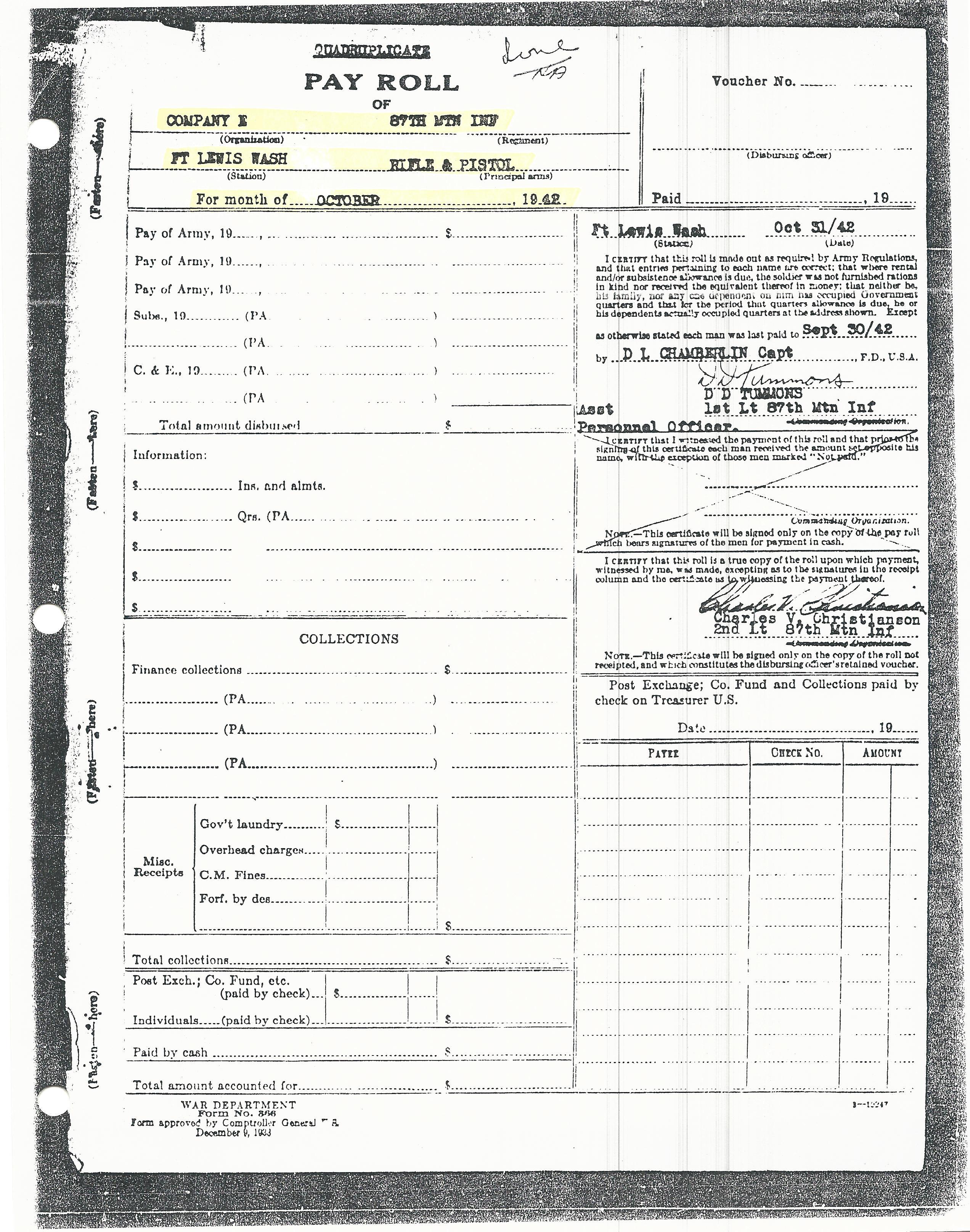 Donald enlisted on March 3, 1941, around the age of 24, in Salt Lake City, Utah. He had completed one year of college, and was not married. His civilian occupation was listed as "Athletes, sports instructors, and sports officials". The first documents we have regarding Donald are personnel rosters from January to September of 1942, when he joined what would later be designated the 10th Mountain Division. These rosters are from Fort Lewis, Washington and record that Donald was an Ammunition Handler (Duty code 504) in the 87th Infantry, Company A. The rosters also allow us to put together the timeline of his promotions. In February of 1942 he was promoted to Private First Class. The March roster lists him again as Private, but I believe this to be an error, as subsequent rosters list him as Private First Class. In June of 1942 Donald was promoted to Corporal, and his duty was changed to Squad Leader of 87th Infantry, Company E.