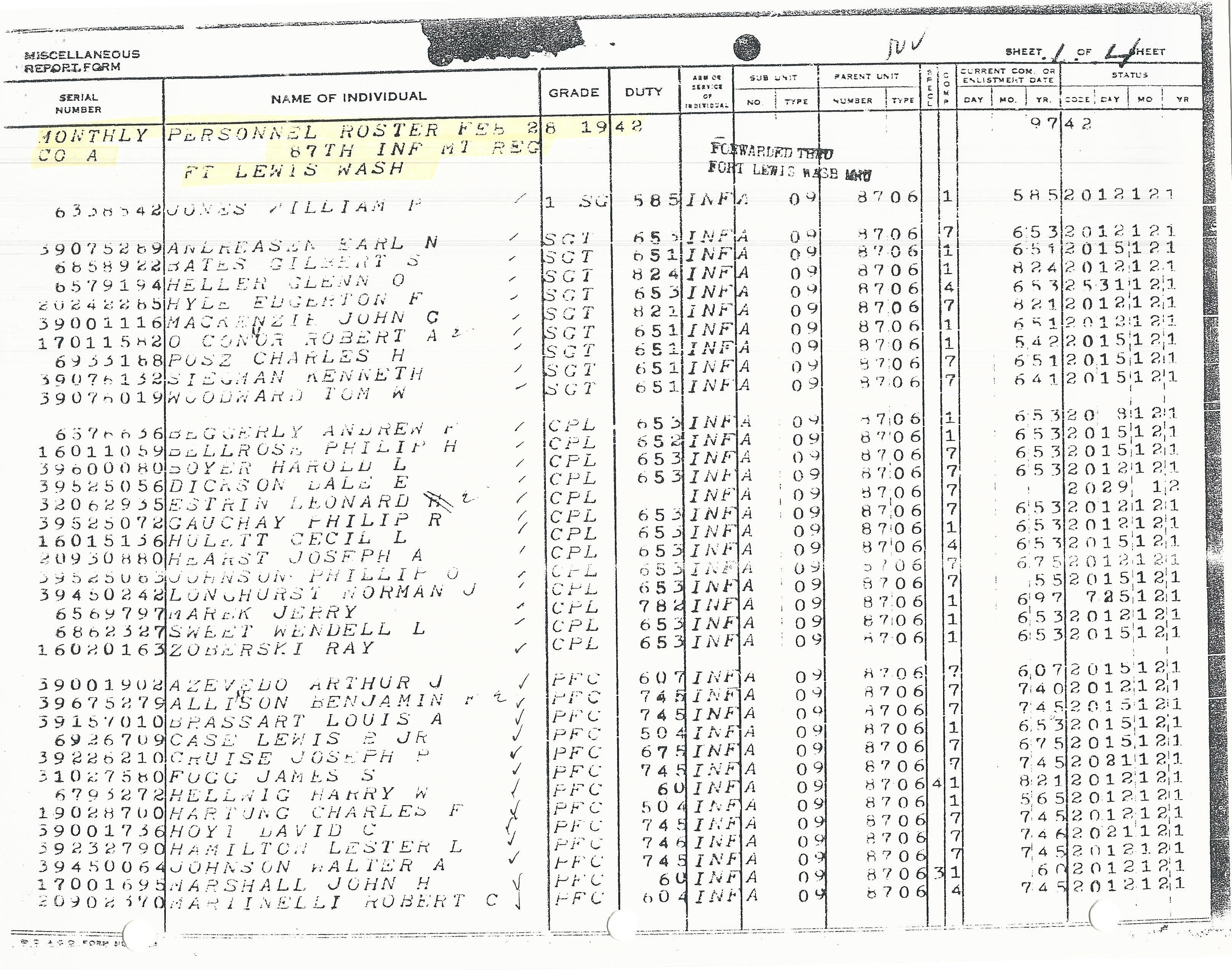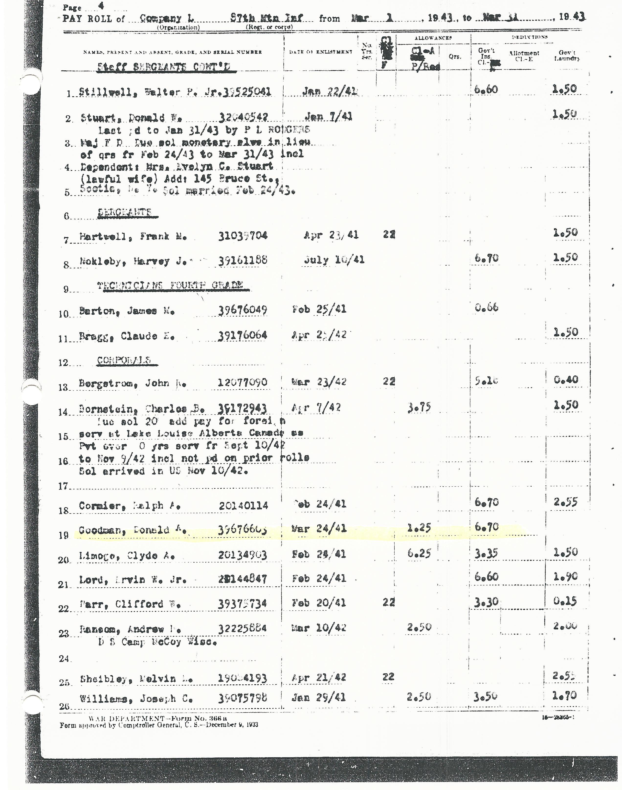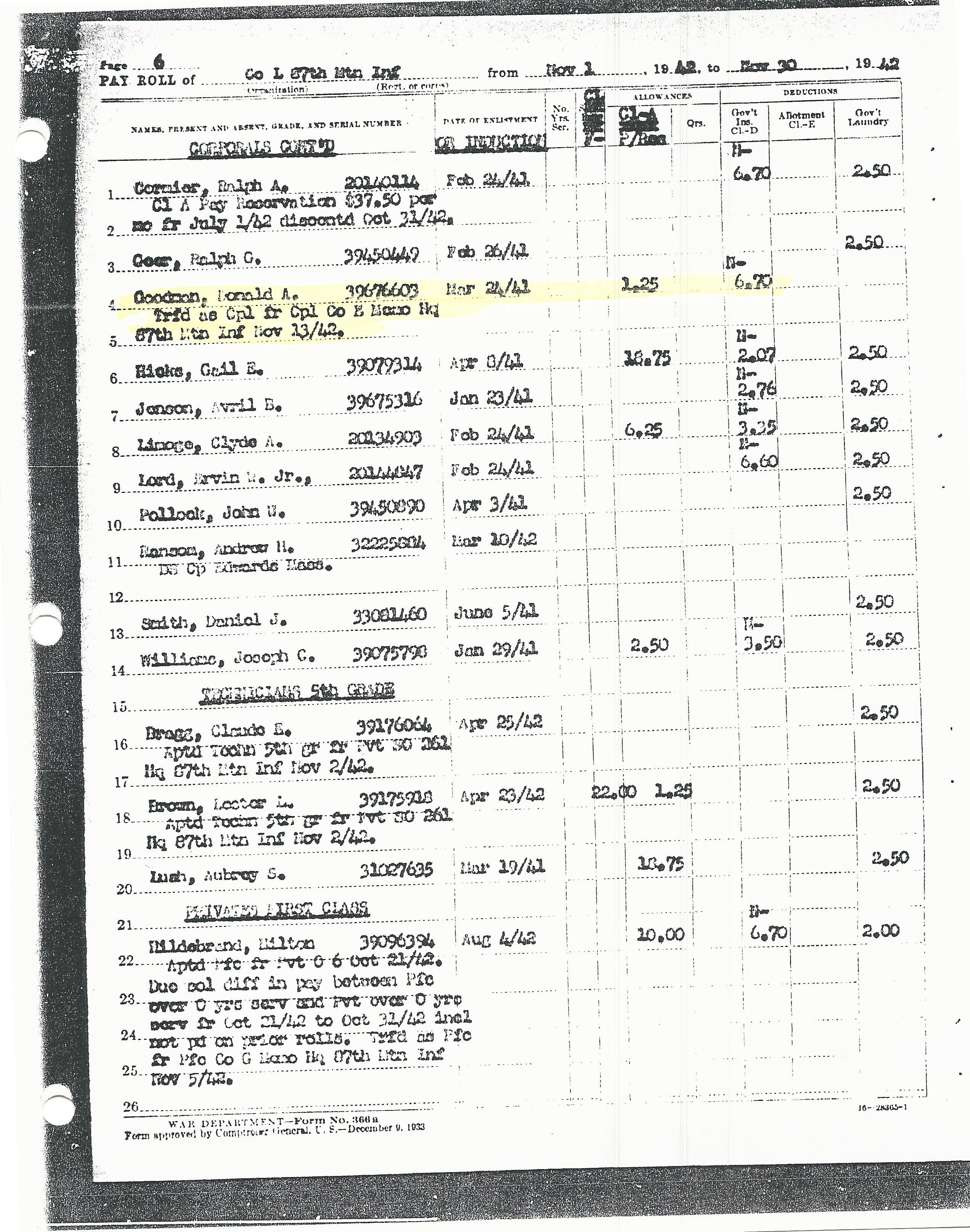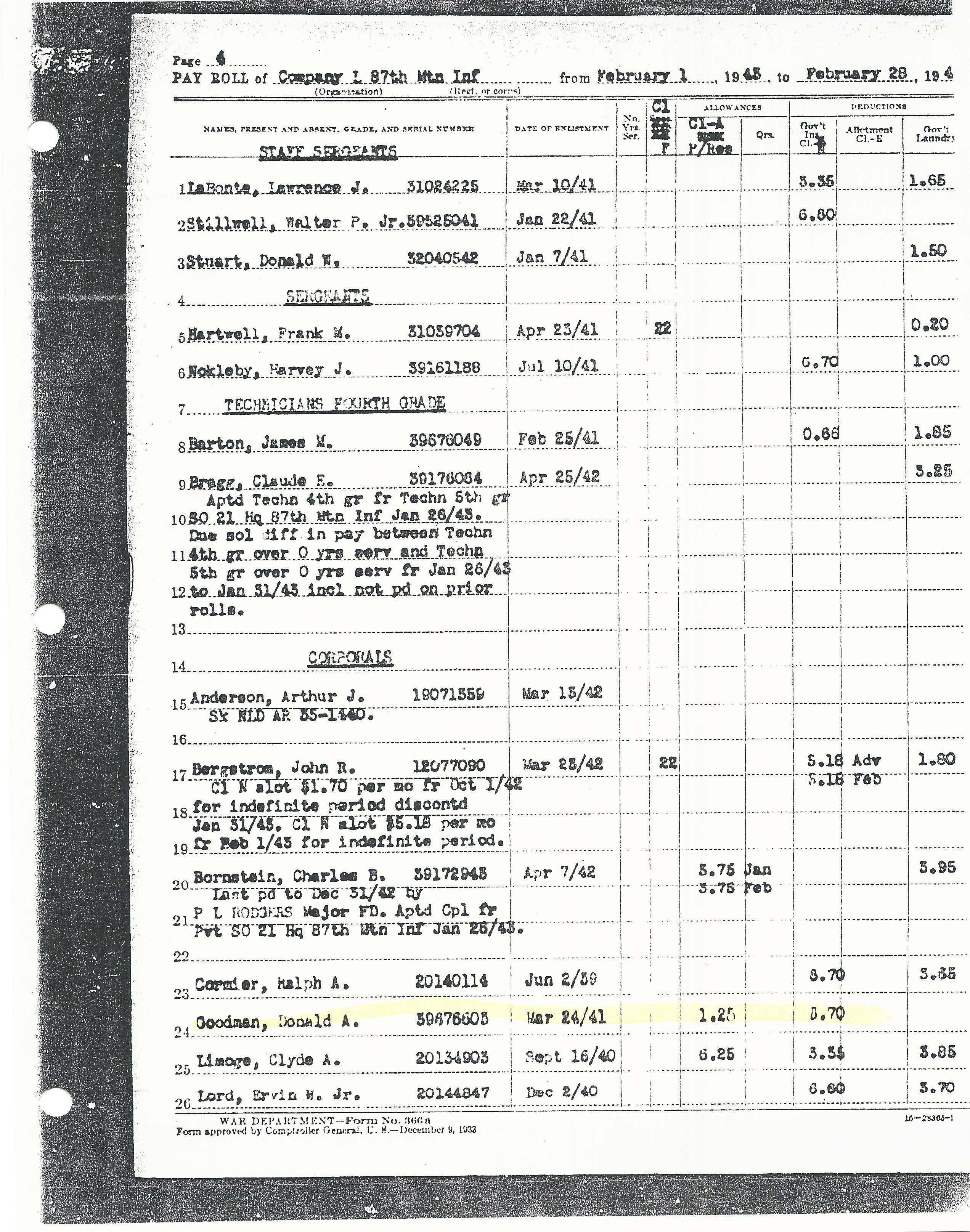 Donald enlisted on March 3, 1941, around the age of 24, in Salt Lake City, Utah. He had completed one year of college, and was not married. His civilian occupation was listed as "Athletes, sports instructors, and sports officials". The first documents we have regarding Donald are personnel rosters from January to September of 1942, when he joined what would later be designated the 10th Mountain Division. These rosters are from Fort Lewis, Washington and record that Donald was an Ammunition Handler (Duty code 504) in the 87th Infantry, Company A. The rosters also allow us to put together the timeline of his promotions. In February of 1942 he was promoted to Private First Class. The March roster lists him again as Private, but I believe this to be an error, as subsequent rosters list him as Private First Class. In June of 1942 Donald was promoted to Corporal, and his duty was changed to Squad Leader of 87th Infantry, Company E.