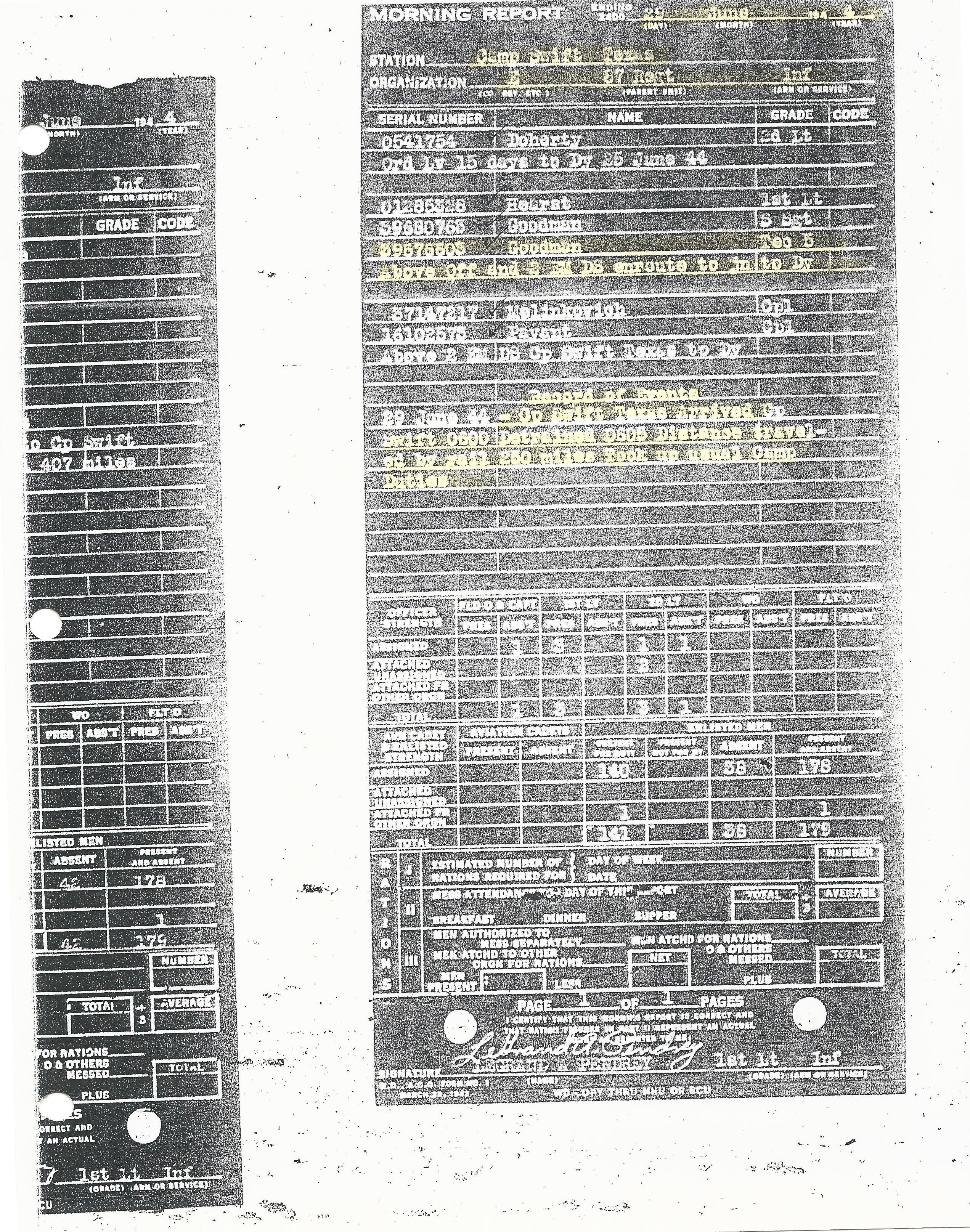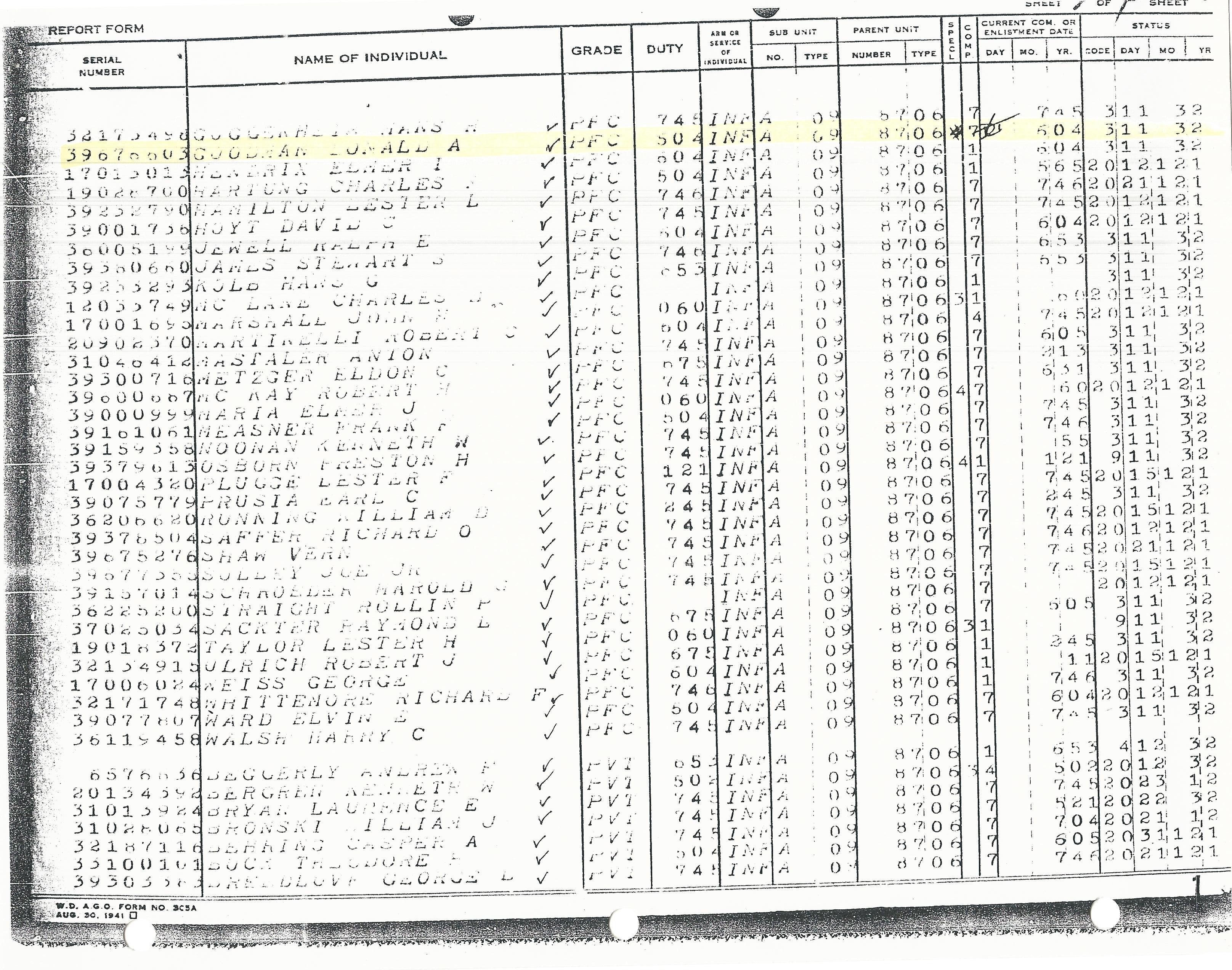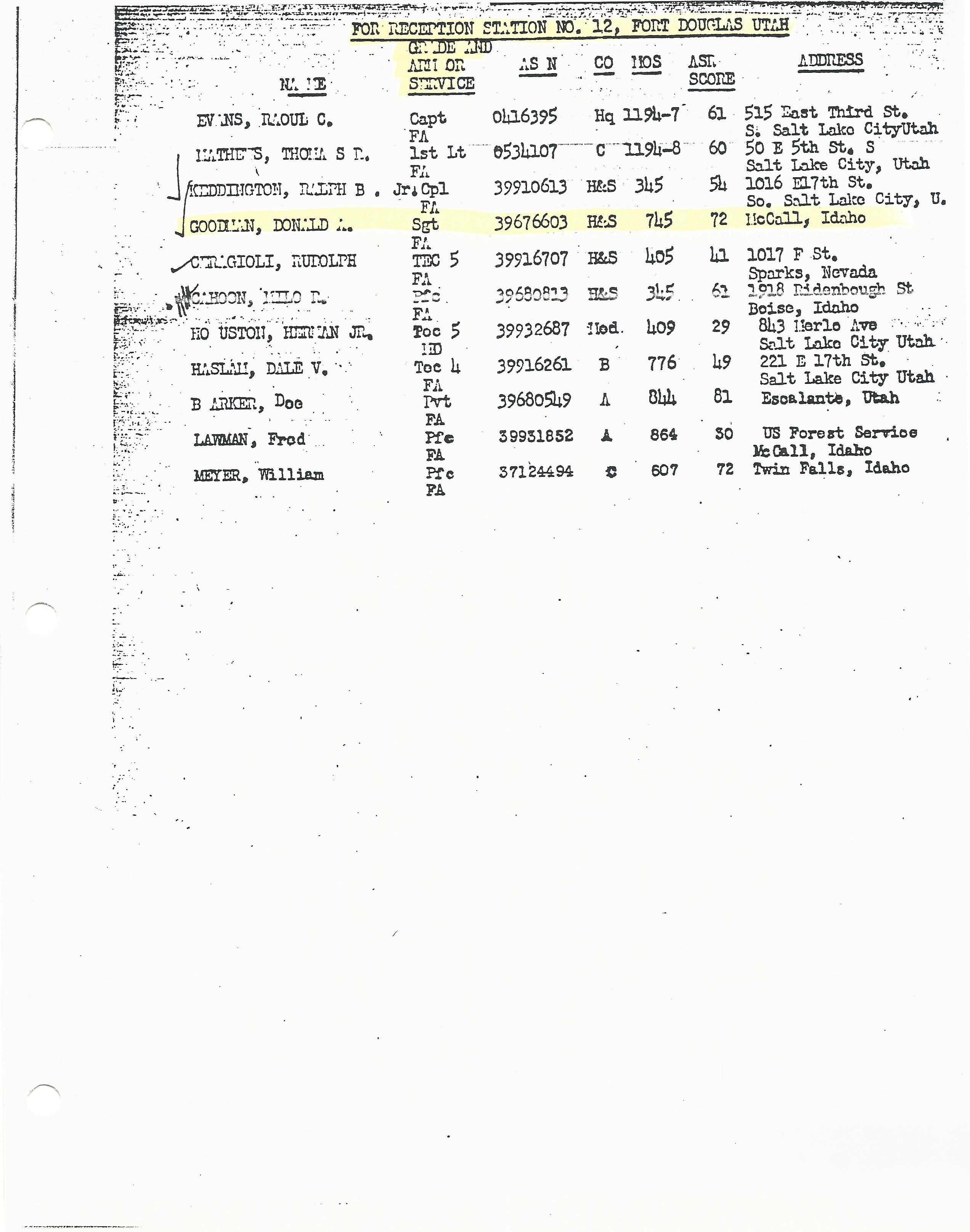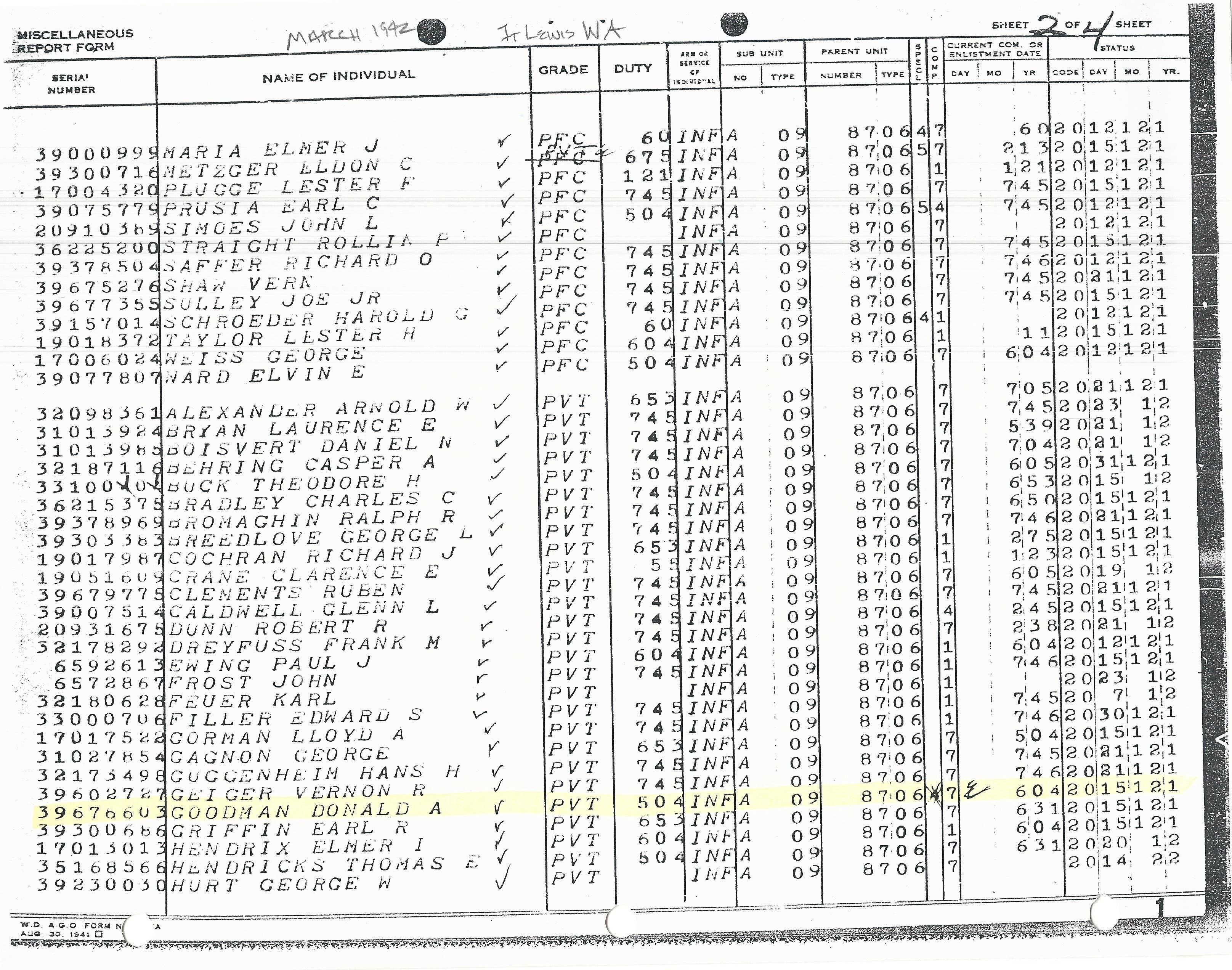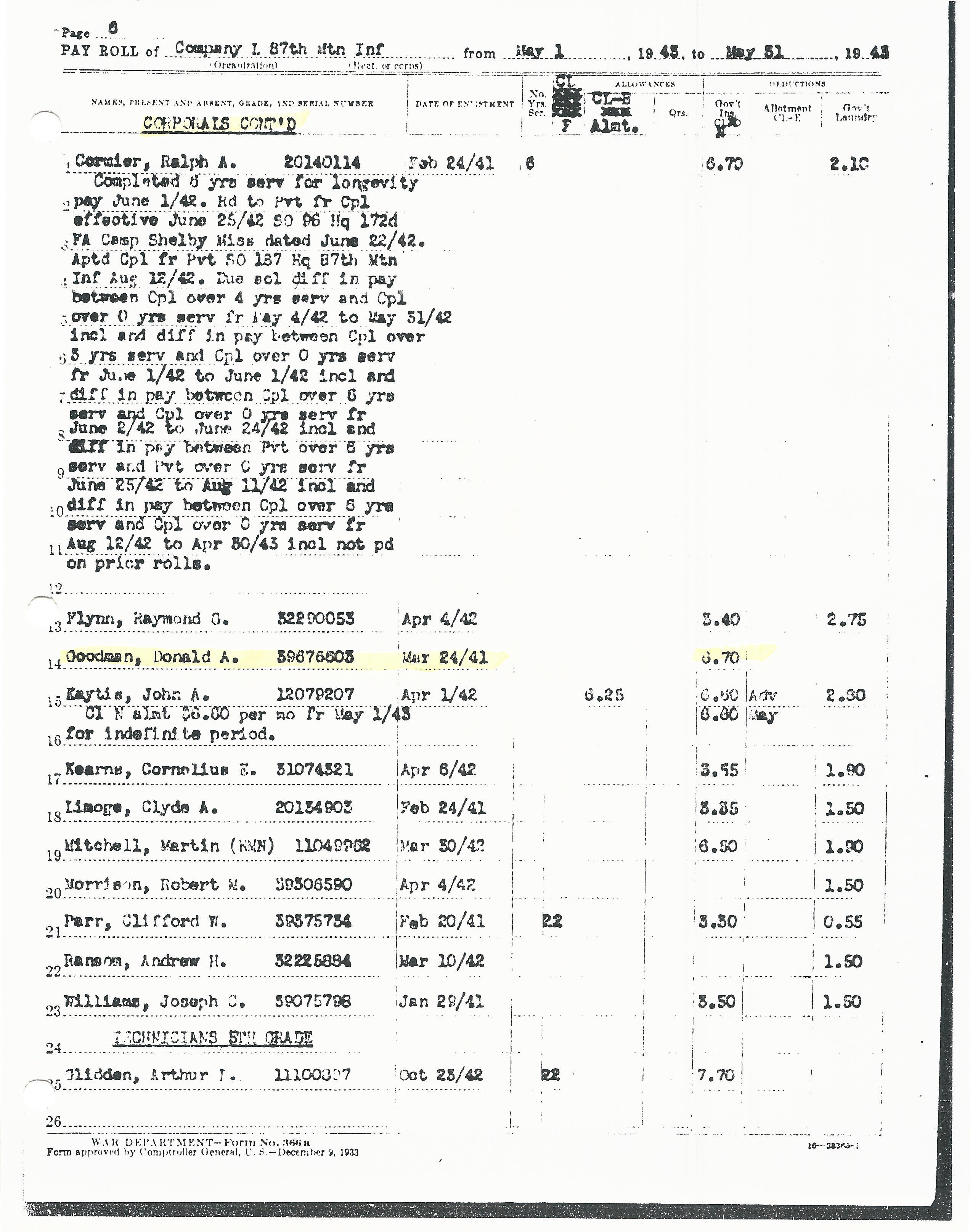 Donald enlisted on March 3, 1941, around the age of 24, in Salt Lake City, Utah. He had completed one year of college, and was not married. His civilian occupation was listed as "Athletes, sports instructors, and sports officials". The first documents we have regarding Donald are personnel rosters from January to September of 1942, when he joined what would later be designated the 10th Mountain Division. These rosters are from Fort Lewis, Washington and record that Donald was an Ammunition Handler (Duty code 504) in the 87th Infantry, Company A. The rosters also allow us to put together the timeline of his promotions. In February of 1942 he was promoted to Private First Class. The March roster lists him again as Private, but I believe this to be an error, as subsequent rosters list him as Private First Class. In June of 1942 Donald was promoted to Corporal, and his duty was changed to Squad Leader of 87th Infantry, Company E.