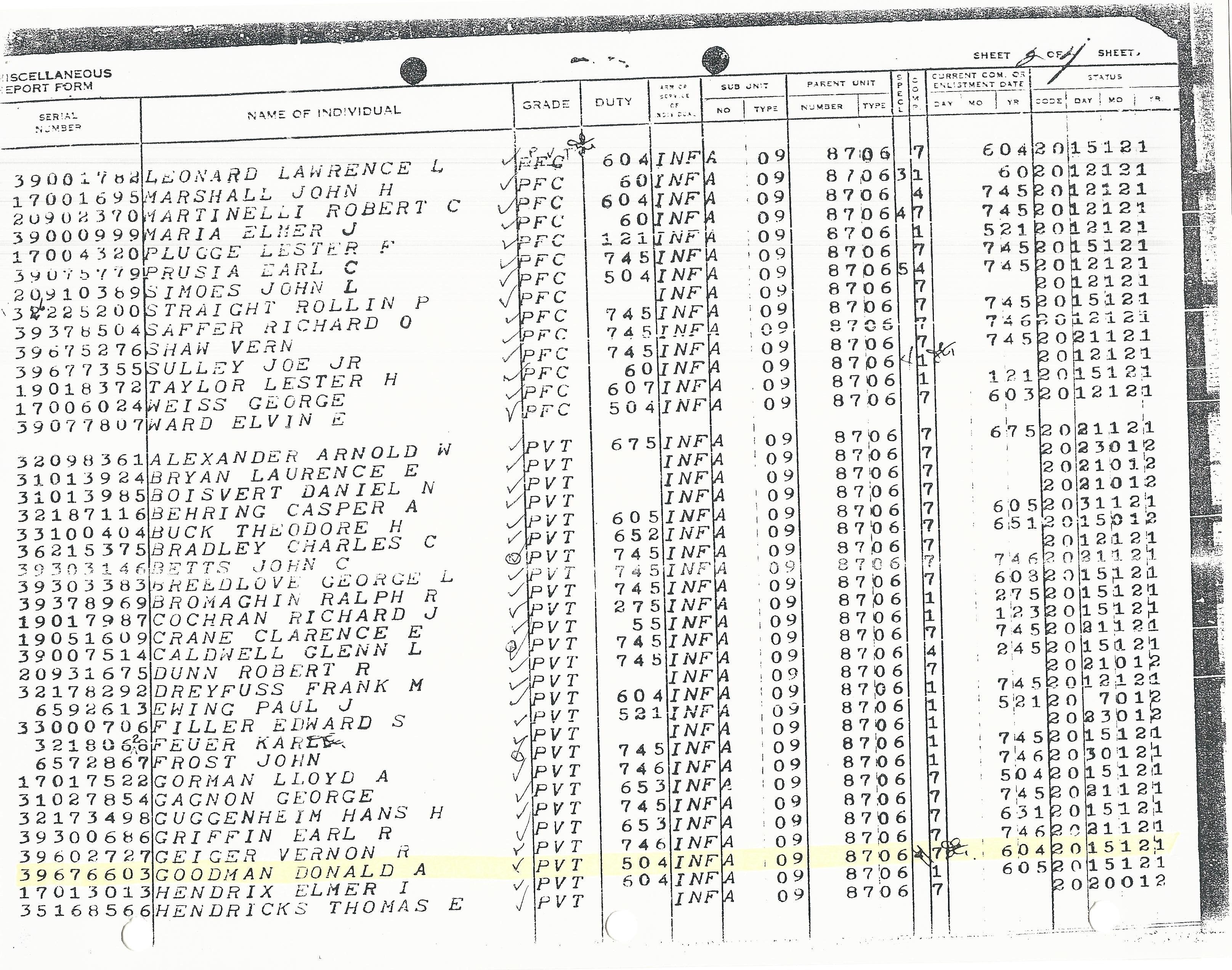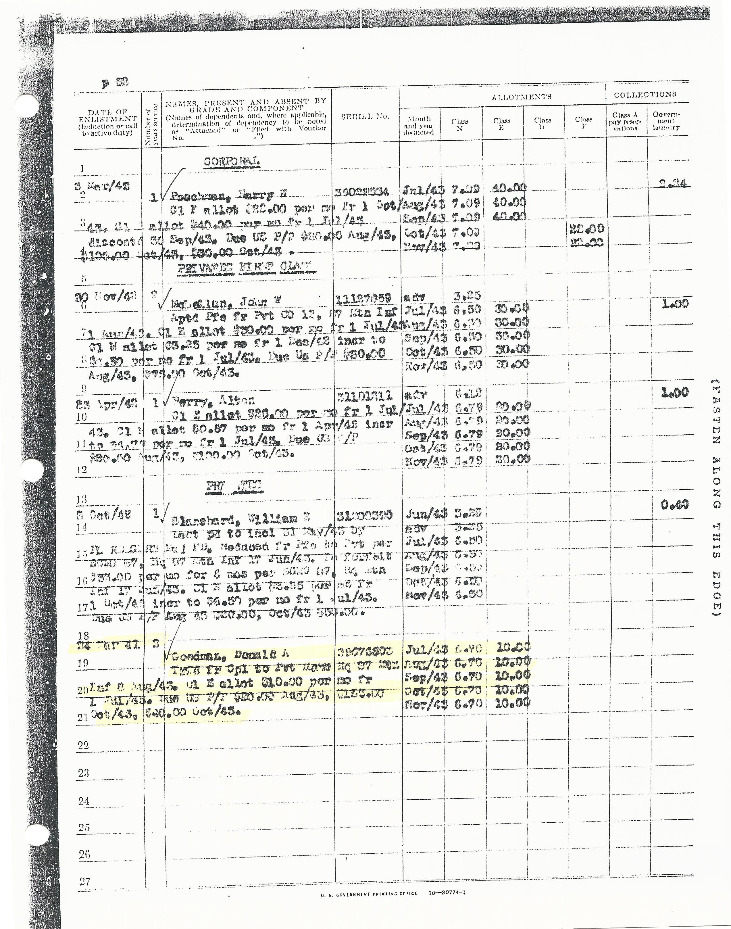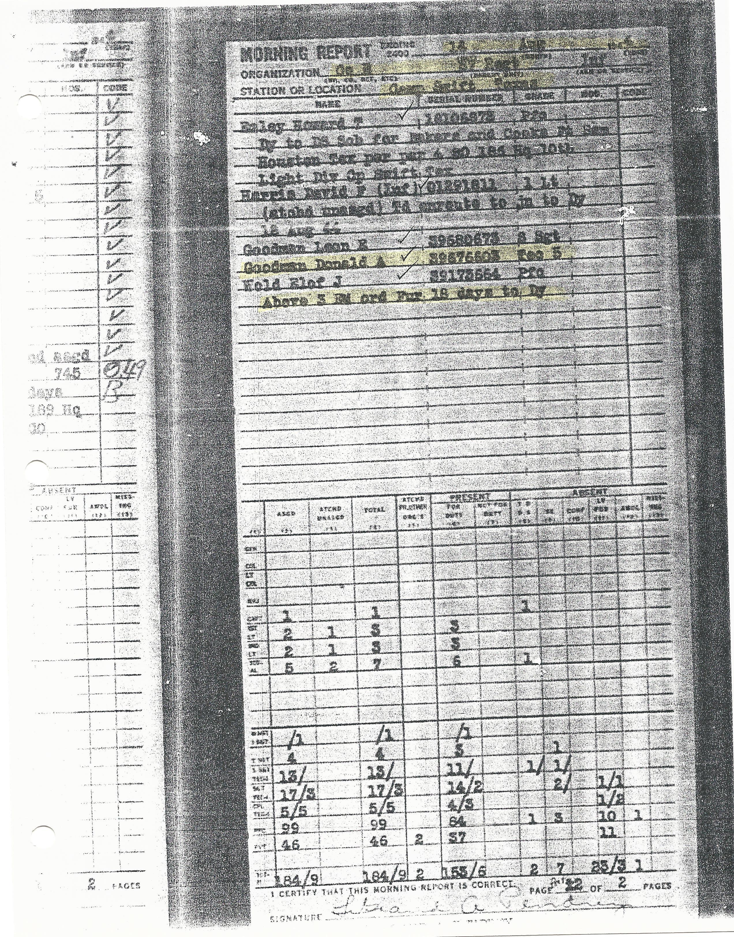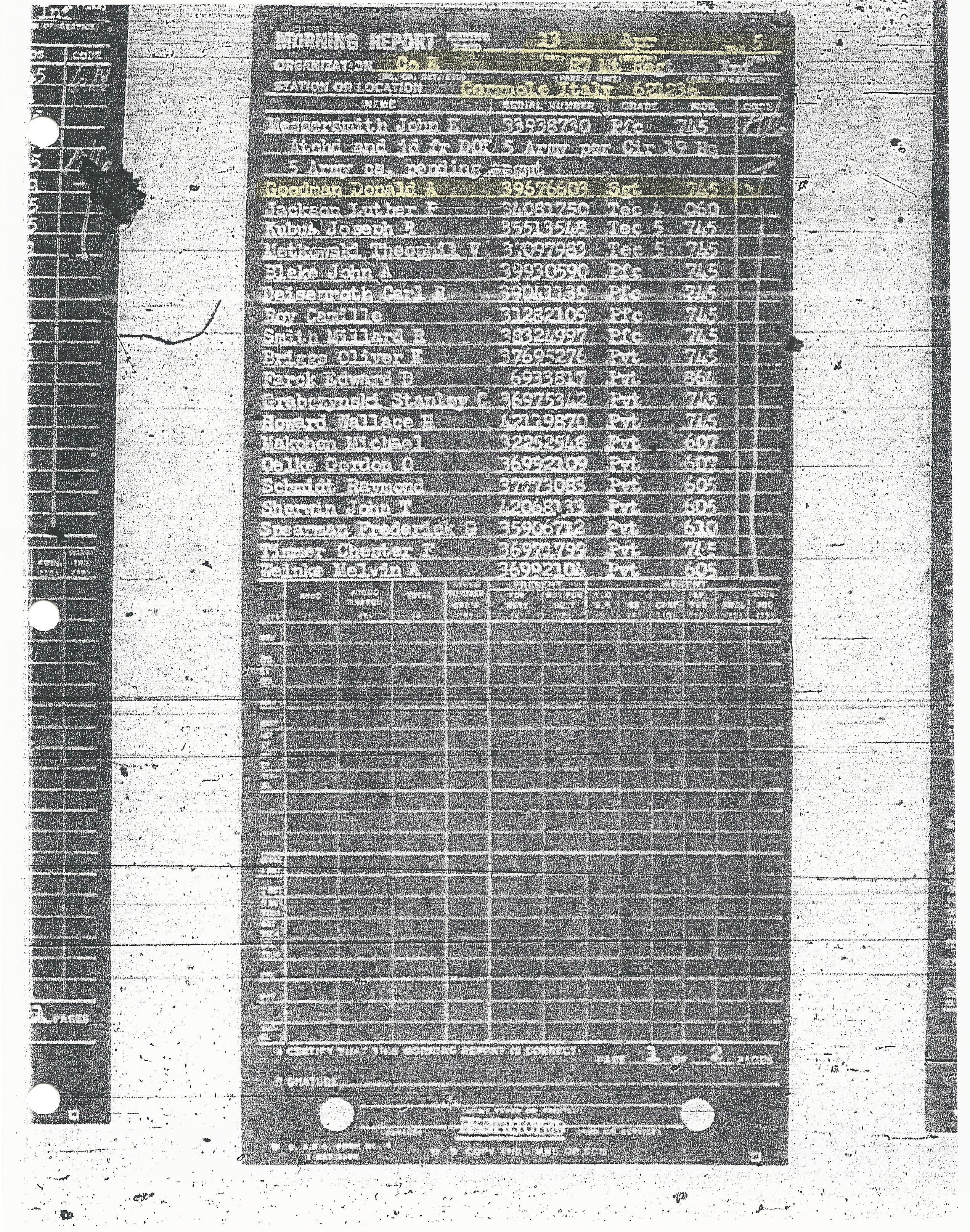 I have checked our archive records as well as enlistment records available from the National Archives at http://aad.archives.gov/aad/ and found that Donald A. Goodman was in the 87th Infantry Regiment, Companies A, E, L, and the Service Company, his highest rank being Sergeant. Unit designations can be a bit confusing, so by way of background, a World War II division like the 10th Mountain Division fielded about 14,000 men. The Division contained three infantry regiments of about 3,000 men each, three artillery battalions of approximately 1,000 men each and an engineering battalion of about 1,000 men. This totals about 13,000 men. Approximately 1,000 additional men comprised various support units. The 10th Mountain Division's infantry regiments were the 85th, 86th and 87th. Each regiment contained three battalions of about 1,000 men. These were designated 1st, 2nd, and 3th Battalion. Each battalion had four line companies plus a headquarters company, each of about 200 men. (A, B, C and D were 1st Battalion; E, F, G, and H were 2nd Battalion and I, K, L and M were 3rd).