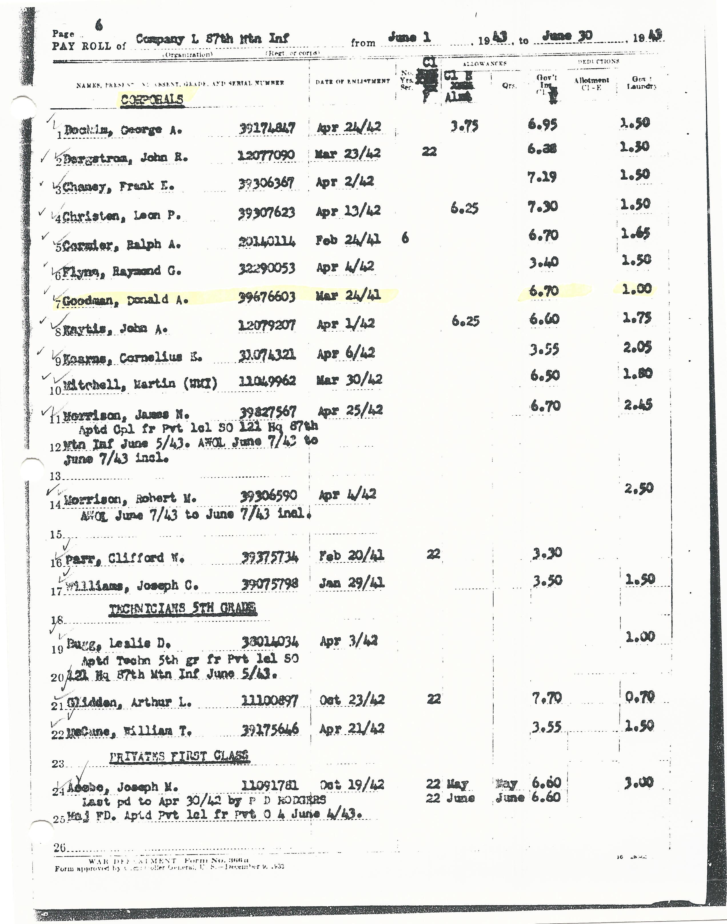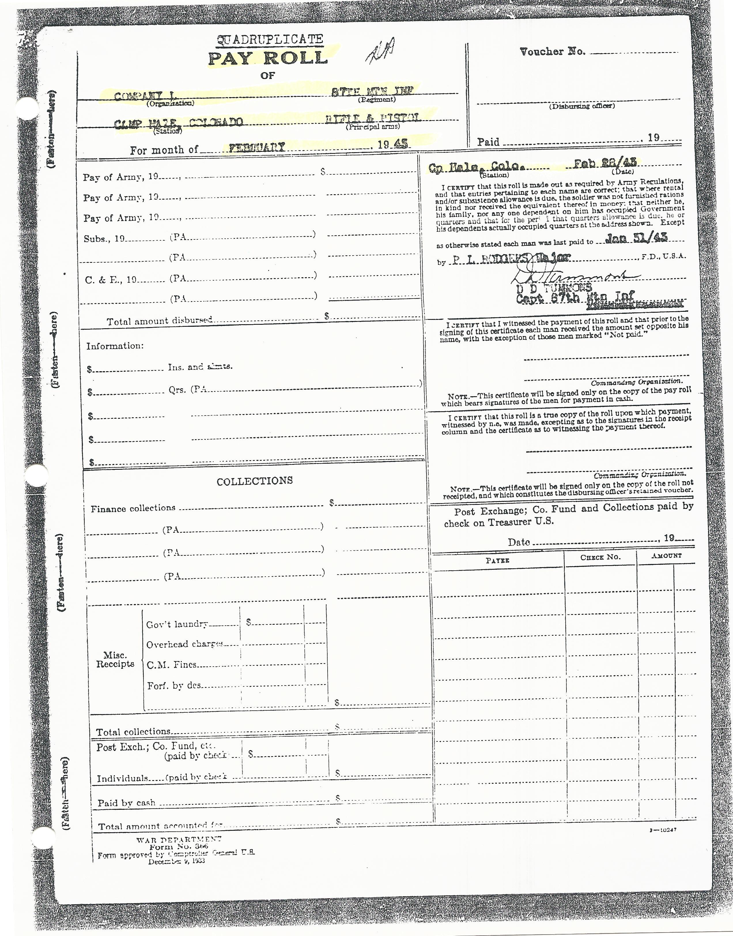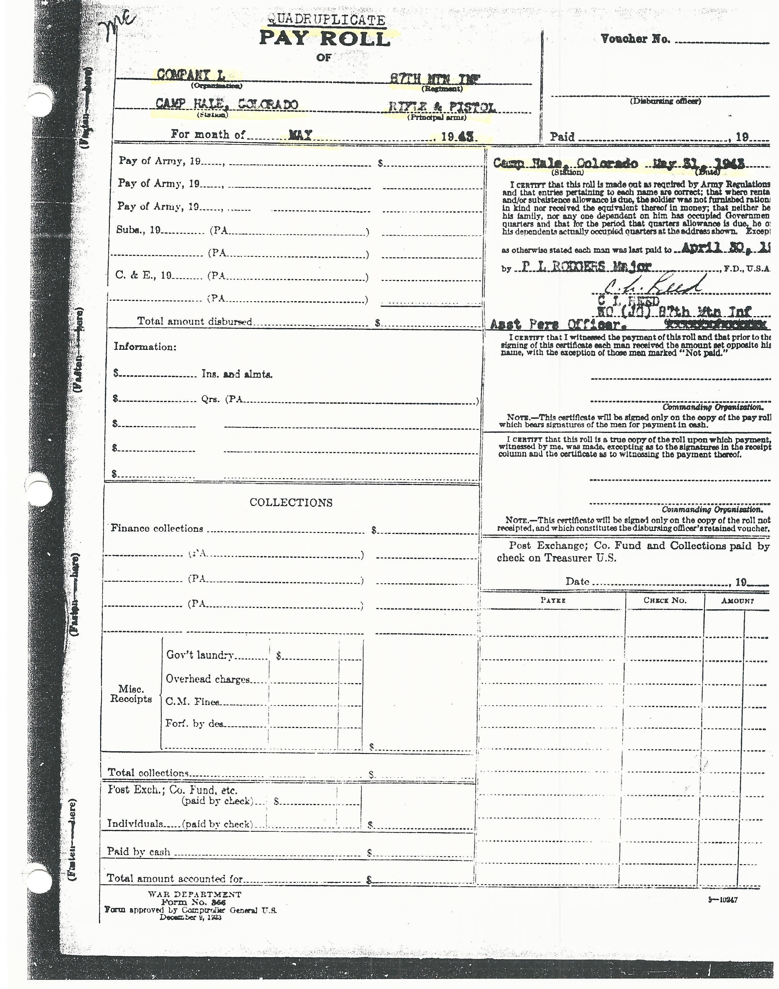 Our next documents are payroll reports from October, 1942 to December of 1943. The November, 1942 payroll shows that Donald was transferred in grade (at the same rank) from Company E to Company L, and he was in Camp Hale at that point. In June of 1943, the payroll report shows Donald is still a Corporal in Company L. On June 13, 1943 the 87th Mountain Infantry Regiment moved from Camp Hale to Fort Ord, California to train for the invasion of Kiska Island in the Aleutians. The Japanese had occupied Kiska during their attack on Midway Island in June 1942. Despite a fairly tight blockade, the Japanese were able to secretly evacuate the island prior to the invasion. Nevertheless, the 87th suffered 24 casualties. Most were due to friendly fire during the confusion and dense fog that surrounded the landings. Additional casualties resulted from various booby traps.