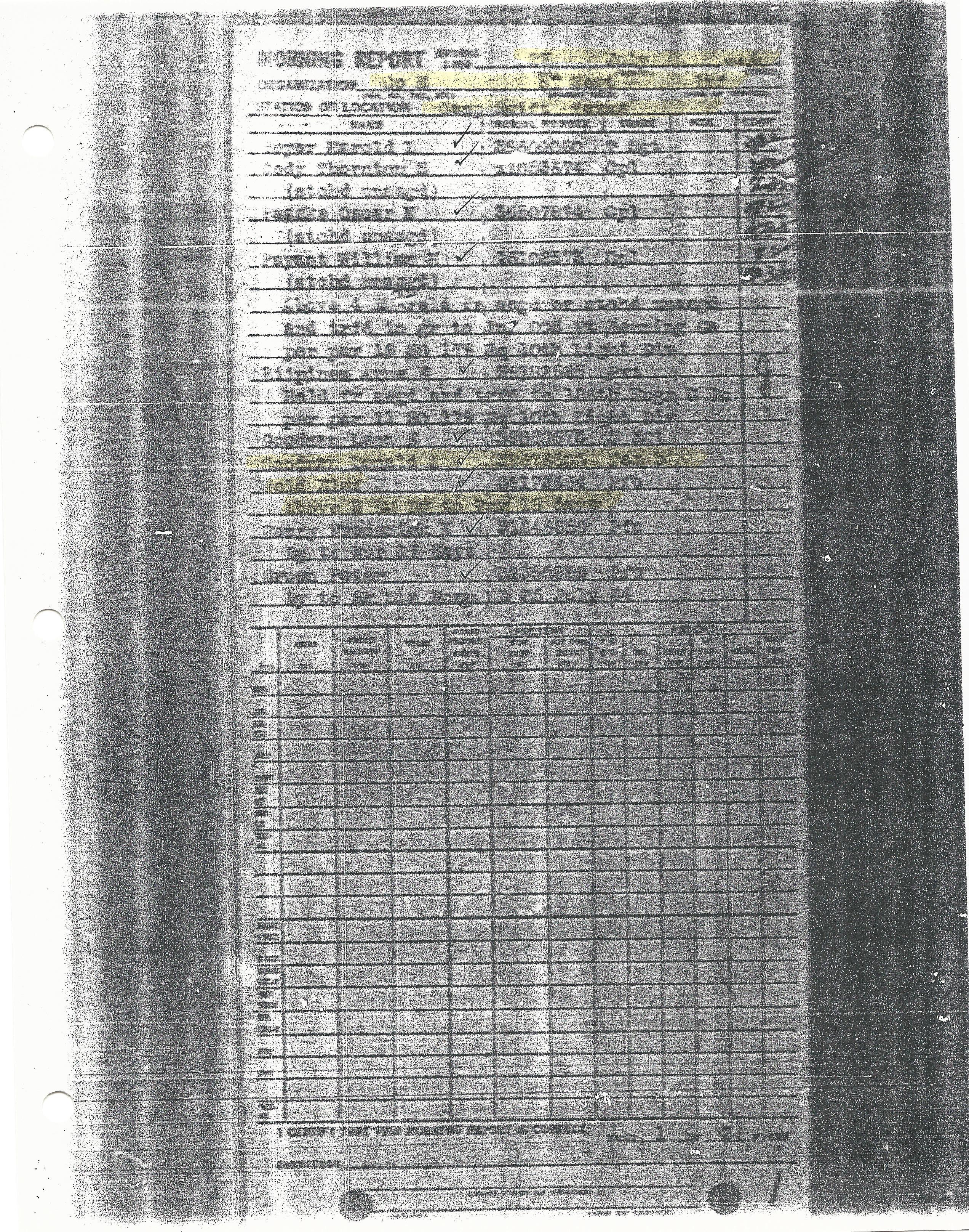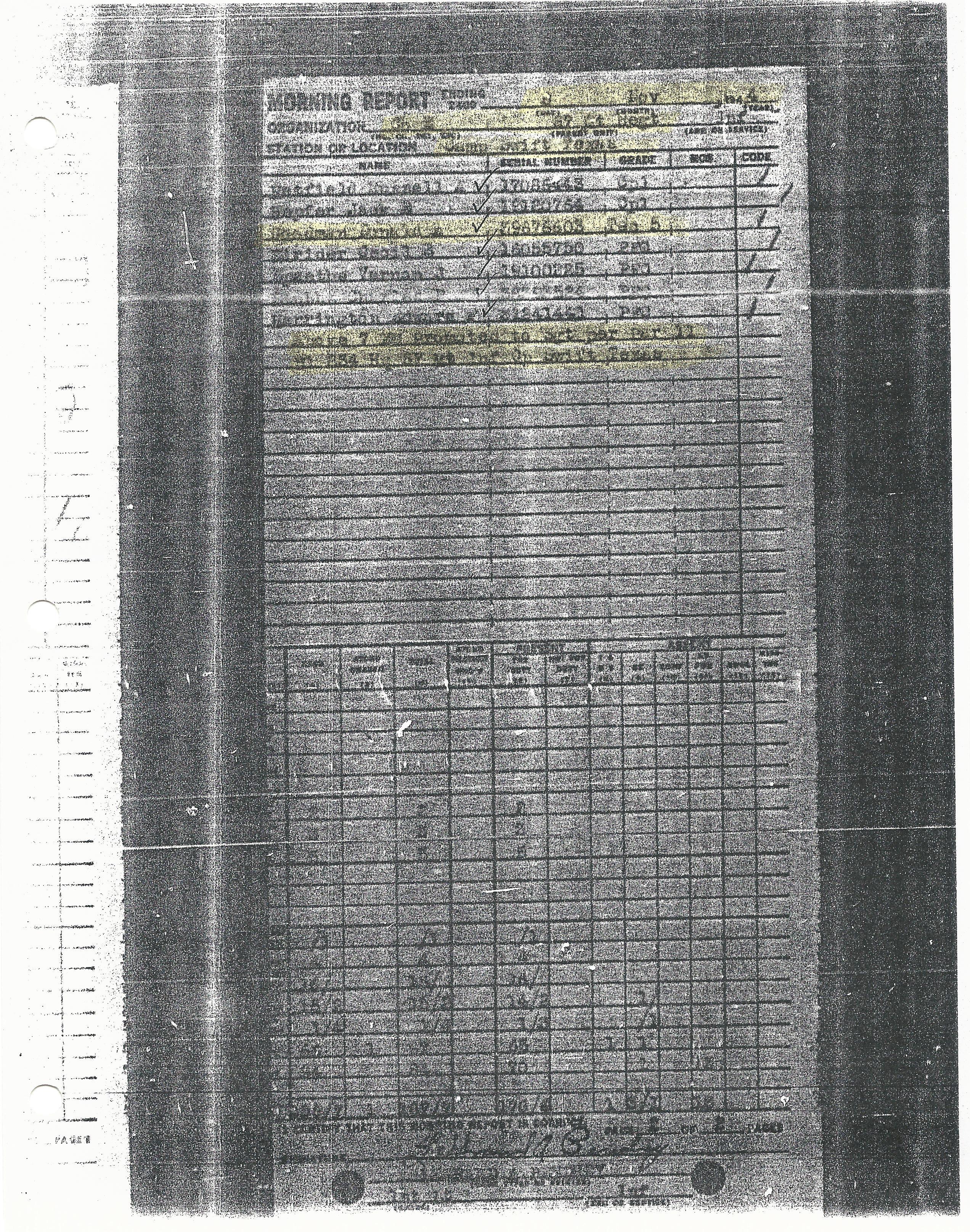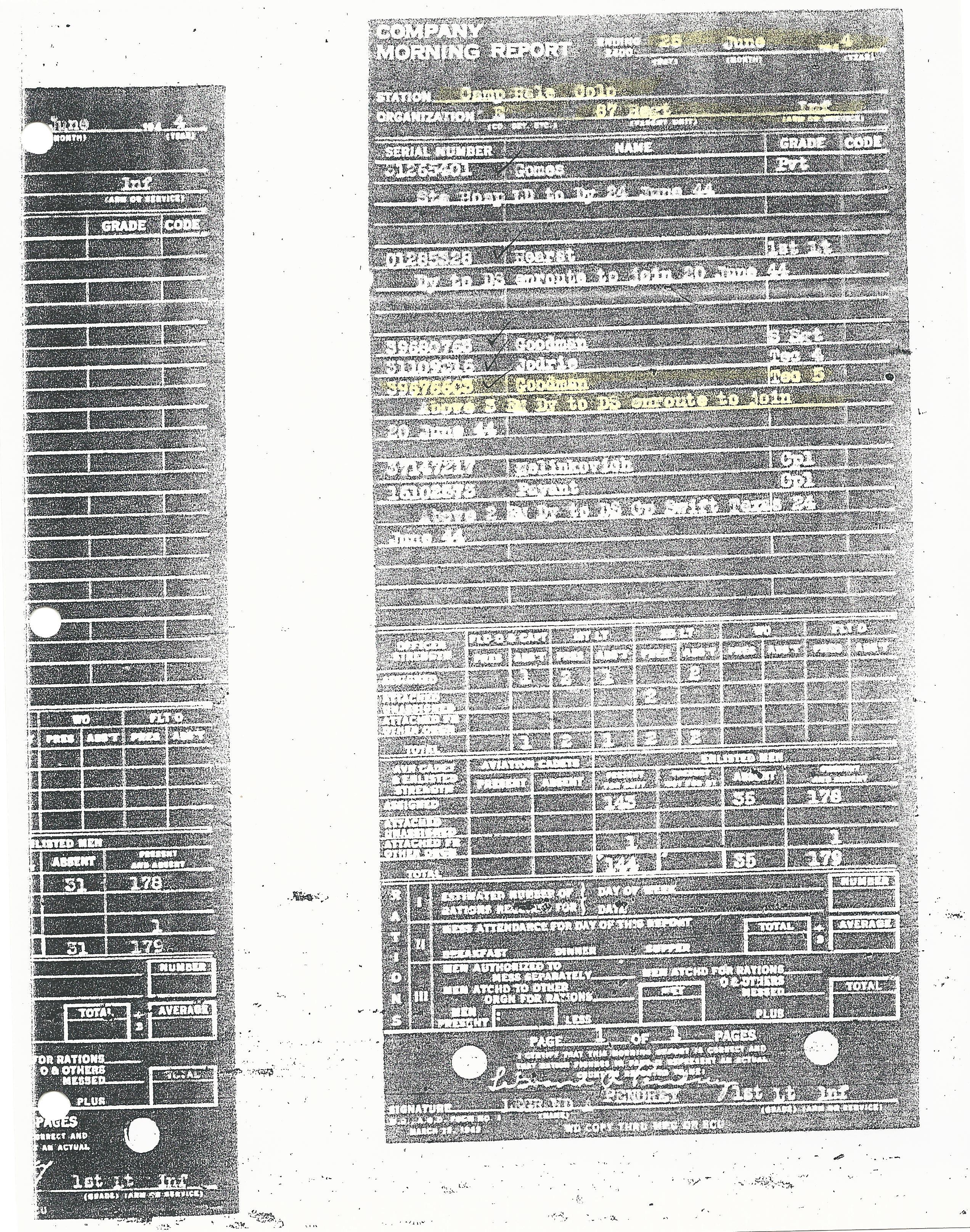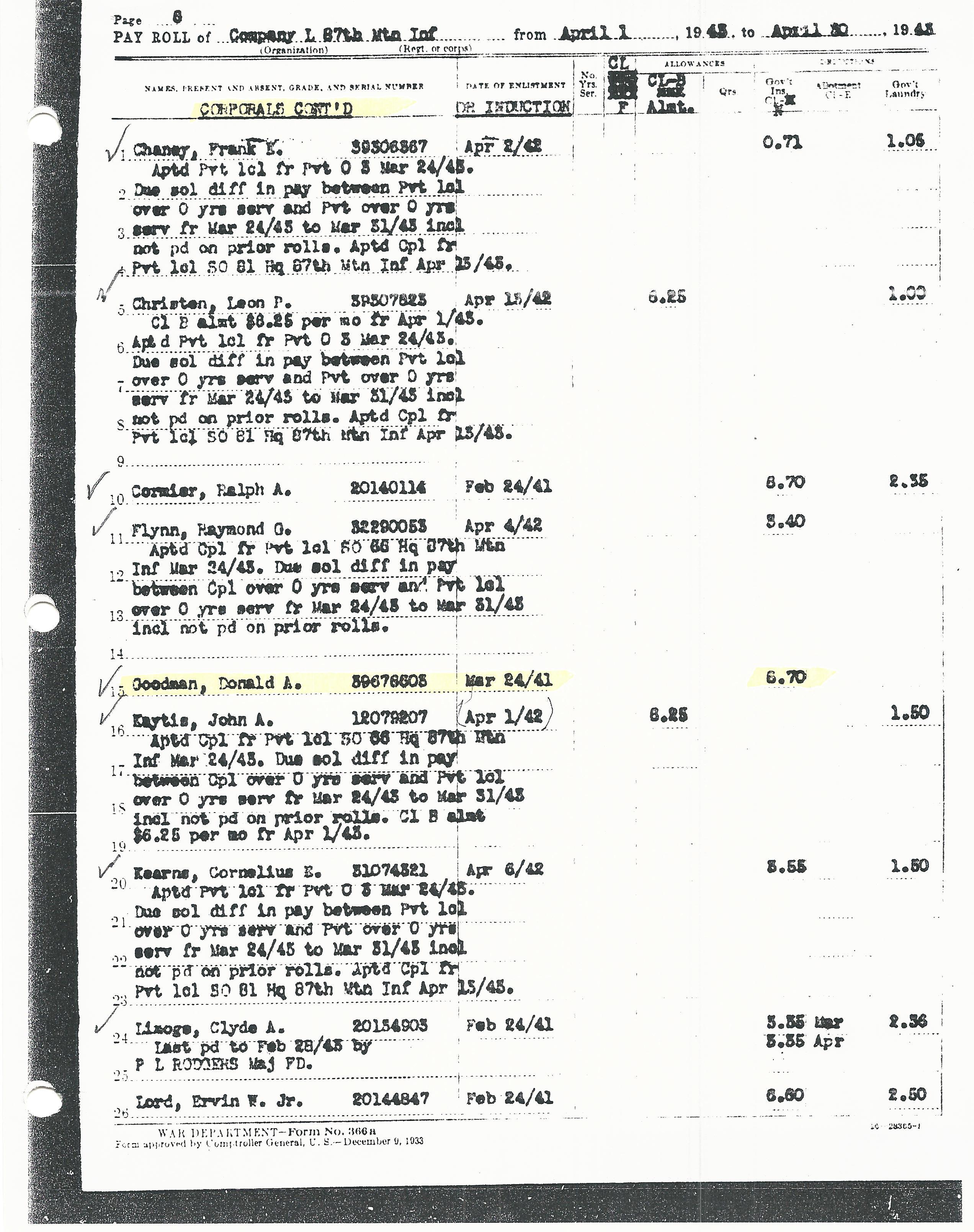 Our next documents are payroll reports from October, 1942 to December of 1943. The November, 1942 payroll shows that Donald was transferred in grade (at the same rank) from Company E to Company L, and he was in Camp Hale at that point. In June of 1943, the payroll report shows Donald is still a Corporal in Company L. On June 13, 1943 the 87th Mountain Infantry Regiment moved from Camp Hale to Fort Ord, California to train for the invasion of Kiska Island in the Aleutians. The Japanese had occupied Kiska during their attack on Midway Island in June 1942. Despite a fairly tight blockade, the Japanese were able to secretly evacuate the island prior to the invasion. Nevertheless, the 87th suffered 24 casualties. Most were due to friendly fire during the confusion and dense fog that surrounded the landings. Additional casualties resulted from various booby traps.