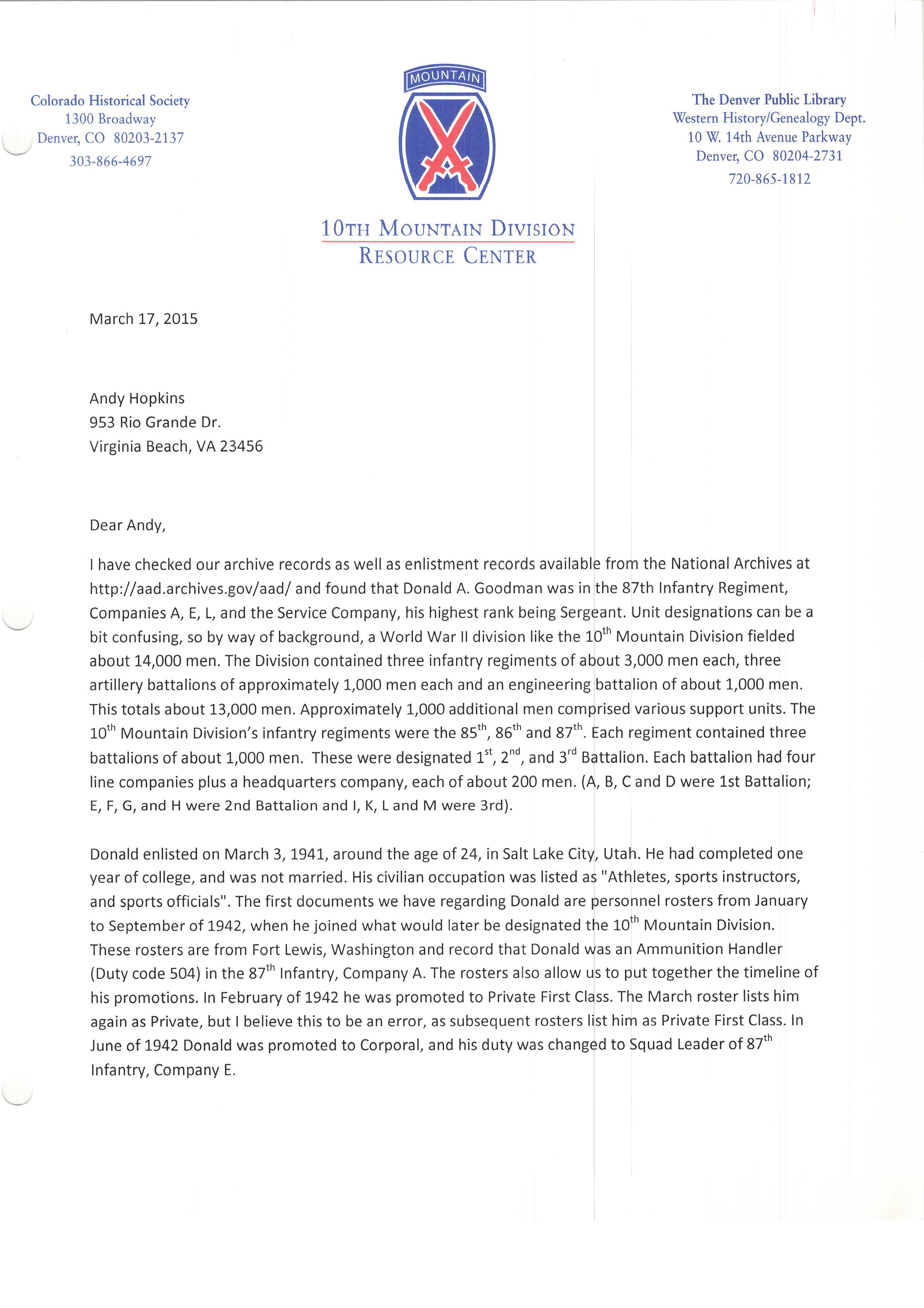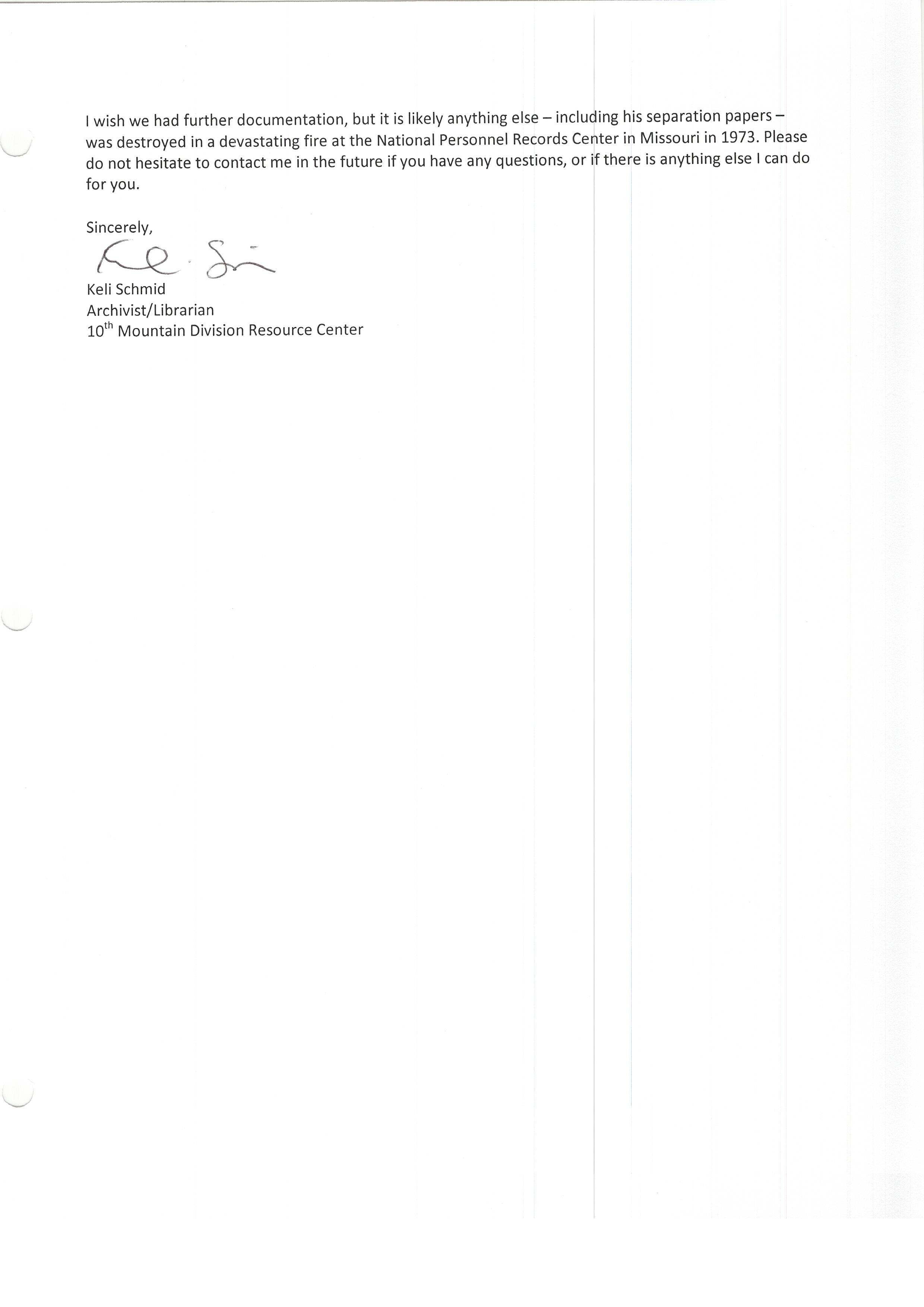 His service was documented in a 2015 letter from the Colorado Historical Society 10TH MOUNTAIN DIVISION RESOURCE CENTER. It reads: