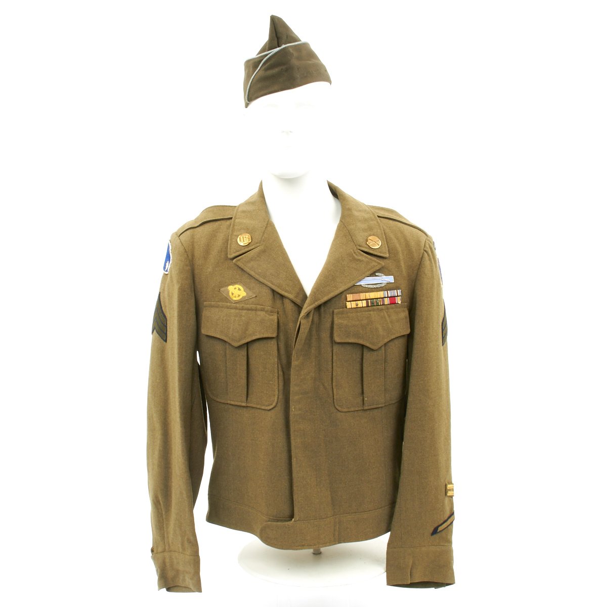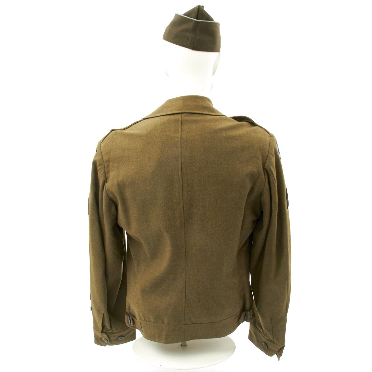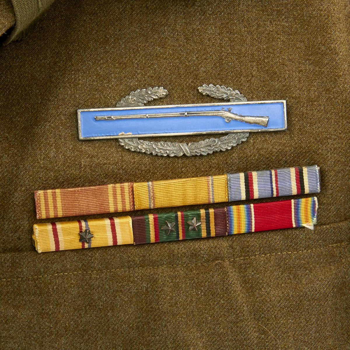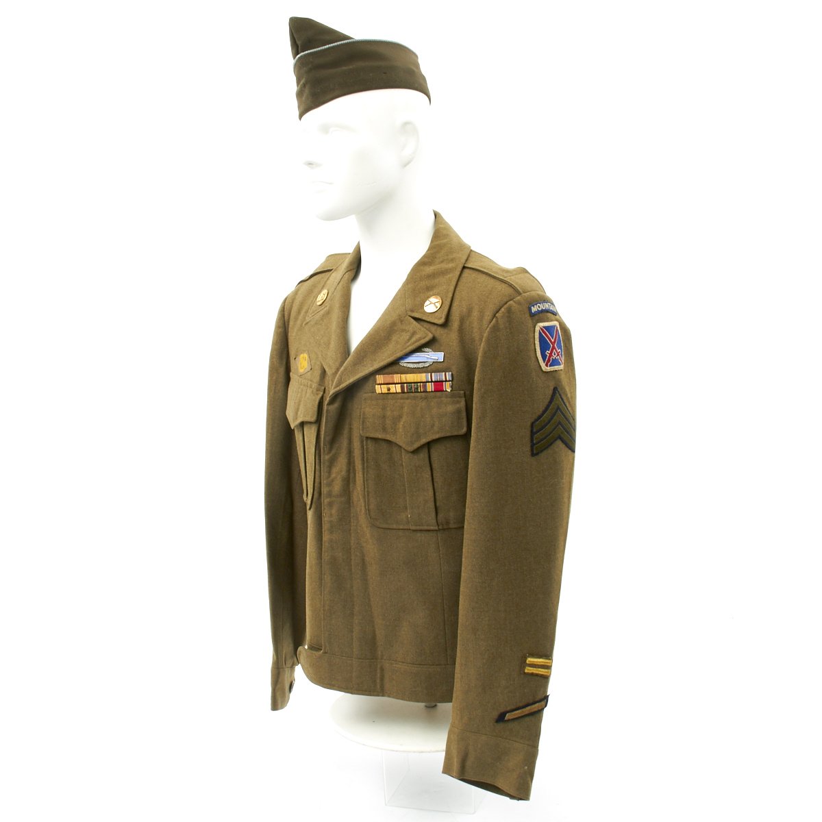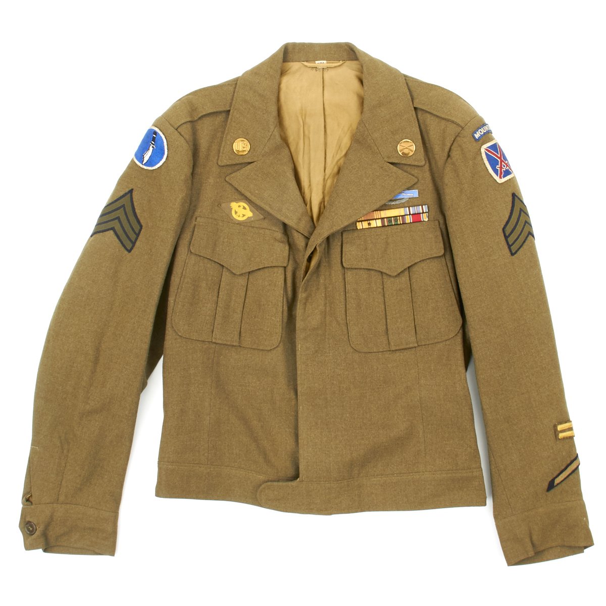 - Ike Jacket with 10th Mountain division patch on left shoulder, ultra rare Army Kiska Task Force Shoulder Patch on left shoulder. Medal ribbons: Good Conduct, American Defense, American Campaign, Asiatic–Pacific Campaign Medal with one battle star (Kiska), European-African-Middle Eastern Campaign Medal with two battle stars (Italy) and WWII Victory Medal. Corporal chevrons, Ruptured Duck patch, 2 overseas service bars on left sleeve indicating 12+ months of overseas service. The jacket is named with laundry number G6603 inside neck. Jacket is a size 42L.