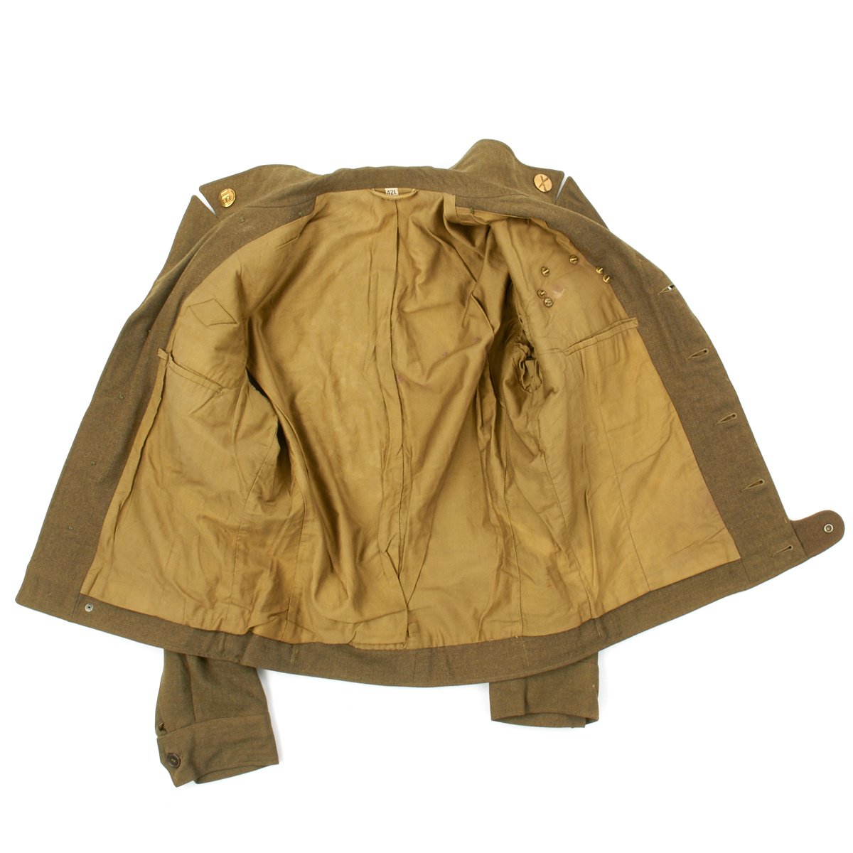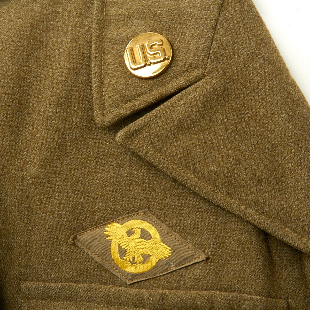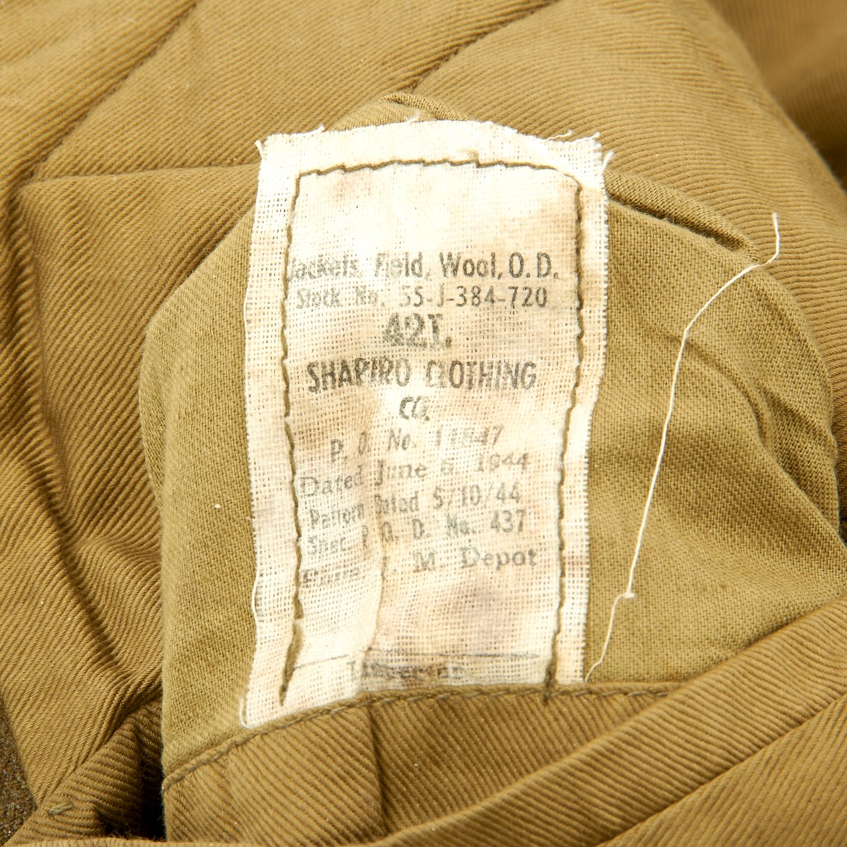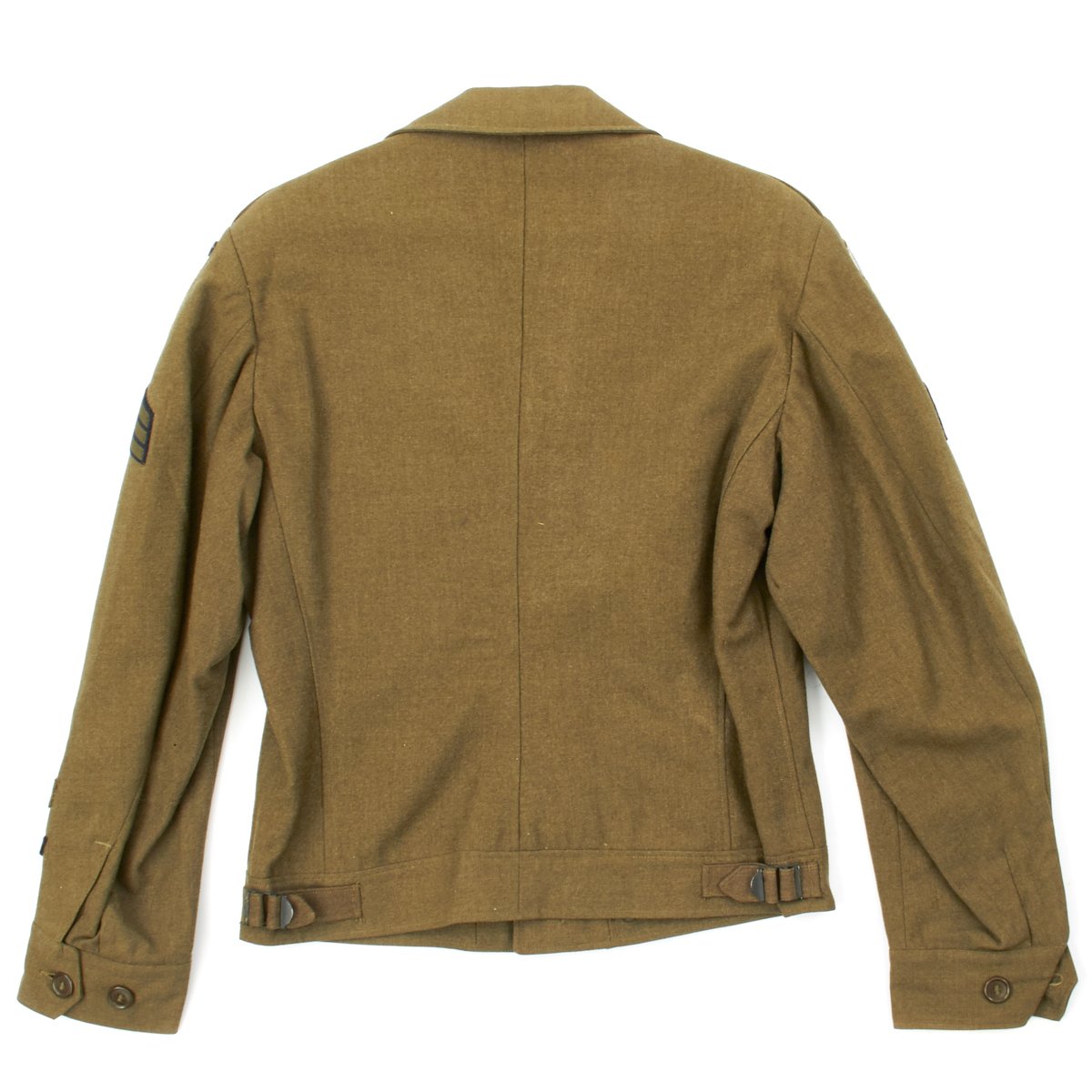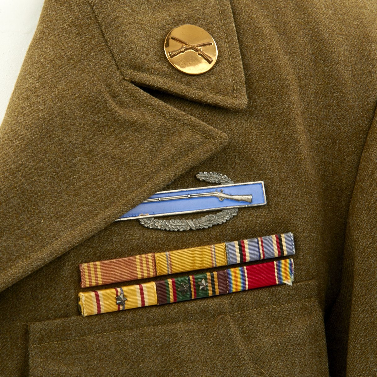- Ike Jacket with 10th Mountain division patch on left shoulder, ultra rare Army Kiska Task Force Shoulder Patch on left shoulder. Medal ribbons: Good Conduct, American Defense, American Campaign, Asiatic–Pacific Campaign Medal with one battle star (Kiska), European-African-Middle Eastern Campaign Medal with two battle stars (Italy) and WWII Victory Medal. Corporal chevrons, Ruptured Duck patch, 2 overseas service bars on left sleeve indicating 12+ months of overseas service. The jacket is named with laundry number G6603 inside neck. Jacket is a size 42L.