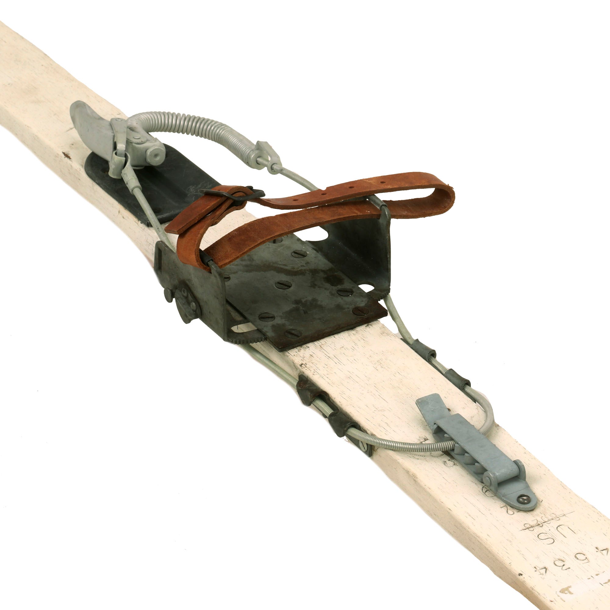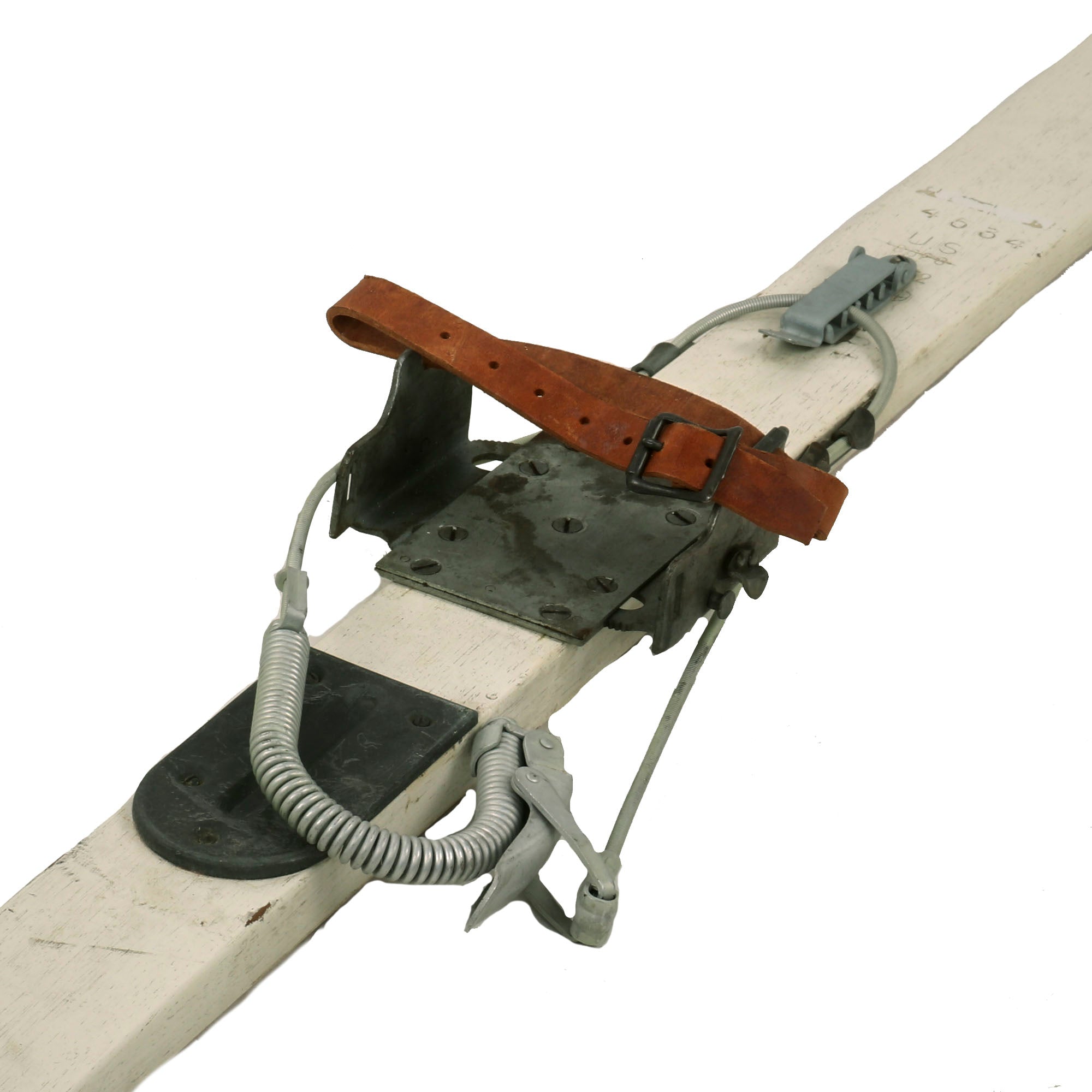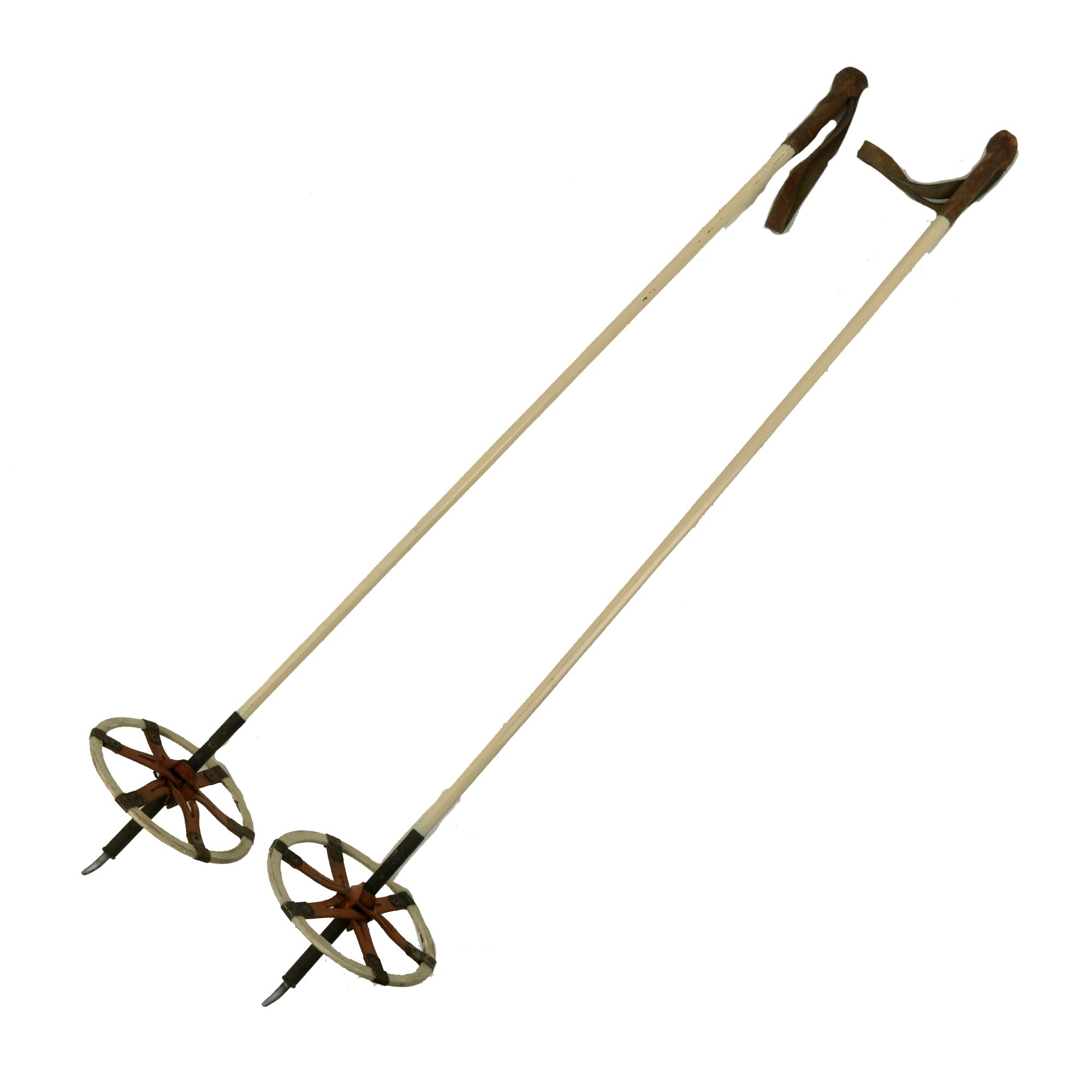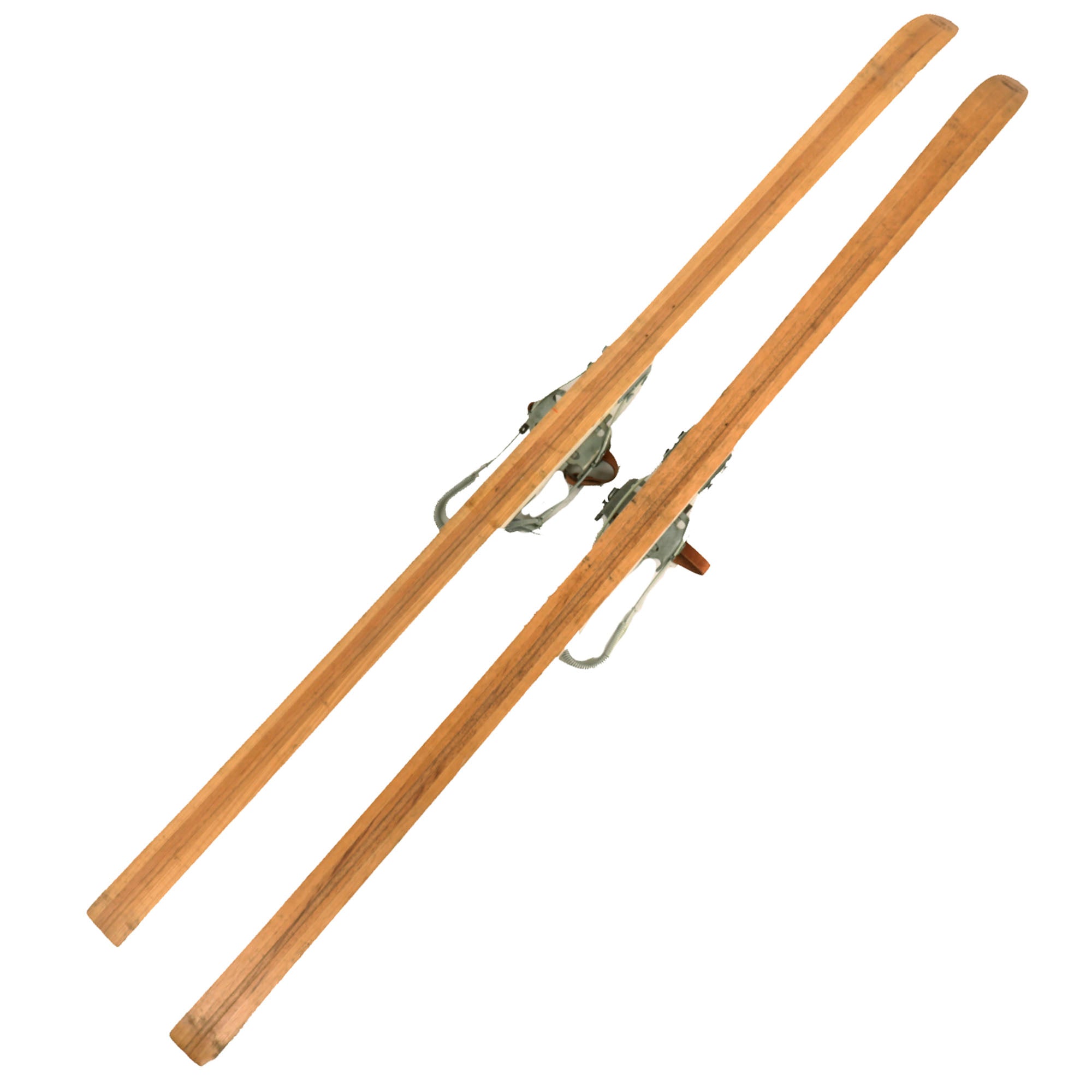 - 10th Mountain Division Skis and Poles by C.A. Lund With Accessories: Fantastic example of 10th Mountain Division ski equipment. A pair of wood skis with metal edges manufactured by the CA Lund of Laconia, New Hampshire for WWII. The skis measure approximately 82 inches in overall length. They are include very rare white cotton ski tip covers, wood ski stays and a matching set of bamboo ski poles with leather woven baskets.