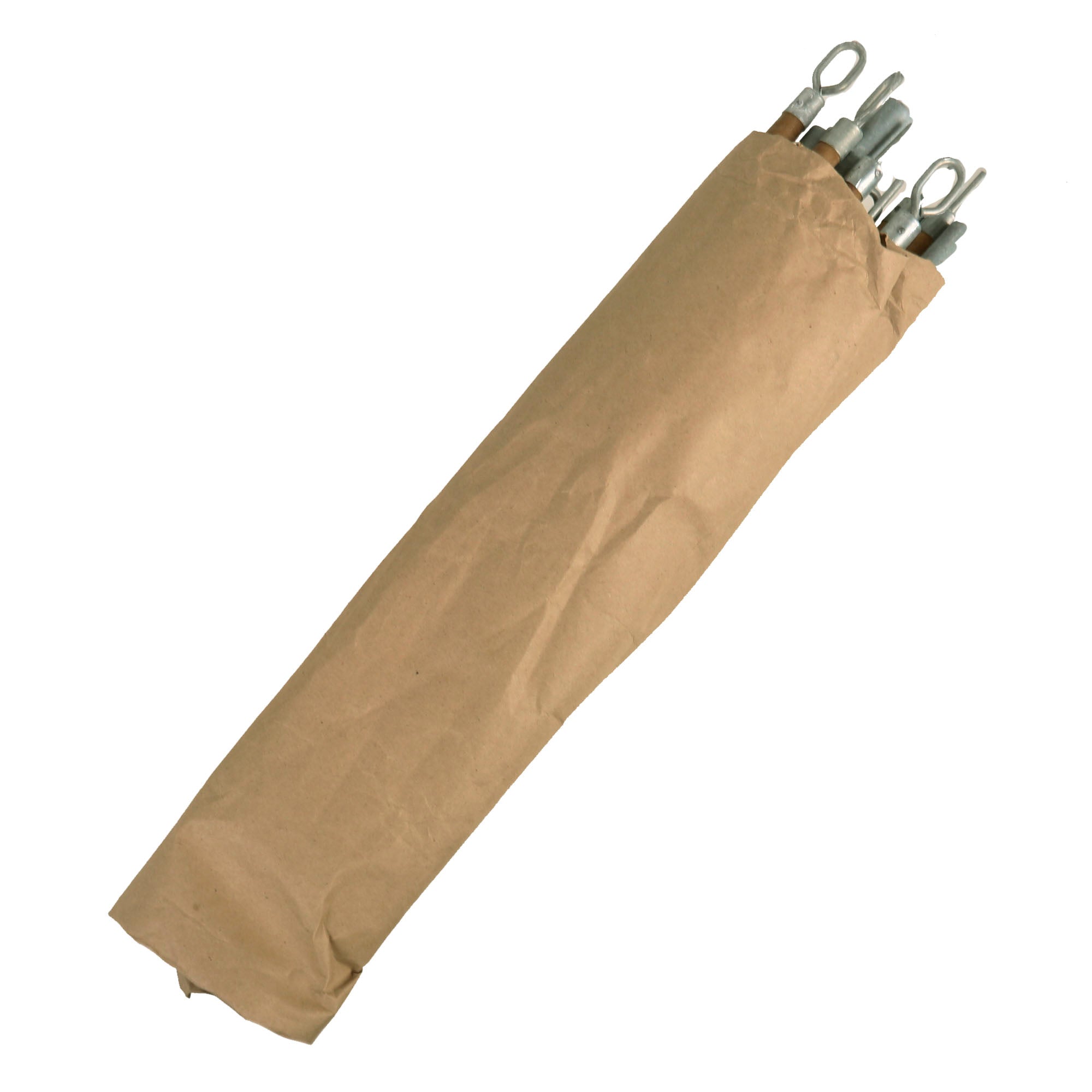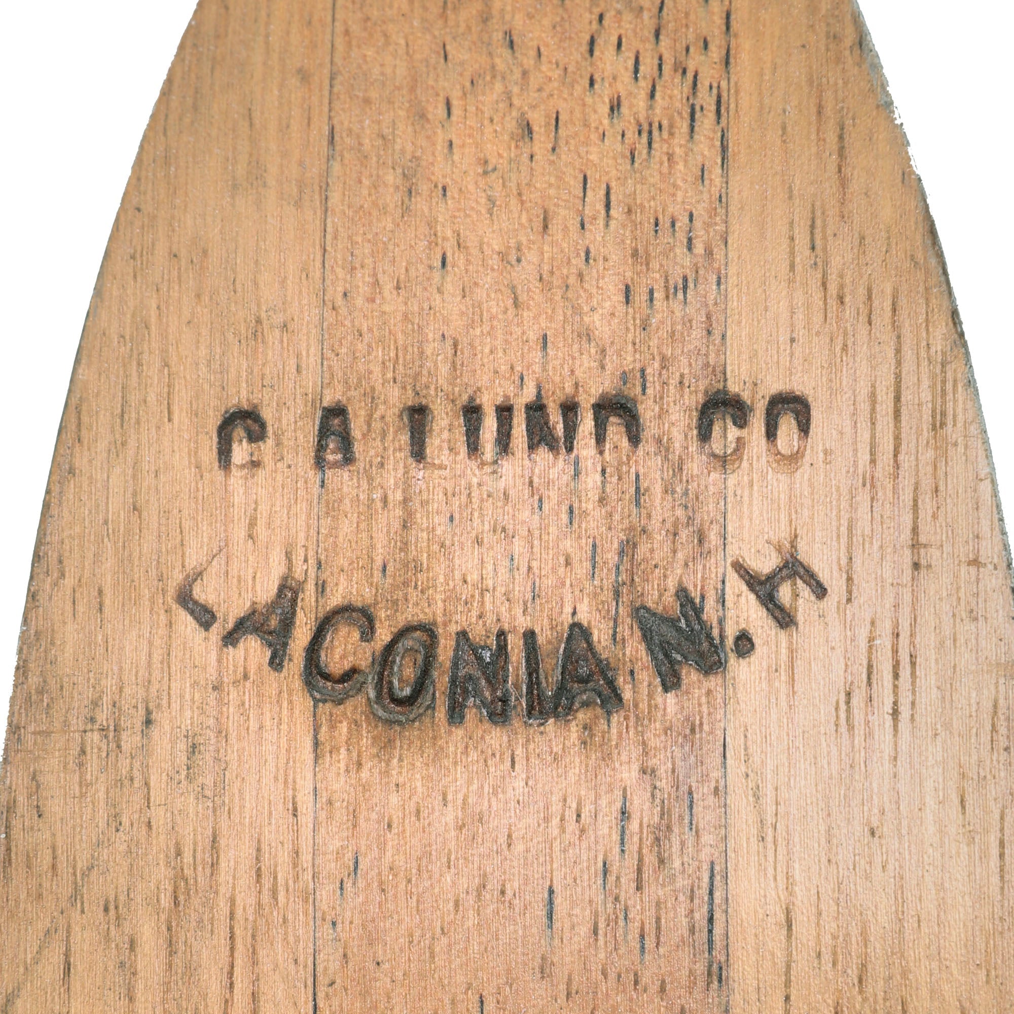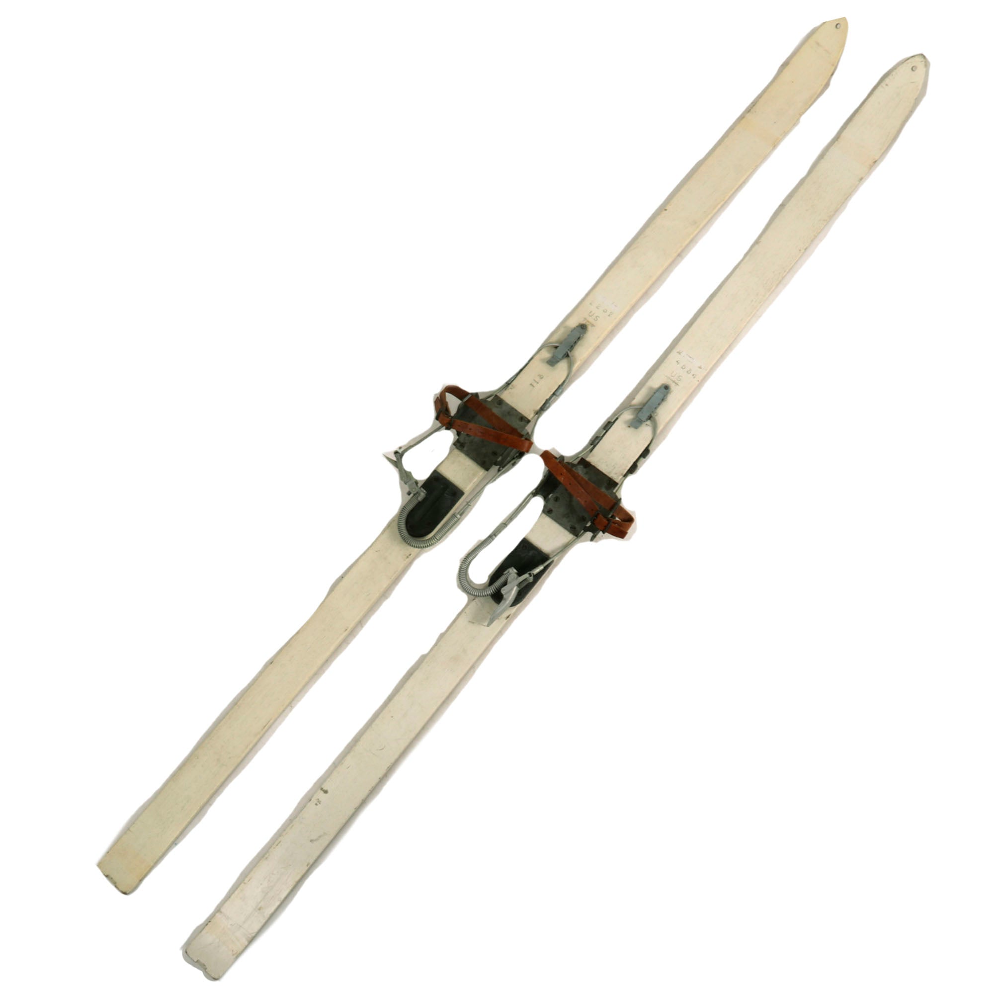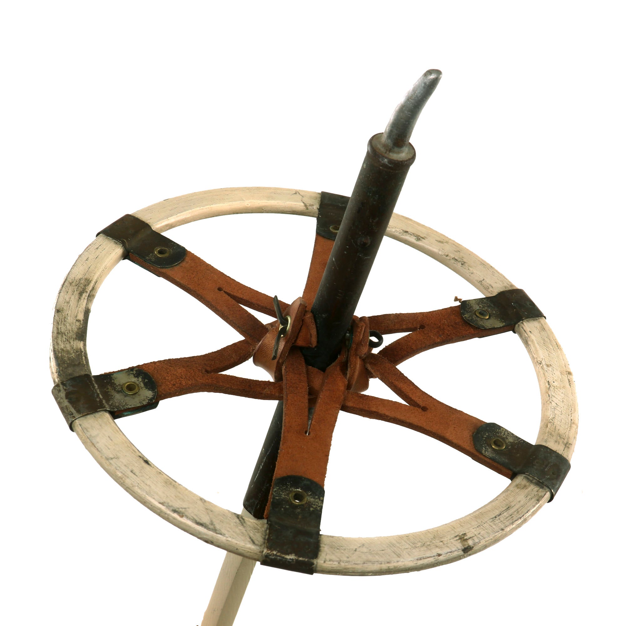 - 10th Mountain Division Skis and Poles by C.A. Lund With Accessories: Fantastic example of 10th Mountain Division ski equipment. A pair of wood skis with metal edges manufactured by the CA Lund of Laconia, New Hampshire for WWII. The skis measure approximately 82 inches in overall length. They are include very rare white cotton ski tip covers, wood ski stays and a matching set of bamboo ski poles with leather woven baskets.