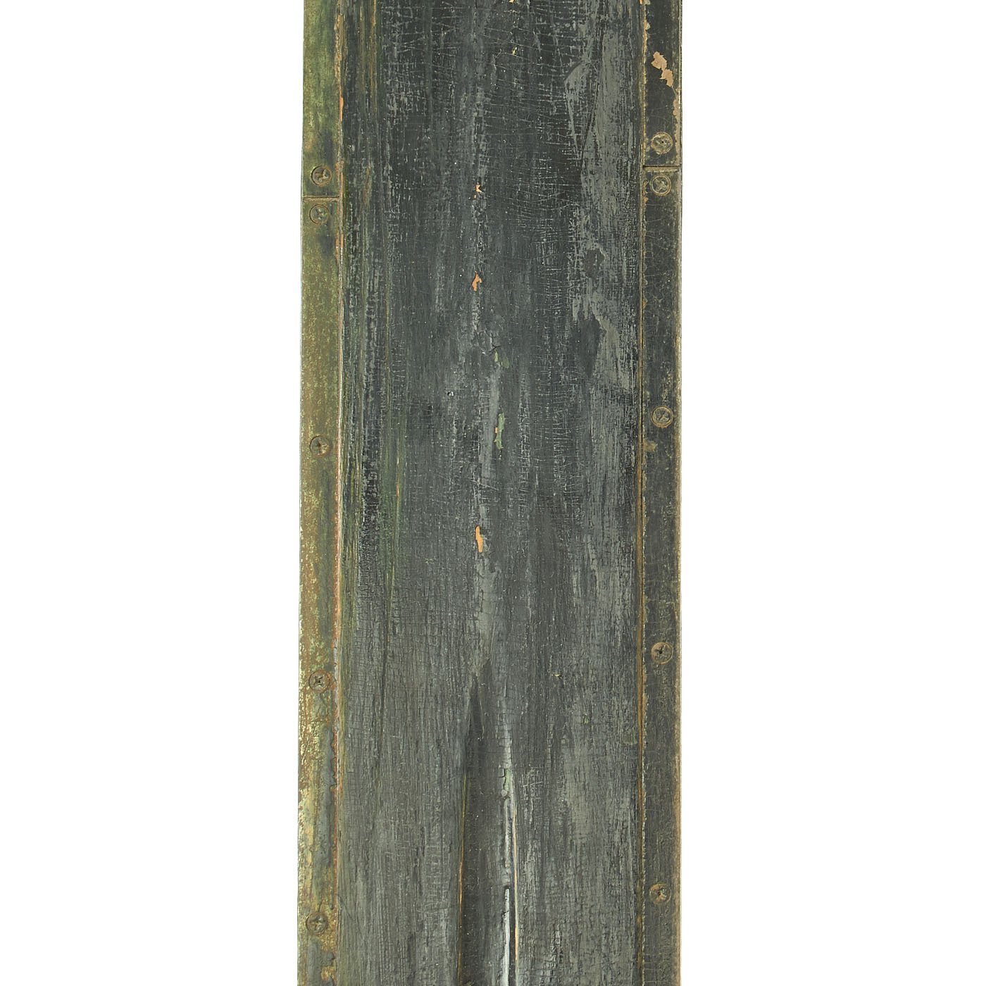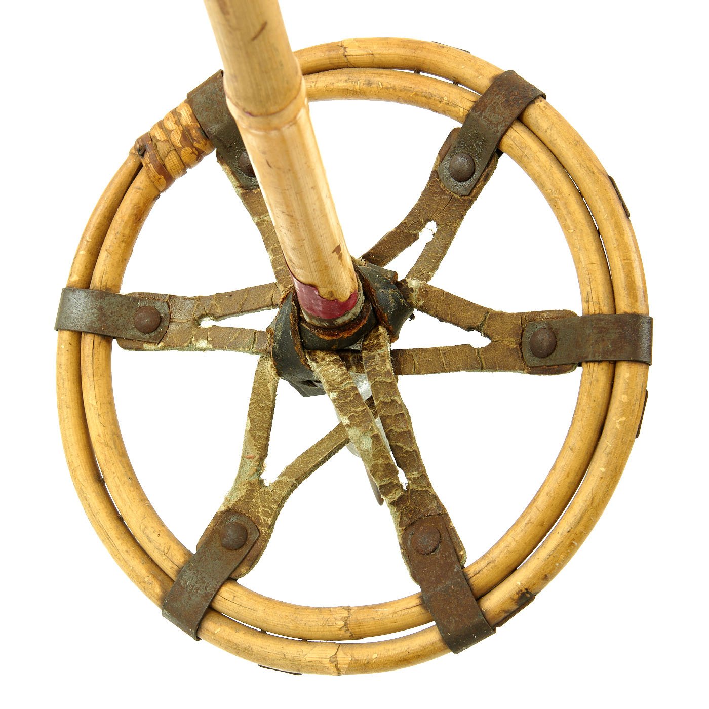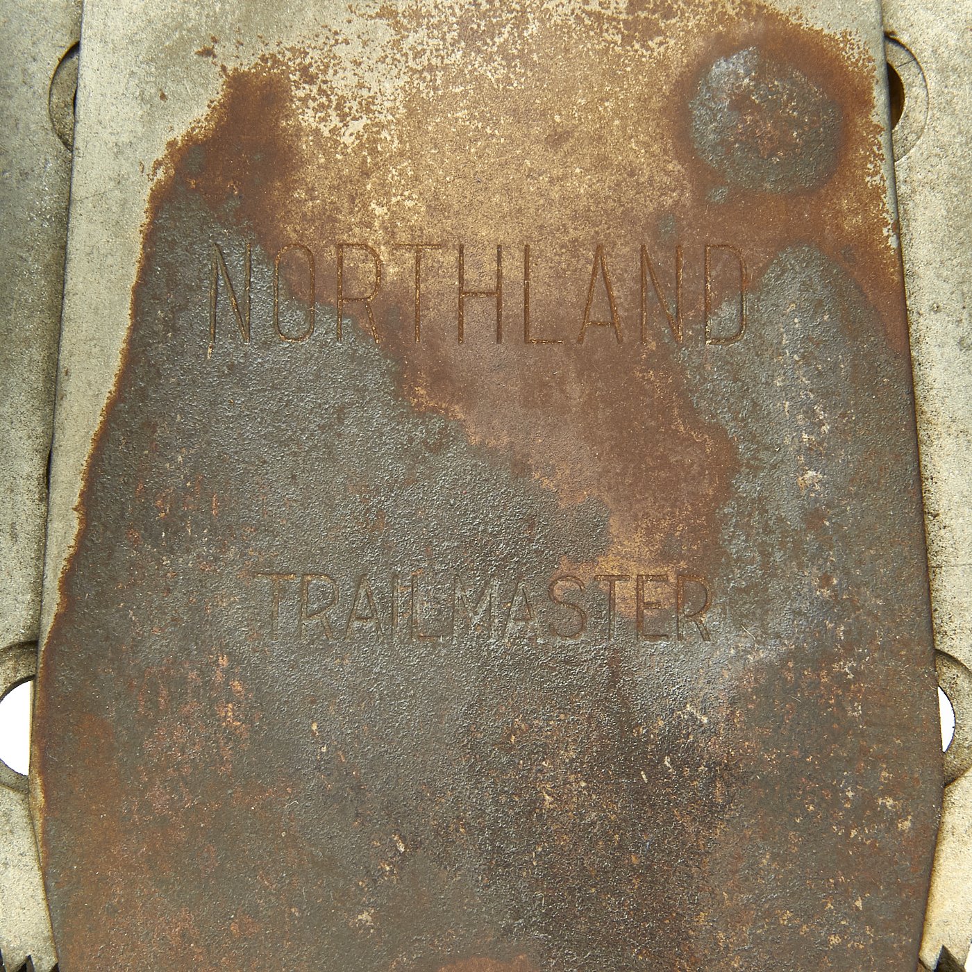 The steel spring bindings are marked NORTHLAND TRAILMASTER on the toe catch and the foot plate. The base of the skis are black and have been waxed at some point indicating use, though they are offered in excellent condition. The skis measure approximately 82 inches in overall length. They are include very rare white cotton ski tip covers, wood ski stays and a matching set of bamboo ski poles with leather woven baskets.