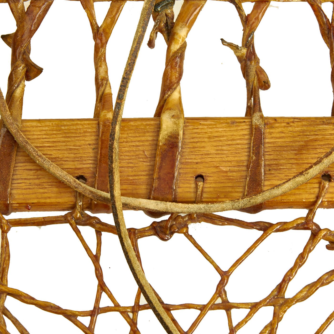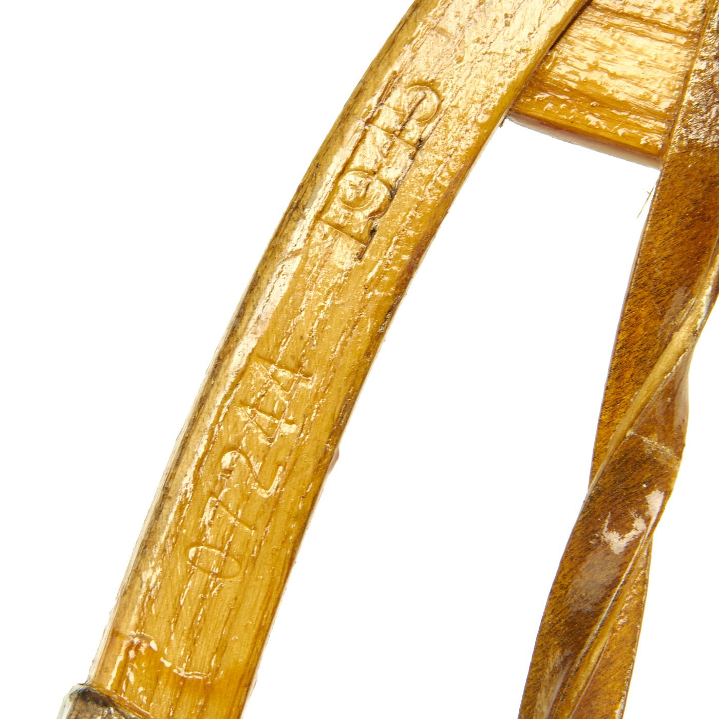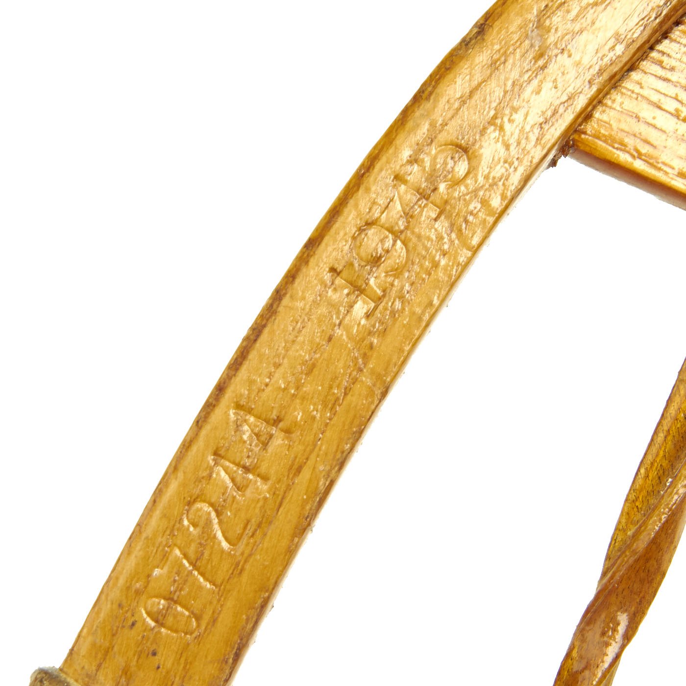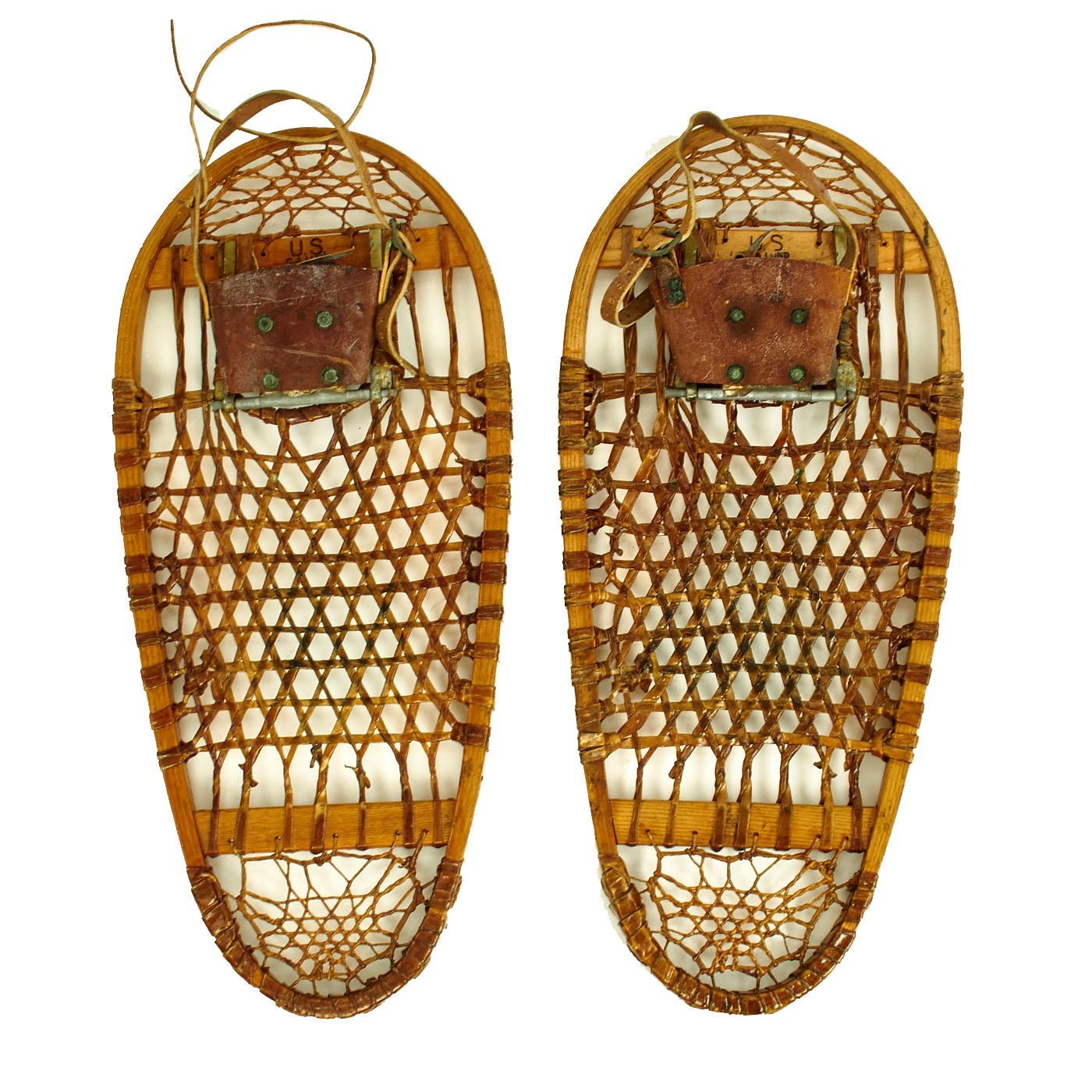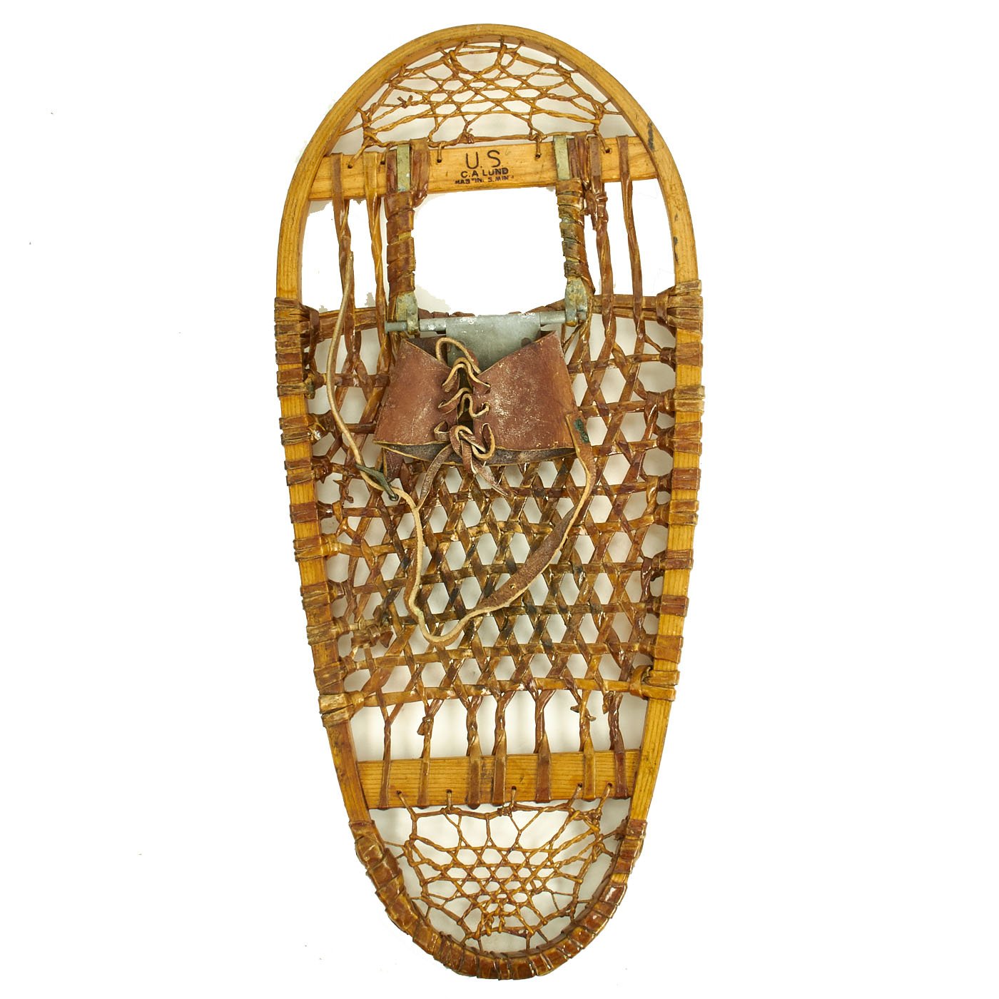 Original Items: Only One Pair Available. As used by the 10th Mountain Division in World War Two this is an excellent condition set of WW2 snowshoes manufactured by C.A. Lund of Prescott Wisconsin. They are serial number 09970 and dated 1945. The foot trap plate is marked U.S. and DOVER. They measure approximately 13" by 28". Excellent wood and sinew, Pliable leather, No cracks or splits in the wood. They don't come any nicer than this!
