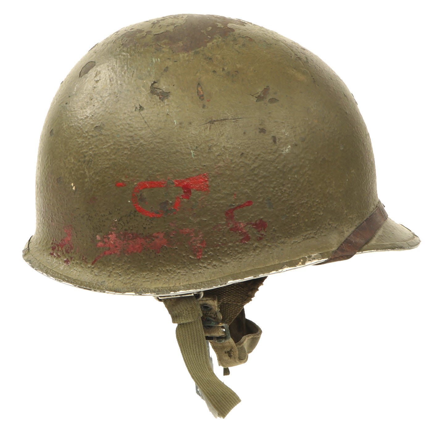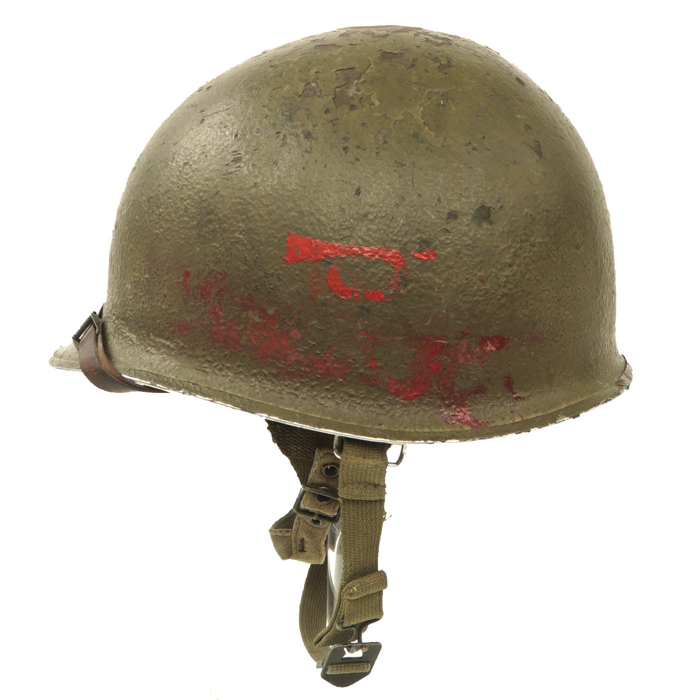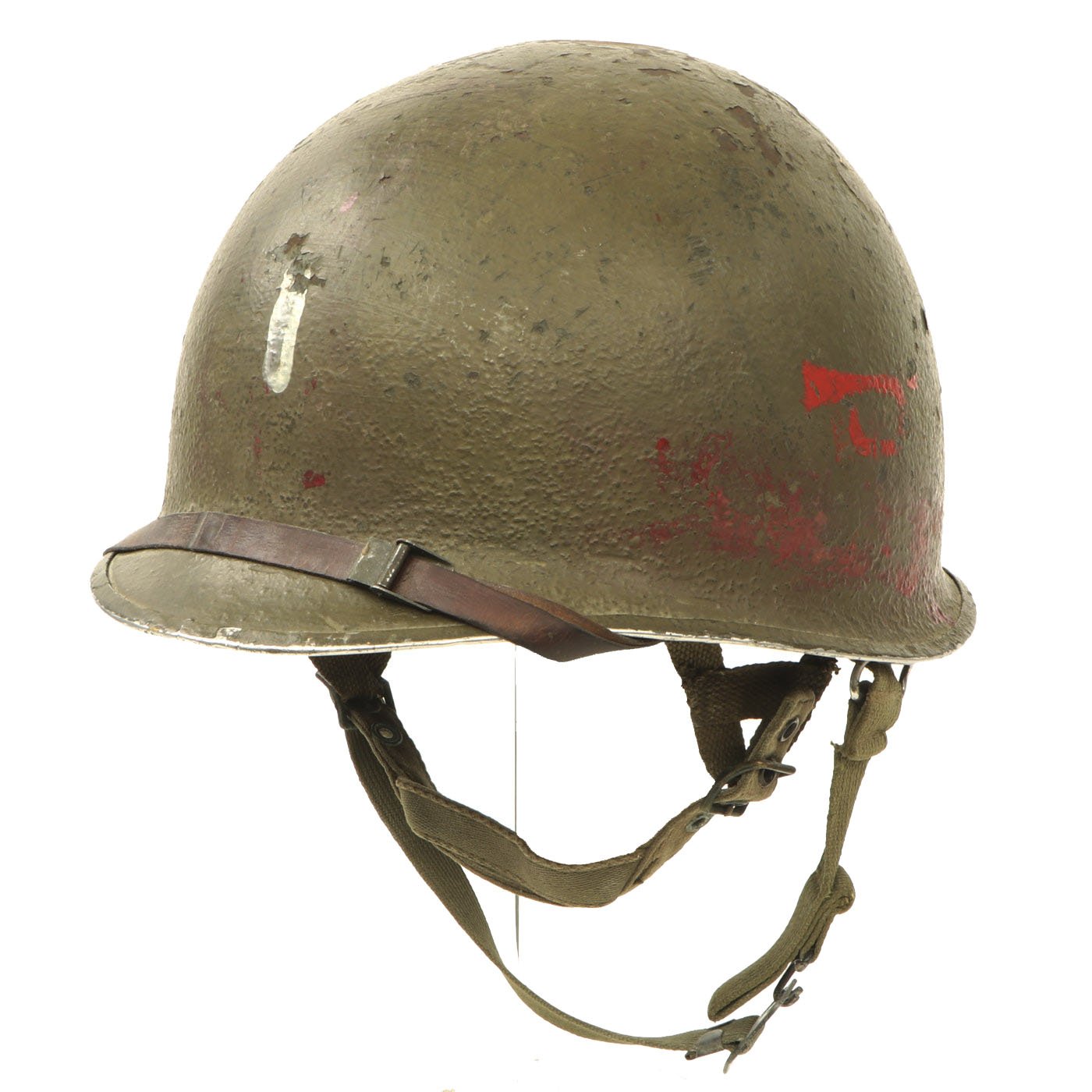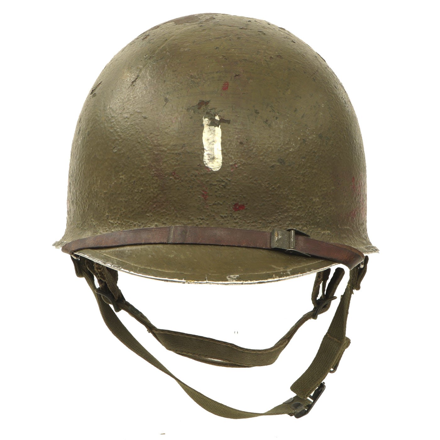 The U.S. WWII M-1 helmet was only produced from 1941 to 1945. The first production batch resulted with over 323,510 M-1 helmets before the start of the American involvement in the war. This helmet is heat lot stamped 1030K. which indicates the approximate manufacture date of August - September 1944, shortly before the move to the rear seam shell.