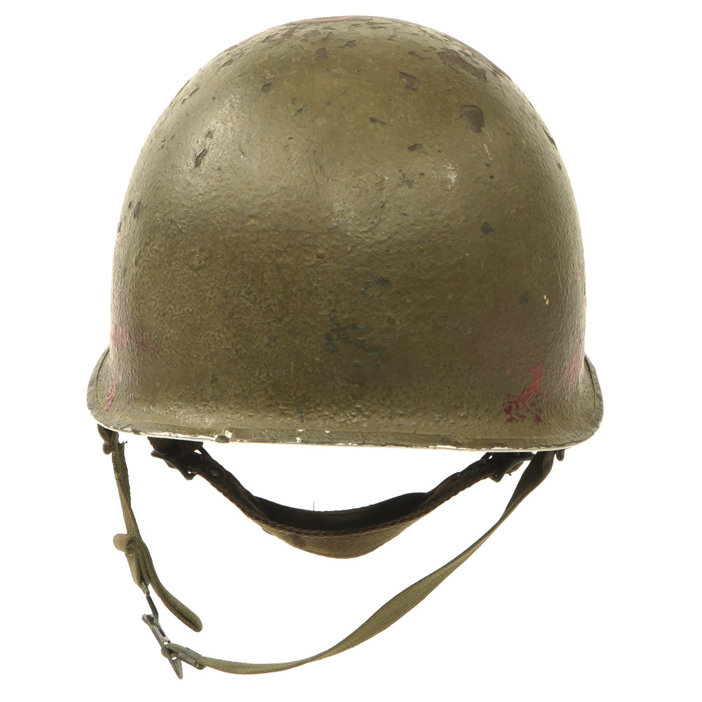This helmet shell is a fine example and still retains most of its original WW2 parts and the shell has all original "corked" grain paint, though it definitely has seen use, and the cork is worn and chipped off in places. It has definitely been repainted at least once, and shows a lot of use. It has the correct mid war OD Green #3 chin strap with stamped steel buckles, which have the paratrooper liner extensions.