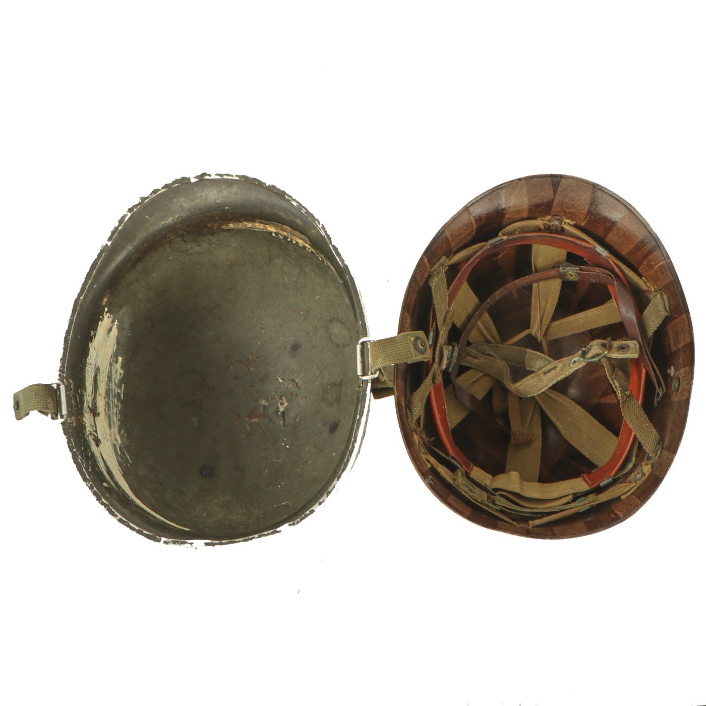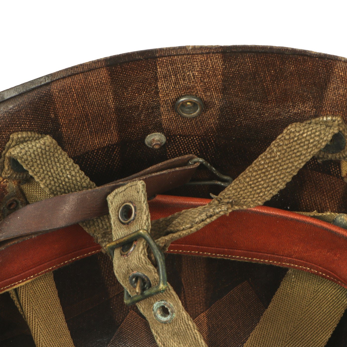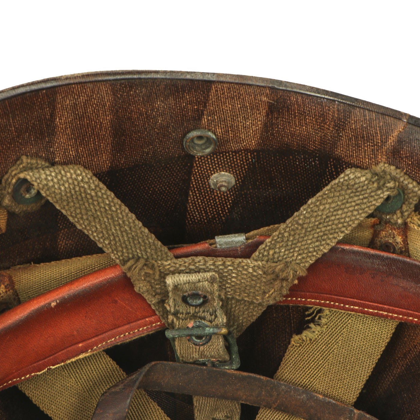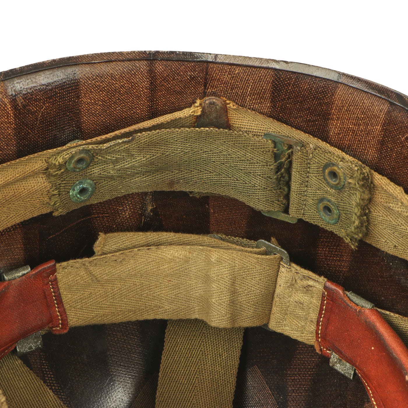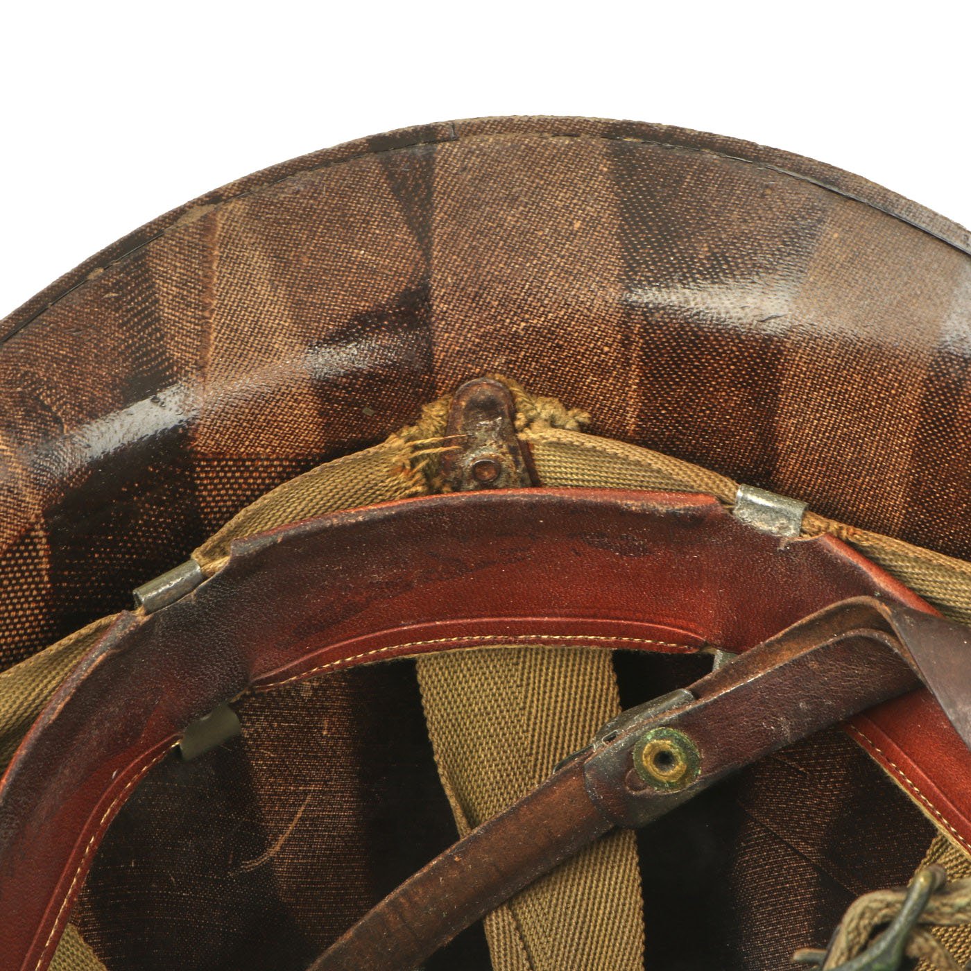 This true M1 liner be identified through the frontal eyelet hole. Other correct features include OD Green #3 cotton herringbone twill (HBT) cloth suspension liner. This HBT suspension is held tightly within the M-1 helmet liner by rivets and a series of triangular "A" washers. The three upper suspension bands are joined together with the correct tie string. This way the wearer could adjust the fit. The original suspension is definitely aged and worn, with some tears. The sweatband is present and shows only light use, so it may not be the first one installed. The paratrooper chin strap extensions are both complete with their cast brass buckles, and are in the correct OD Green #3, which matches the aged color of the rigging perfectly. The paratrooper chin strap is still present and intact, as well as the original leather chin strap for the liner as well.