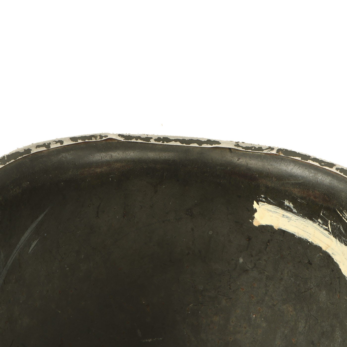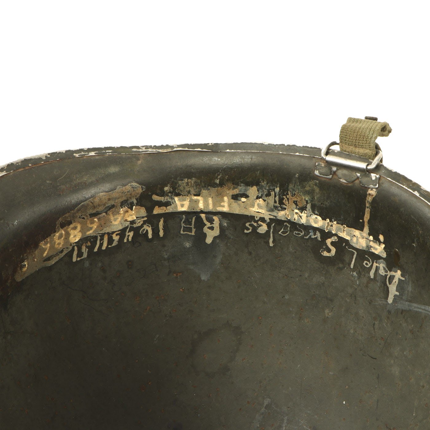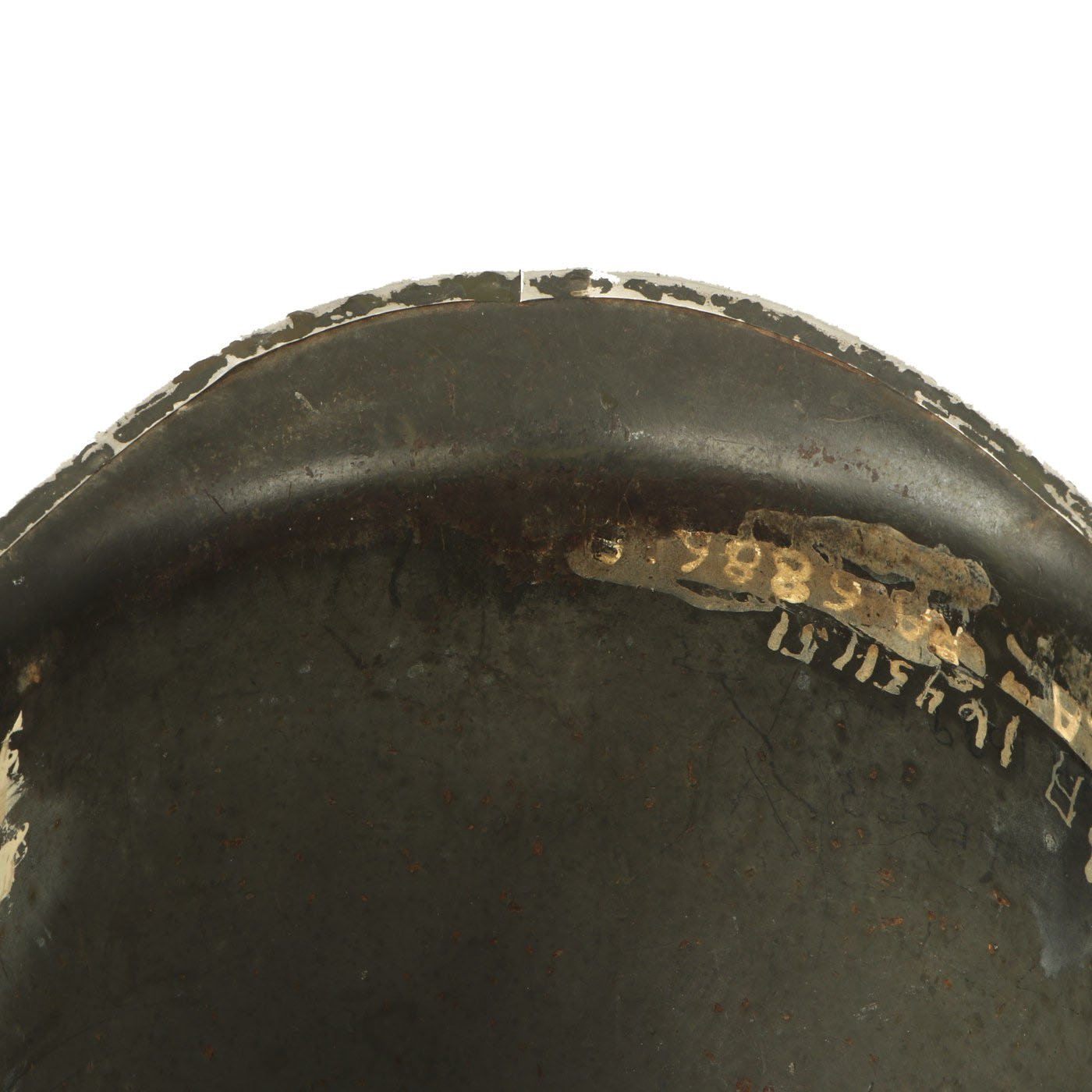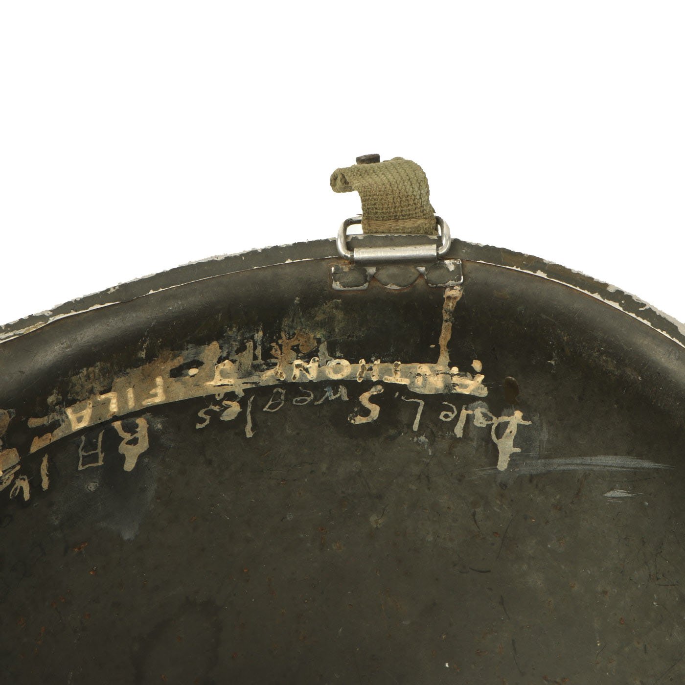 The helmet's service does not look to have ended with WWII, and it has been repainted several times. There are also several names and operating numbers marked on the inside of the shell. This is definitely a helmet with lots of history and research potential!