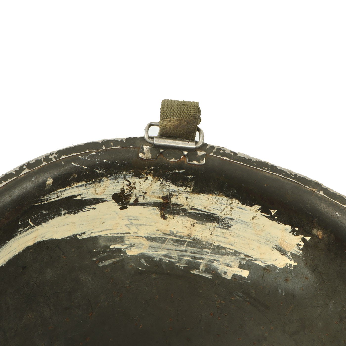 This fantastic condition M1 shell has correct later war swivel (movable) chinstrap loops called "bales" and a stainless steel rim with a front seam. These rims were both rust resistant and had "non-magnetic qualities" that reduced the chance of error readings when placed around certain sensitive equipment (such as a compass). In November 1944 the specification was changed to have the rim seam in the rear of the helmet.