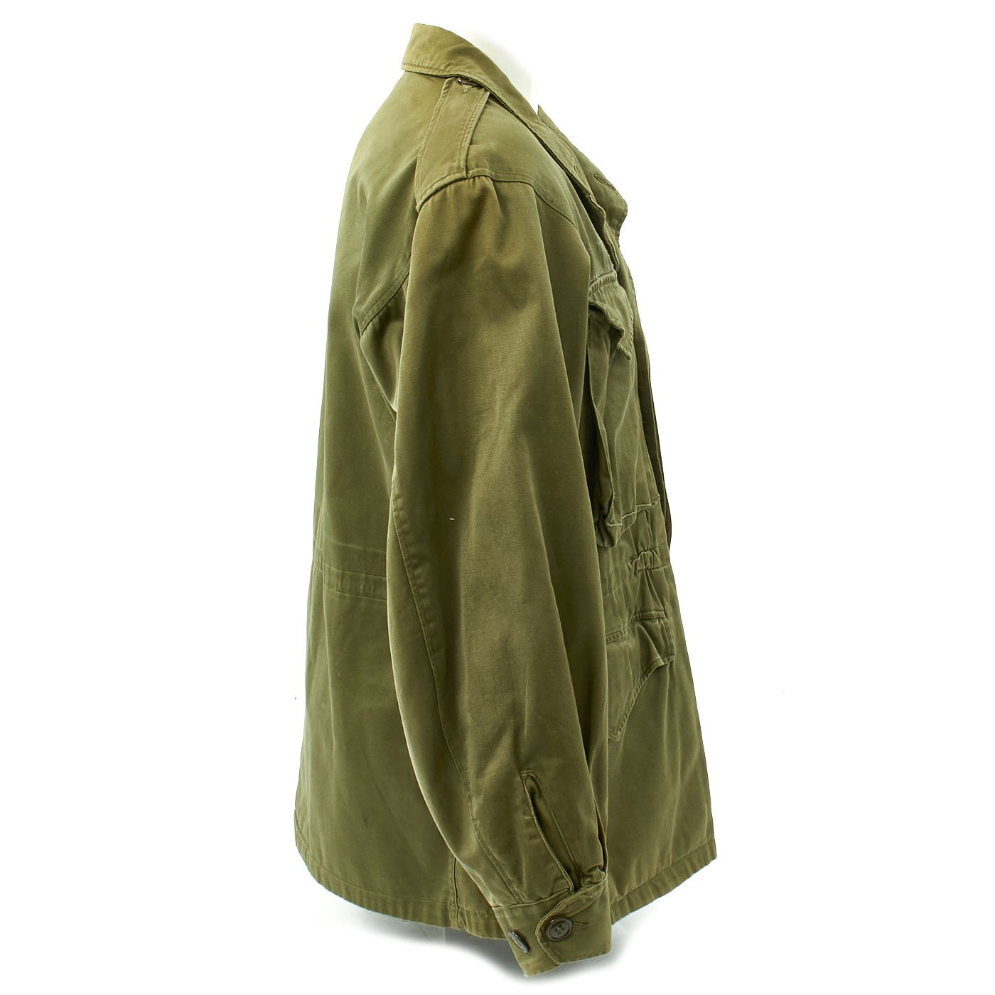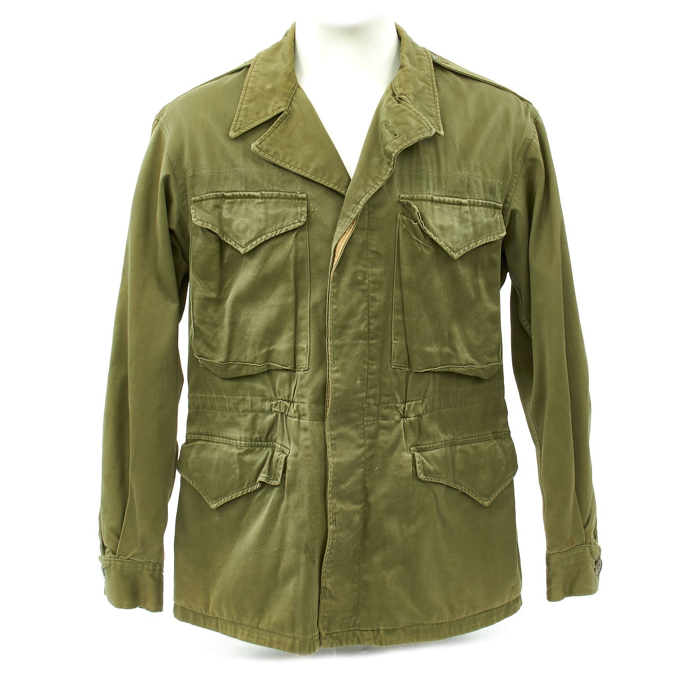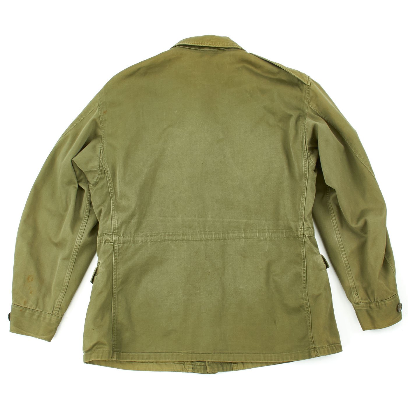 Original Item: Only One Available. The Jacket, Field, M1943 was standardized field jacket issued to Army soldiers in WWII. It was longer than the M-1941 jacket, coming down to the upper thighs. It was made in a light olive-drab OD7, later a darker OD9 cotton sateen. It also had a detachable hood, drawstring waist, two large breast pockets and two skirt pockets.