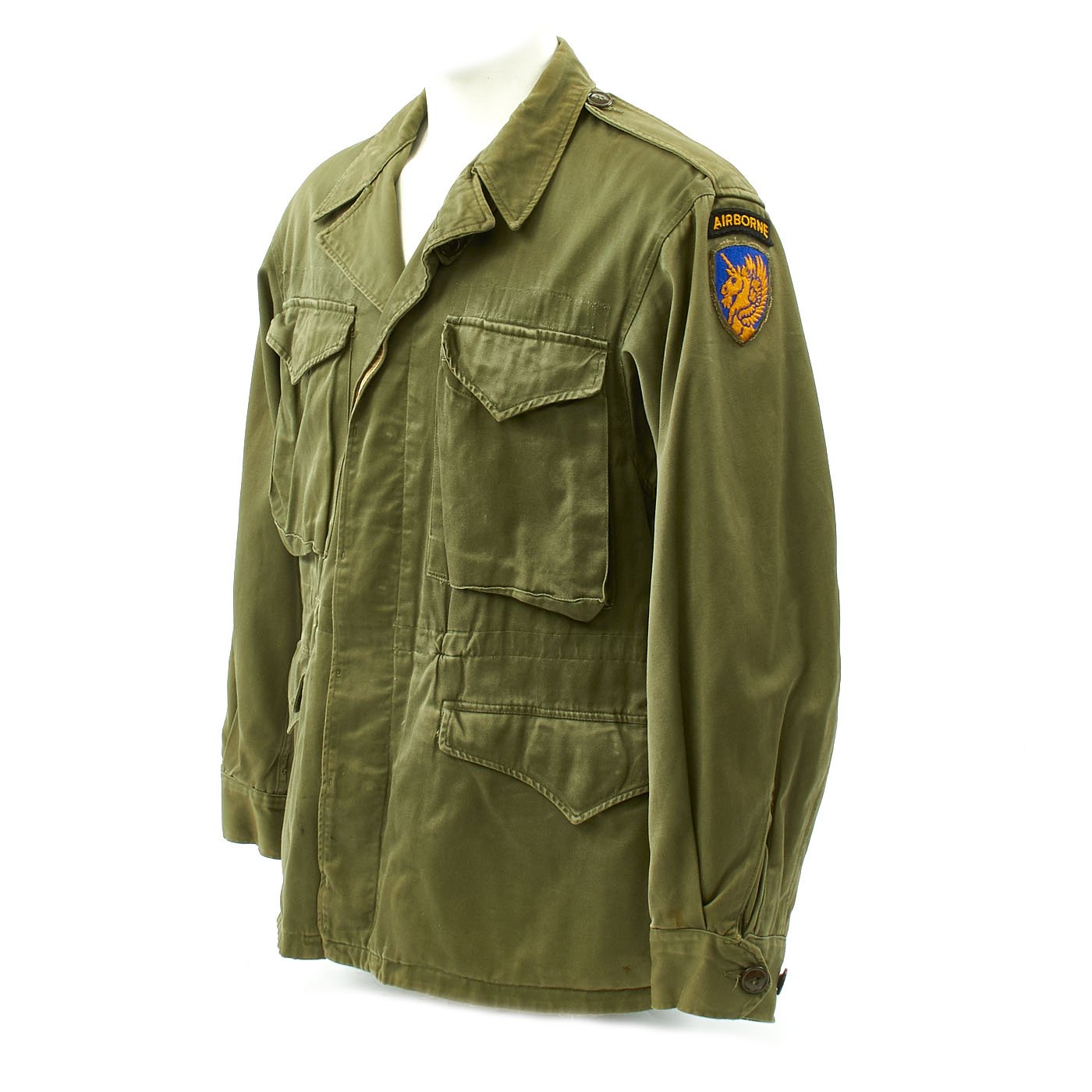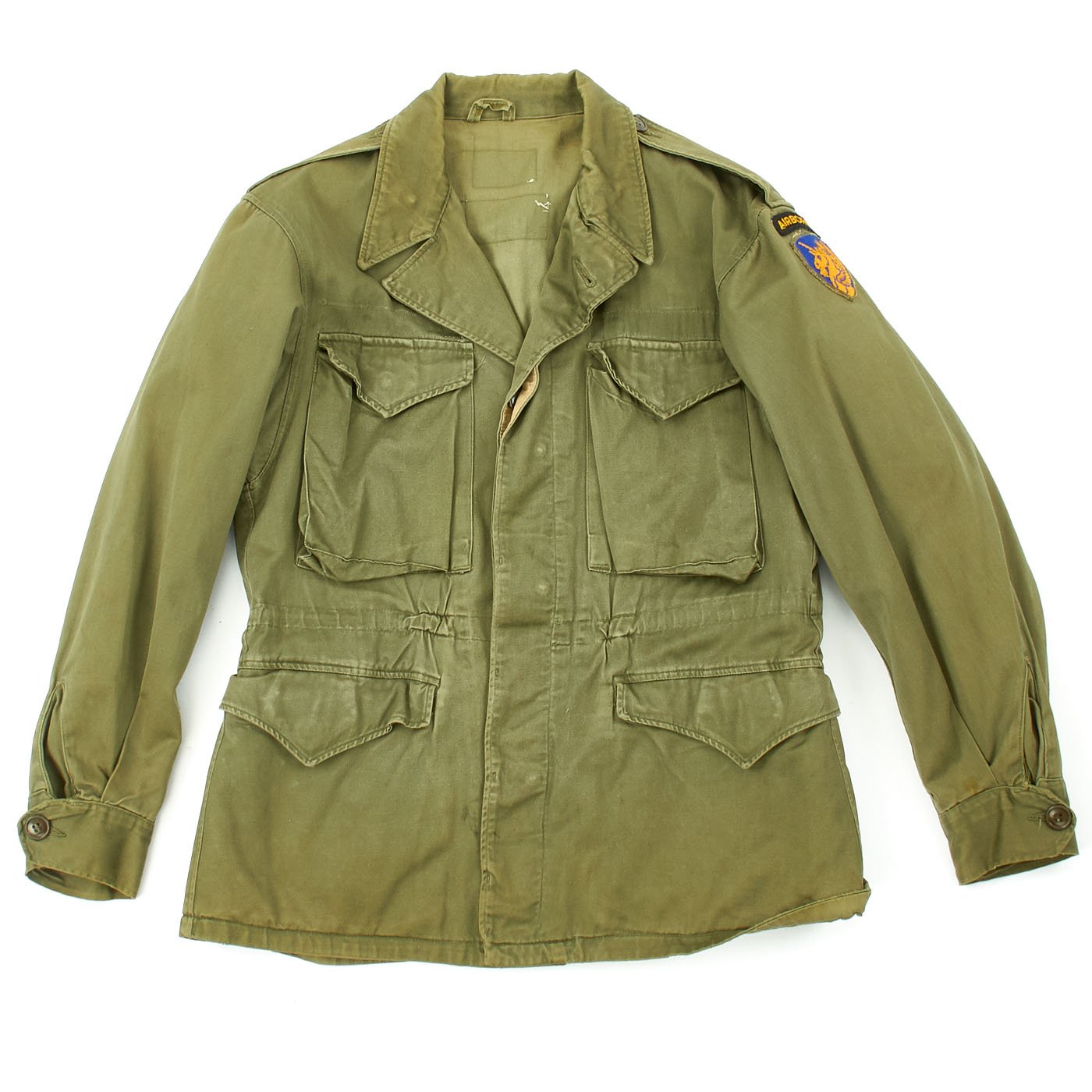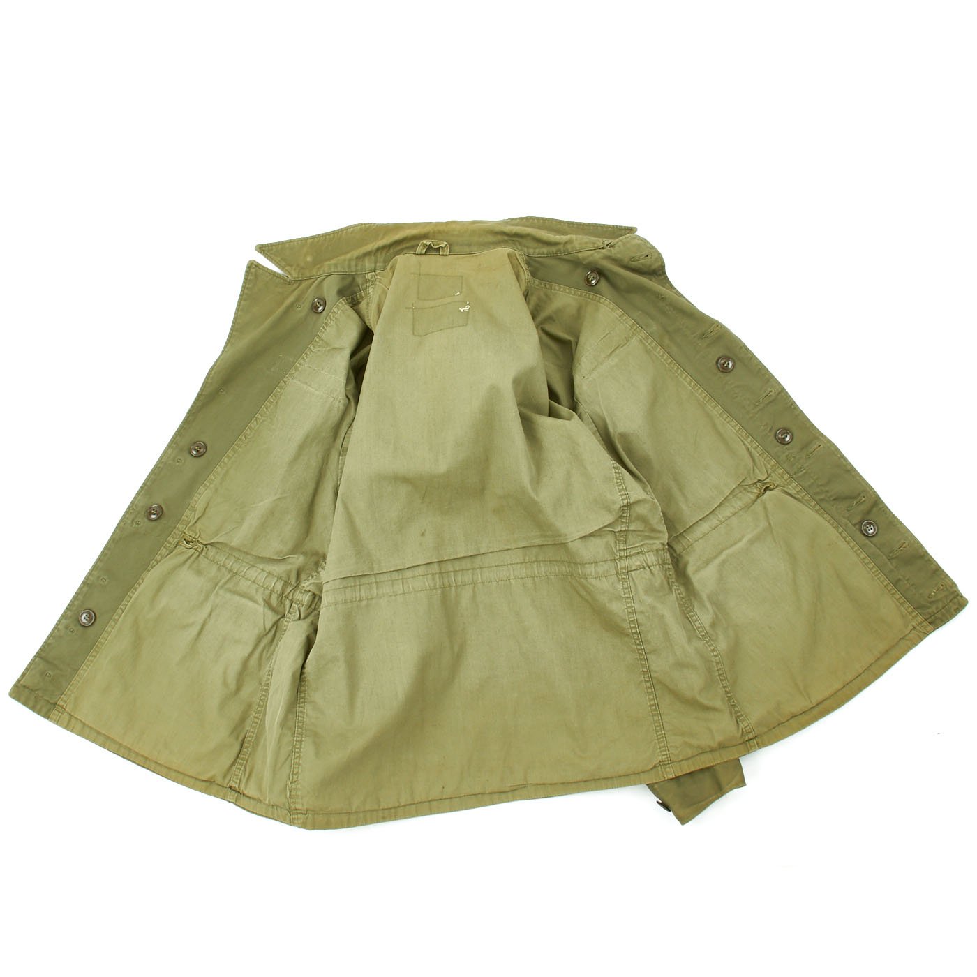 Original Item: Only One Available. The Jacket, Field, M1943 was standardized field jacket issued to Army soldiers in WWII. It was longer than the M-1941 jacket, coming down to the upper thighs. It was made in a light olive-drab OD7, later a darker OD9 cotton sateen. It also had a detachable hood, drawstring waist, two large breast pockets and two skirt pockets.