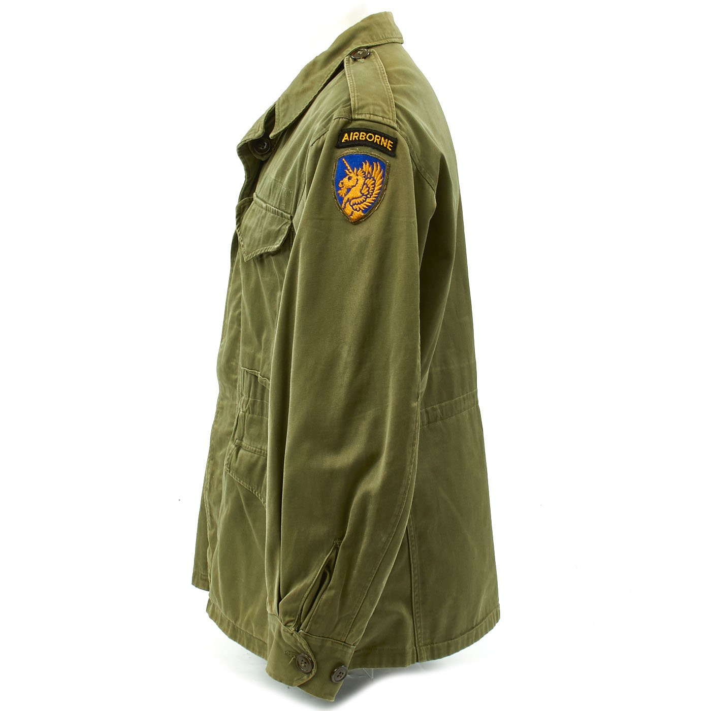 This example offered in excellent condition is approximate size US 42. It bears a nice embroidered 13th Airborne Division patch on the left shoulder. The jacket is not named, does not have the data label and is free of any major imperfections, all buttons are present and the condition is very good. Genuine WW2 issue M43 jackets with patches from famous divisions are hard to come by and this is one of the best we’'ve seen in a while and from an United States Airborne division that fought in the European Theater during WWII.