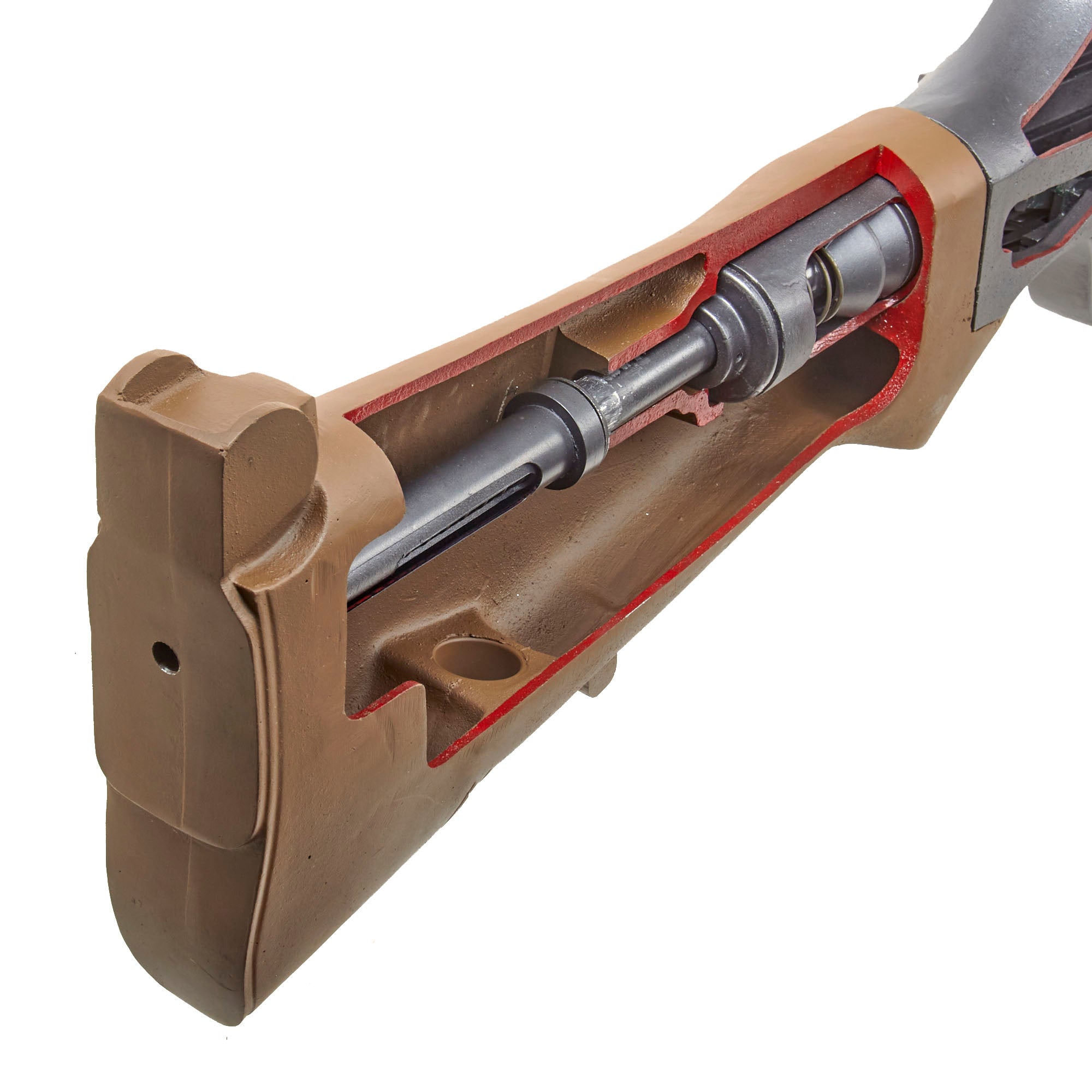 Final development of the M1918A2 was authorized on 30 June 1938, The FN-designed pistol grip and rate-reducer mechanism with two rates of automatic fire was shelved in favor of a rate-reducer mechanism designed by Springfield Armory, and housed in the buttstock. The Springfield Armory rate reducer also provided two selectable rates of fully automatic fire only, activated by engaging the selector toggle. Additionally, a skid-footed bipod was fitted to the muzzle end of the barrel, magazine guides were added to the front of the trigger guard, the handguard was shortened, a heat shield was added to help the cooling process, a small separate stock rest (monopod) was included for attachment to the butt, and the weapon's role was changed to that of a squad light machine gun. The BAR's rear sight scales were also modified to accommodate the newly standardized M2 Ball ammunition with its lighter, flat-base bullet. The M1918A2 walnut buttstock is approximately one inch longer than the M1918 BAR buttstock. The M1918A2 barrel was also fitted with a new flash suppressor, and fully adjustable iron sights. Late in the war, a barrel-mounted carrying handle was added.