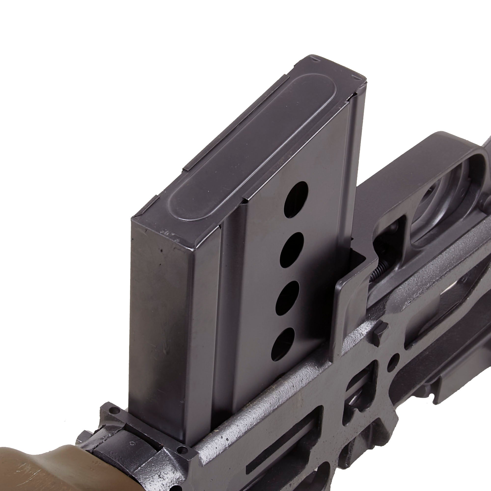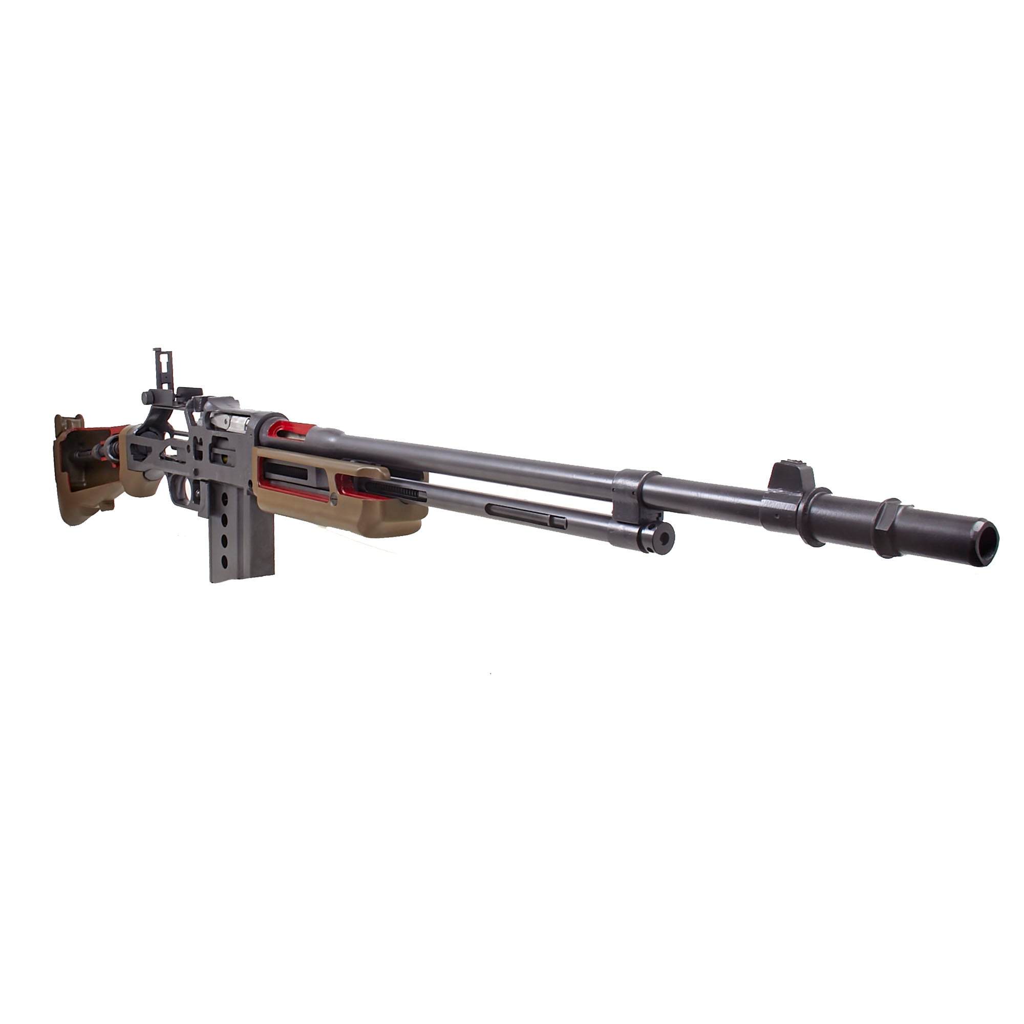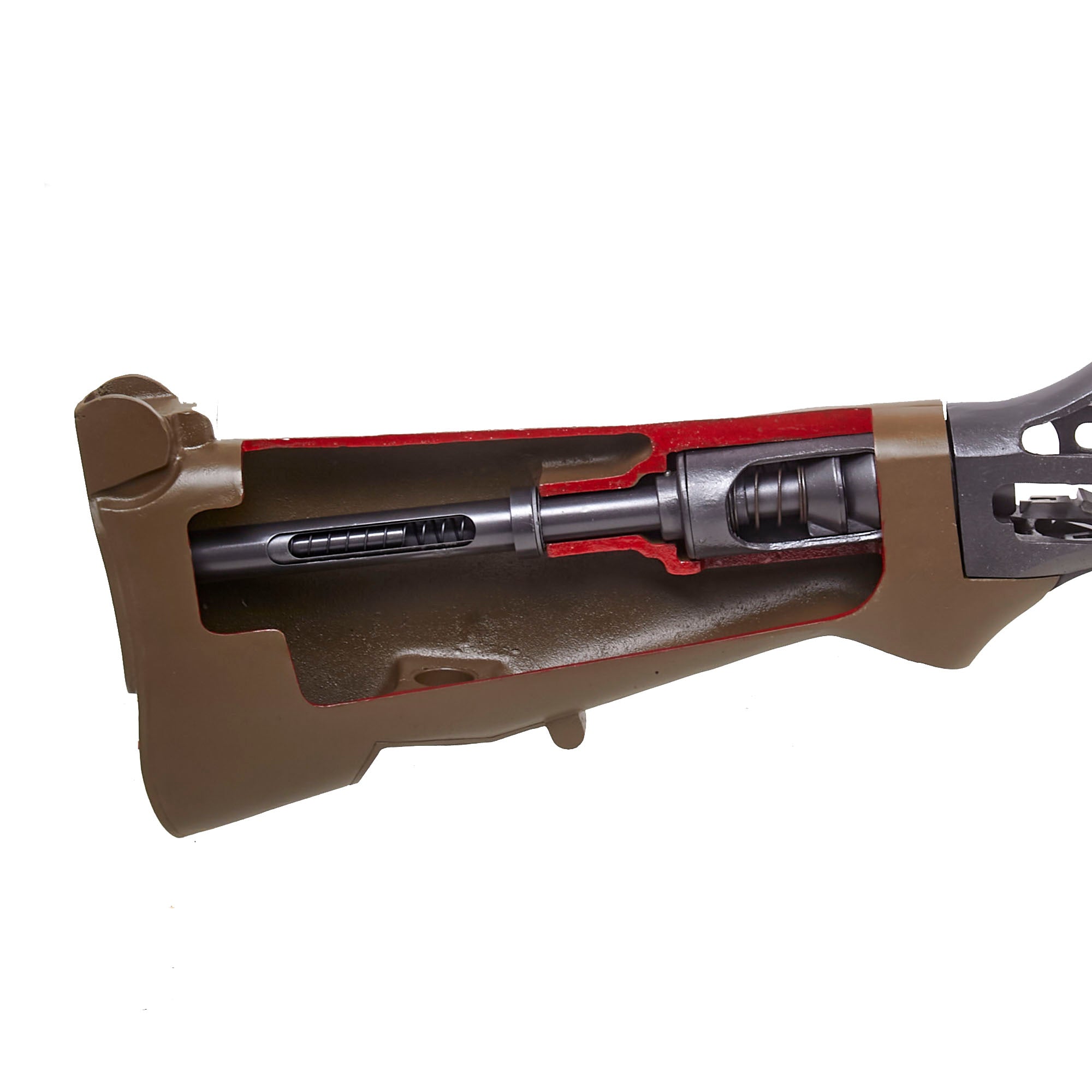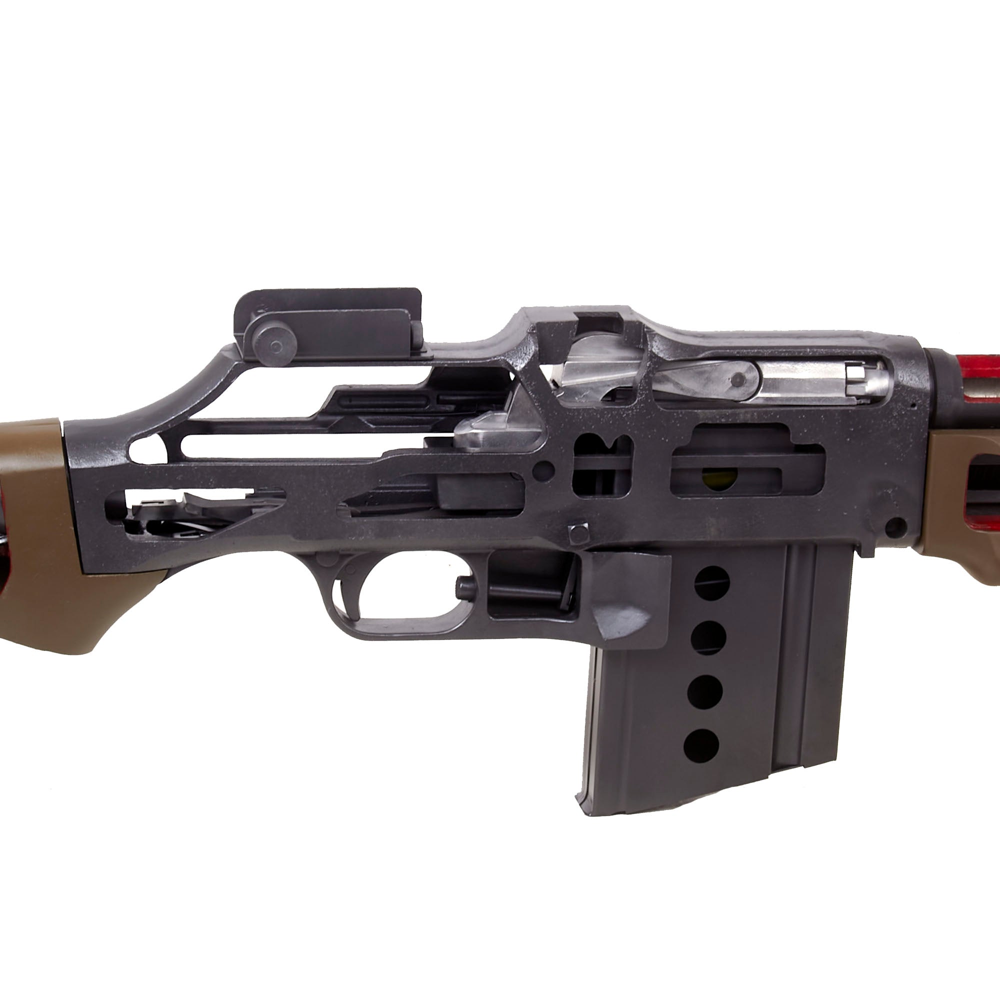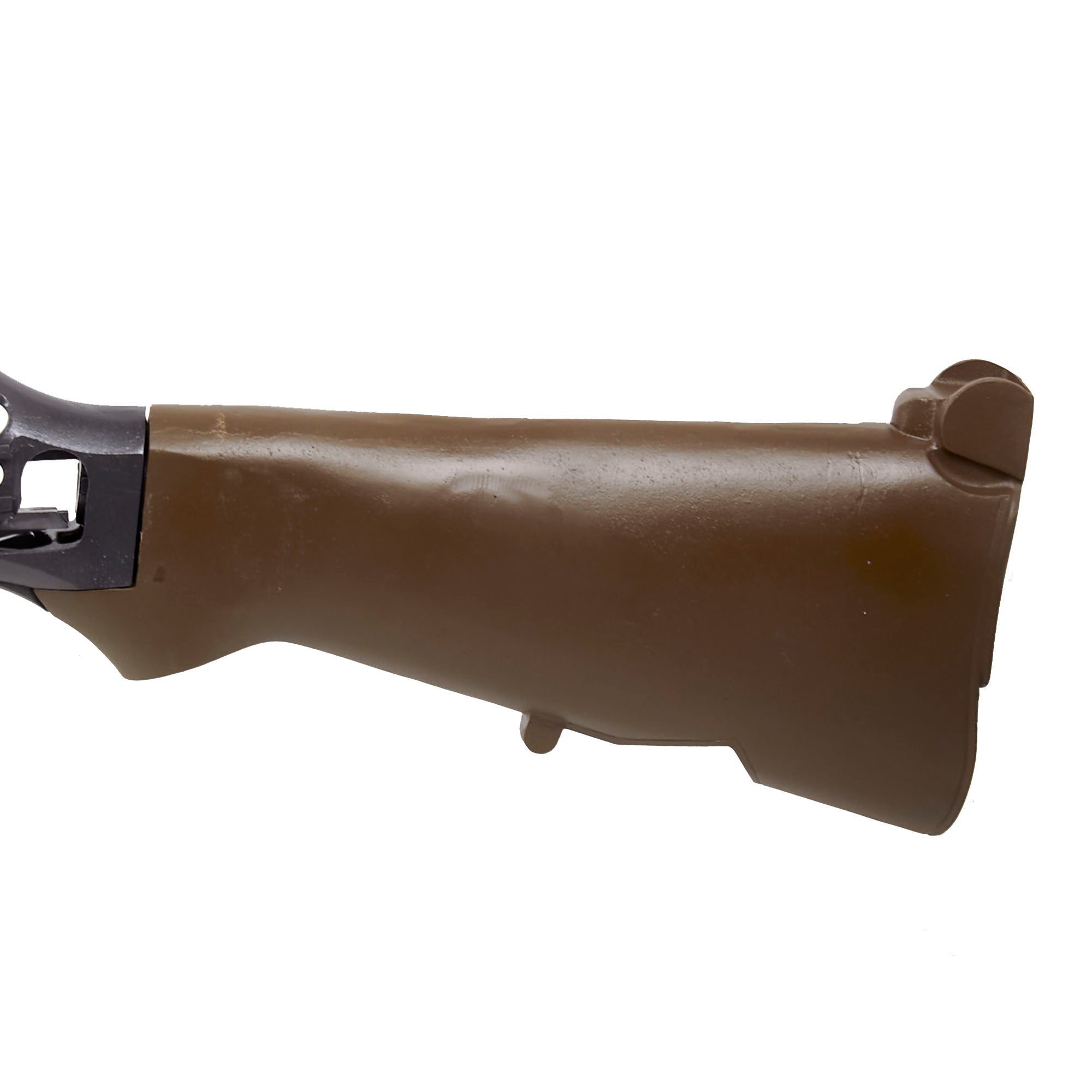 Rifle actually "functions" when bolt is cycled, demonstrating the open bolt working and pulling the round out, though it is finicky and requires a good amount of force. Red paint to highlight areas of operation. We tested it and it even extracts the current round or picks up another round from magazine when inserted. The trainer still has the original magazine, often lost, and has 7 plastic dummy rounds inside, 4 yellow in color and 3 in green. This example looks to have been fully repainted / restored recently, and really looks great.