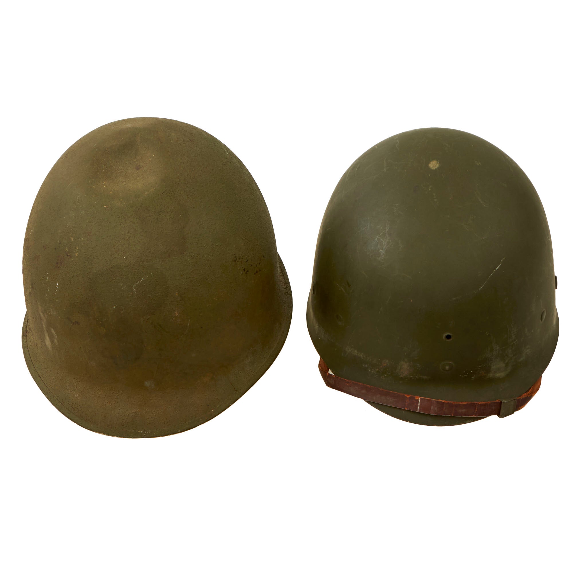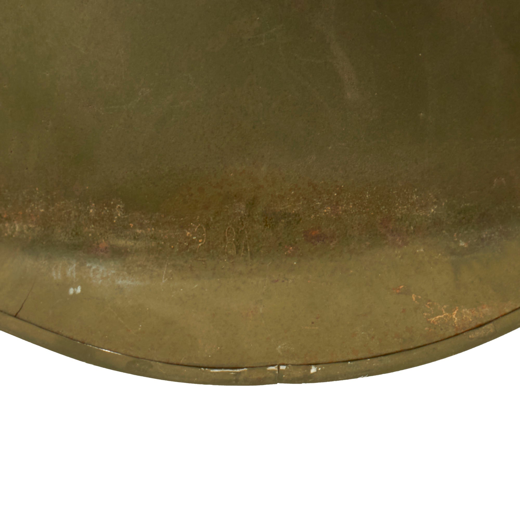 The early M-1 helmet shells such as this example have a set of fixed (static) chinstrap loops called "bales" and a stainless steel rim. These rims were both rust resistant and had "non-magnetic qualities" that reduced the chance of error readings when placed around certain sensitive equipment (such as a compass). In October 1943, issues with the fixed bales breaking off resulted in a change to the "swivel bales".
