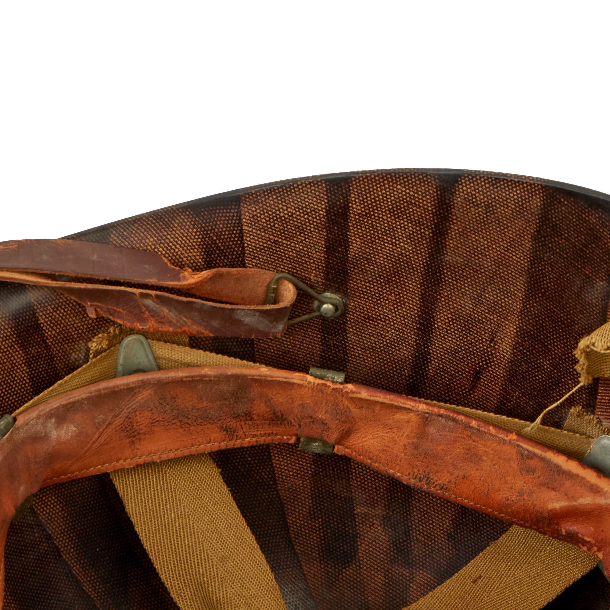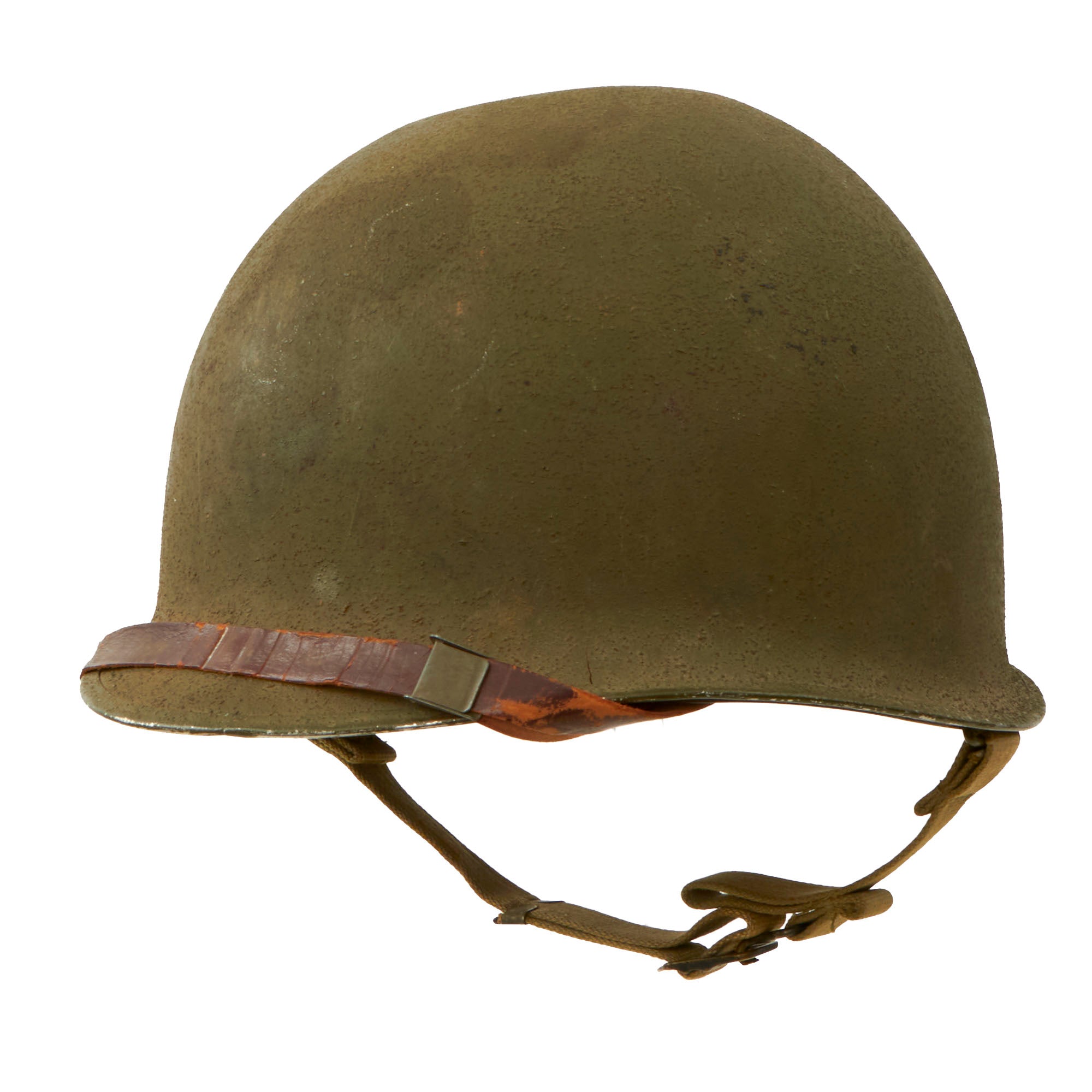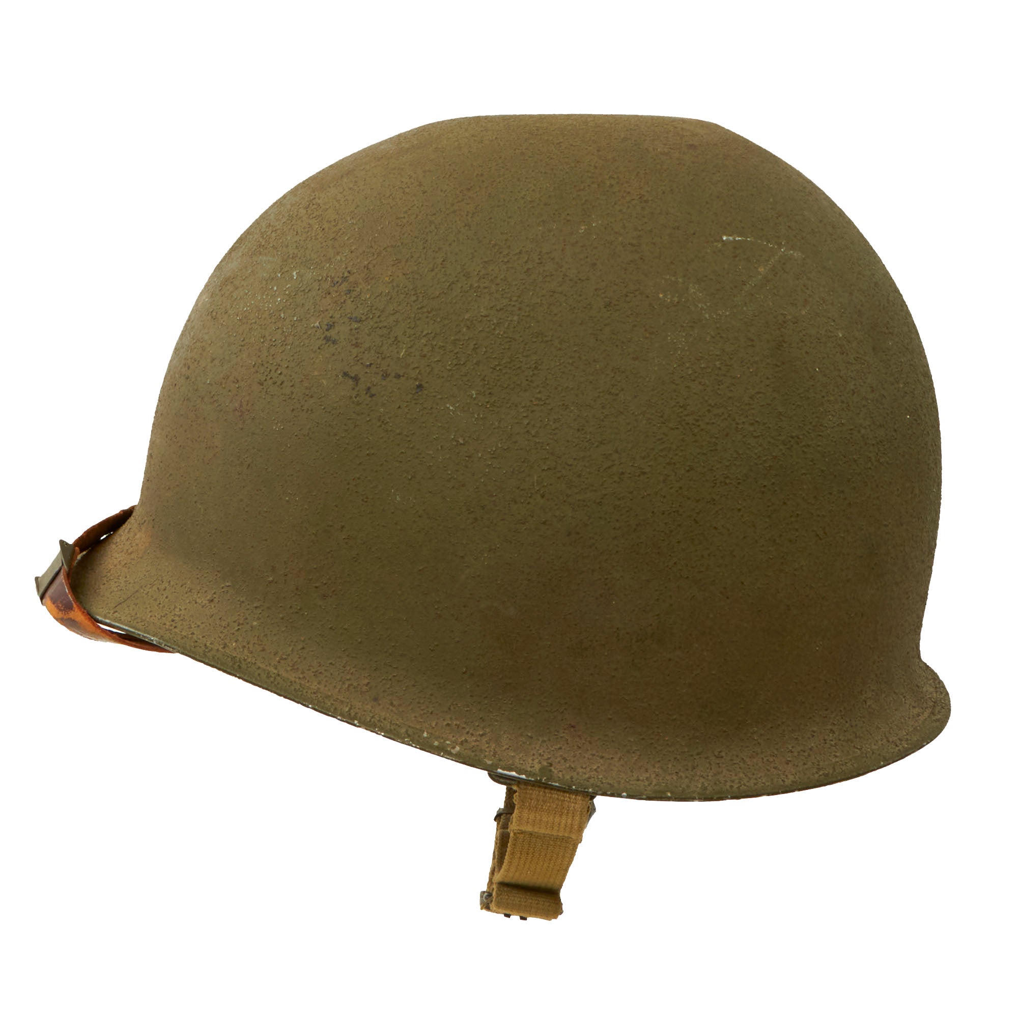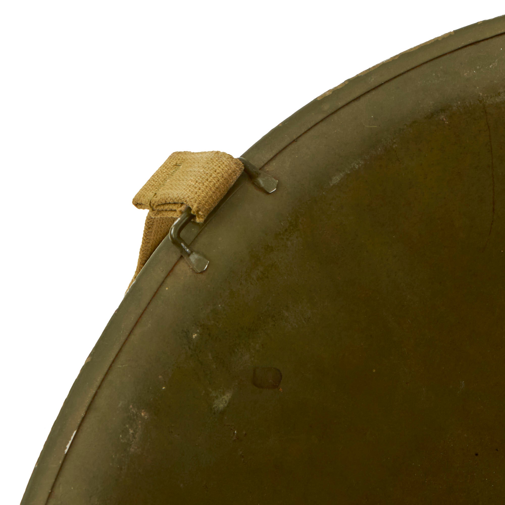 This true US WWII M-1 helmet liner can be identified through the frontal eyelet hole. Other correct WWII features include cotton OD Green #3 herringbone twill (HBT) cloth suspension liner, with the webbing in solid but service worn shape, with a good amount of staining and some flaking, as shown. This HBT suspension is held within the M-1 helmet liner by rivets and a series of triangular "A" washers. The three upper suspension bands are joined together with the correct OD green string. This way the wearer could adjust the fit. The sweatband is complete as is the leather chinstrap, both in solid condition although there is cracking throughout the chinstrap.