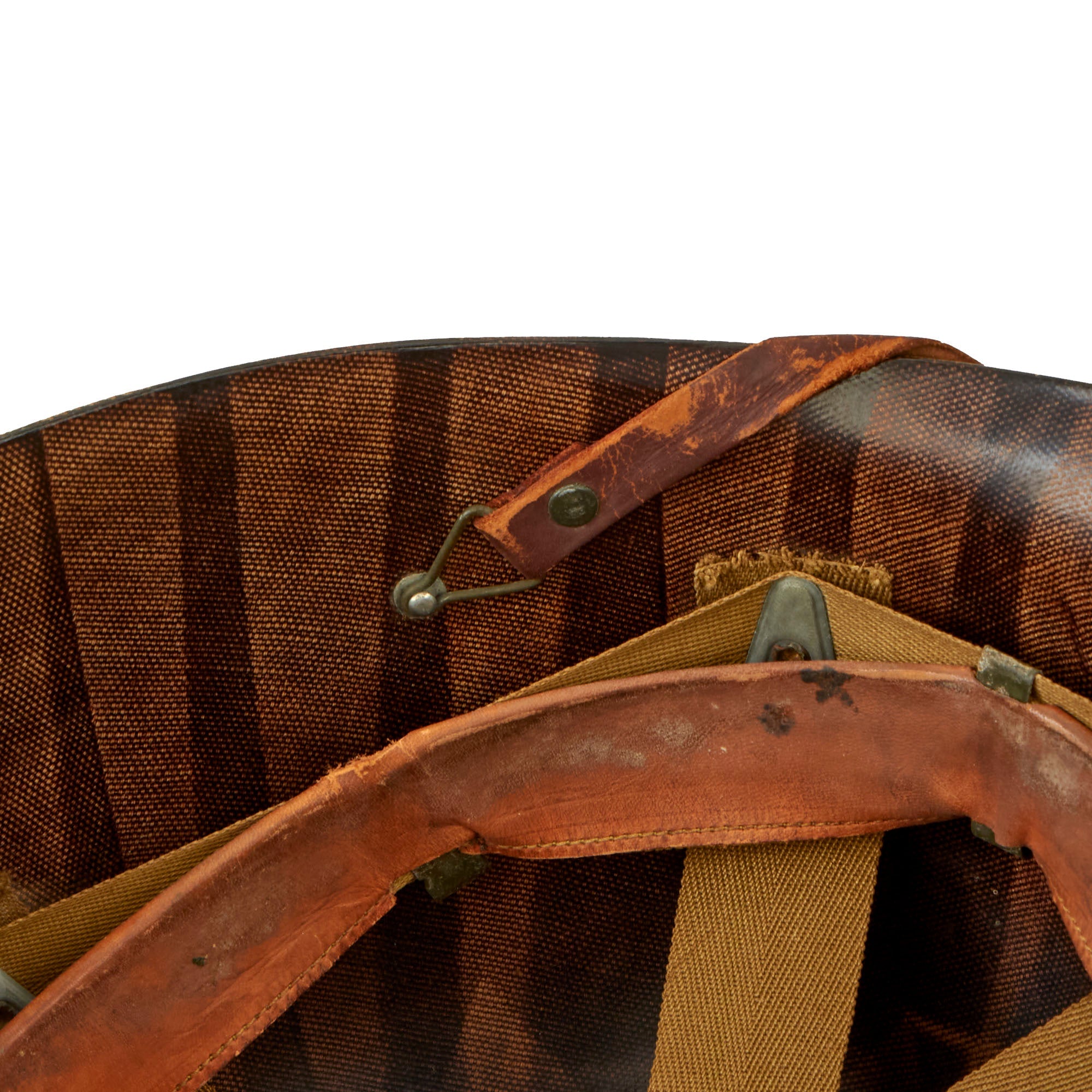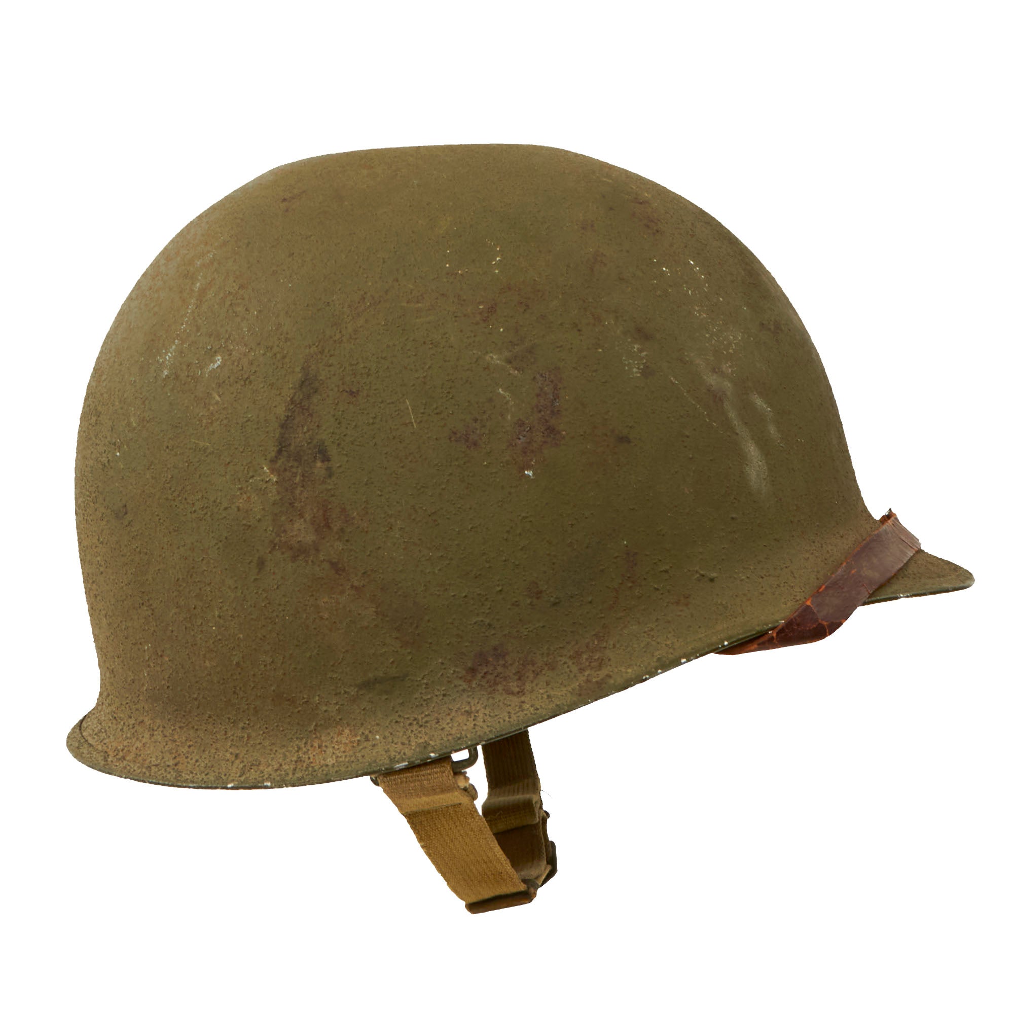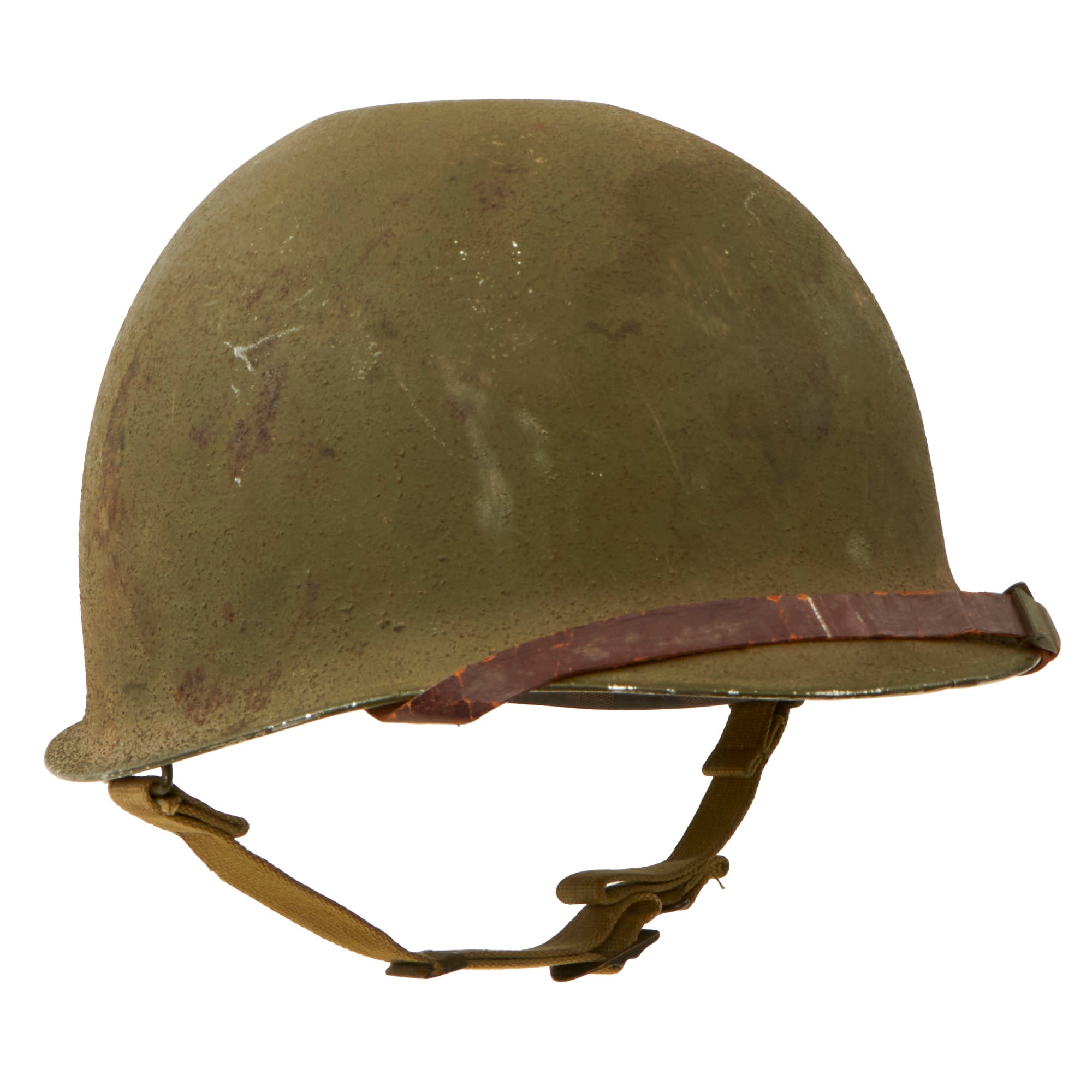 This true US WWII M-1 helmet liner can be identified through the frontal eyelet hole. Other correct WWII features include cotton OD Green #3 herringbone twill (HBT) cloth suspension liner, with the webbing in solid but service worn shape, with a good amount of staining and some flaking, as shown. This HBT suspension is held within the M-1 helmet liner by rivets and a series of triangular "A" washers. The three upper suspension bands are joined together with the correct OD green string. This way the wearer could adjust the fit. The sweatband is complete as is the leather chinstrap, both in solid condition although there is cracking throughout the chinstrap.