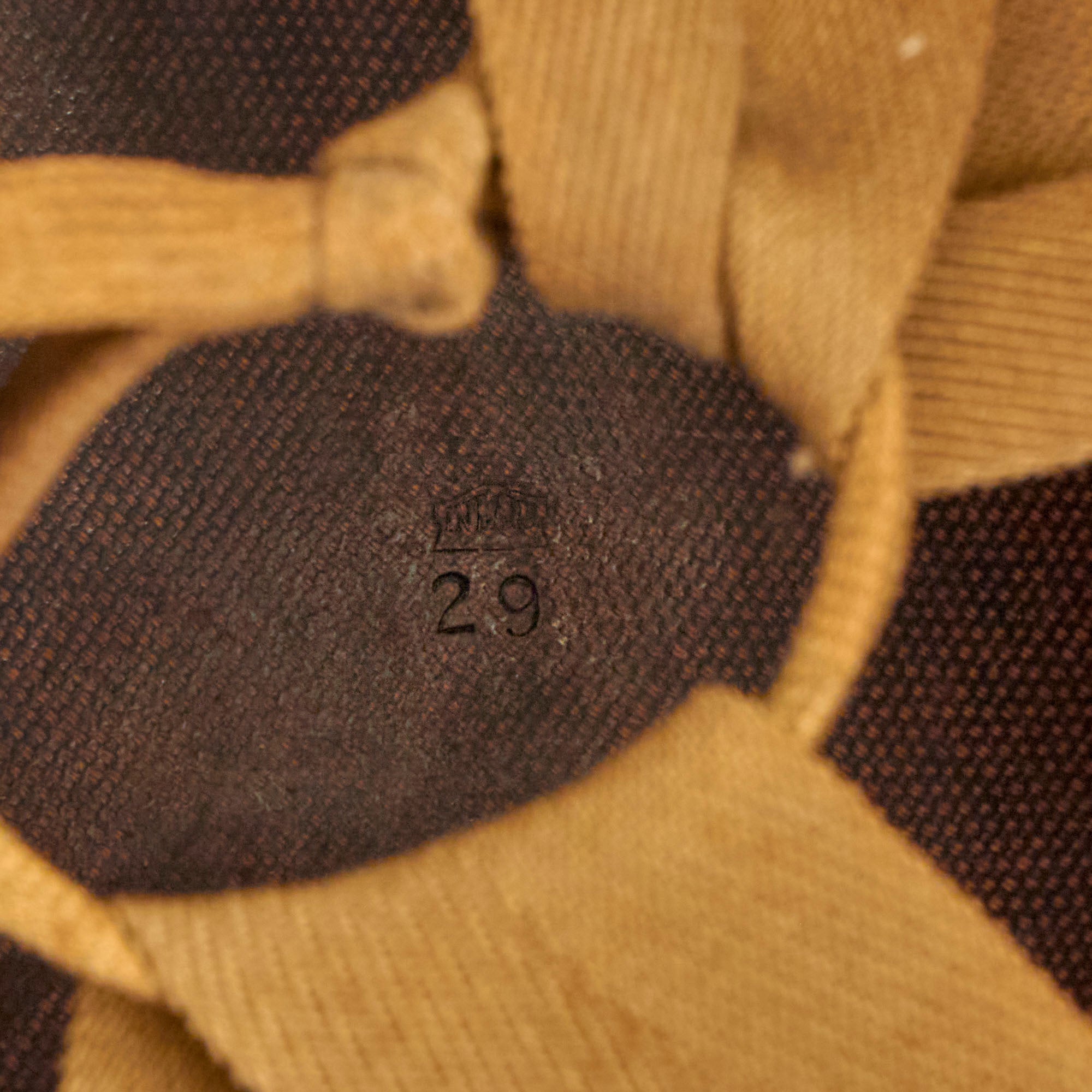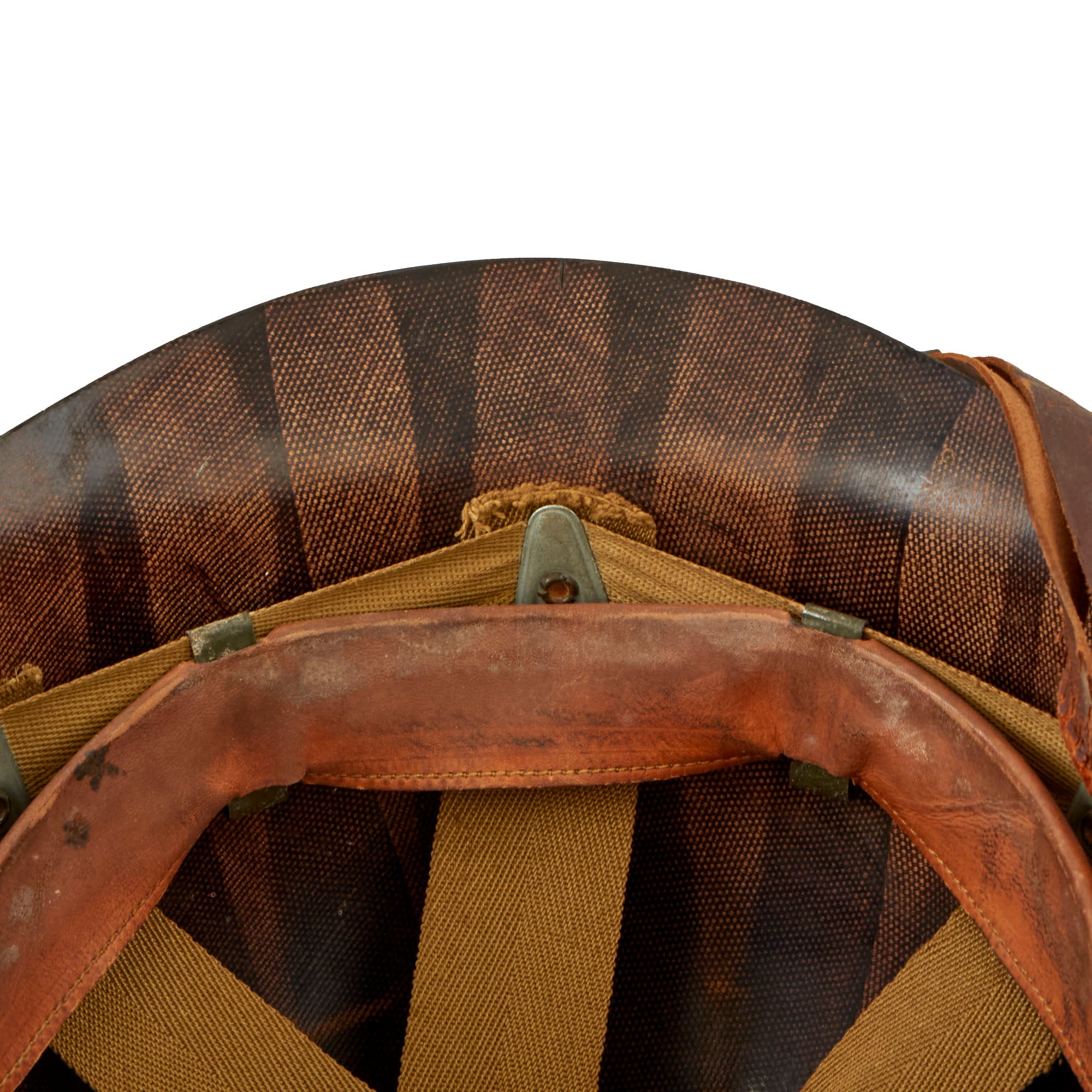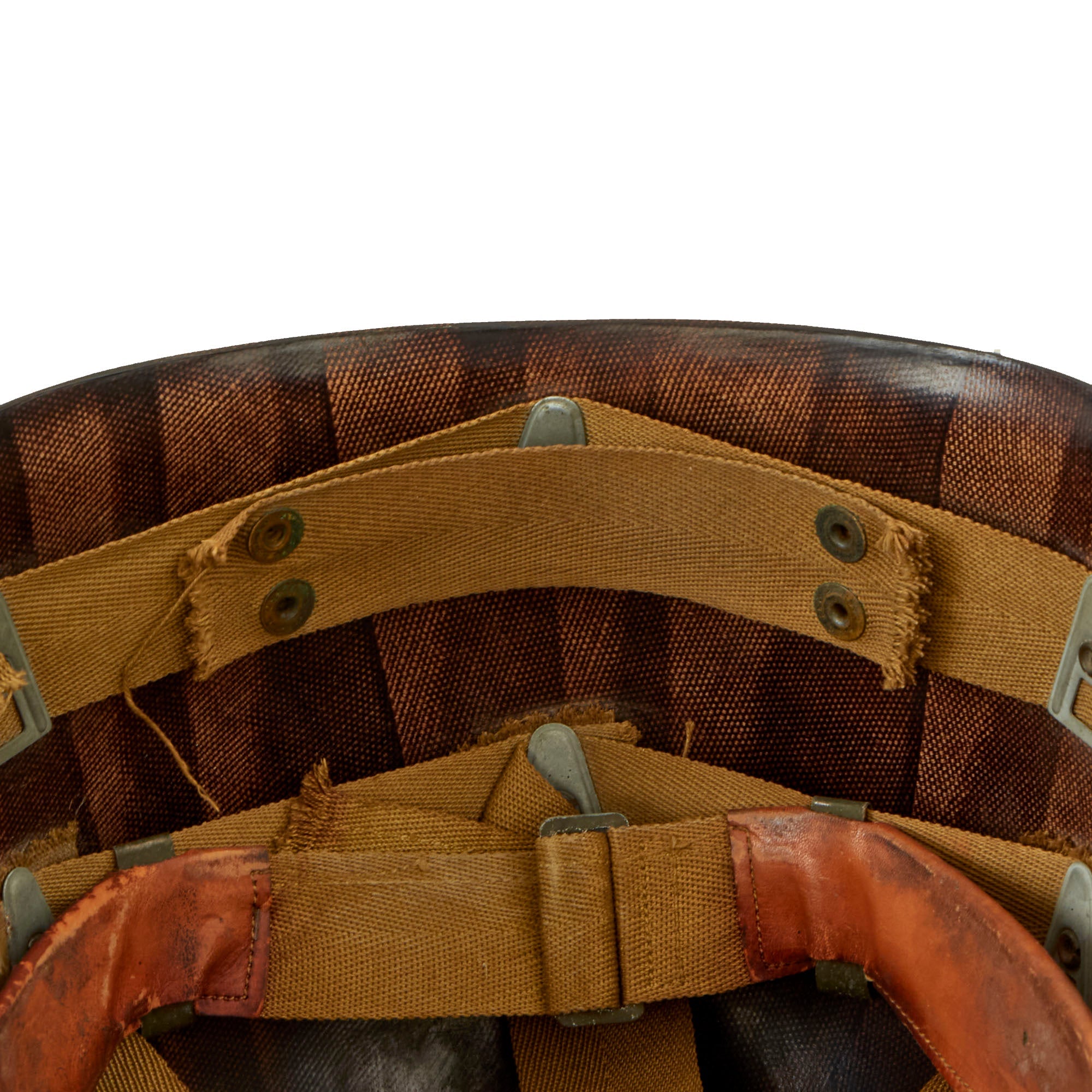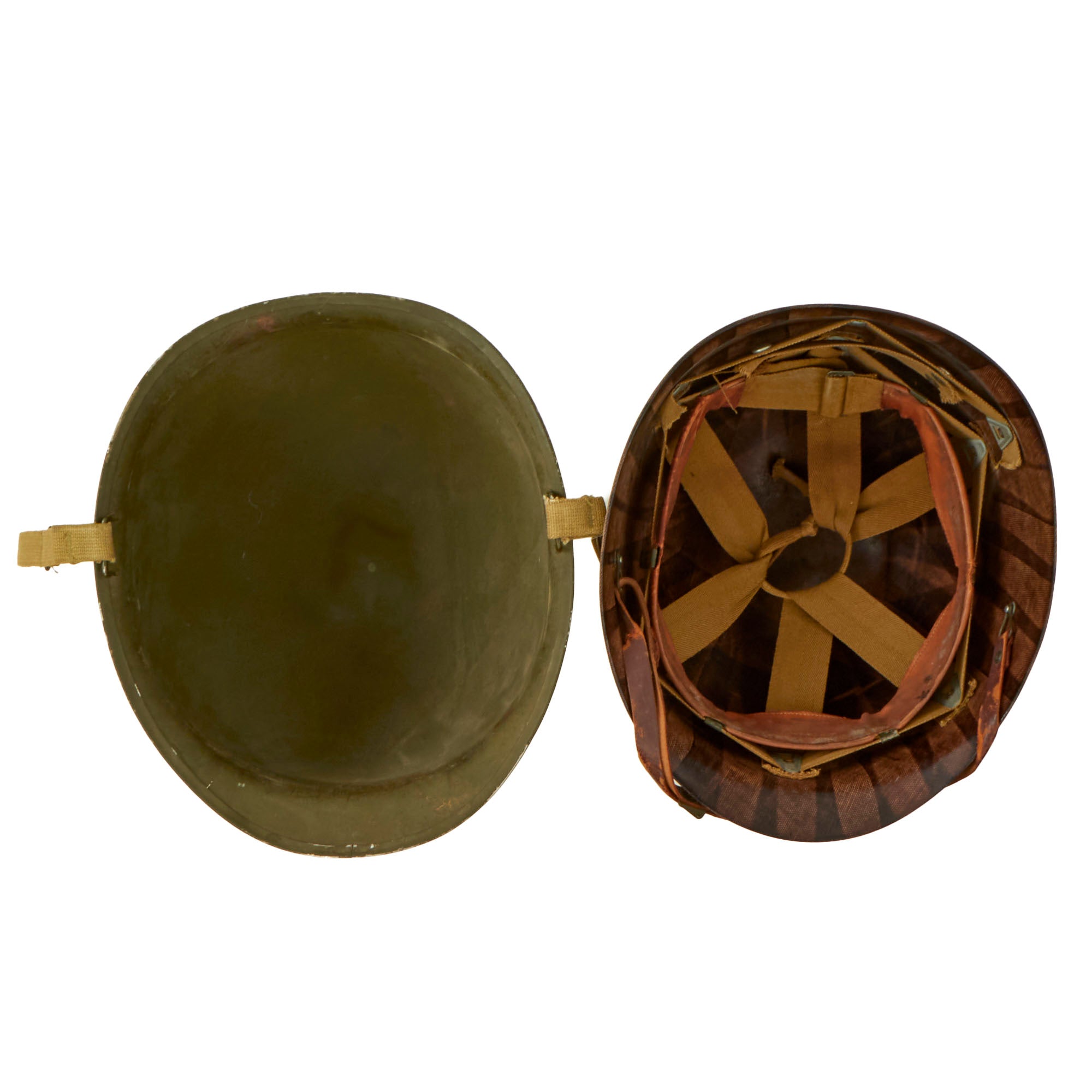 This true US WWII M-1 helmet liner can be identified through the frontal eyelet hole. Other correct WWII features include cotton OD Green #3 herringbone twill (HBT) cloth suspension liner, with the webbing in solid but service worn shape, with a good amount of staining and some flaking, as shown. This HBT suspension is held within the M-1 helmet liner by rivets and a series of triangular "A" washers. The three upper suspension bands are joined together with the correct OD green string. This way the wearer could adjust the fit. The sweatband is complete as is the leather chinstrap, both in solid condition although there is cracking throughout the chinstrap.