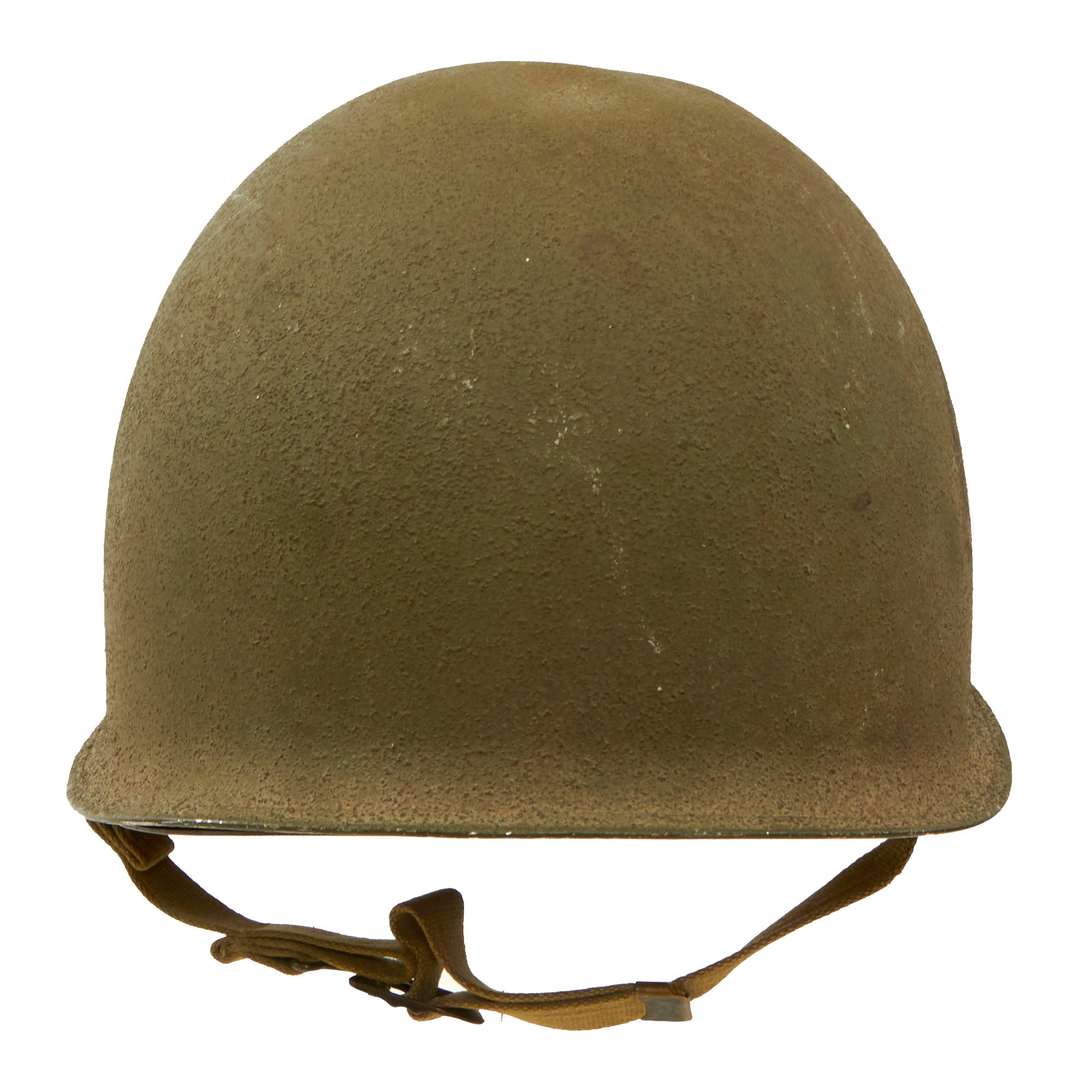 This helmet is a fine example and still retains all of its original WWII parts and the shell has all original "corked" grain paint with front seam and fixed bails. The chin strap is the correct early war OD Green #3 with stamped brass hardware.