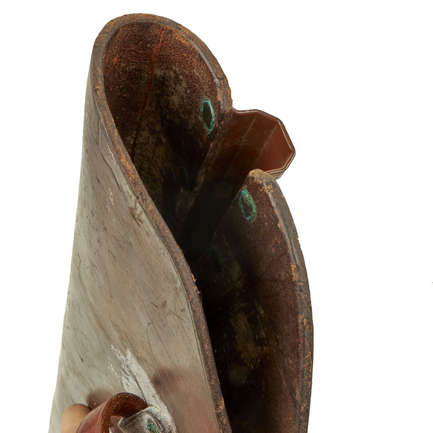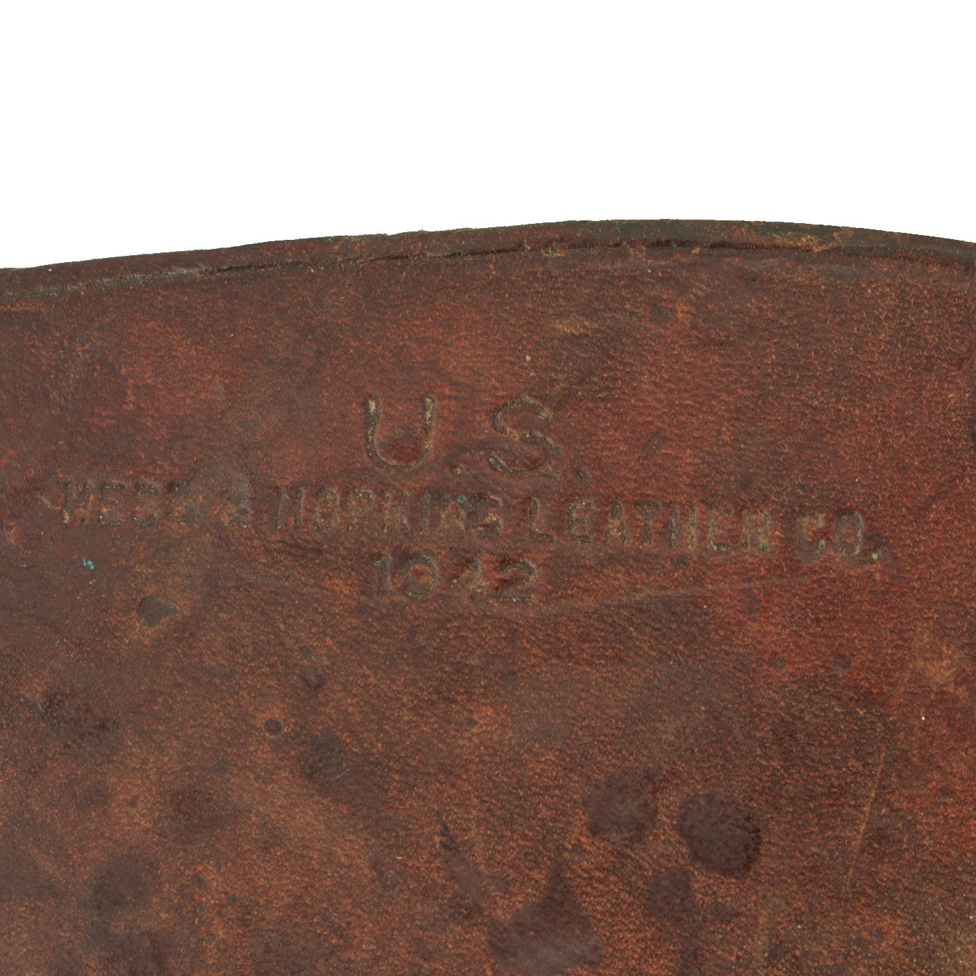 Original Item: Only one available. This is an excellent condition M1 Garand rigid leather scabbard by Hess & Hopkins Leather Company. The scabbard is clearly marked with a nice deep and crisp “U.S.”, “Hess & Hopkins Leather Co.” and “1942” stamp. This example is invery good original condition, with the leather being supple and pliable, and retaining much of its original rich russet color. The stitching is complete, all rivets present, leather final cap intact, and roughly 95% of the original brown paint on the cocking lever guard is intact. The leather securing straps are intact, with the buckles having a good amount of original paint as well. Measures approximately 30 inches in overall length.