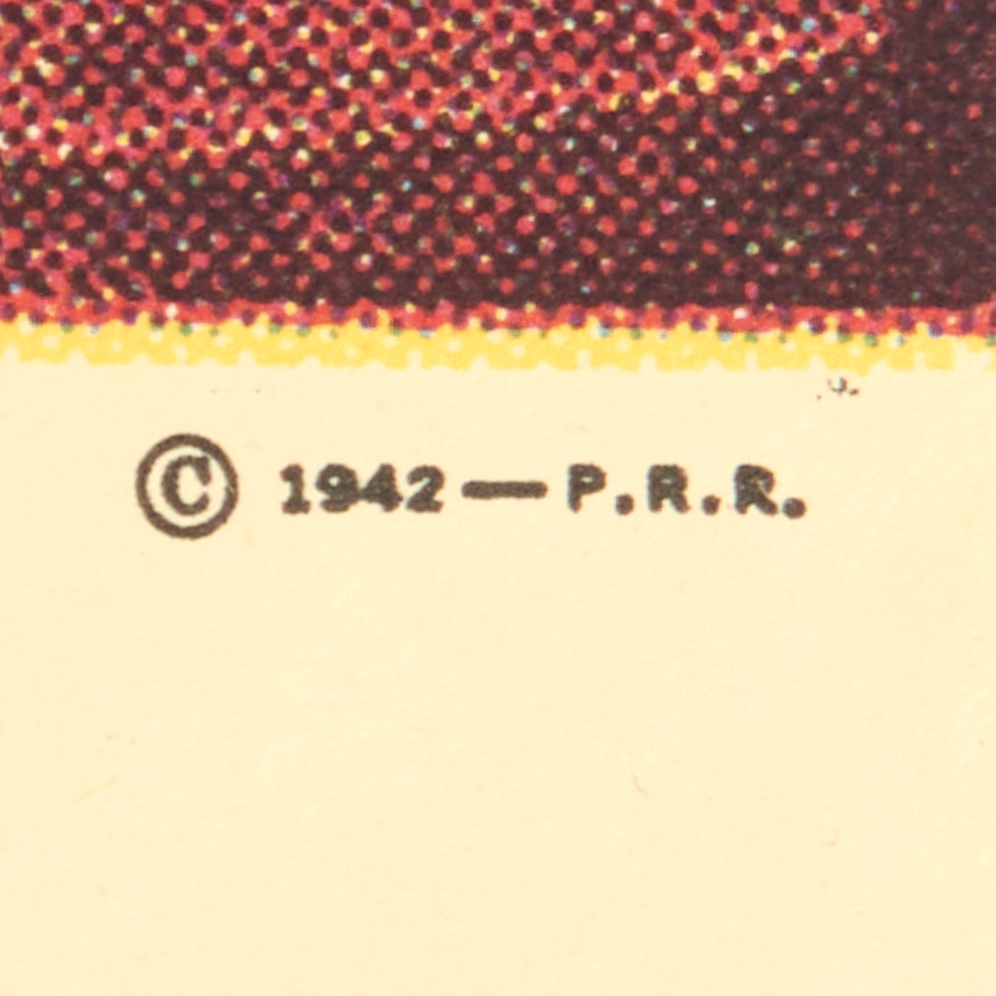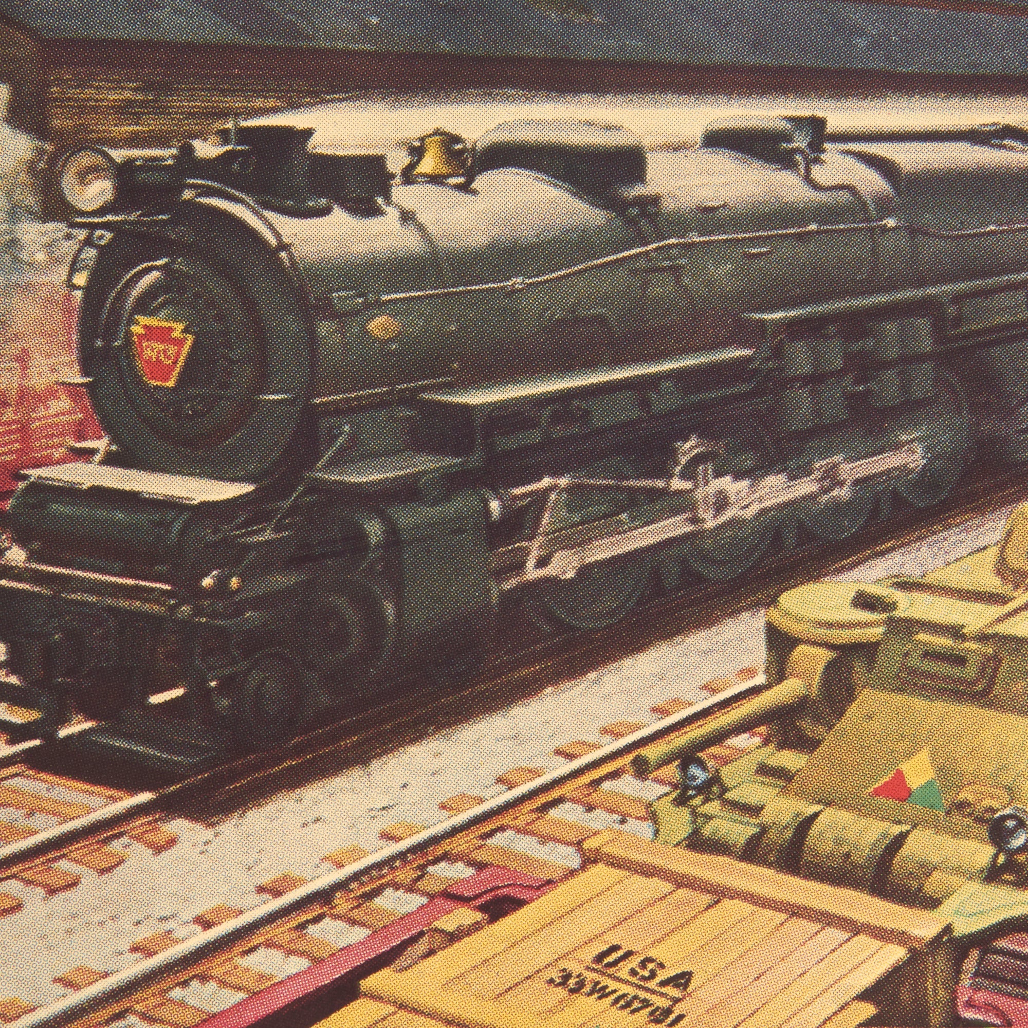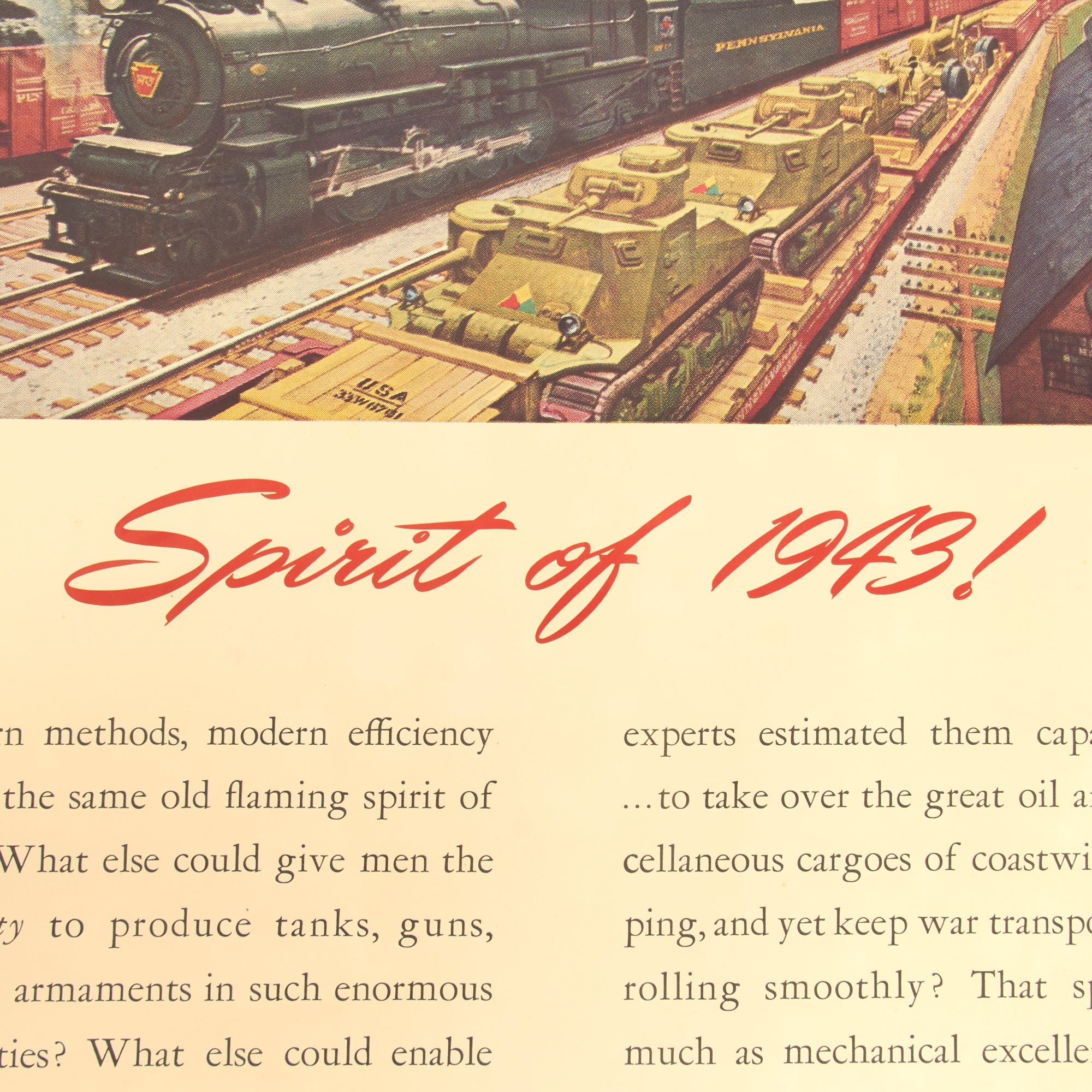 Original item: Only One Available. This is a rare 1942 dated poster sized version of the Pennsylvania Railroad Spirit of 1943 Uncle Sam Buy US War Bonds and Stamps propaganda advertisement. Typically this advertisement was run in magazine and newspapers and almost all original printed versions are of that smaller size format. However, this is a large format poster measuring 40 inches tall by 25 inches wide and was used at Pennsylvania rail road stations. Offered in very good condition with typical toning and edge wear.