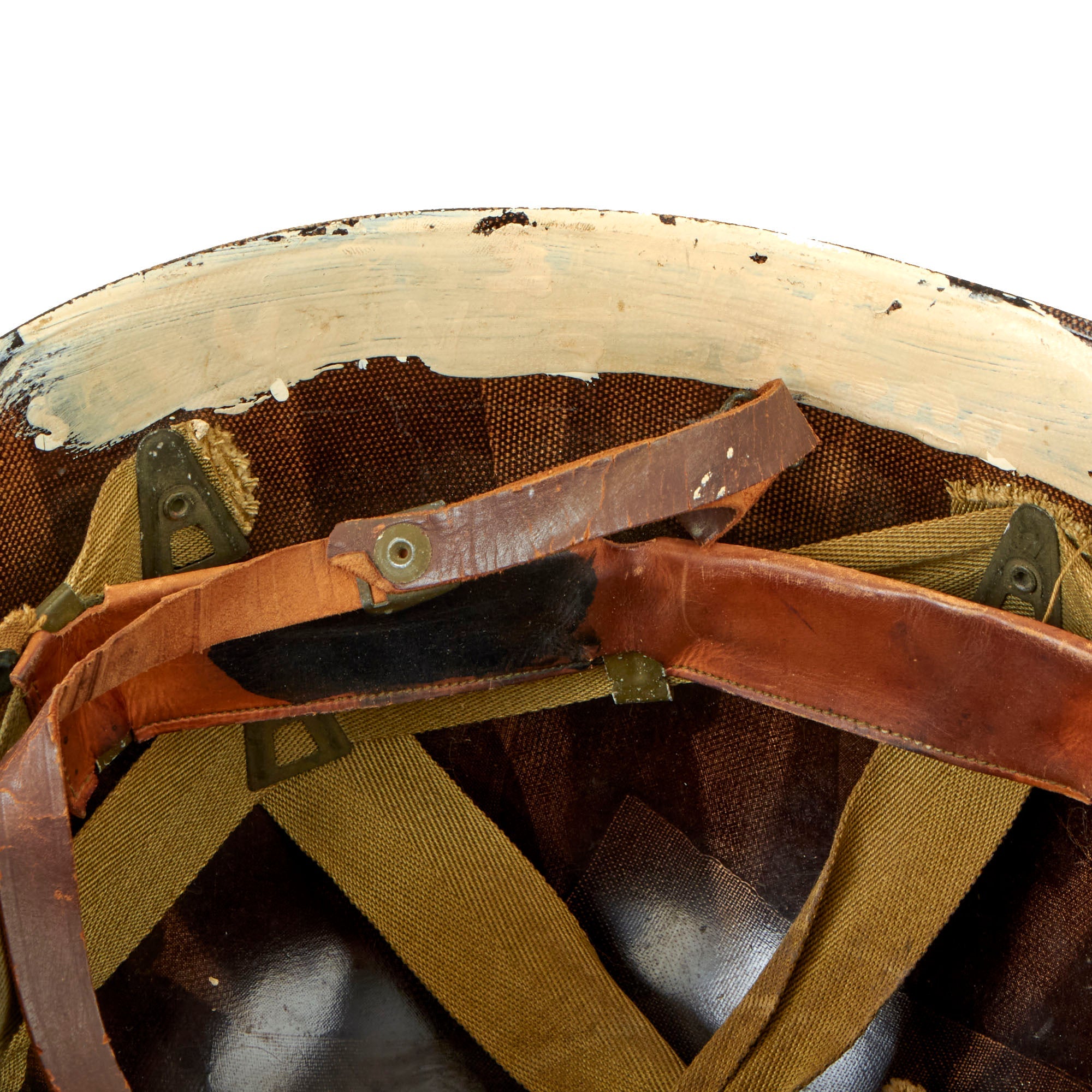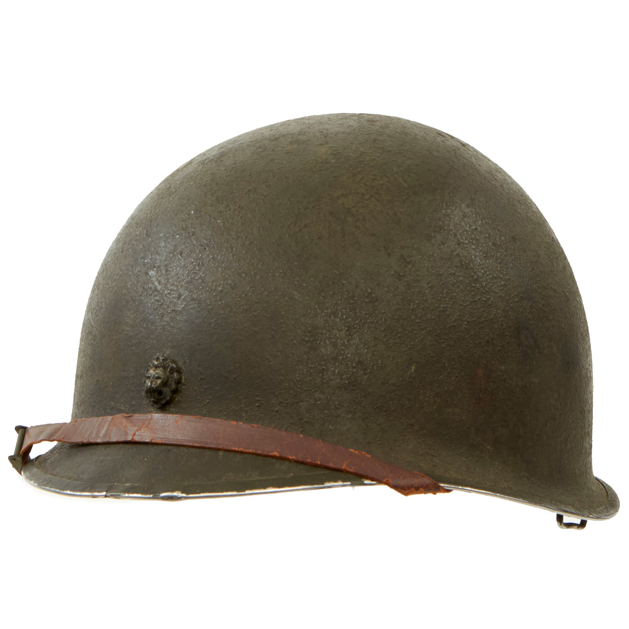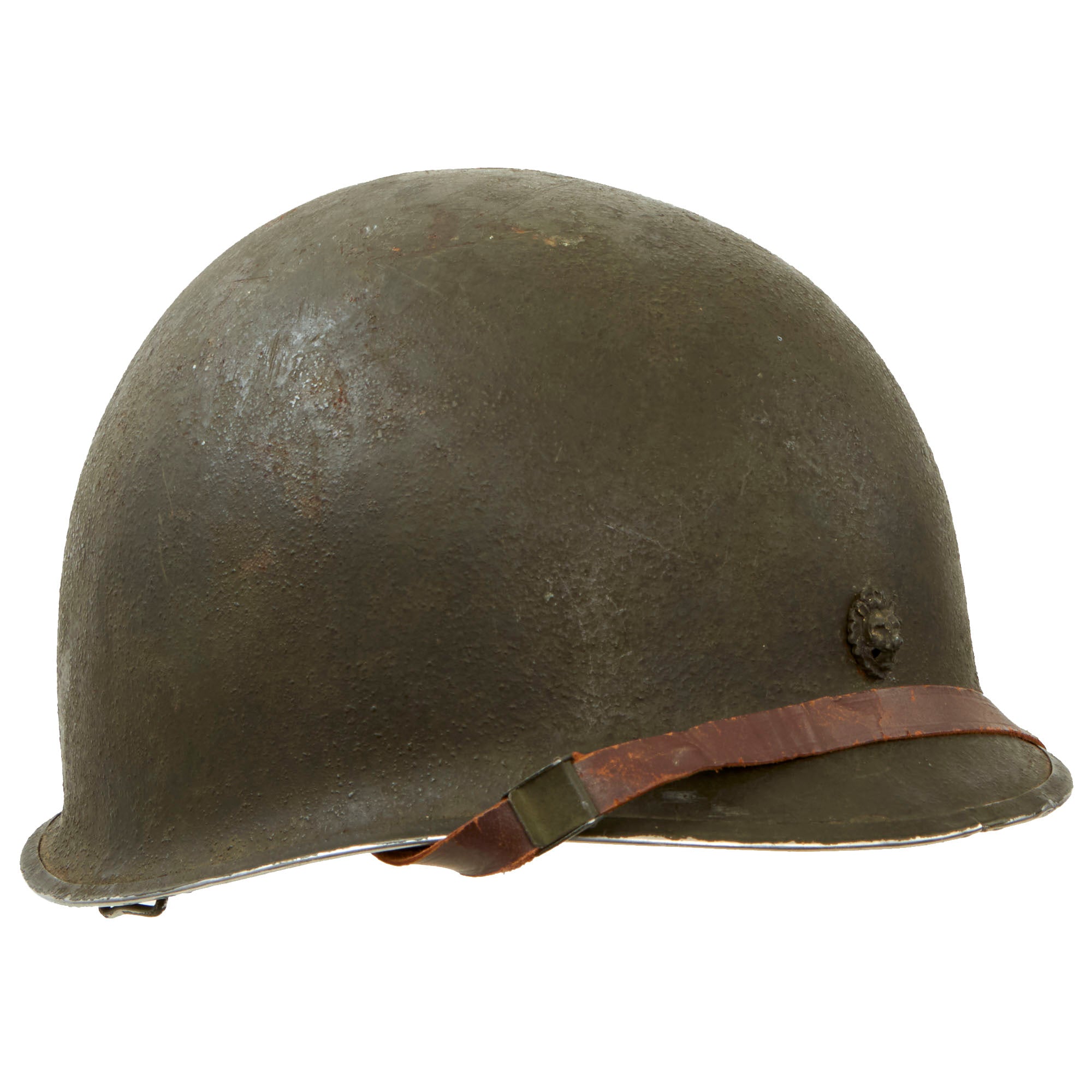 This true US WWII M-1 helmet liner can be identified through the frontal eyelet hole. Other correct WW2 features include cotton herringbone twill (HBT) cloth suspension. This HBT suspension is held tightly within the M-1 helmet liner by rivets and a series of triangular "A" washers. The three upper suspension bands are joined together with a shoestring. This way the wearer could adjust the fit. The sweatband is still present, and shows some staining from age and use. The shell chin strap is the correct "green buckle" type for WWII production, though the leather is definitely worn and cracked.