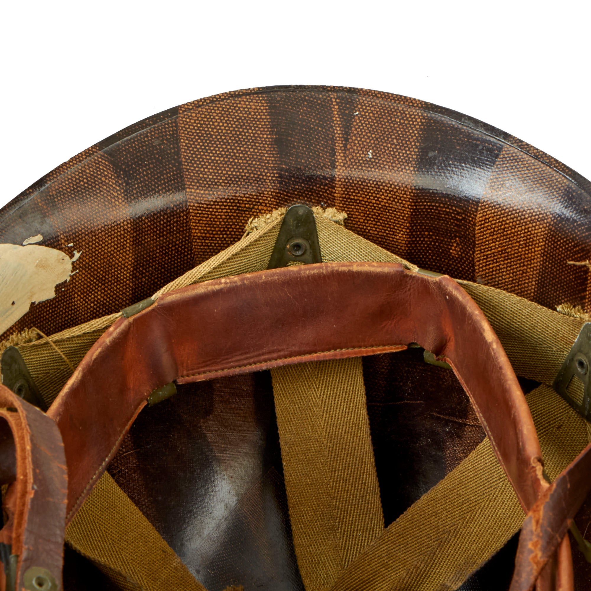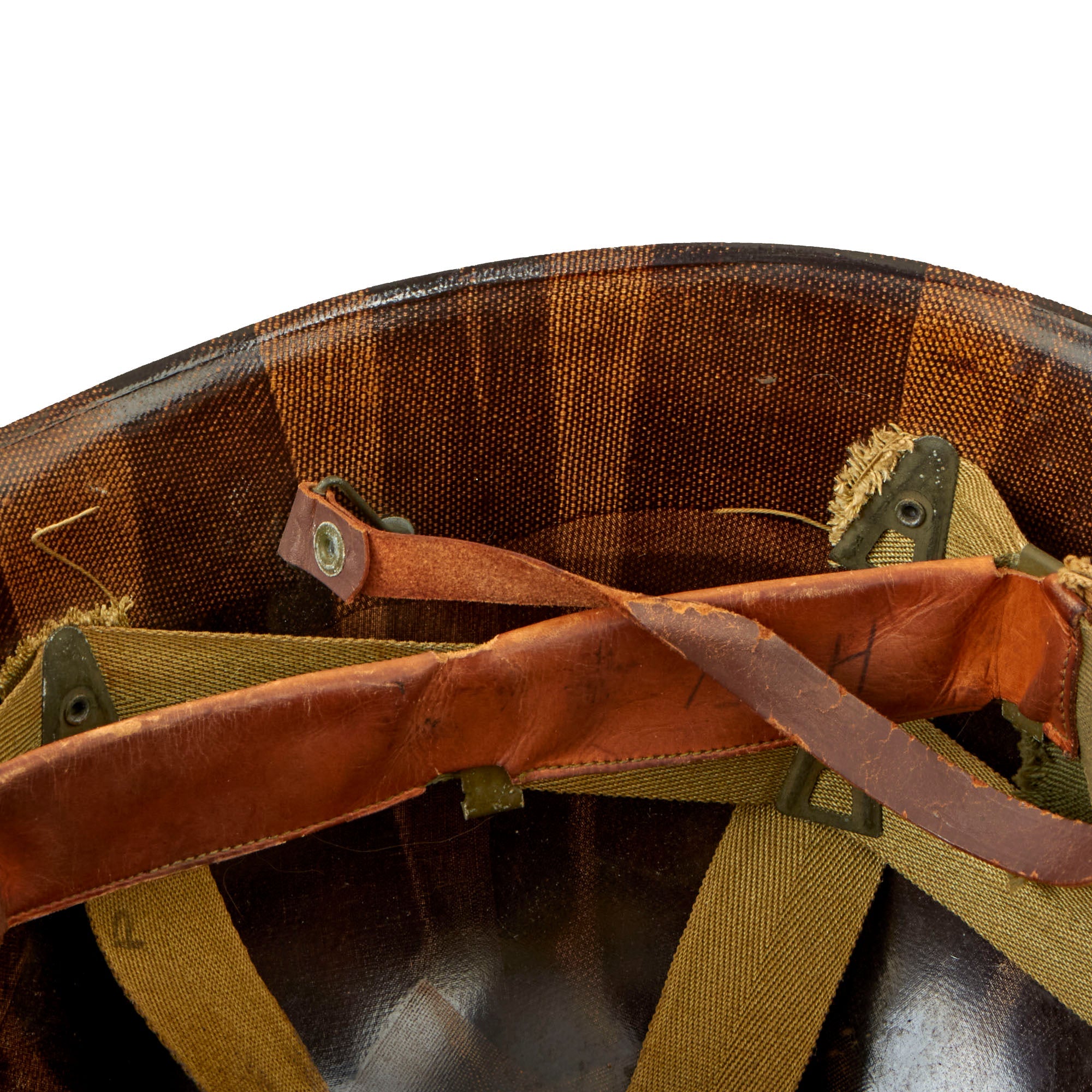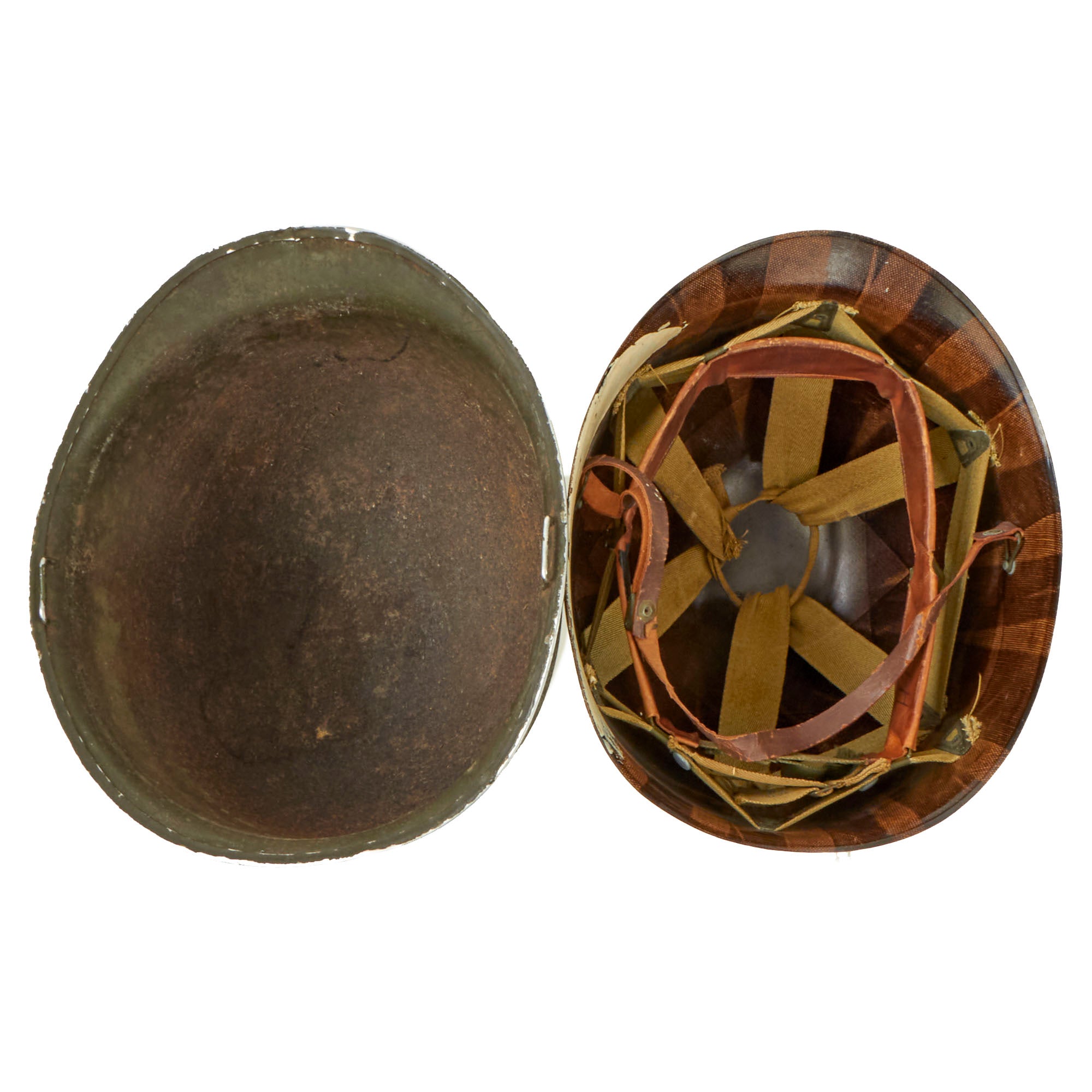 This true US WWII M-1 helmet liner can be identified through the frontal eyelet hole. Other correct WW2 features include cotton herringbone twill (HBT) cloth suspension. This HBT suspension is held tightly within the M-1 helmet liner by rivets and a series of triangular "A" washers. The three upper suspension bands are joined together with a shoestring. This way the wearer could adjust the fit. The sweatband is still present, and shows some staining from age and use. The shell chin strap is the correct "green buckle" type for WWII production, though the leather is definitely worn and cracked.