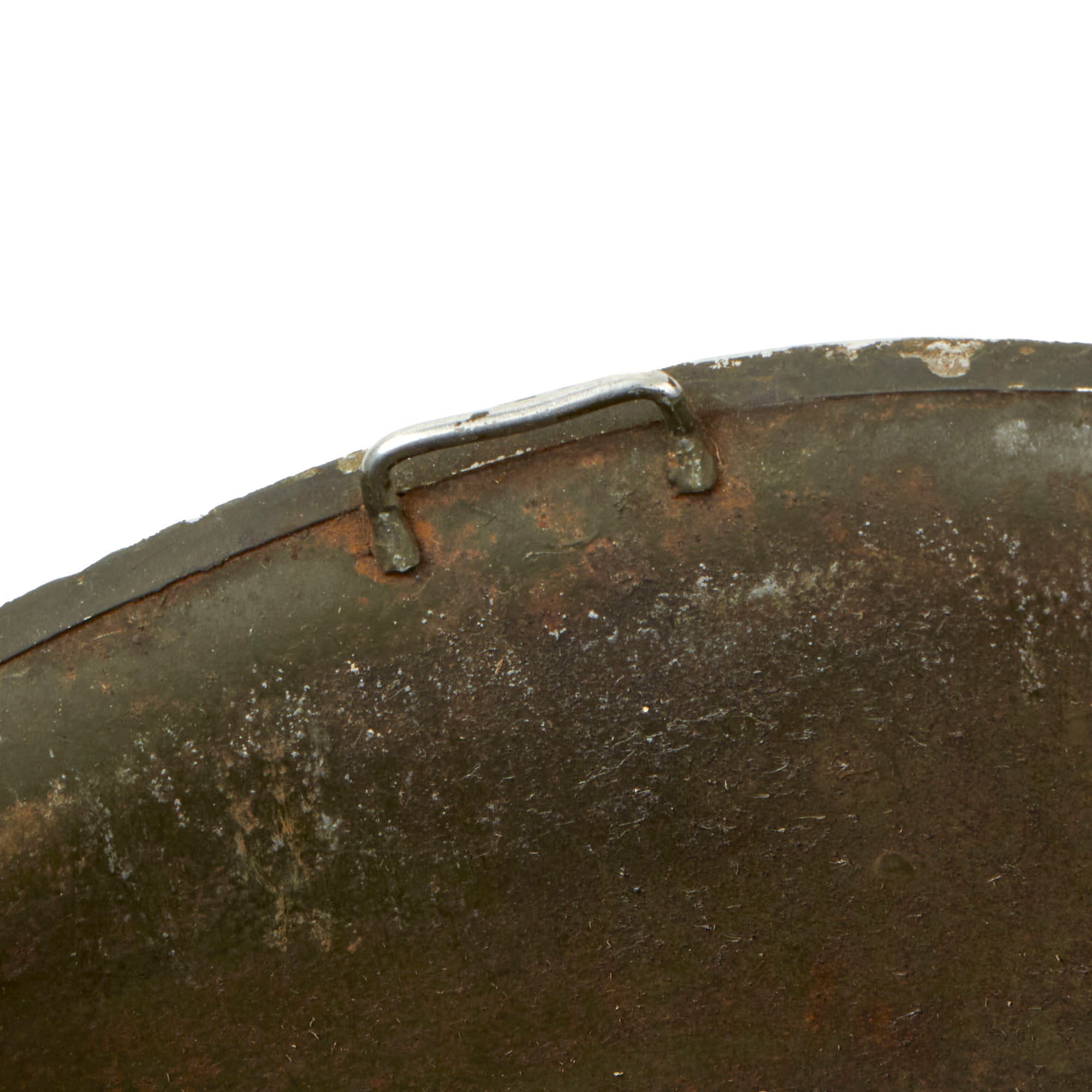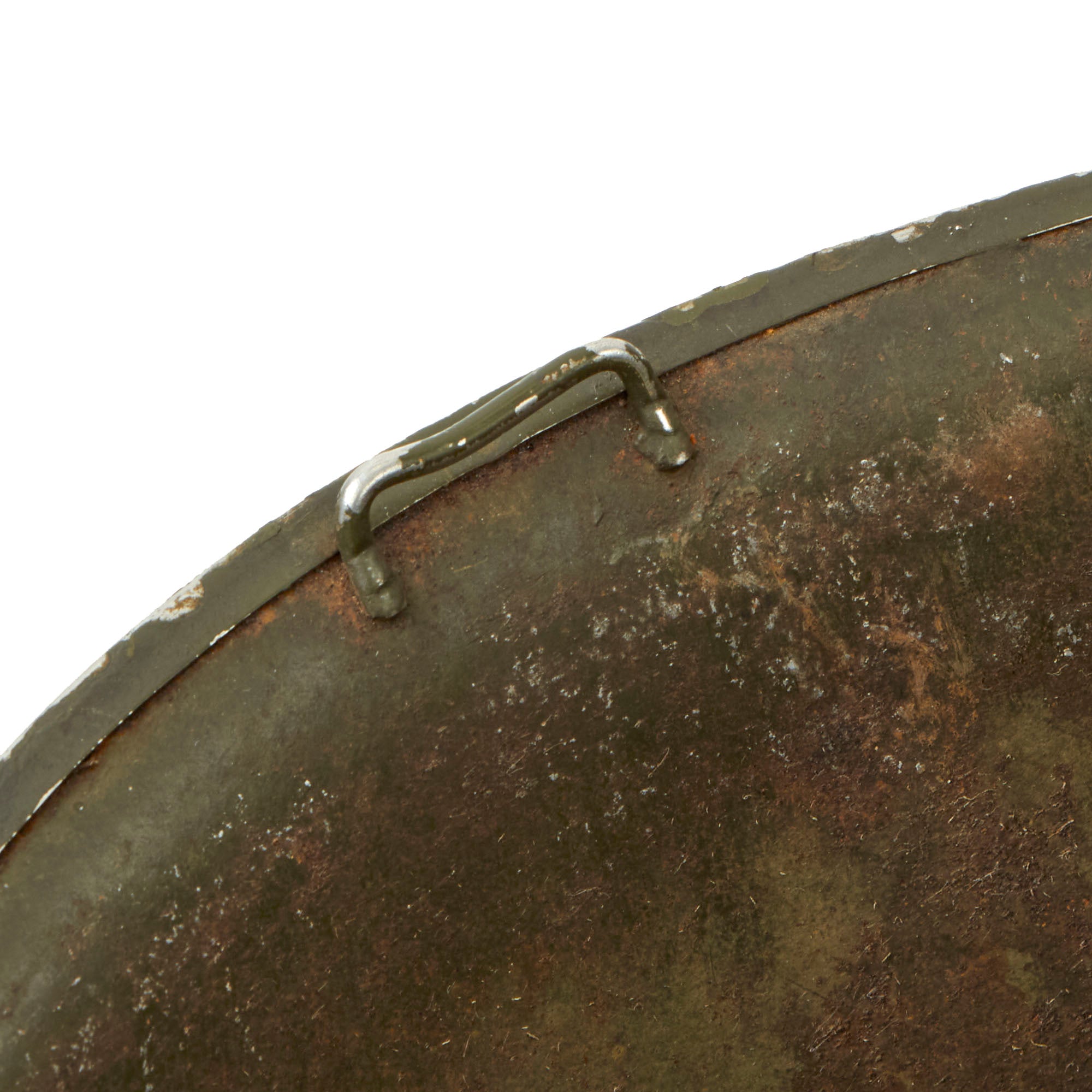 The early M-1 helmet shells had a set of fixed chinstrap loops called "bales" and a stainless steel rim. These rims were both rust resistant and had "non-magnetic qualities" that reduced the chance of error readings when placed around certain sensitive equipment (such as a compass). This helmet is a fine example and still retains many of its original WW2 parts and the shell has all original "corked" grain paint. It does look to have seen a good amount of wear, and the interior of the shell shows a lot of oxidation. The shell chin strap is also completely missing.