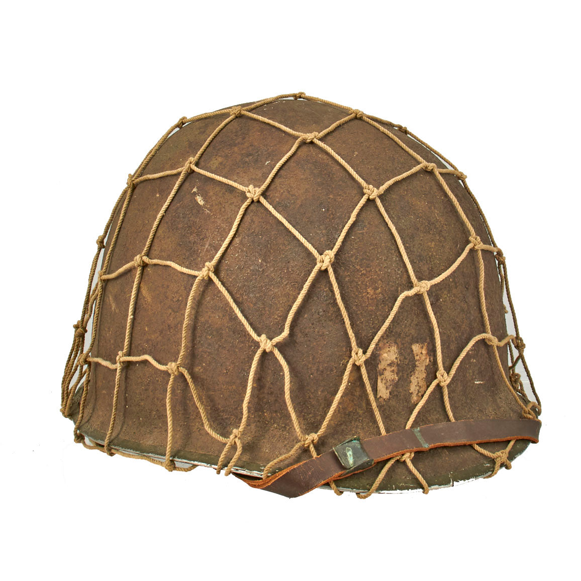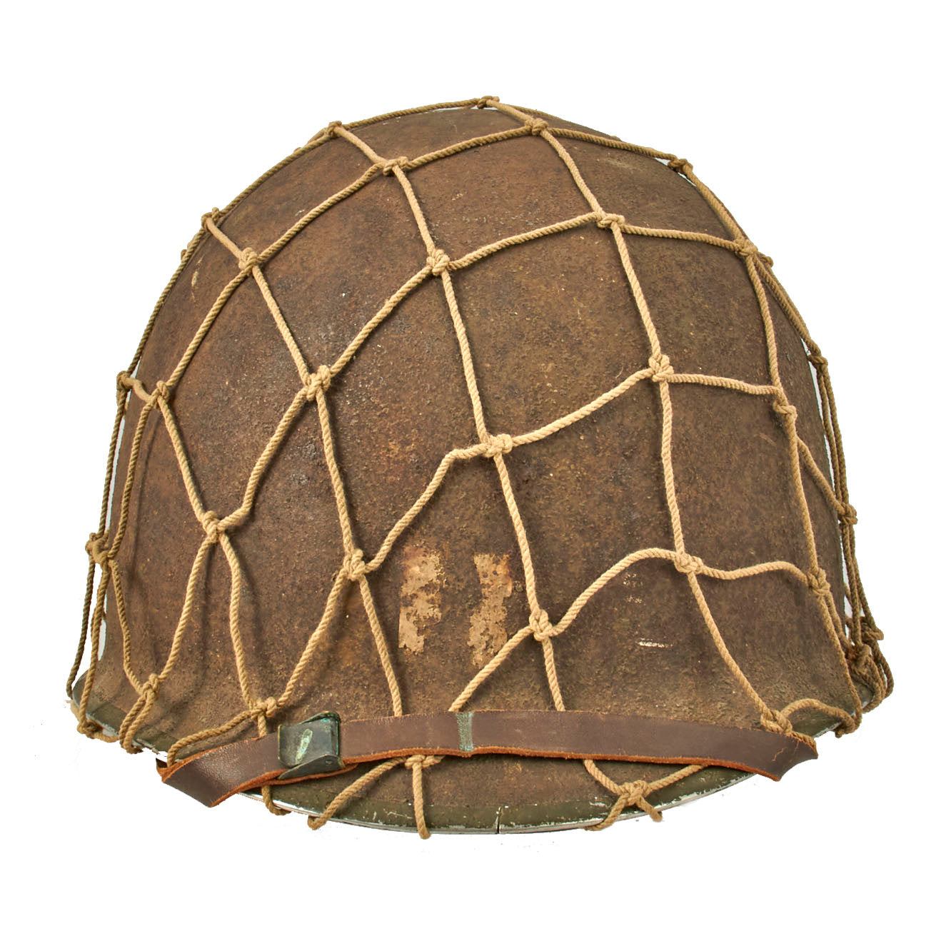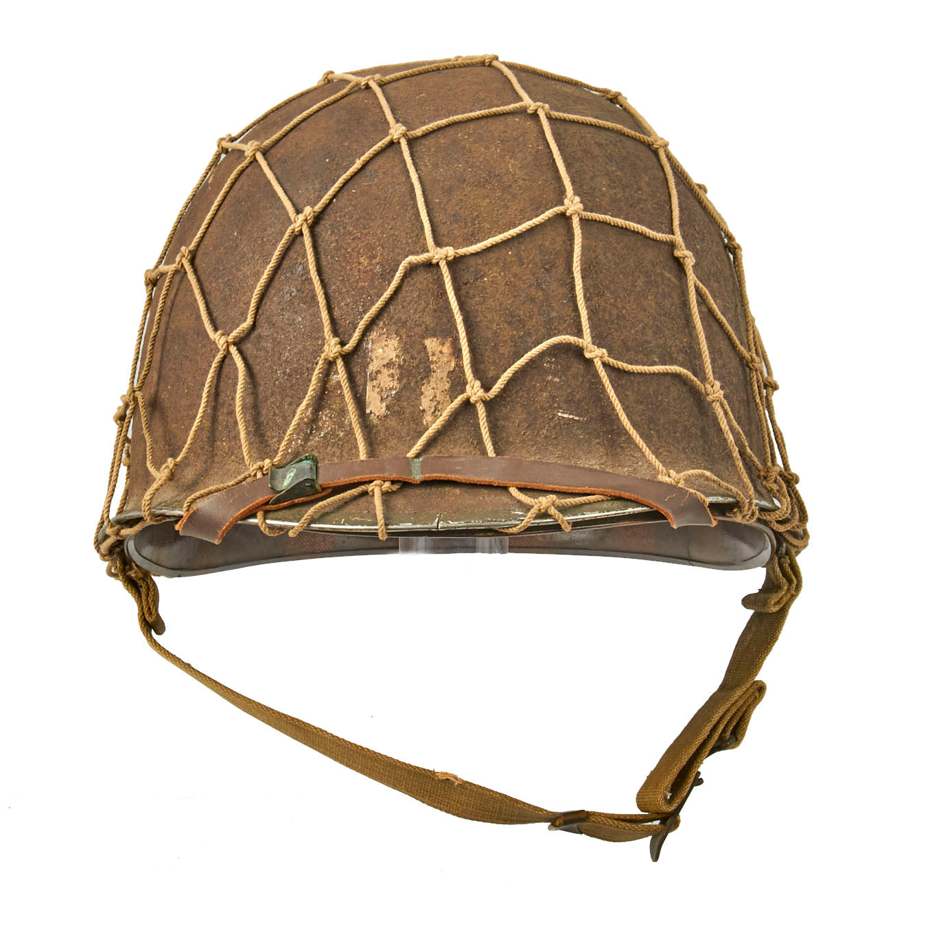 This helmet features the correct fixed bales which indicates pre-October 1943 manufacture as swivel bales began production around that time. The helmet still retains all of its original WWII parts with some light wear from service. The exterior still has the original "corked grain" OD Green paint retained well, with areas of light wear. The shell strap is the correct OD Green #3 from a mid war helmet, with a stamped blackened brass buckle. It shows only light wear, and is really in great shape. The net is section cut from a GI Vehicle net, which was quite popular with the troops during WWII.