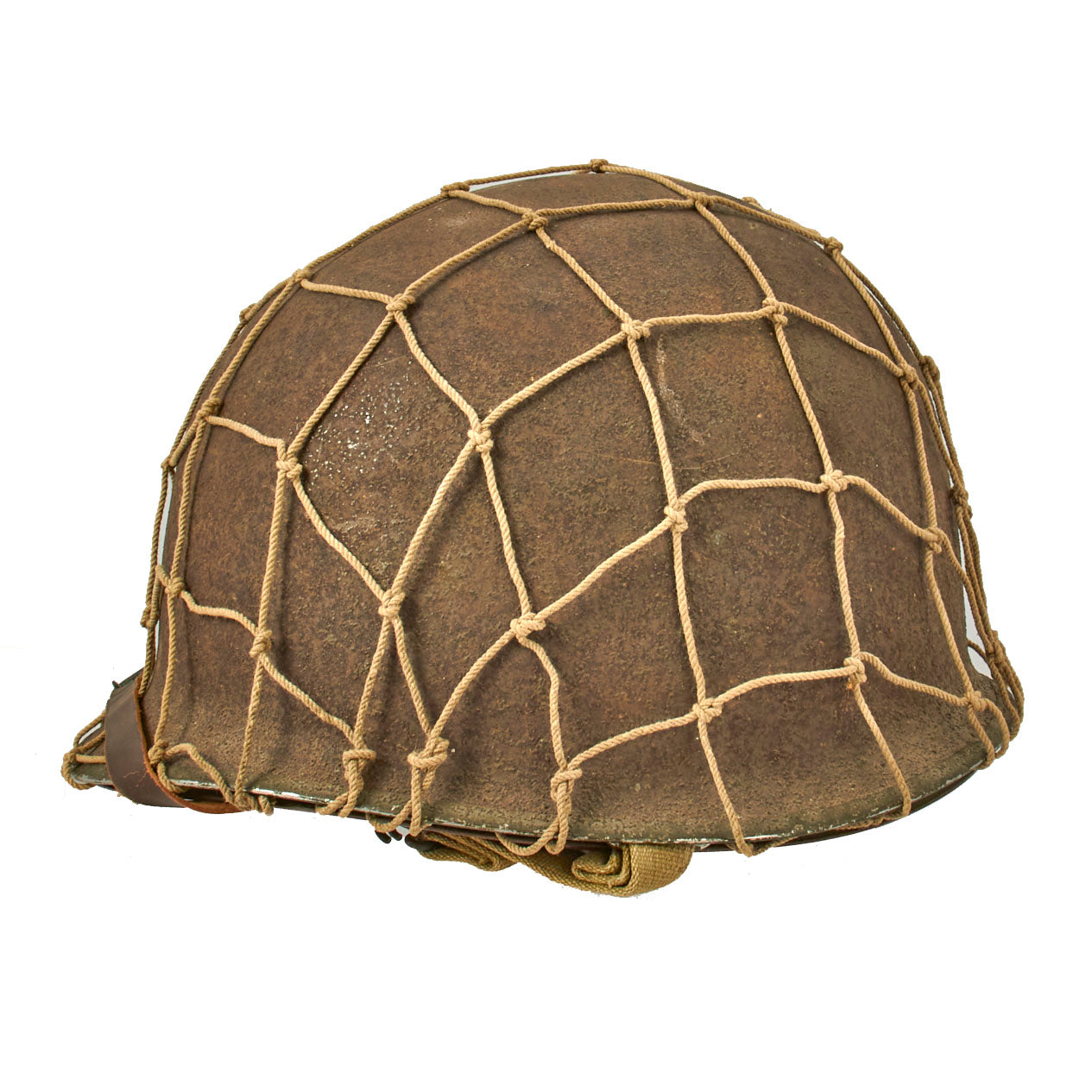 Original Item: Only One Available. This is a very nice example of a 1943 or earlier WWII M1 Helmet with original Captain’s rank painted, complete with original khaki chinstraps with blackened brass hardware, Foliage net, and its original Westinghouse liner. Interestingly, The liner has a lieutenant’s rank on the front, indicating that the lieutenant was most likely promoted to Captain and had not gotten around to changing the rank on the liner. These pieces have been together a long time! This is one of the more attractive WWII US helmets we have had the pleasure of offering in recent years!