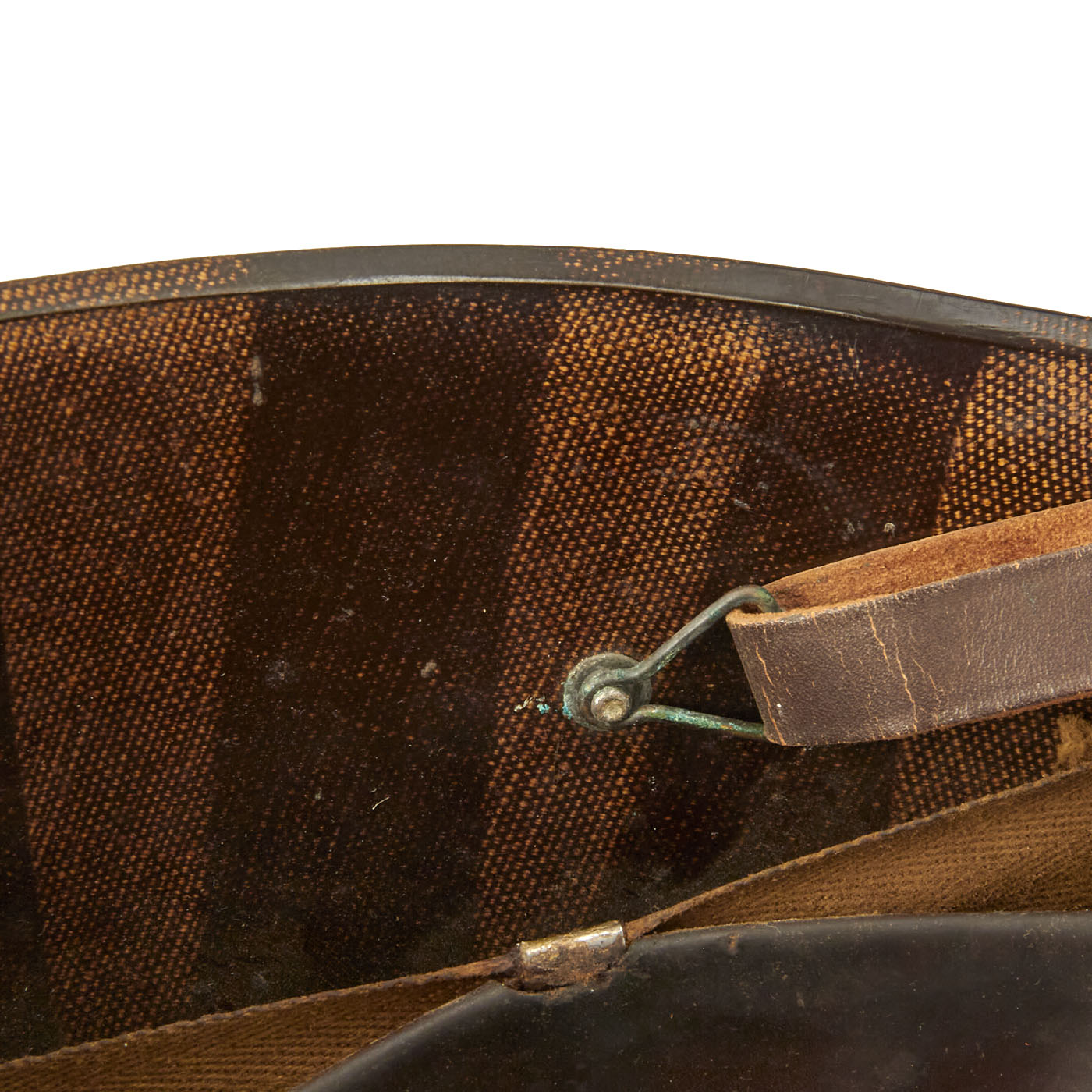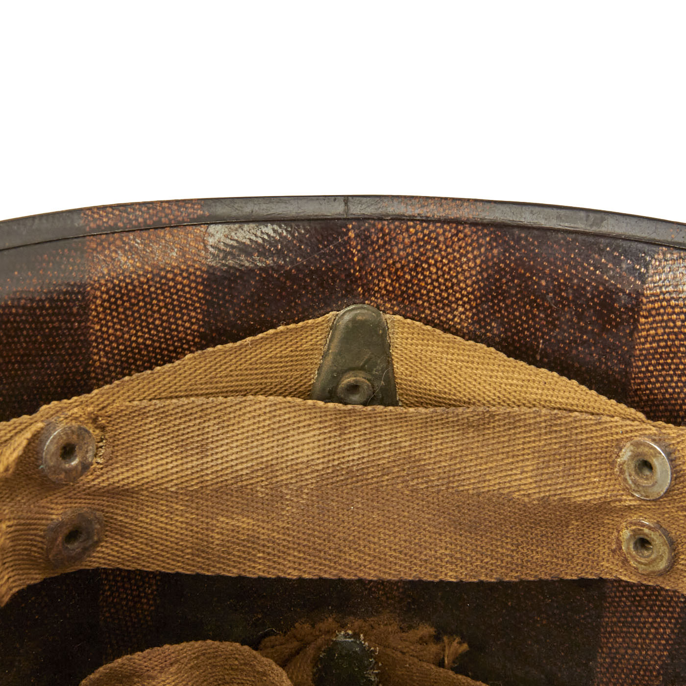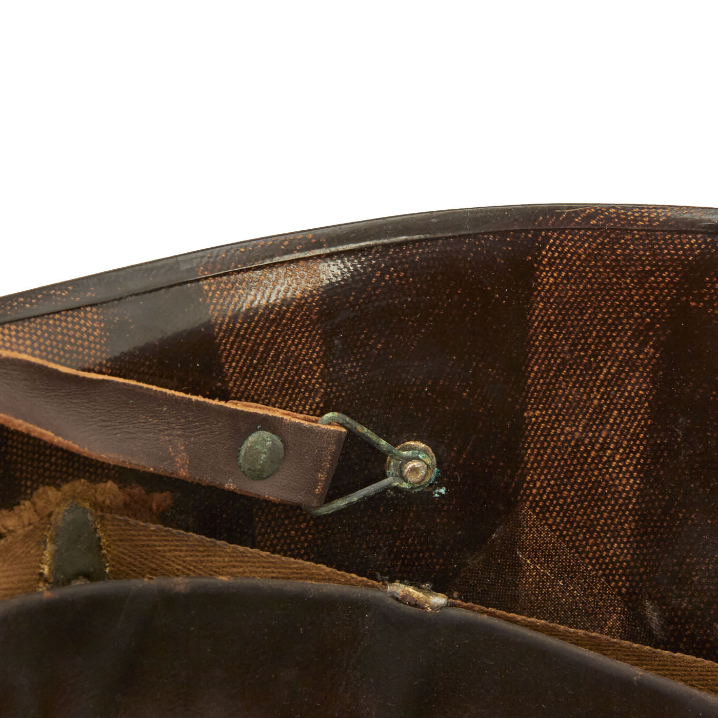 The liner is the correct “high pressure” WWII issue and stamped with an “W Circle” logo, which was the product stamp for Westinghouse. This true US WWII M-1 helmet liner be identified through the frontal eyelet hole. Other correct WWII features include cotton OD Green #3 herringbone twill (HBT) cloth suspension liner, with the webbing in worn condition, with some areas having small tears. This HBT suspension is held tightly within the M-1 helmet liner by rivets and a series of triangular green-painted "A" washers. The three upper suspension bands are joined together with the correct OD green string. This way the wearer could adjust the fit. The sweatband shows wear from honest use (sweat and grime). The liner chin strap is present, and is unbroken and slightly dry. The front of the liner features the name “Thompson” affixed to the front by the means of individually cut and pasted letters, along with a 1st Lieutenant’s Bar above. This is definitely a liner that saw use during the war, and looks to have been exposed to dirt and moisture during service, and possibly afterwards. We have left this intact to preserve the wonderful "service worn" look that the interior has.