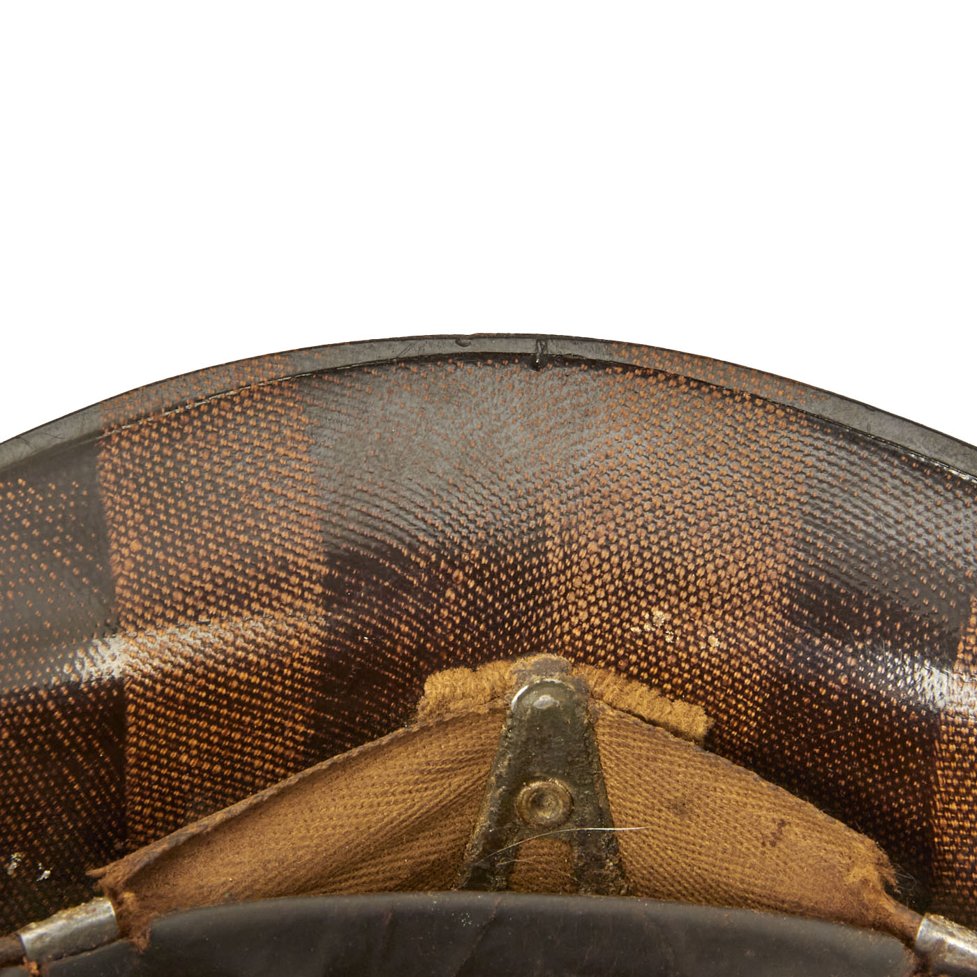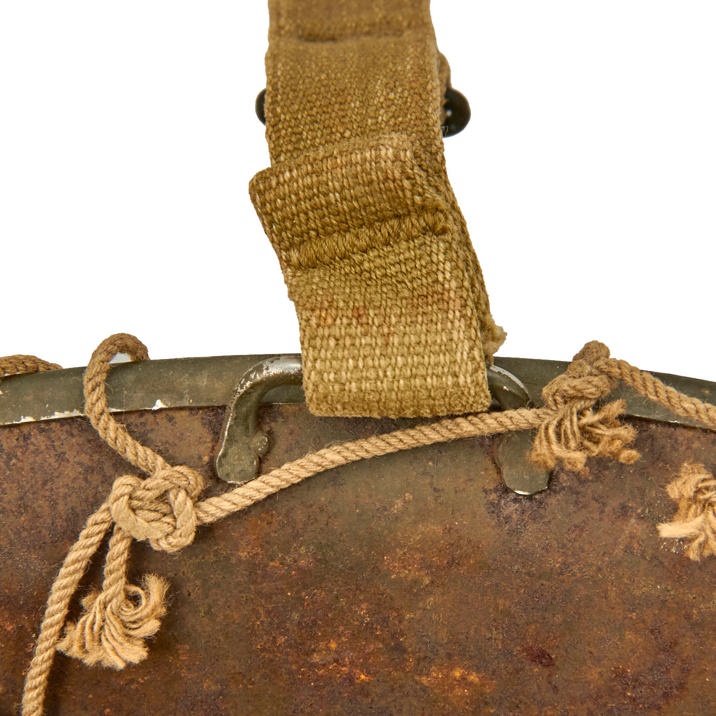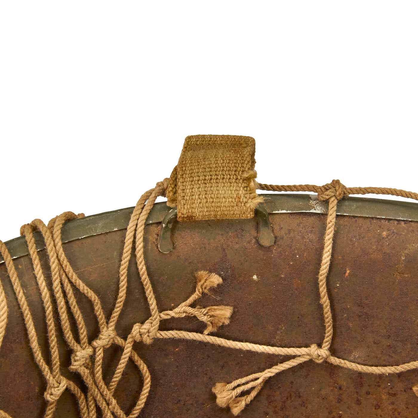 The liner is the correct “high pressure” WWII issue and stamped with an “W Circle” logo, which was the product stamp for Westinghouse. This true US WWII M-1 helmet liner be identified through the frontal eyelet hole. Other correct WWII features include cotton OD Green #3 herringbone twill (HBT) cloth suspension liner, with the webbing in worn condition, with some areas having small tears. This HBT suspension is held tightly within the M-1 helmet liner by rivets and a series of triangular green-painted "A" washers. The three upper suspension bands are joined together with the correct OD green string. This way the wearer could adjust the fit. The sweatband shows wear from honest use (sweat and grime). The liner chin strap is present, and is unbroken and slightly dry. The front of the liner features the name “Thompson” affixed to the front by the means of individually cut and pasted letters, along with a 1st Lieutenant’s Bar above. This is definitely a liner that saw use during the war, and looks to have been exposed to dirt and moisture during service, and possibly afterwards. We have left this intact to preserve the wonderful "service worn" look that the interior has.