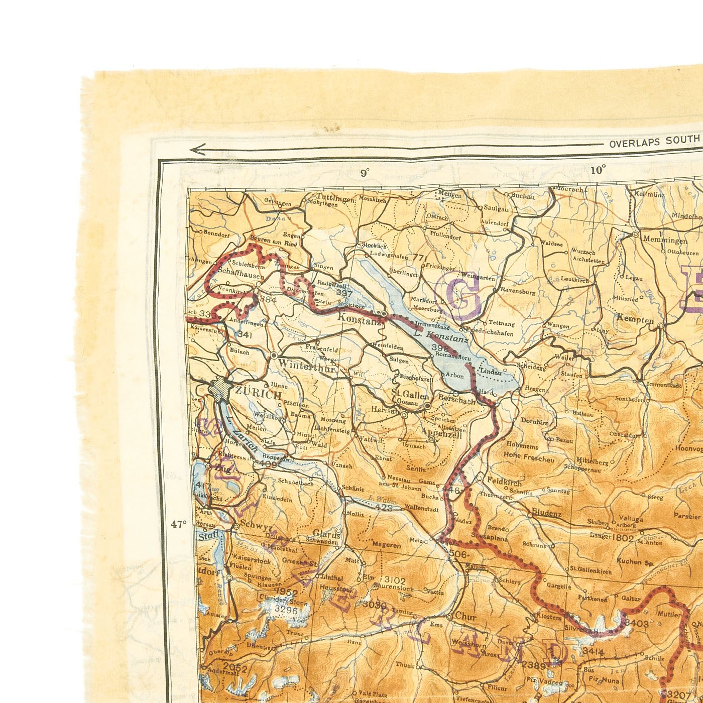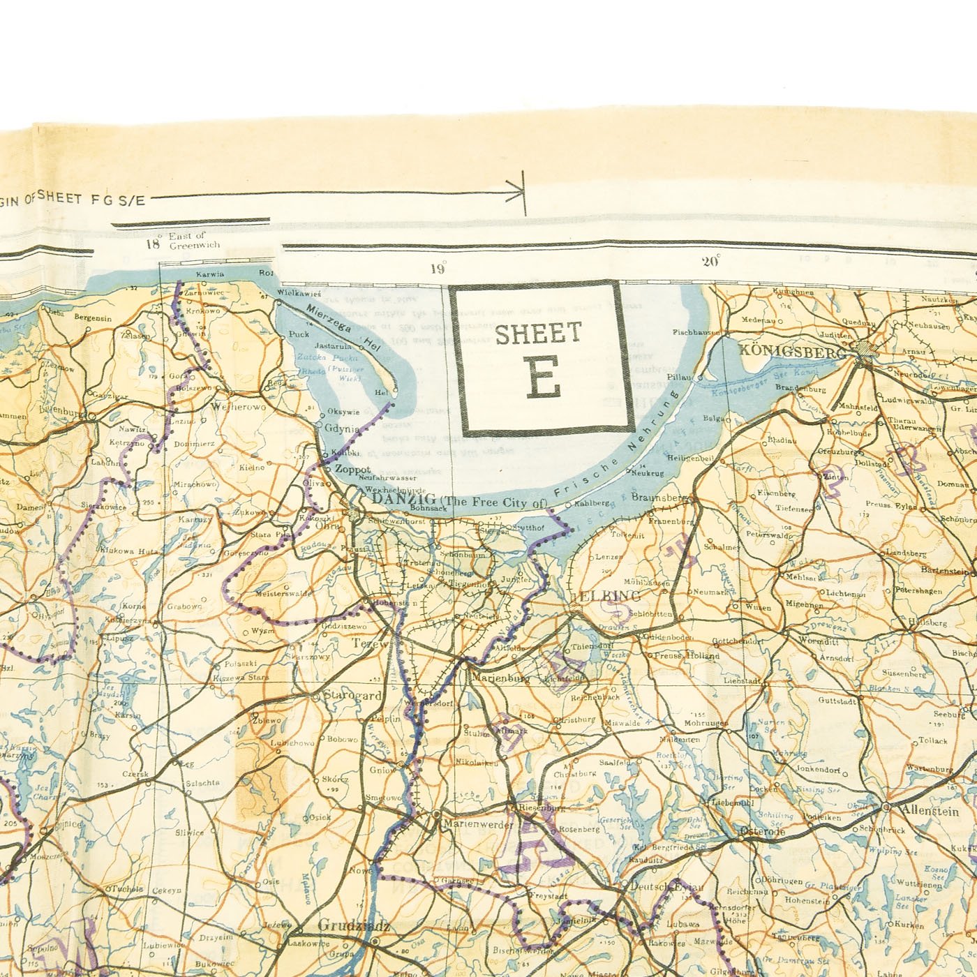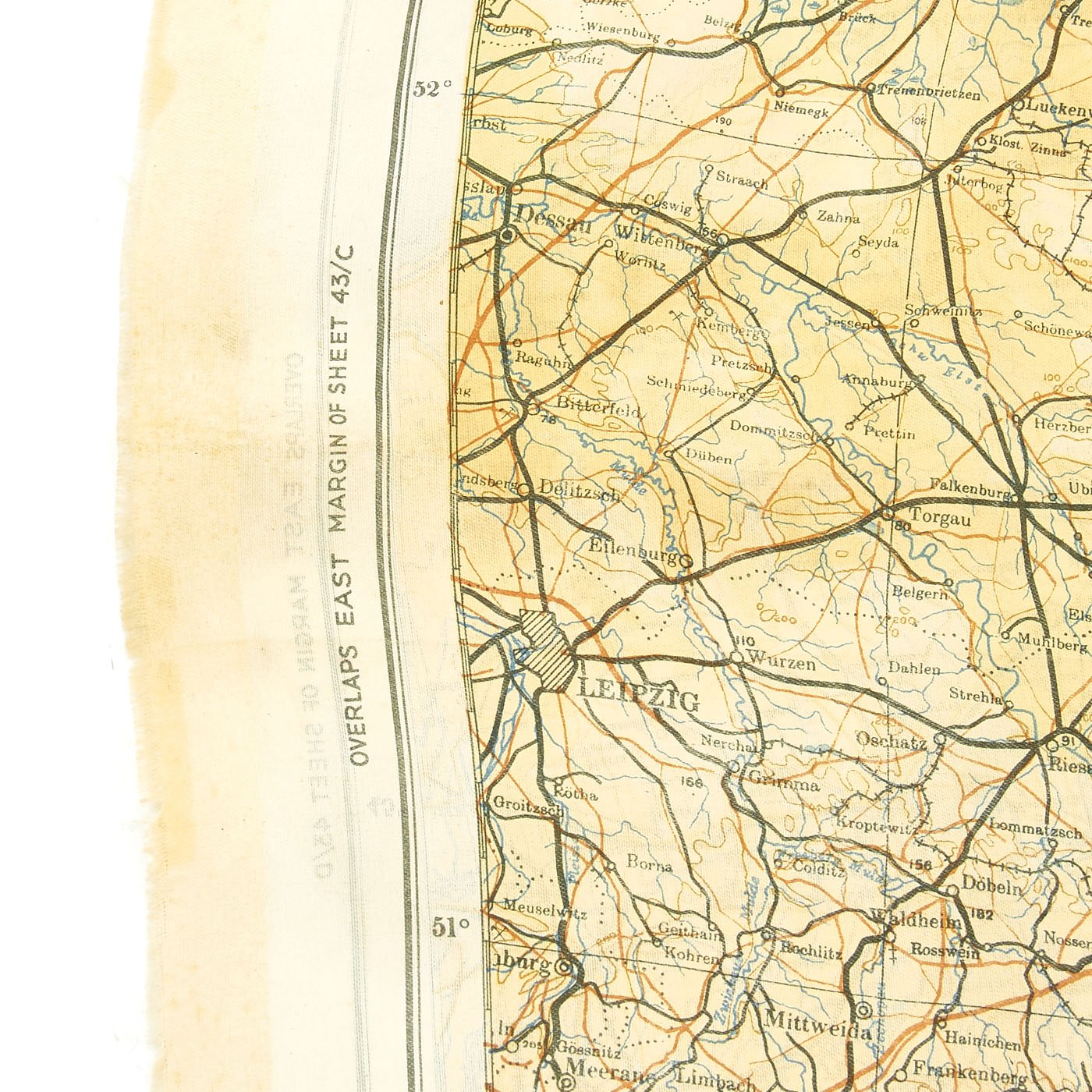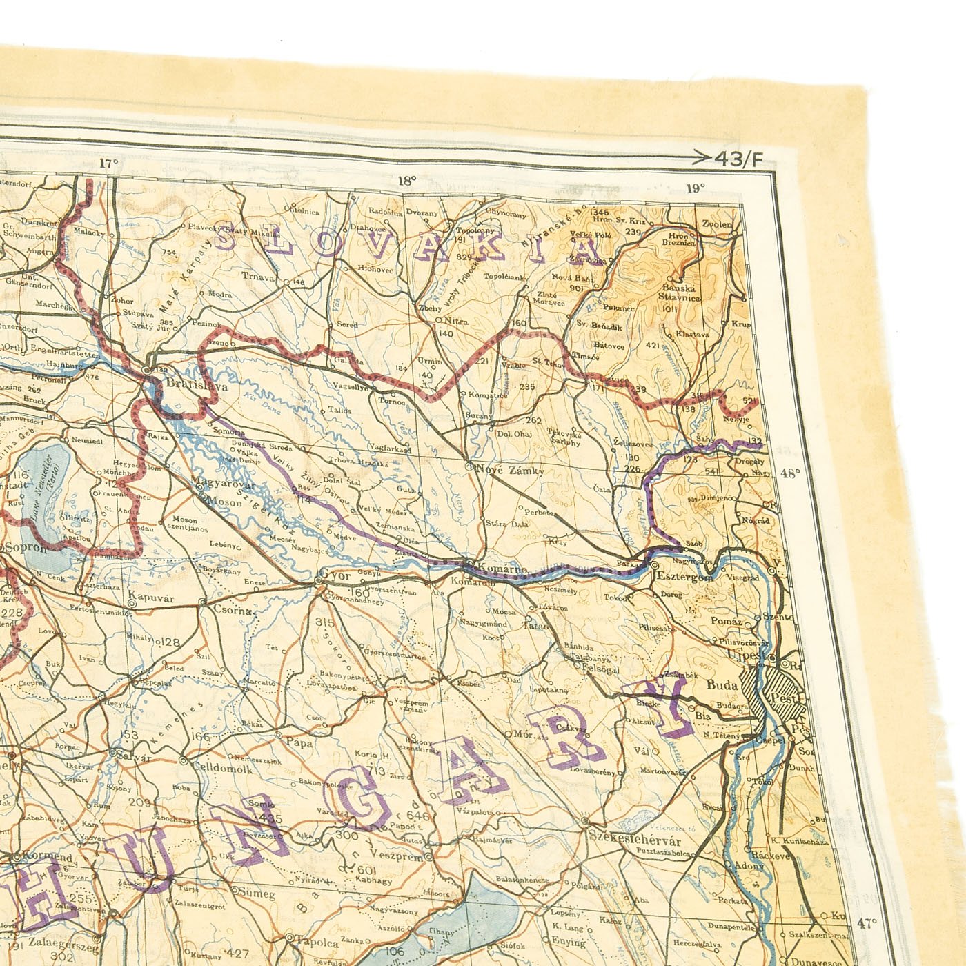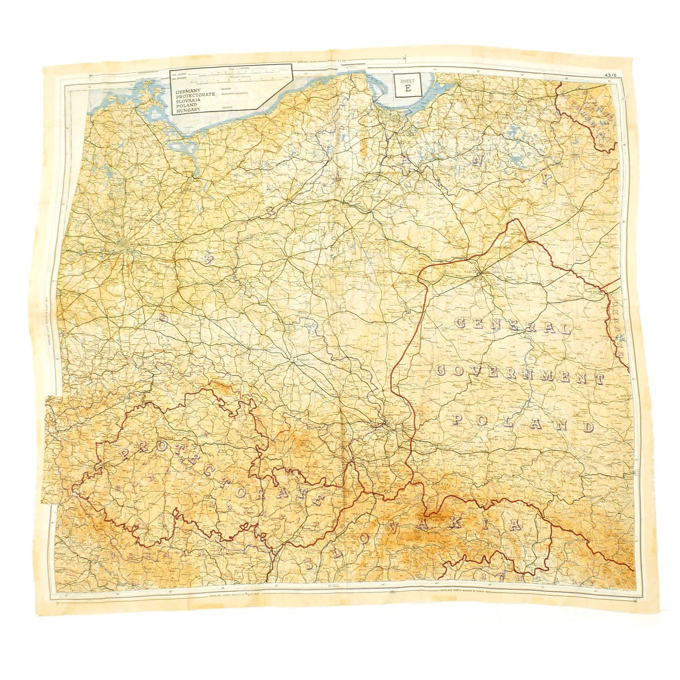 Original Item: Only One Available. In 1943 a series of cloth escape maps were produced that are immediately recognized by their vivid colors. These maps are of the European Theater and were issued to Allied pilots of the US, RAF, and RCAF. Printed by the company of John Waddington, Ltd, the maps consist of eight colors and are primarily at a scale of 1:1,000,000 with larger scale inserts. There are ten sheets in this series, which are composites of various paper sheets of the then existing International Map of the World, unlike the previous escape maps which were exact copies of existing paper sheets. The sheets are numbered with the prefix 43 followed by one of the upper case letters: A, B, C, D, E, F, G, H, and K (east) and K (west). When all the maps are laid out they basically overlap to provide a complete map of Europe. The maps were usually printed on both sides, although single-side versions exist. Normally, the maps were printed sequentially--A on one side and B on the other side; C on one side and D on the other side--although that was not always the case. For example, maps with C on one side and E on the other side are also occasionally found.