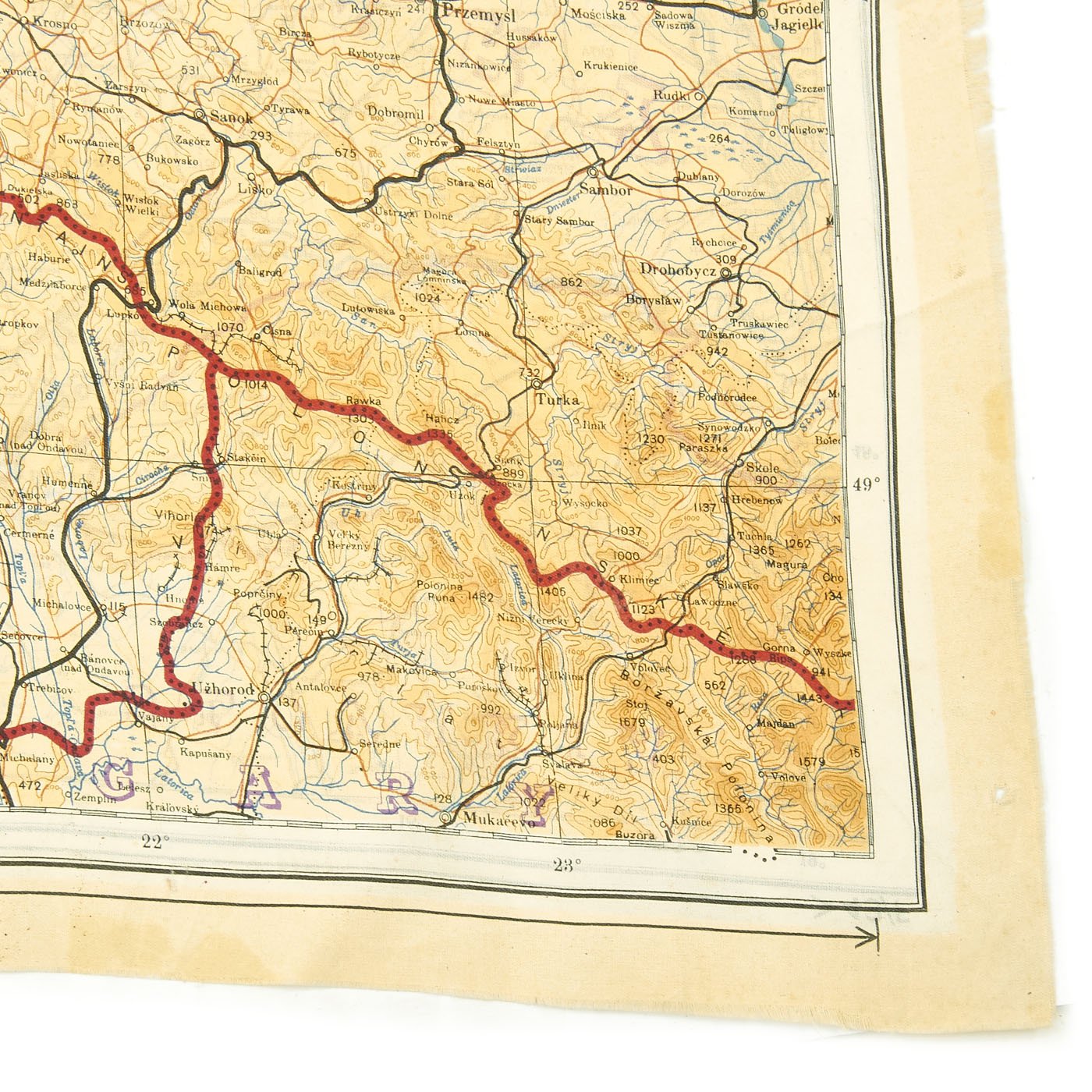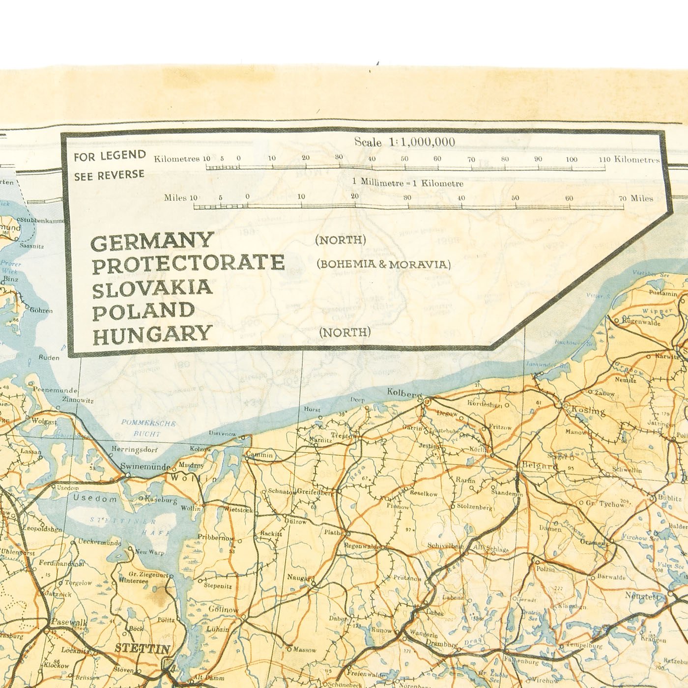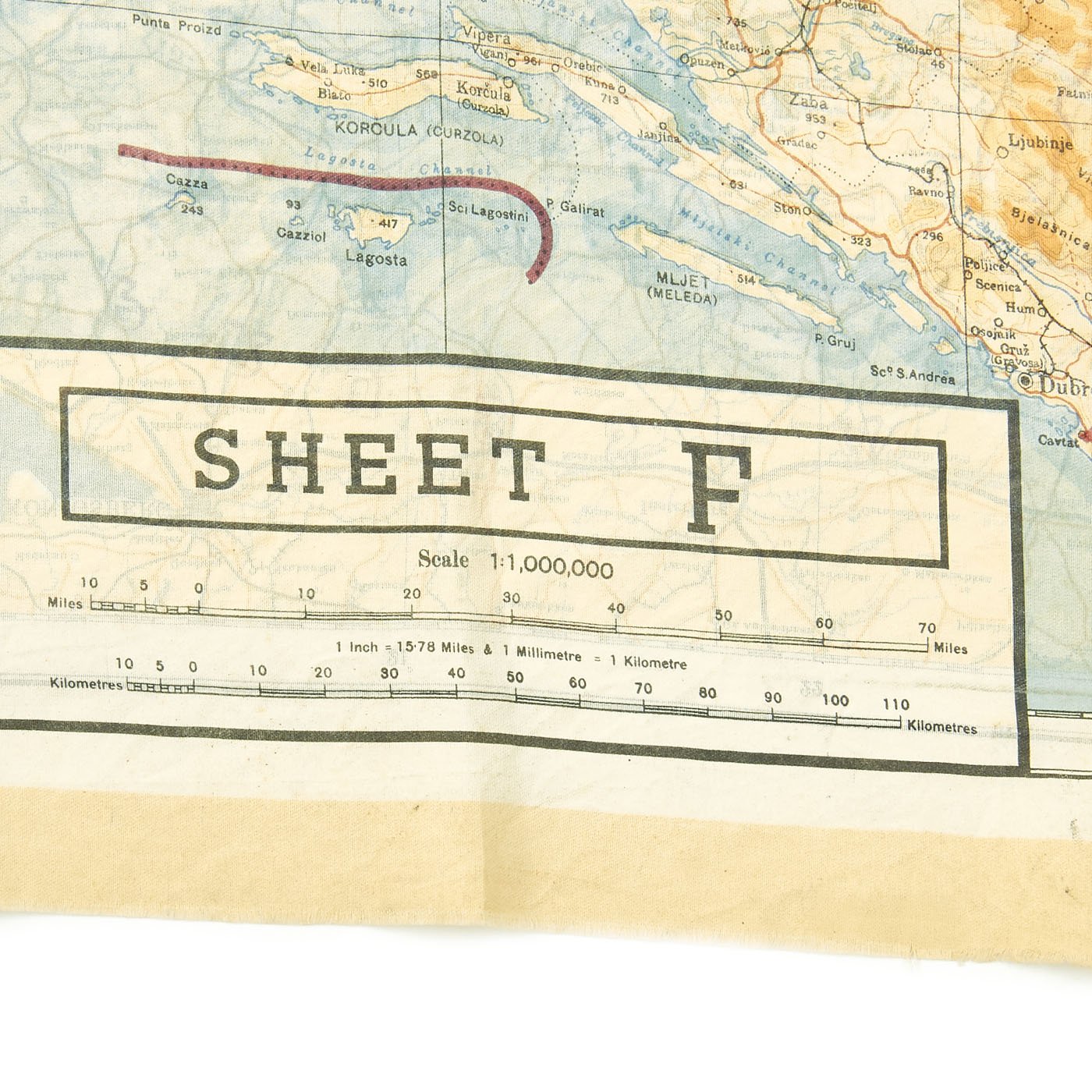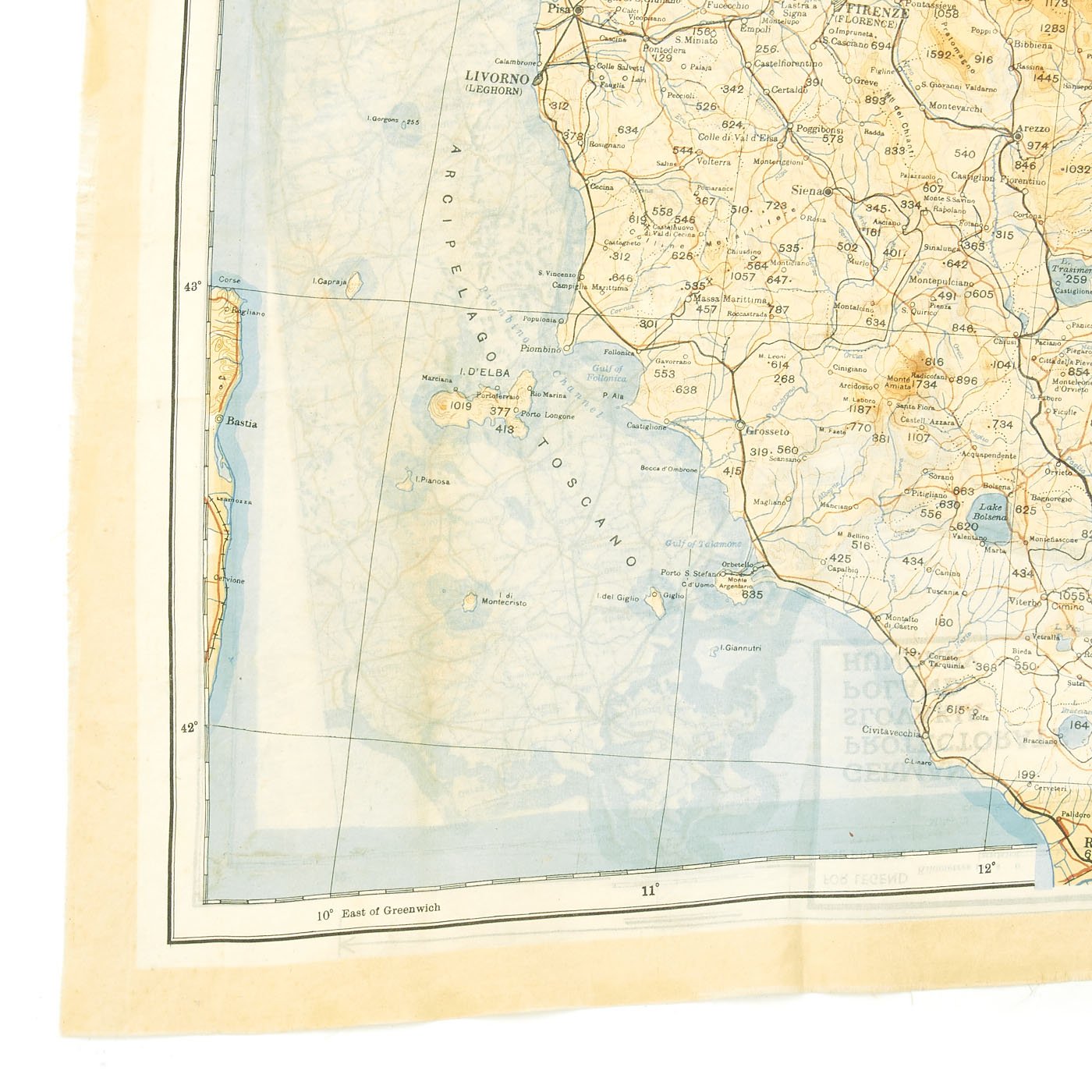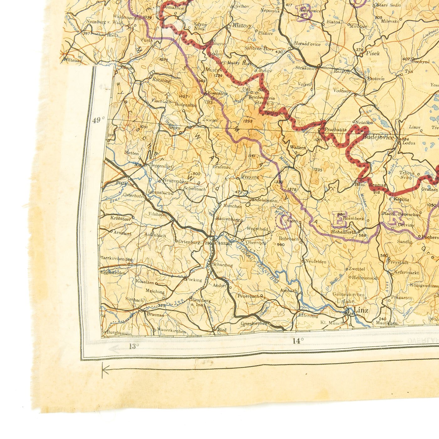 Original Item: Only One Available. In 1943 a series of cloth escape maps were produced that are immediately recognized by their vivid colors. These maps are of the European Theater and were issued to Allied pilots of the US, RAF, and RCAF. Printed by the company of John Waddington, Ltd, the maps consist of eight colors and are primarily at a scale of 1:1,000,000 with larger scale inserts. There are ten sheets in this series, which are composites of various paper sheets of the then existing International Map of the World, unlike the previous escape maps which were exact copies of existing paper sheets. The sheets are numbered with the prefix 43 followed by one of the upper case letters: A, B, C, D, E, F, G, H, and K (east) and K (west). When all the maps are laid out they basically overlap to provide a complete map of Europe. The maps were usually printed on both sides, although single-side versions exist. Normally, the maps were printed sequentially--A on one side and B on the other side; C on one side and D on the other side--although that was not always the case. For example, maps with C on one side and E on the other side are also occasionally found.