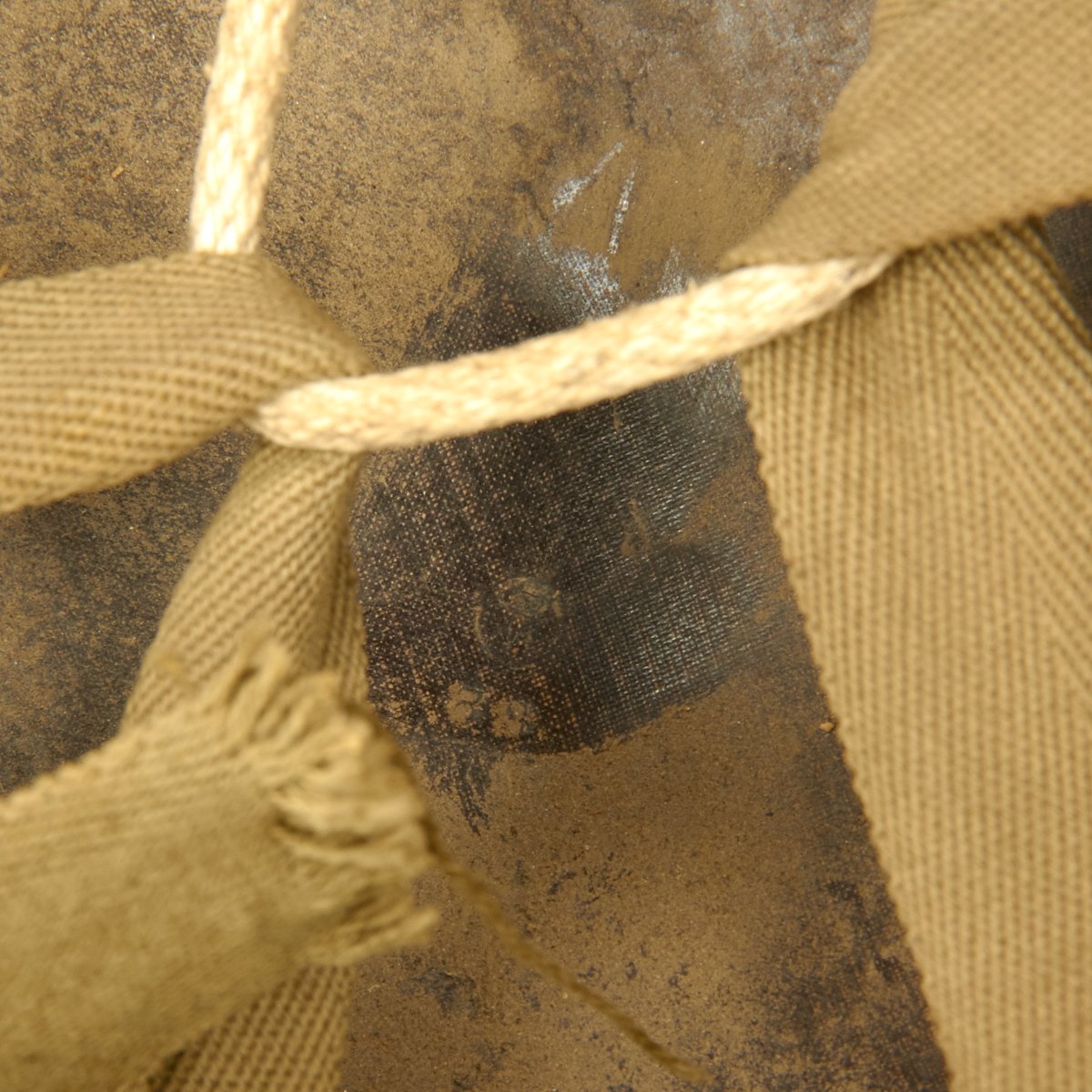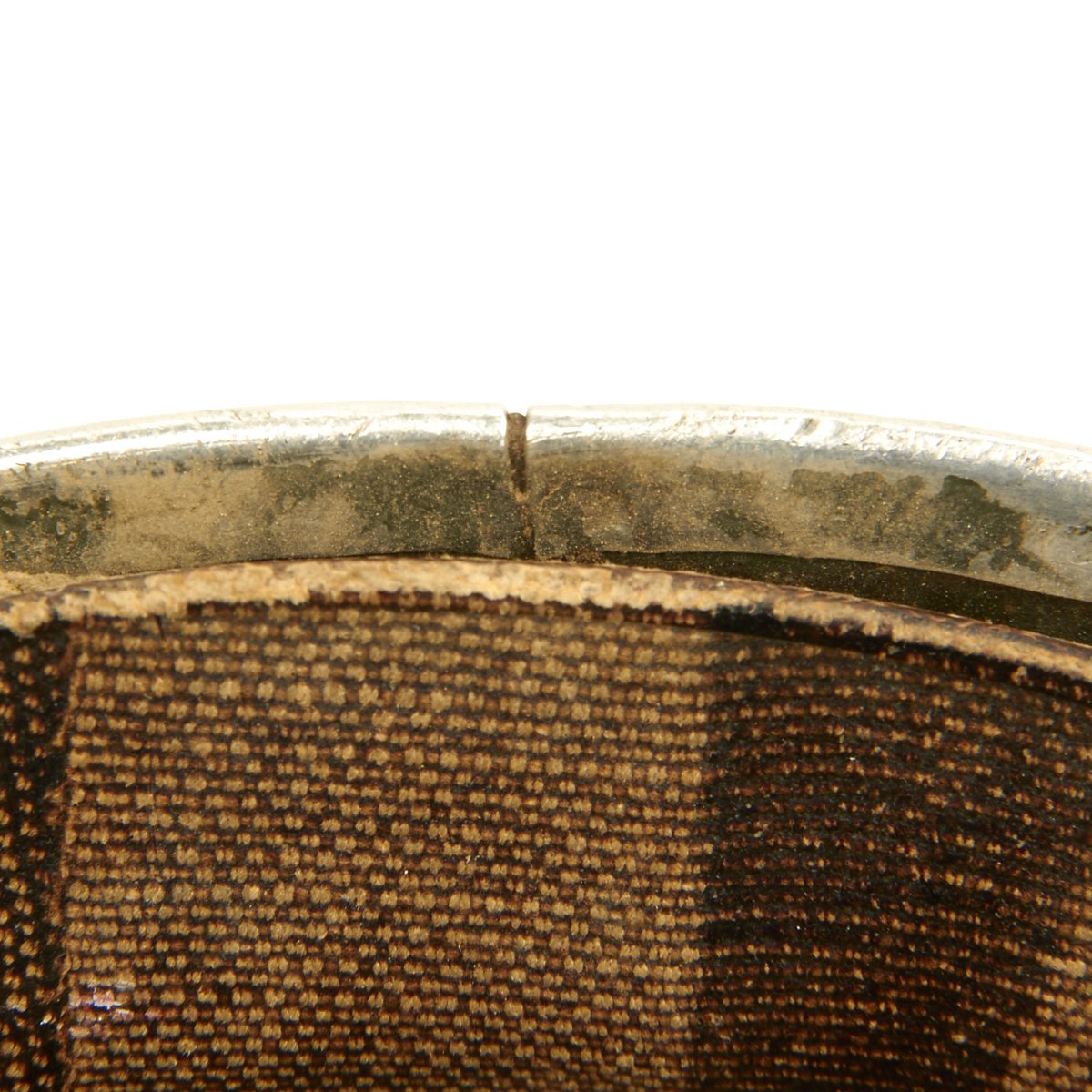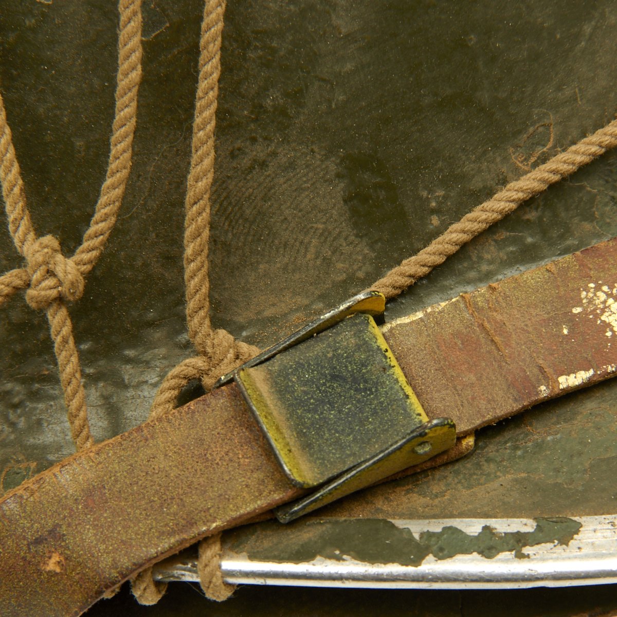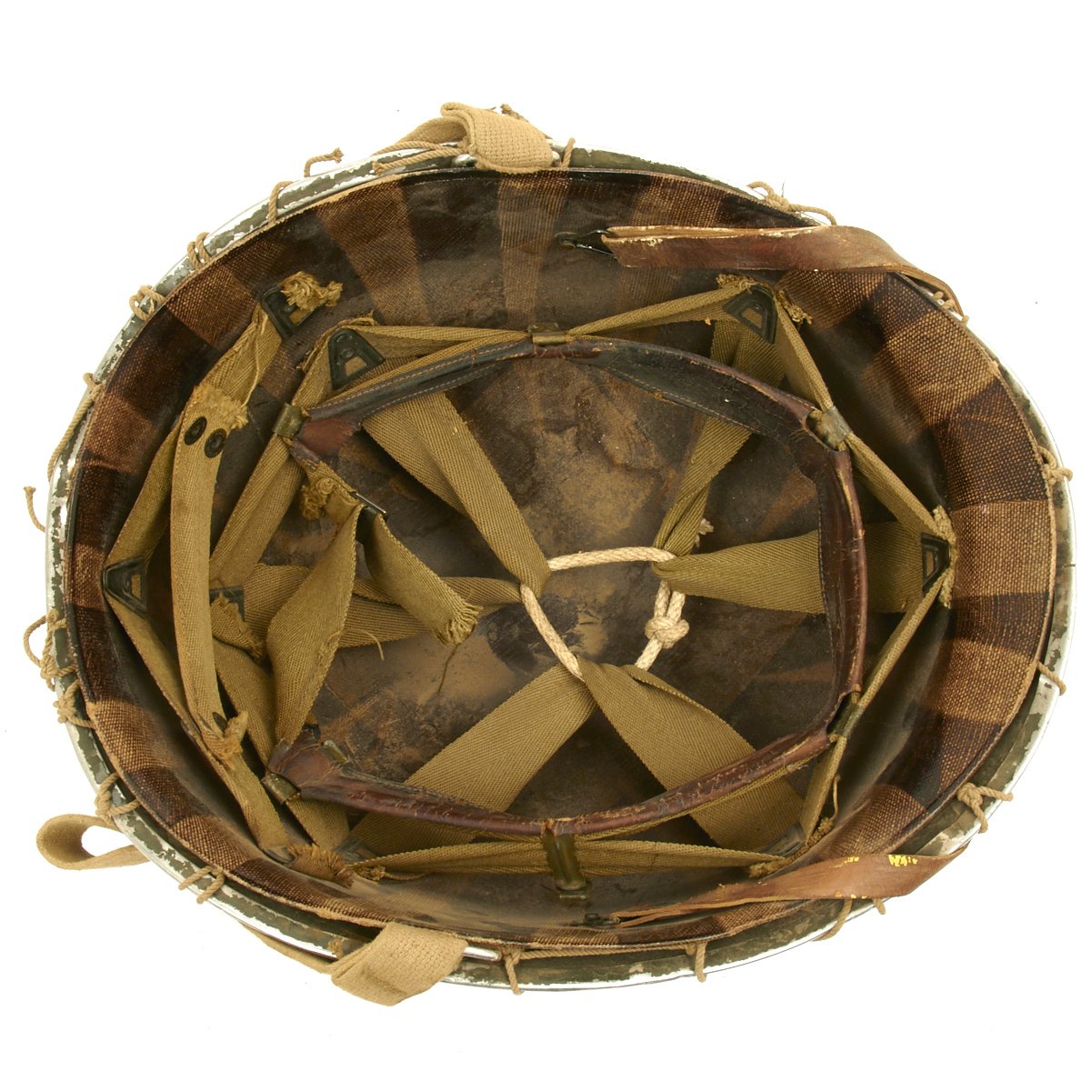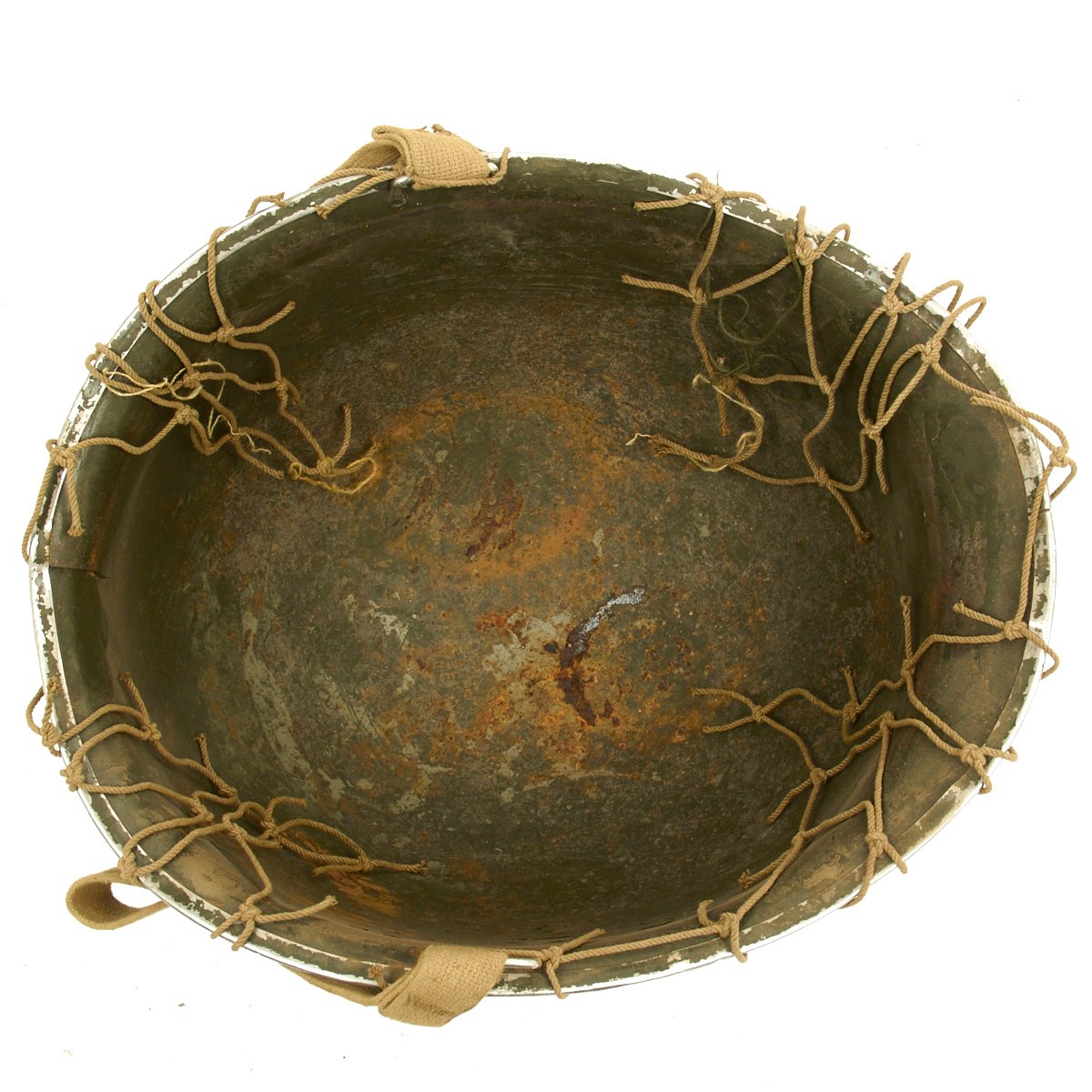 This true US WWII M-1 helmet liner be identified through the frontal eyelet hole. Other correct WW2 features include cotton herringbone twill (HBT) cloth suspension dated 1943. This HBT suspension is held tightly within the M-1 helmet liner by rivets and a series of triangular "A" washers. The three upper suspension bands are joined together with a shoestring. This way the wearer could adjust the fit.