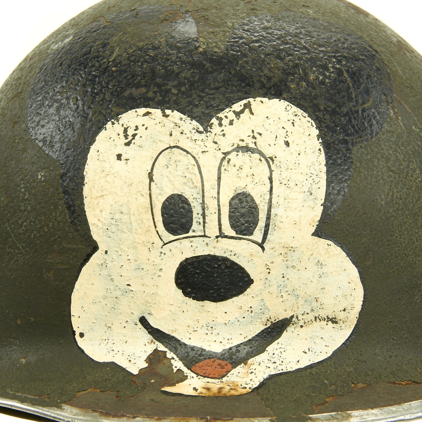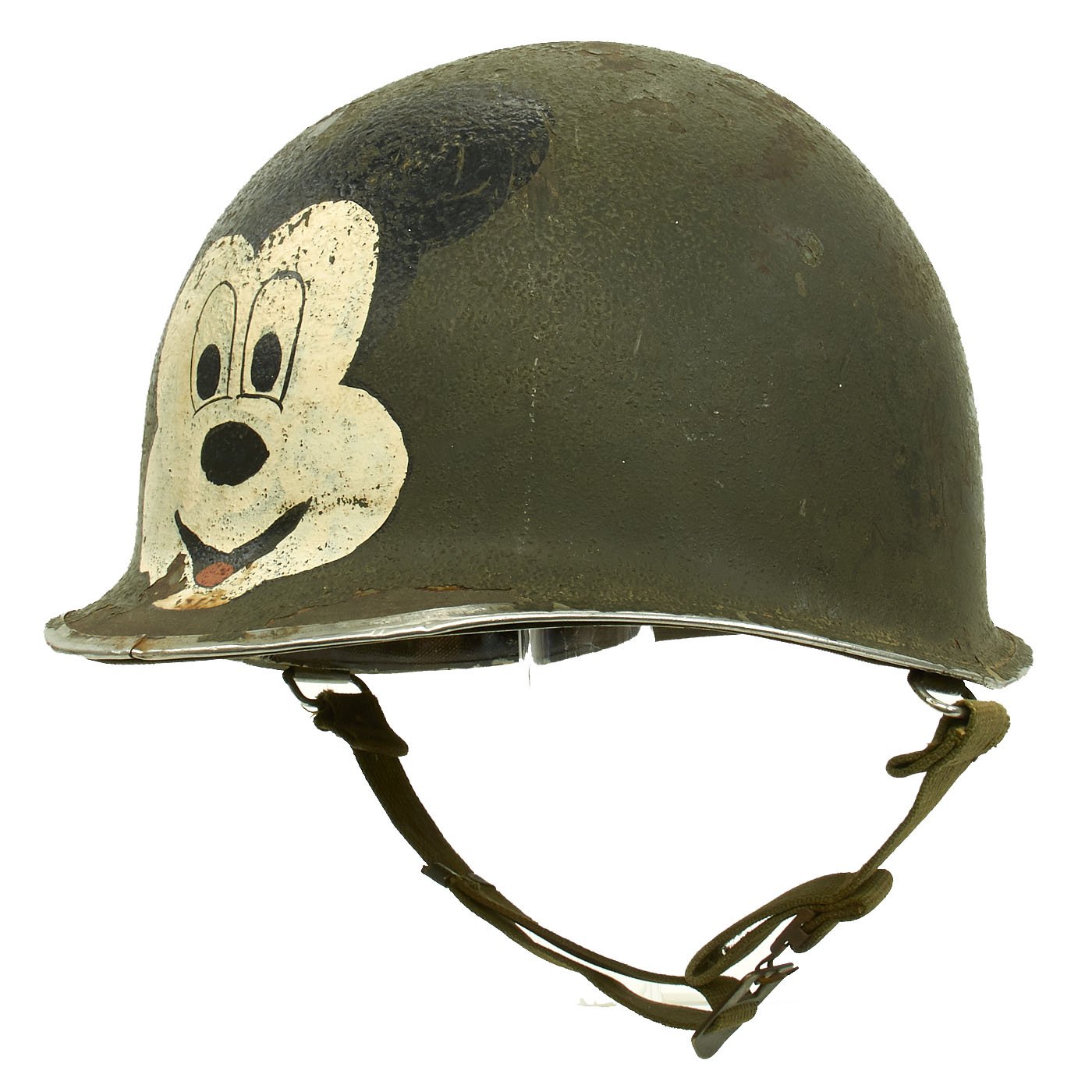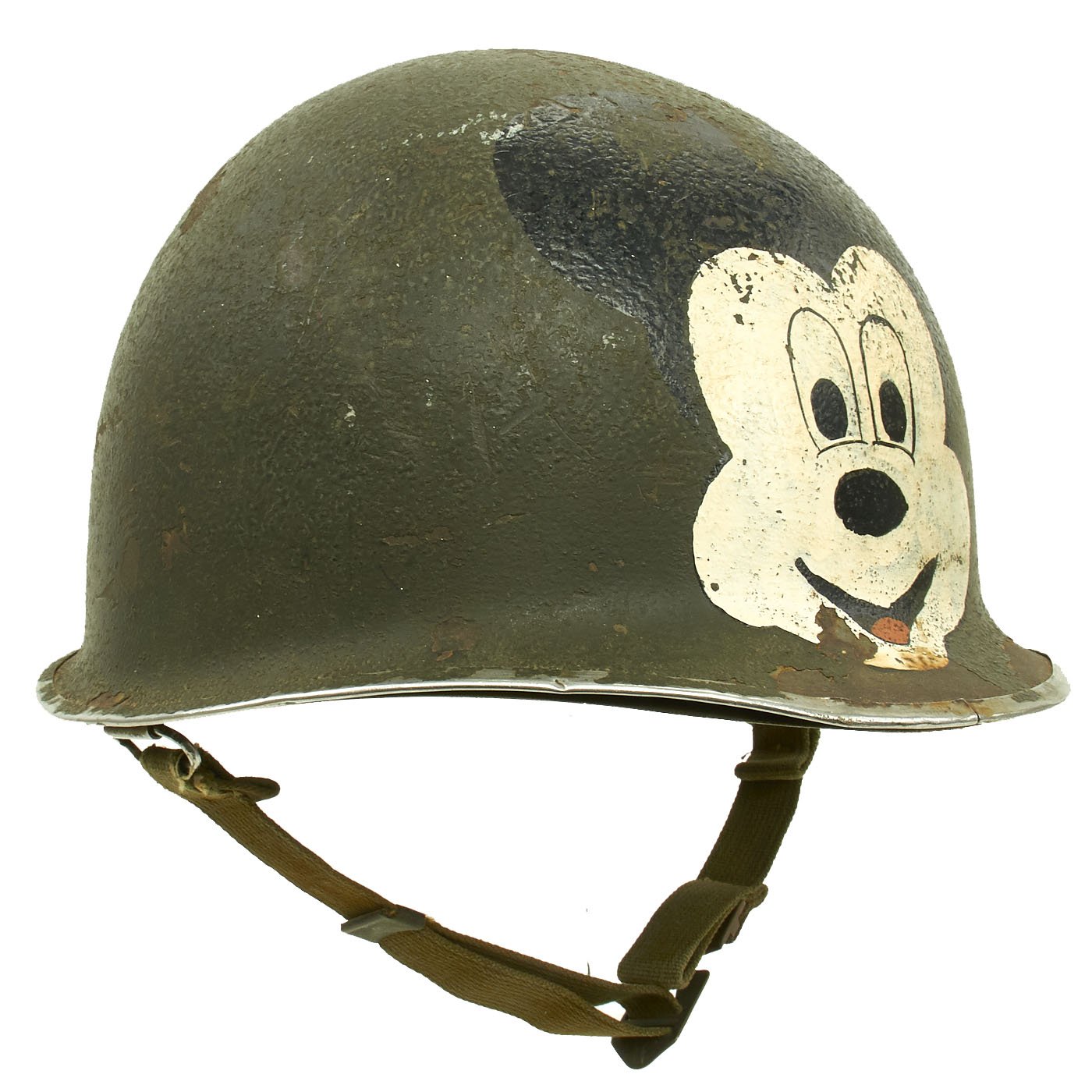 Original Item: Only One Available. This is a great example of a genuine mid WWII Issue U.S. Army M1 Helmet, with a correct WWII Issue liner. It also has an amazing WWII Period "Mickey Mouse" painted on the front of the helmet. It shows wear, chipping, and degradation, so it was definitely added to the helmet during active service, and would make an excellent part of any collection.