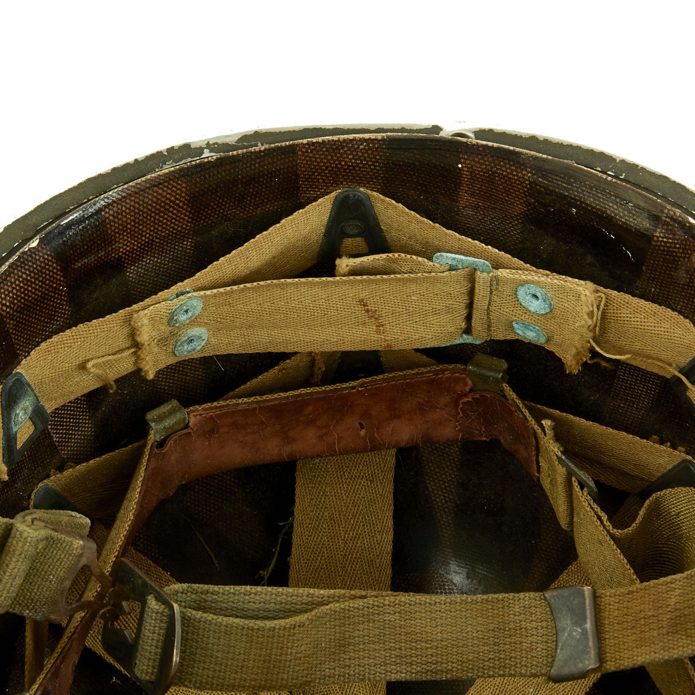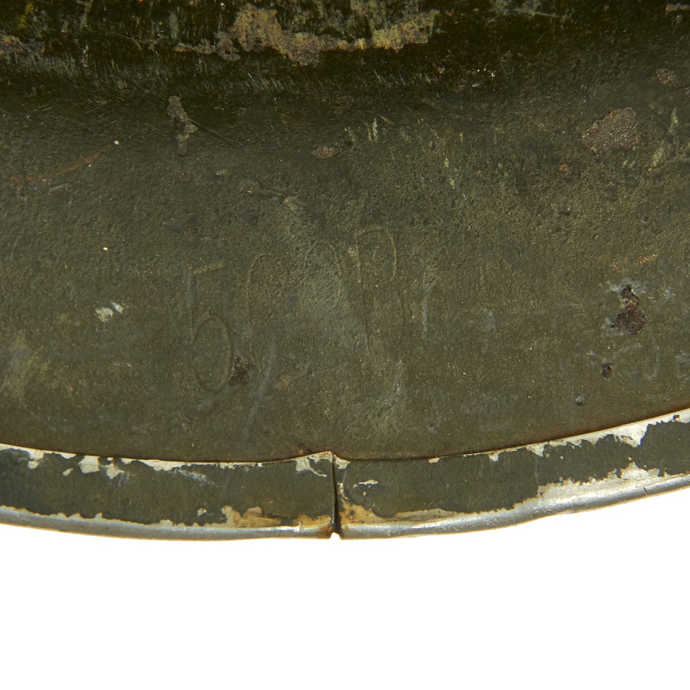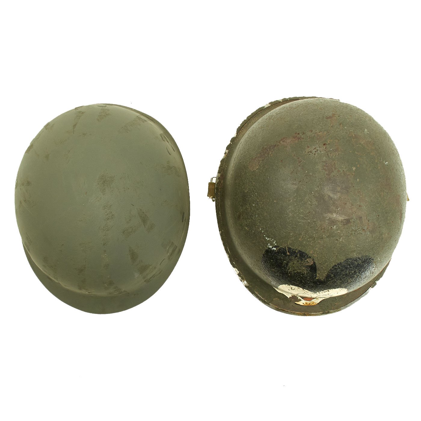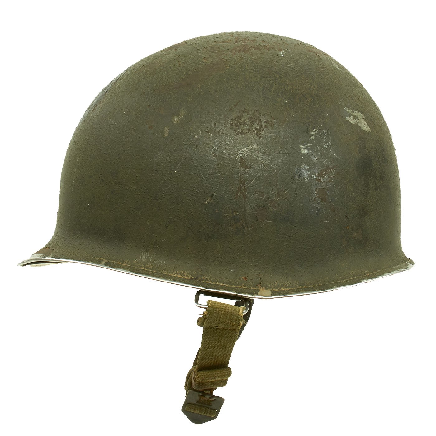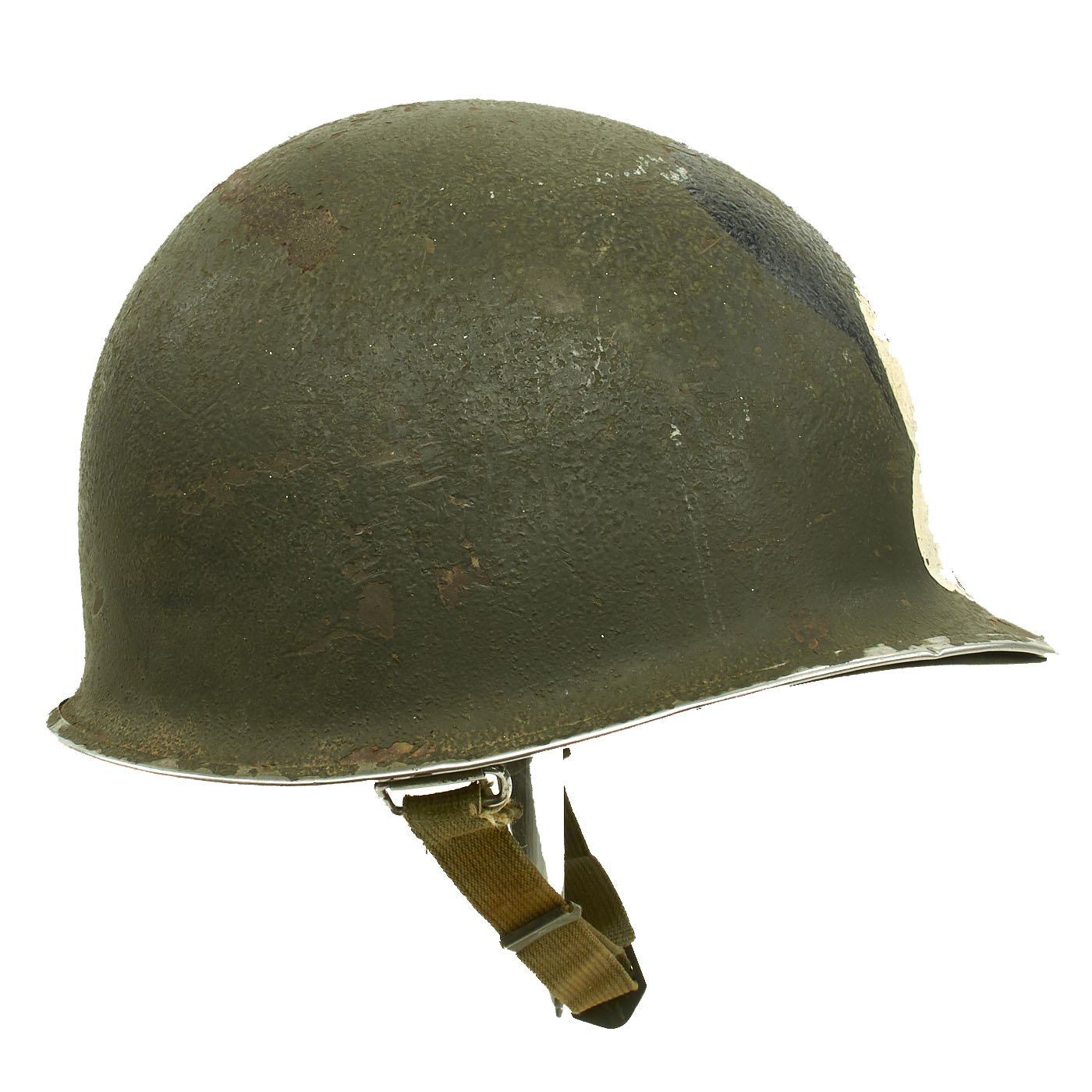 The U.S. WWII M-1 helmet was only produced from 1941 to 1945. The first production batch resulted with over 323,510 M-1 helmets before the start of the American involvement in the war. This helmet is heat-lot stamped 562B, which indicates the approximate manufacture date of July - August 1943. This was before the "official" changeover to swivel bales, so it may have been left over in the factory, or possibly had the bales replaced after the originals broke off, however we see no evidence of replaced bales.