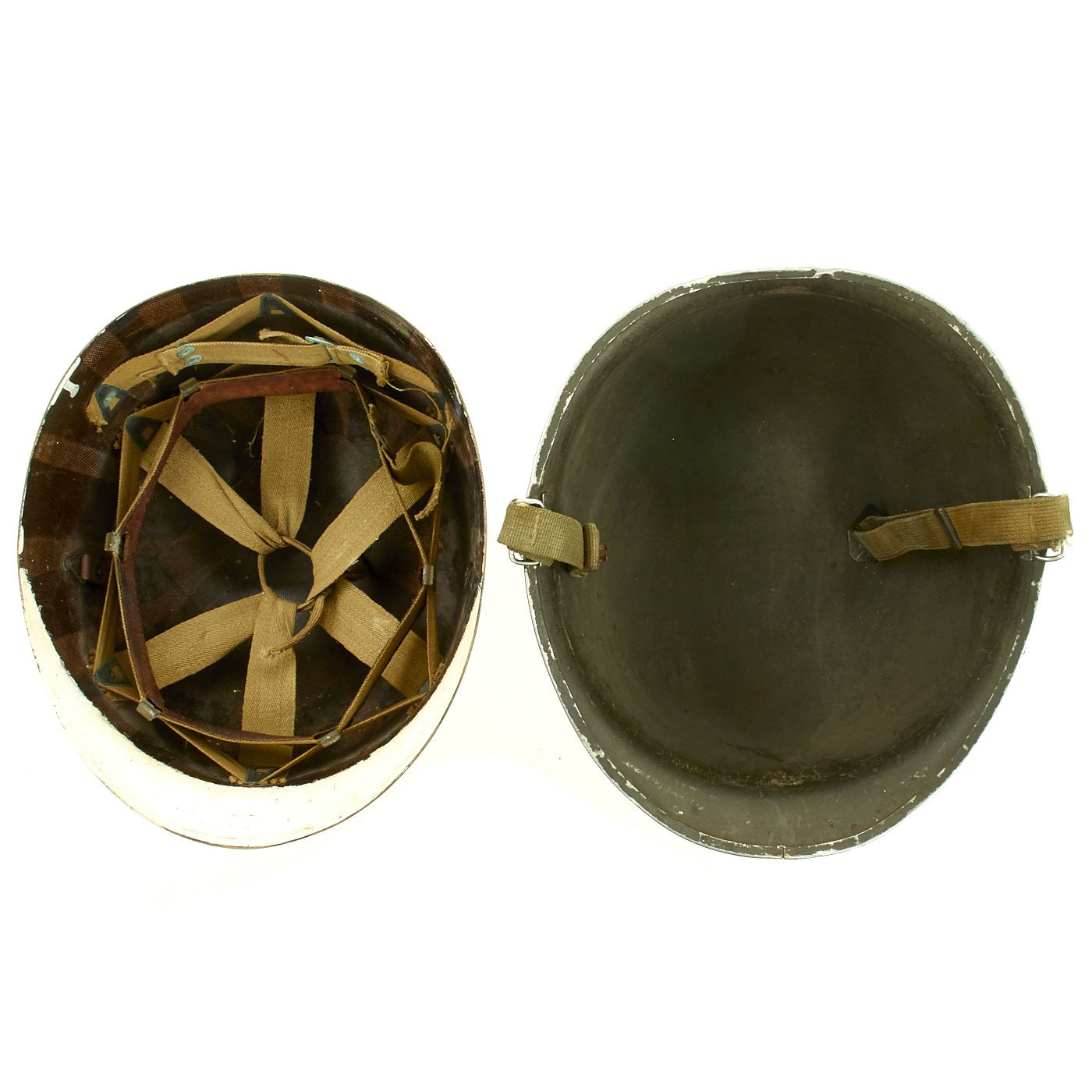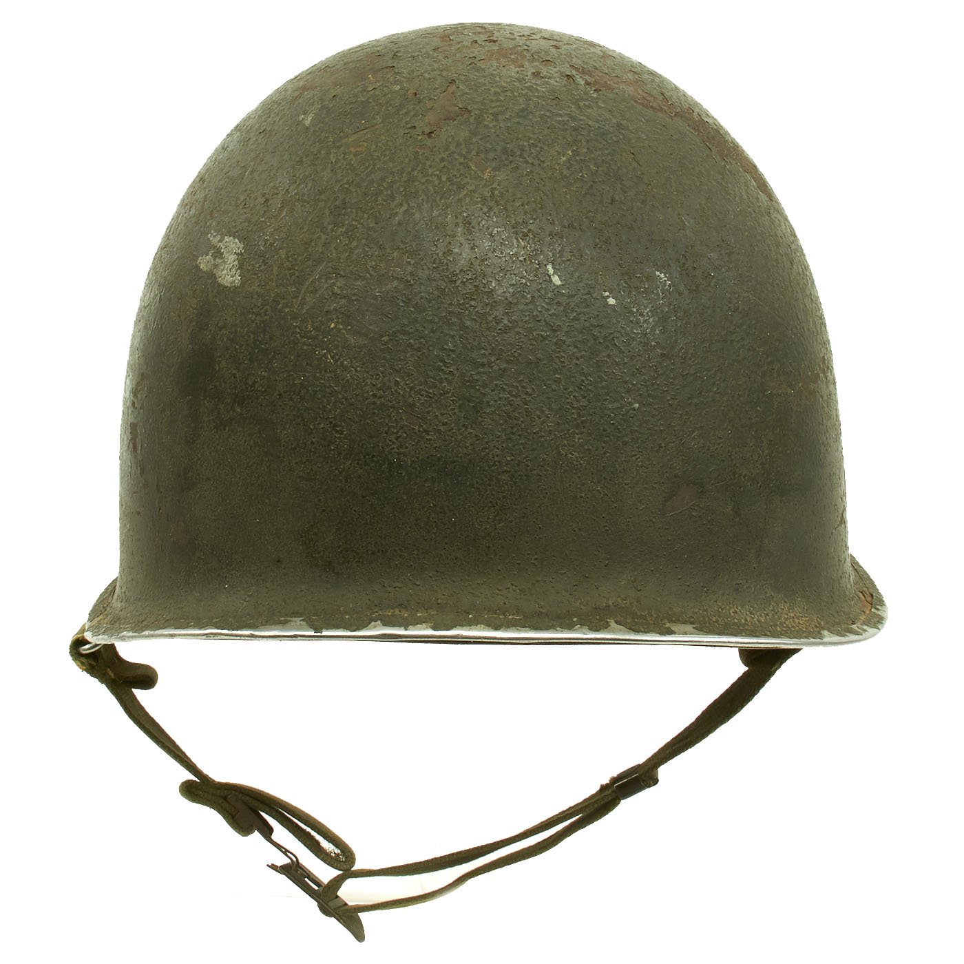The early M-1 helmet shells had a set of fixed (static) chinstrap loops called "bales" and a stainless steel rim. These rims were both rust resistant and had "non-magnetic qualities" that reduced the chance of error readings when placed around certain sensitive equipment (such as a compass). In October 1943, issues with the fixed bales breaking off resulted in a change to the "swivel bales" that this helmet has. The shell's heat lot was stamped before the change, however the helmet for some reason stayed at McCord until the swivel bale period.