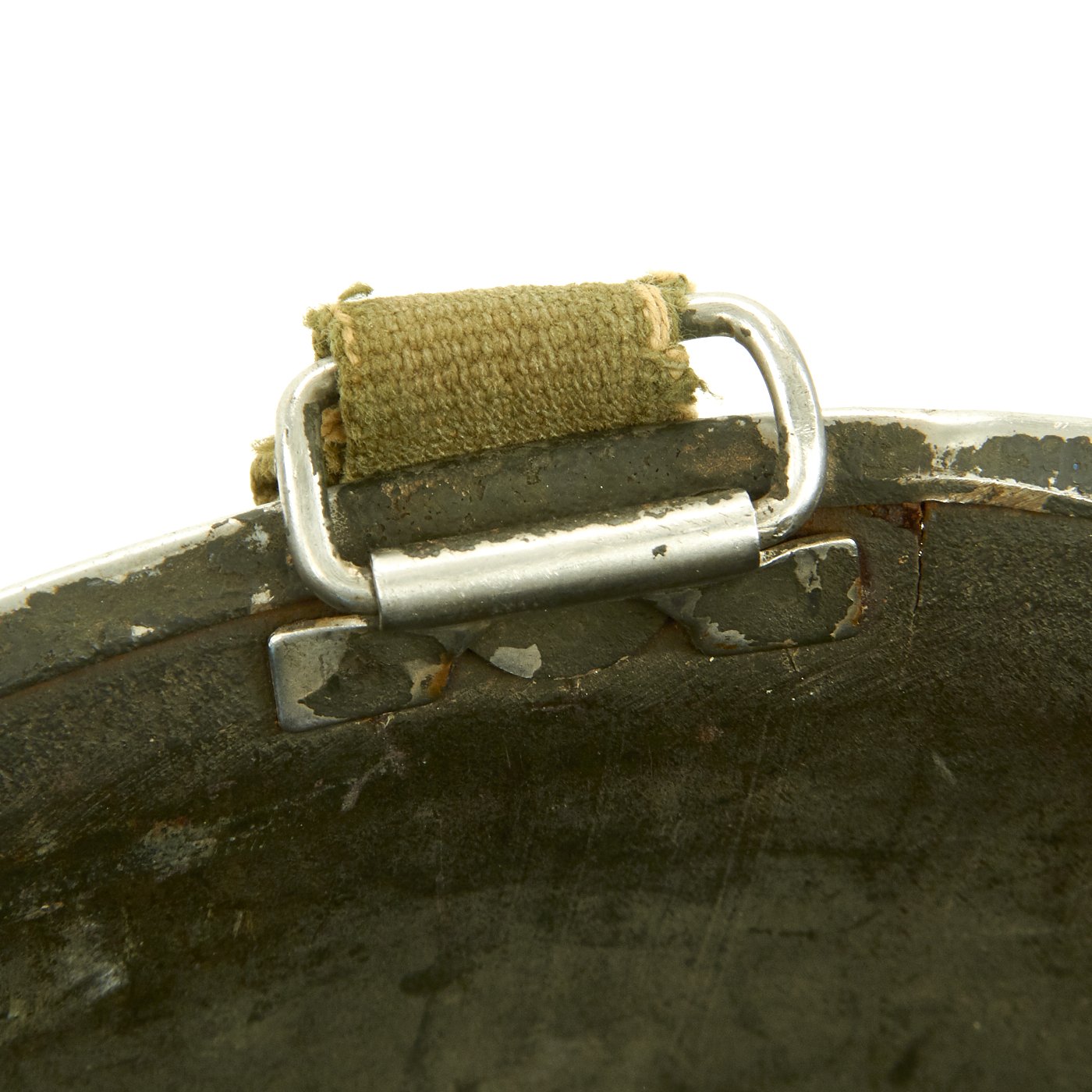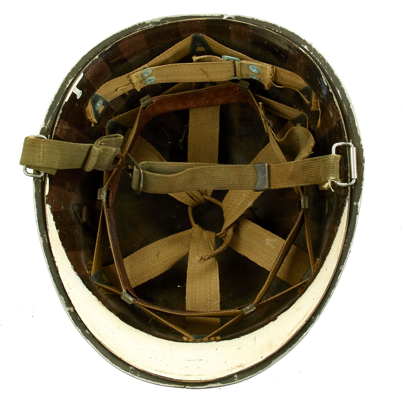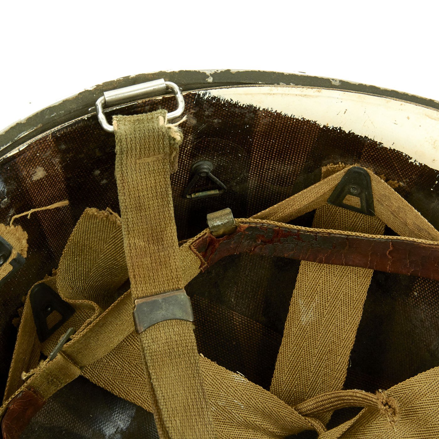 This true US WWII M-1 helmet liner be identified through the frontal eyelet hole. Other correct WWII features include OD Green #3 cotton herringbone twill (HBT) cloth suspension liner, with the webbing in very good shape. This HBT suspension is held tightly within the M-1 helmet liner by rivets and a series of triangular "A" washers. The three upper suspension bands are joined together with the correct OD green string. This way the wearer could adjust the fit. The sweatband is still present, however it shows use and degradation of the leather, so this is a helmet that was used. The liner chin strap is missing, except for about an inch left on the left side. Both of the liner chin strap attachment loops are present.