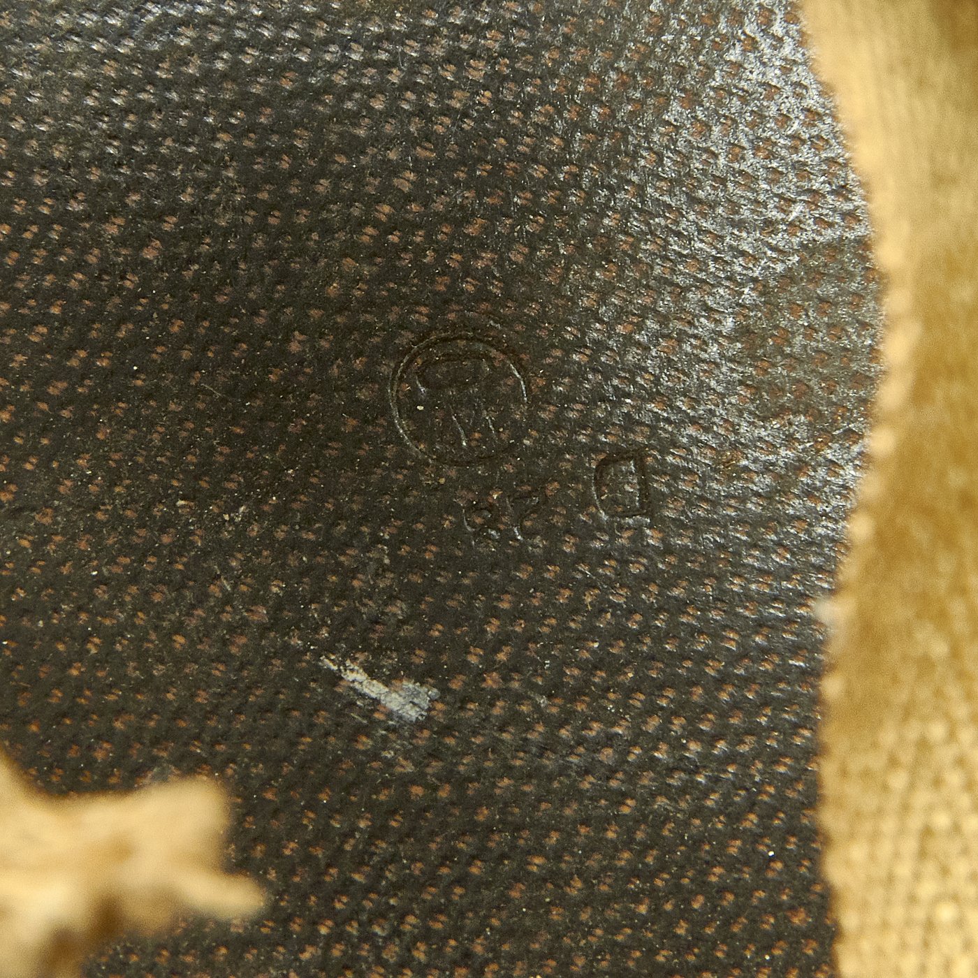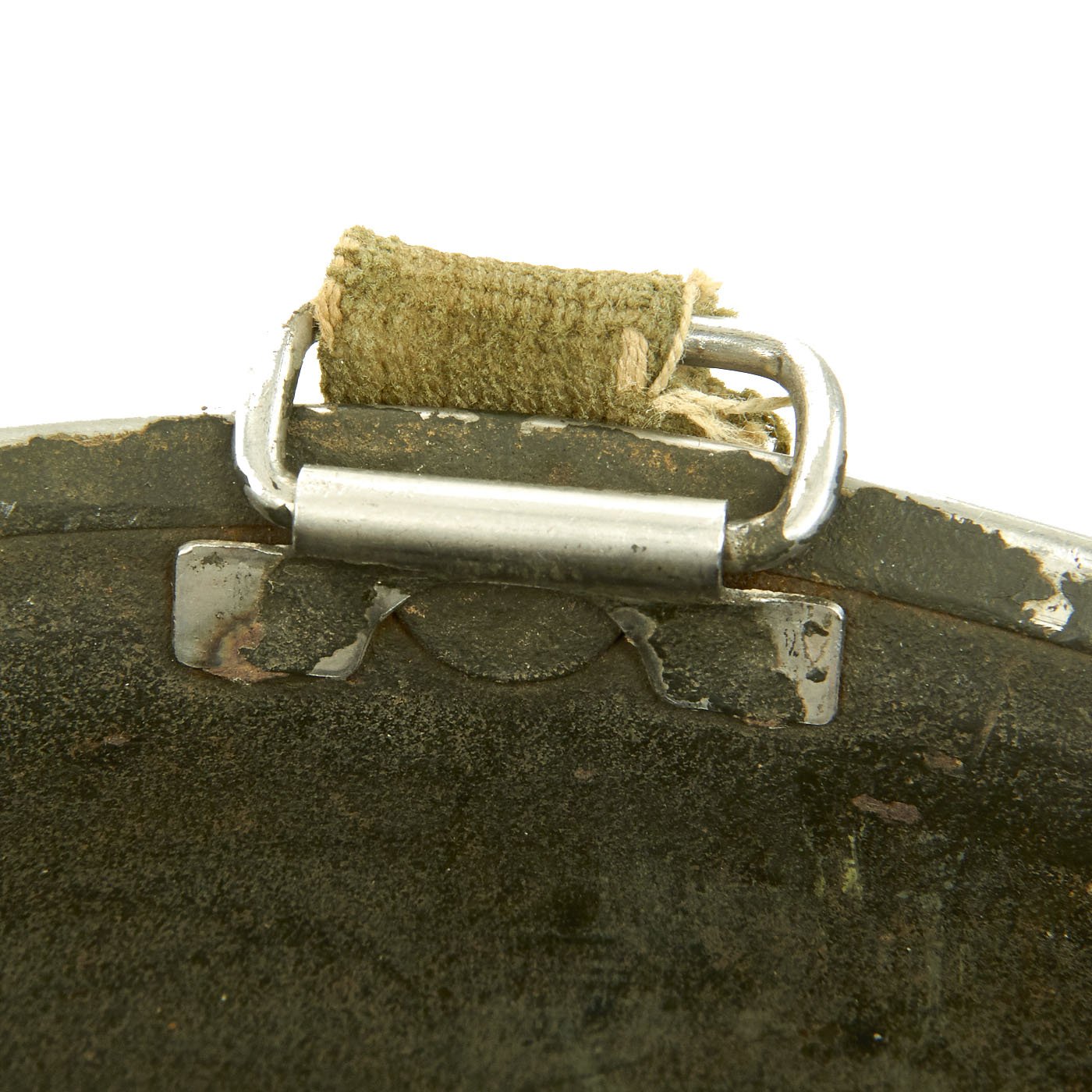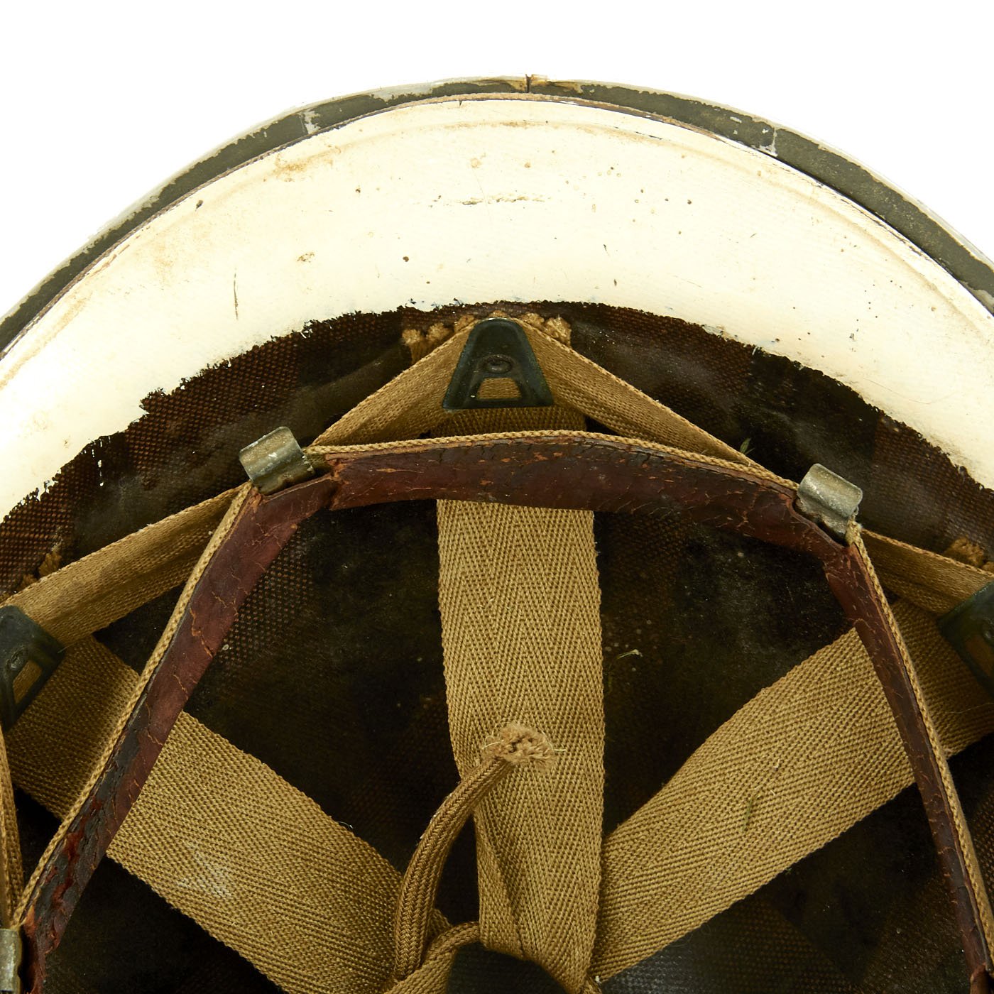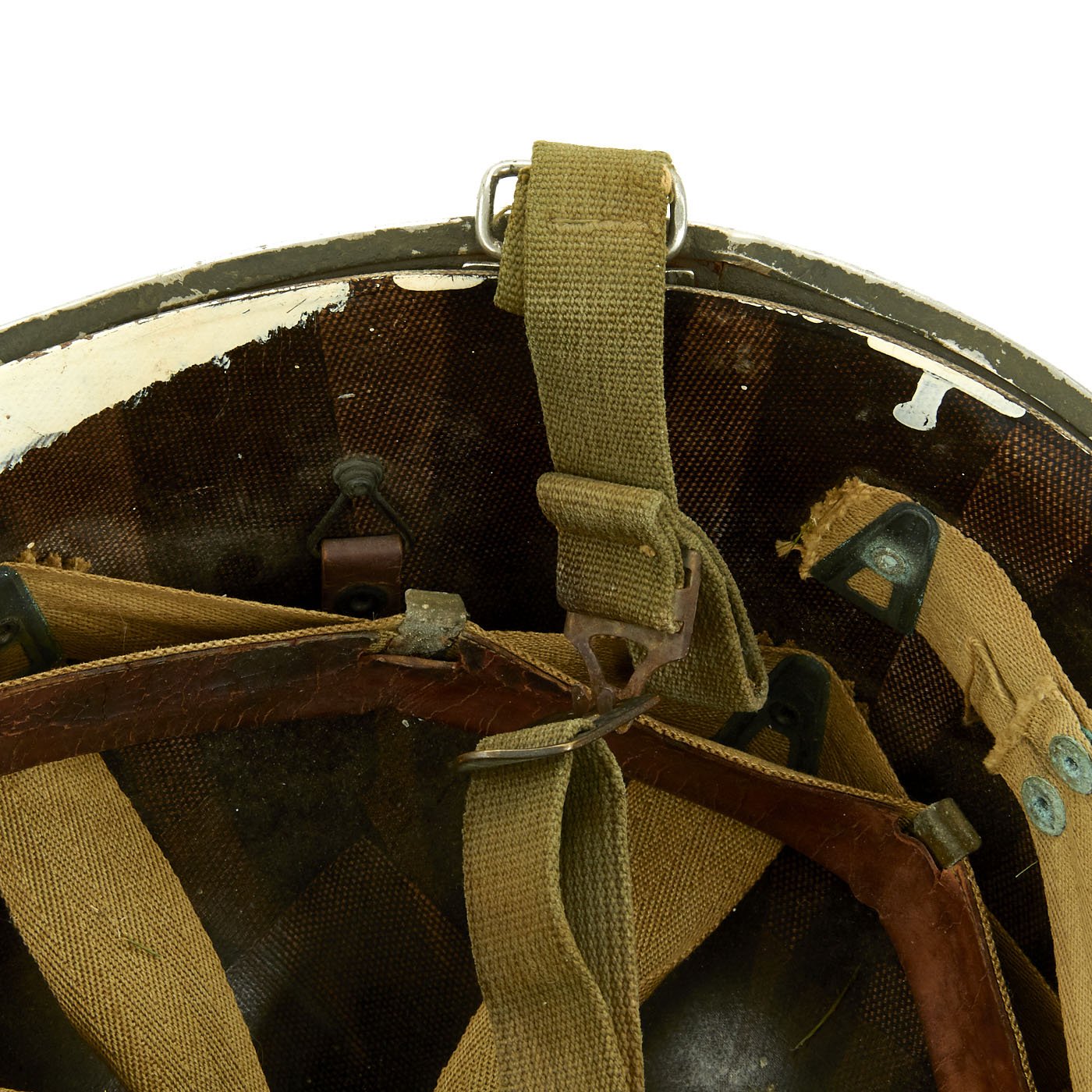 This true US WWII M-1 helmet liner be identified through the frontal eyelet hole. Other correct WWII features include OD Green #3 cotton herringbone twill (HBT) cloth suspension liner, with the webbing in very good shape. This HBT suspension is held tightly within the M-1 helmet liner by rivets and a series of triangular "A" washers. The three upper suspension bands are joined together with the correct OD green string. This way the wearer could adjust the fit. The sweatband is still present, however it shows use and degradation of the leather, so this is a helmet that was used. The liner chin strap is missing, except for about an inch left on the left side. Both of the liner chin strap attachment loops are present.